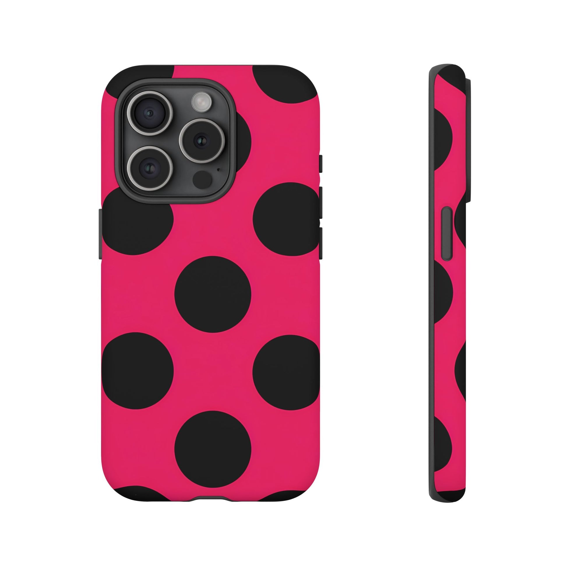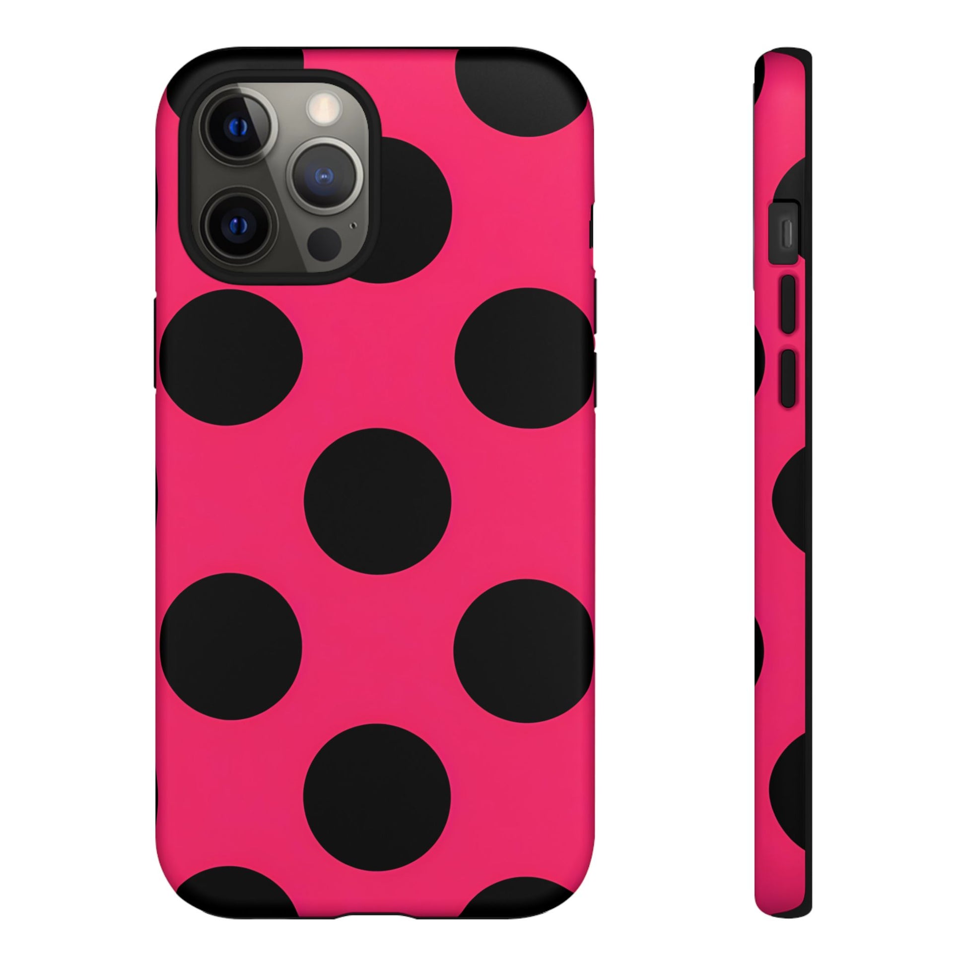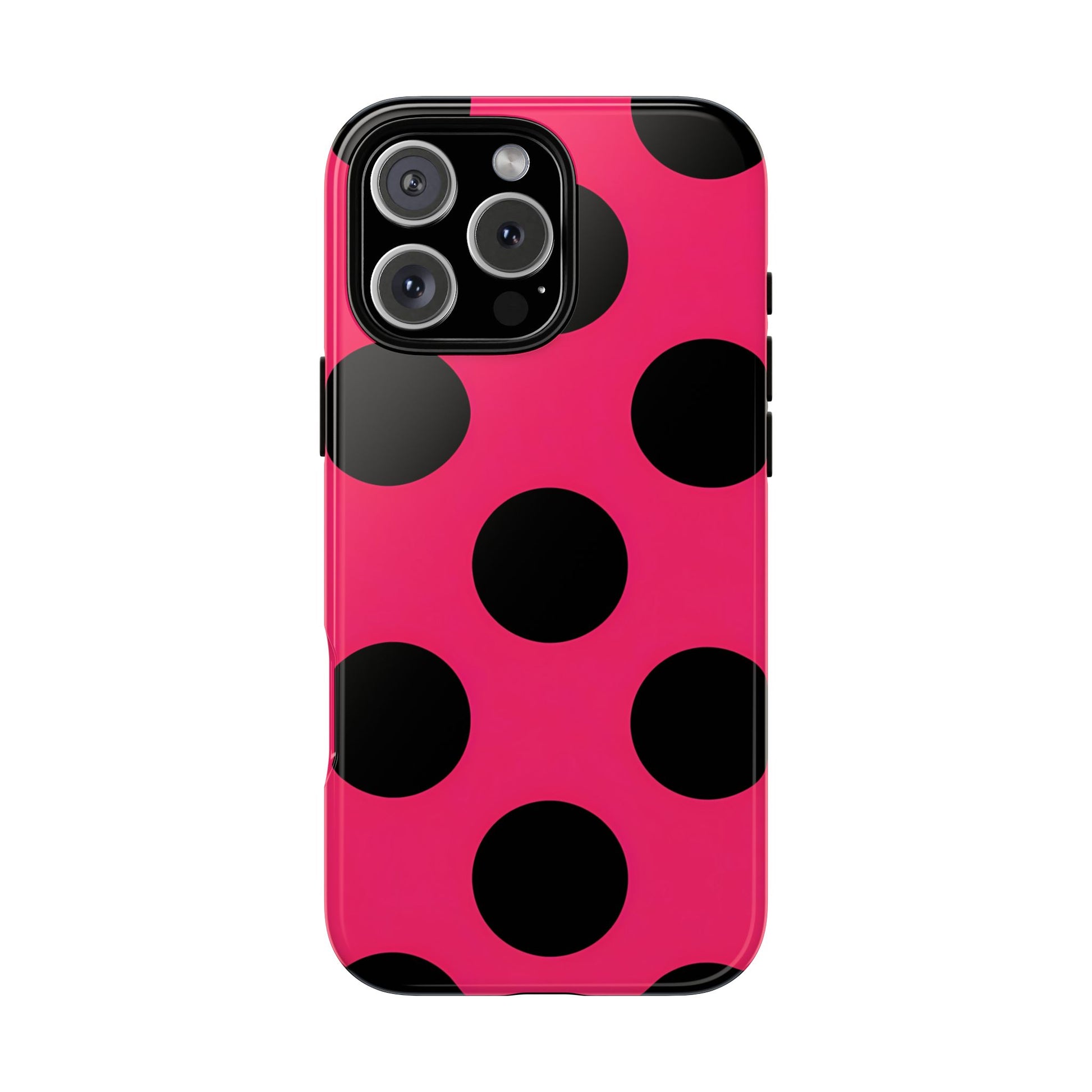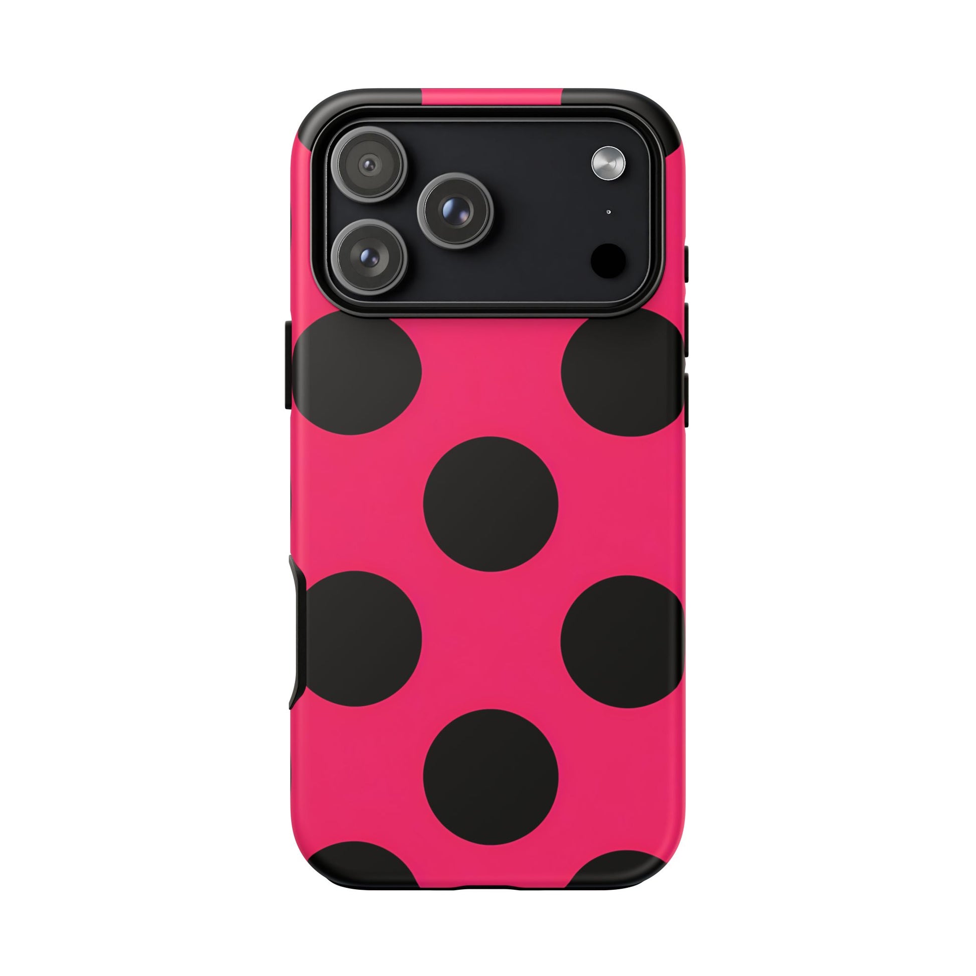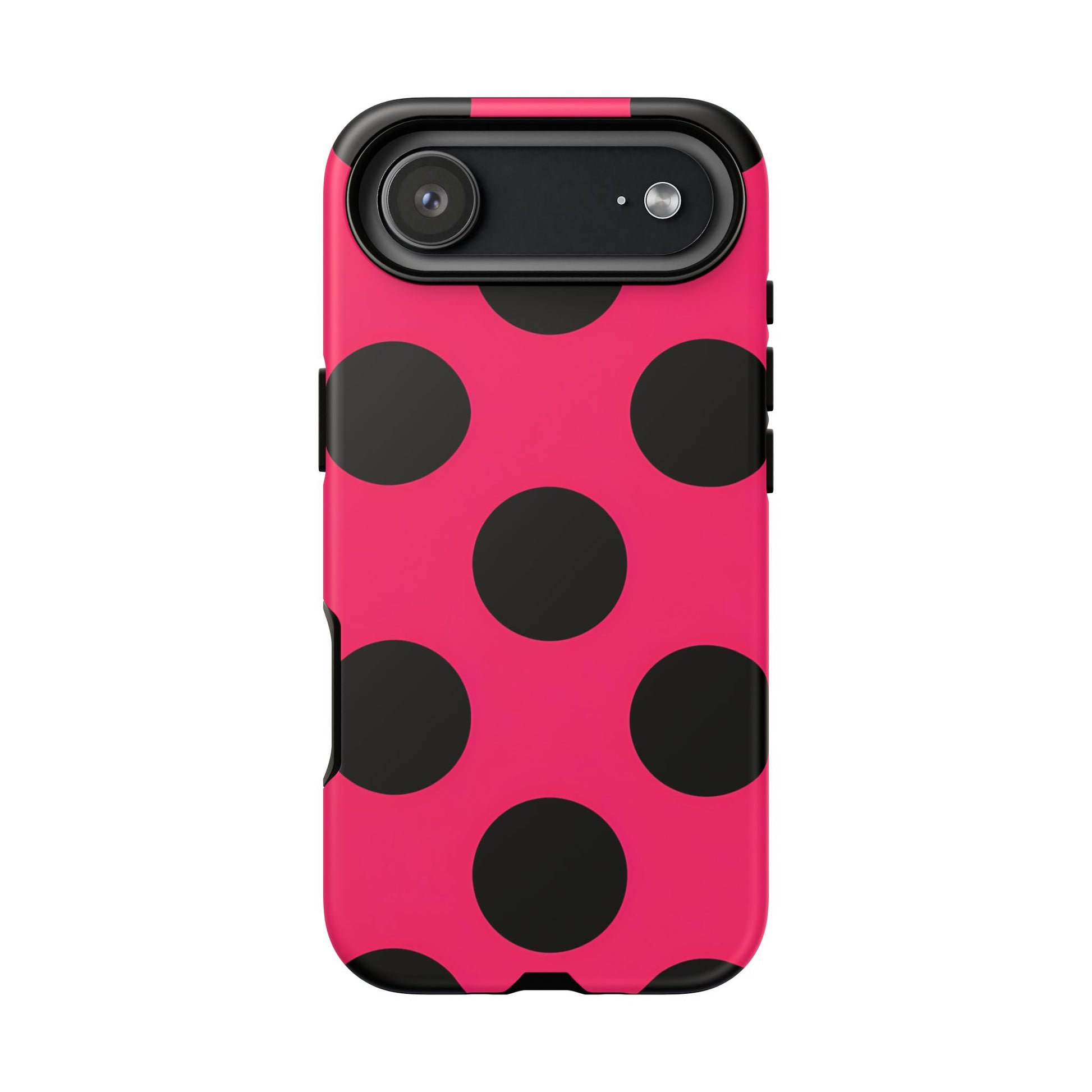 A vivid pink background accented by crisp black polka dots, offering a clean, graphic look that feels both classic and contemporary.