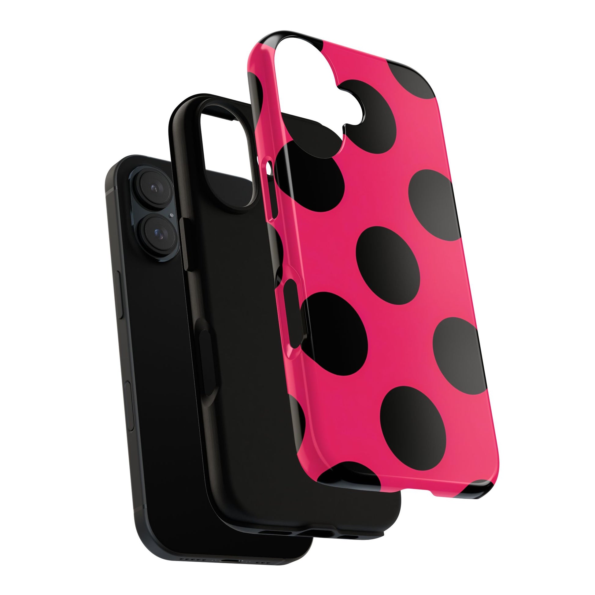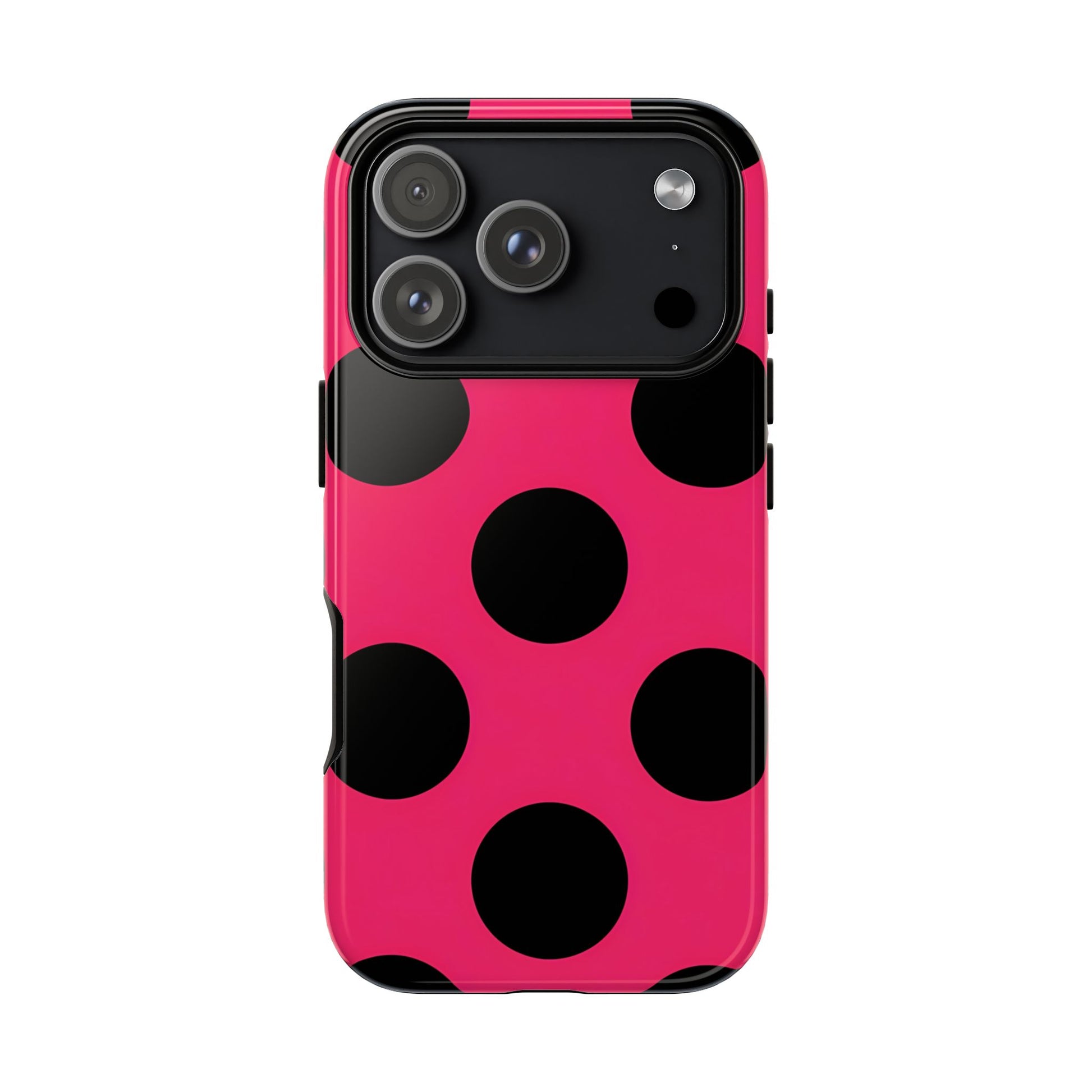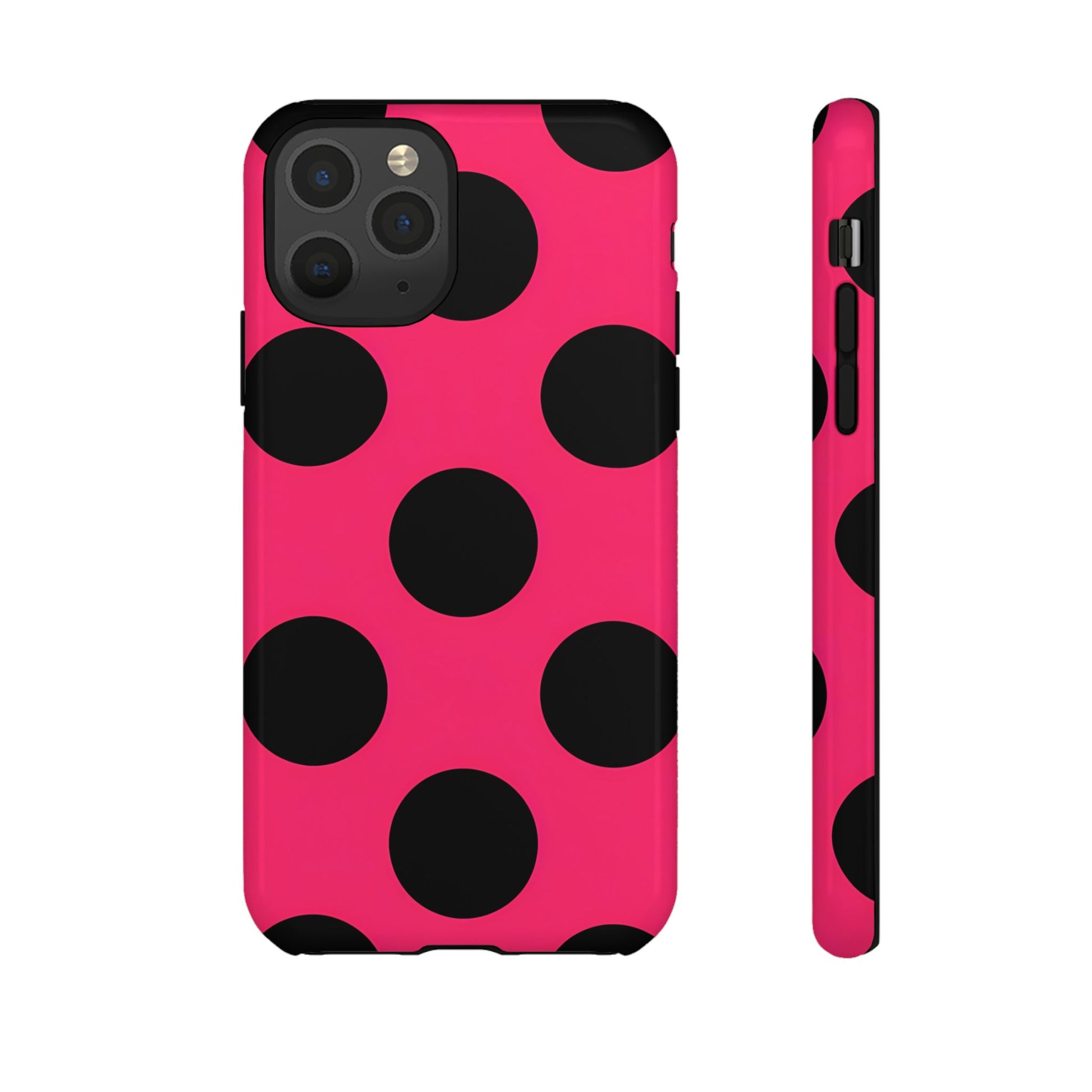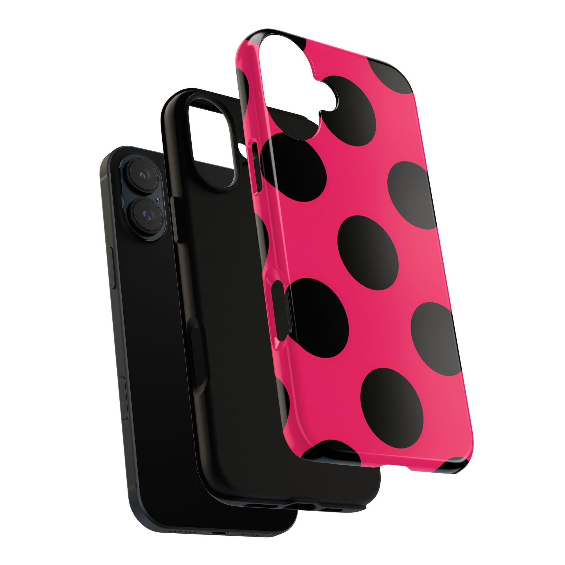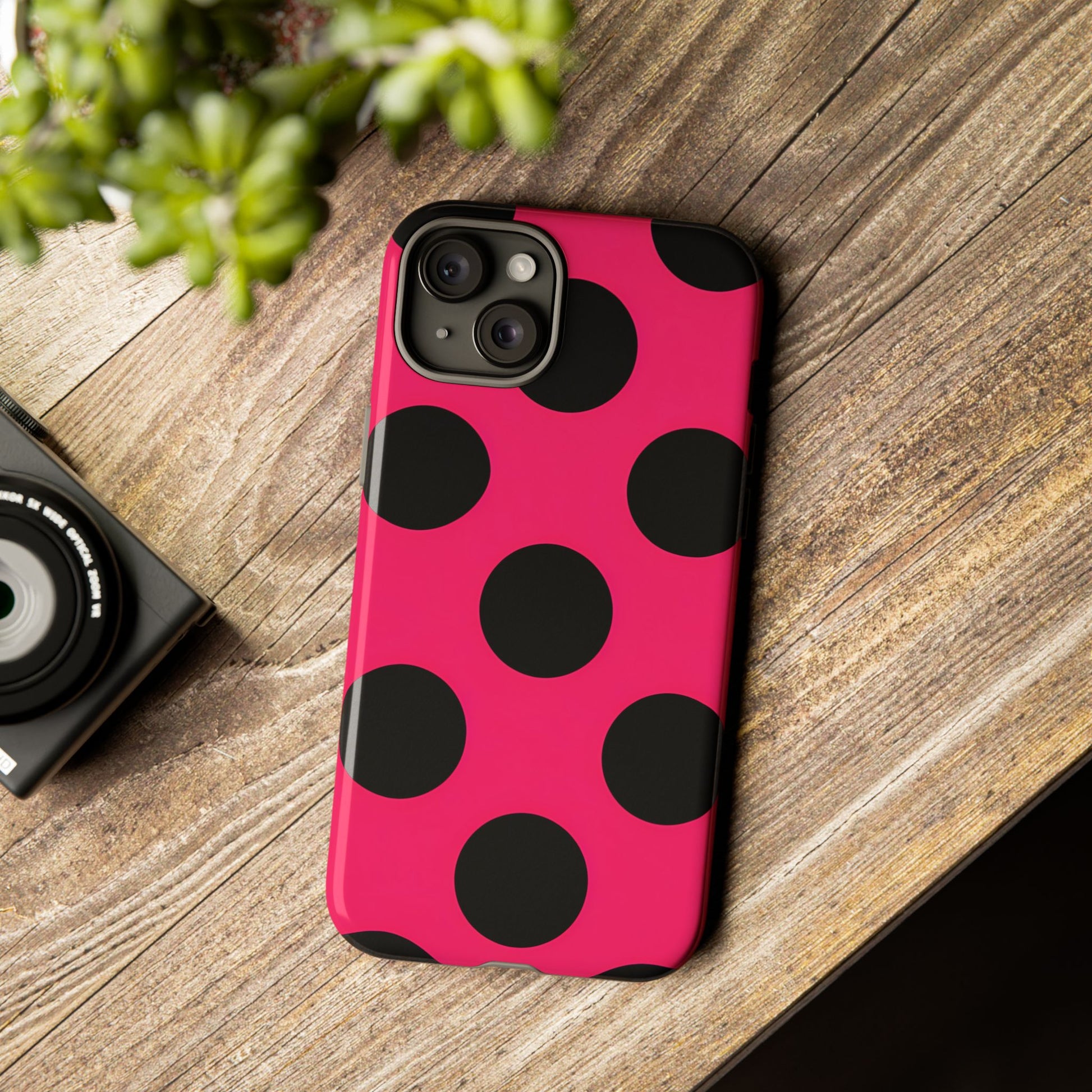 A vivid pink background accented by crisp black polka dots, offering a clean, graphic look that feels both classic and contemporary.