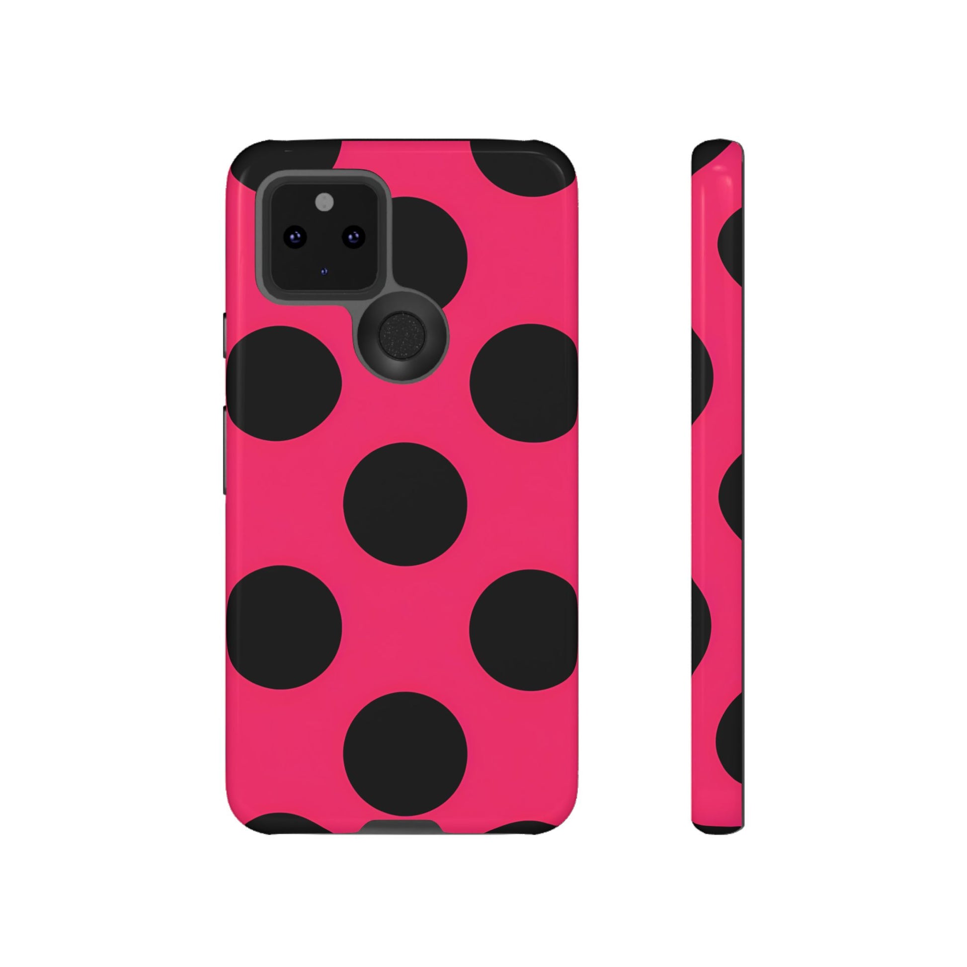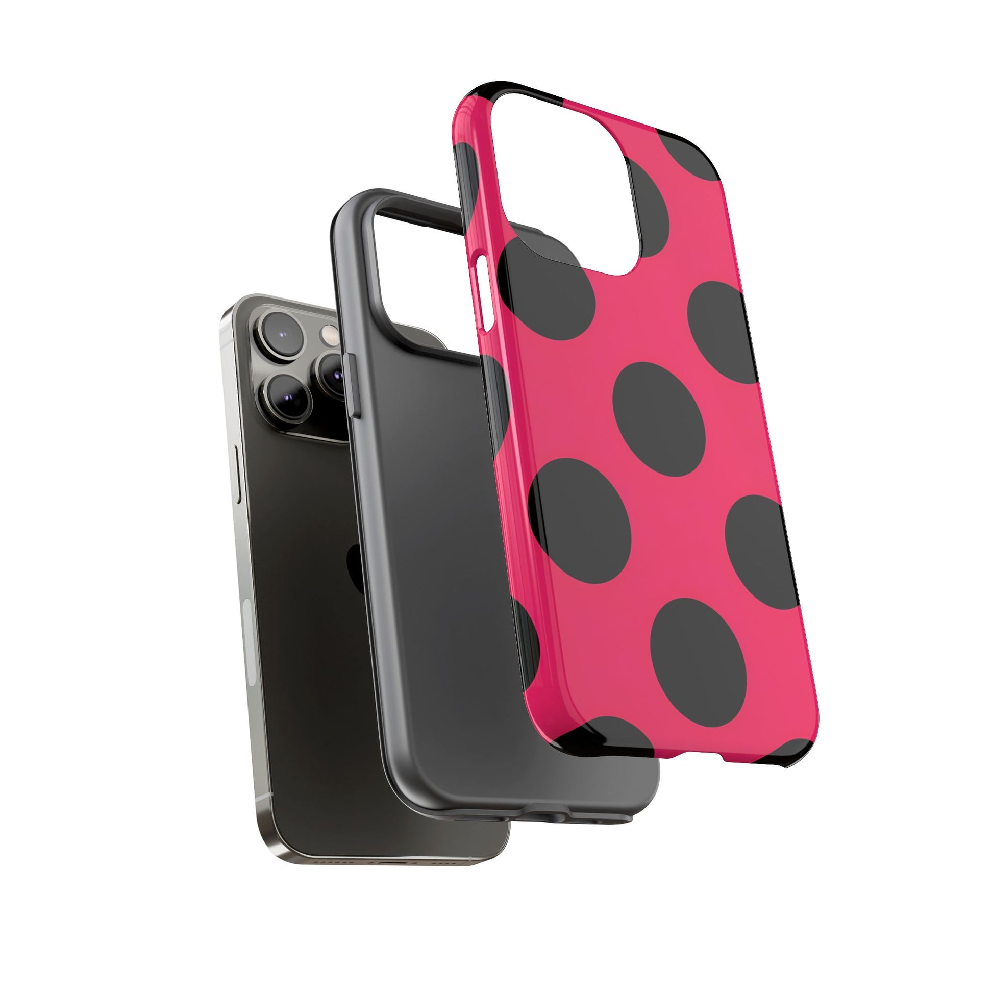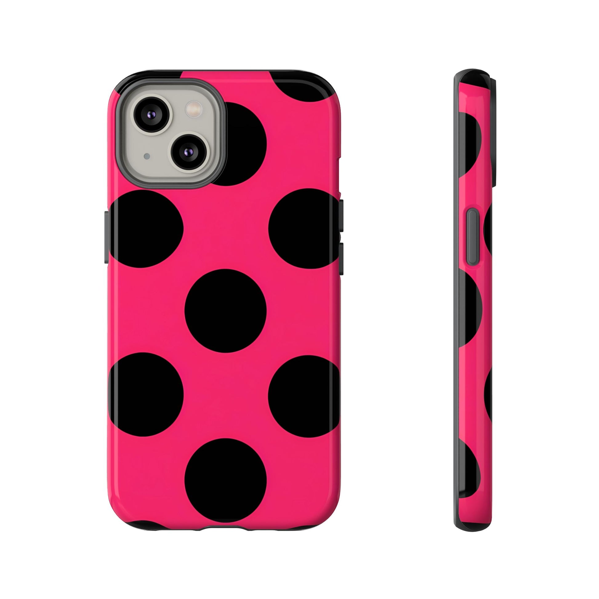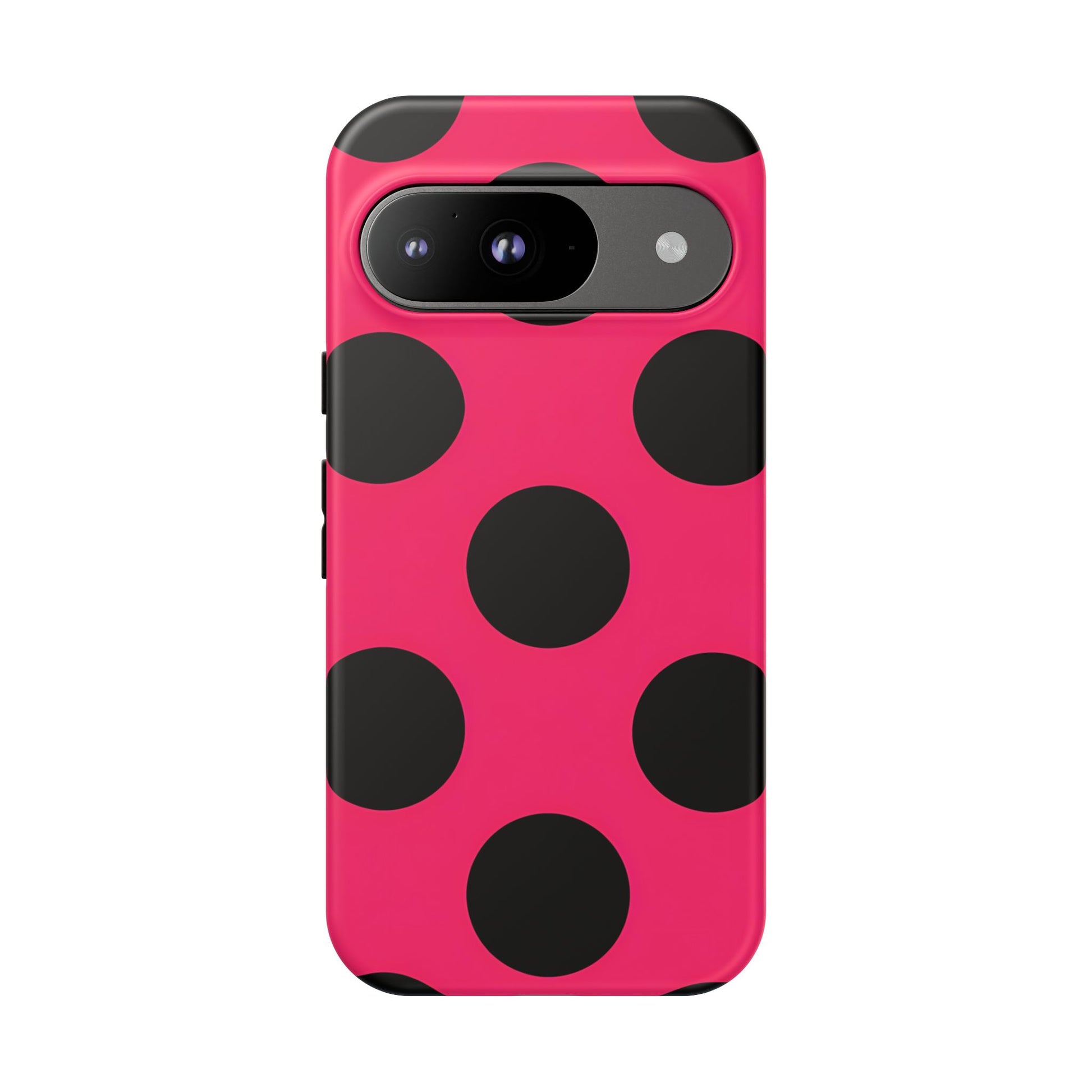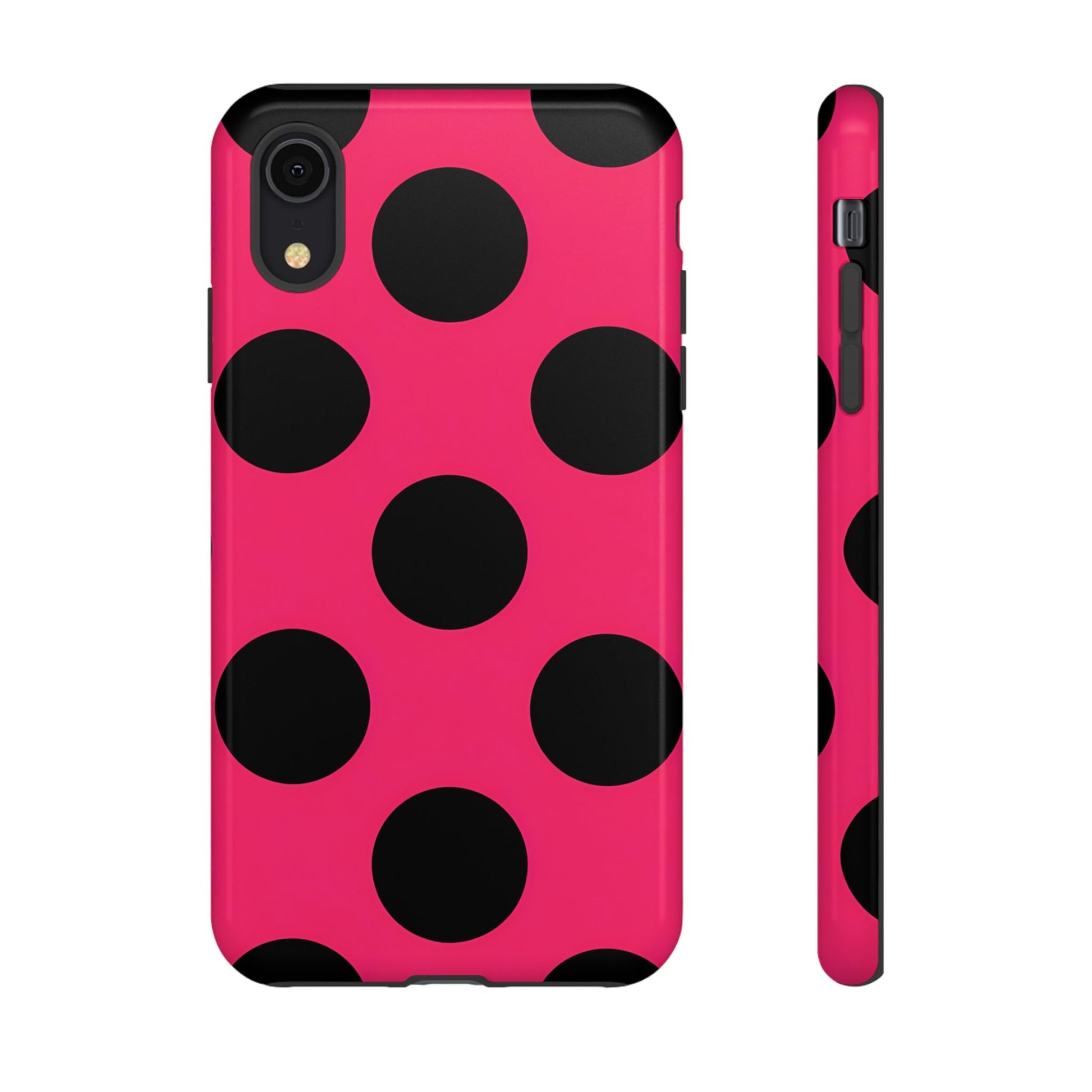 A vivid pink background accented by crisp black polka dots, offering a clean, graphic look that feels both classic and contemporary.