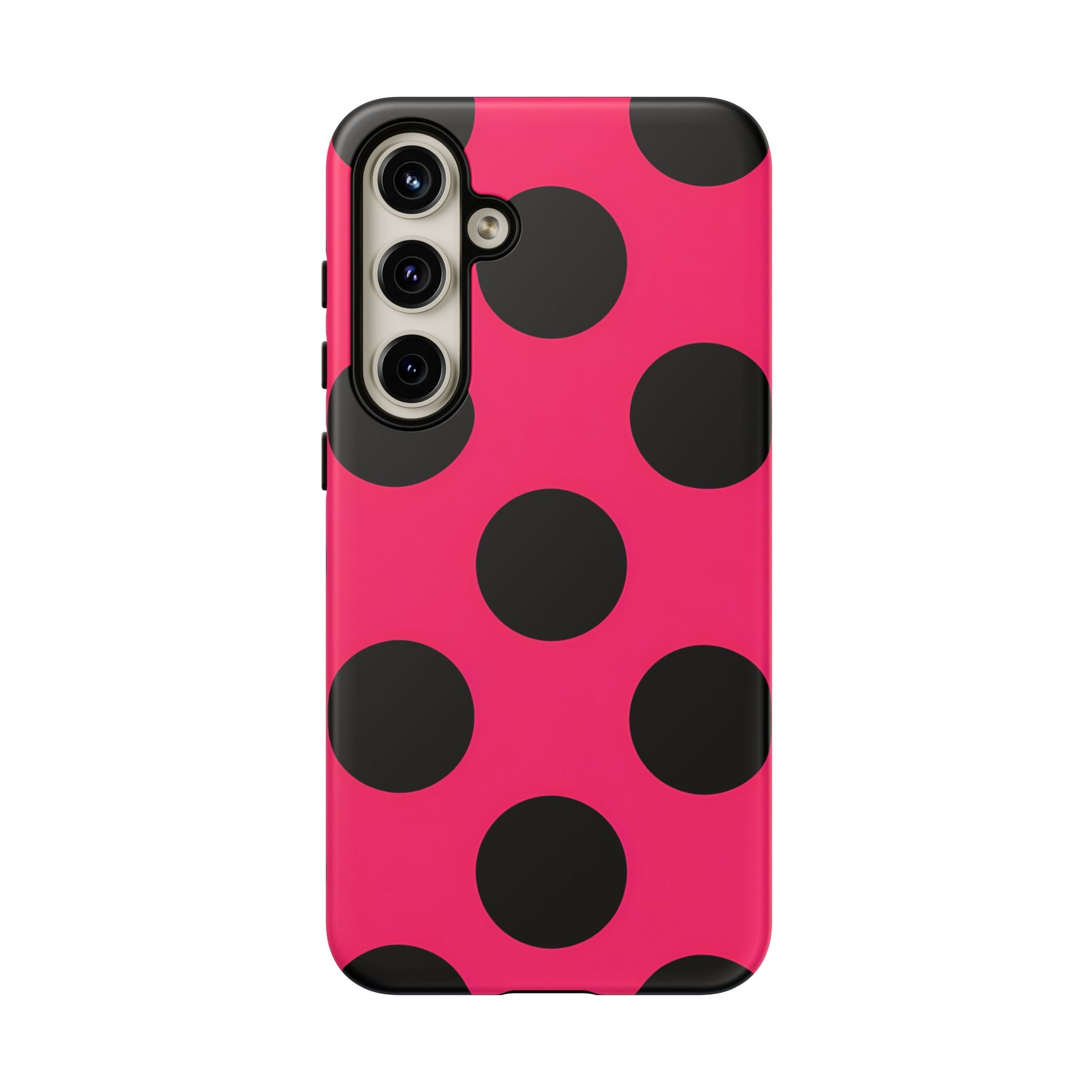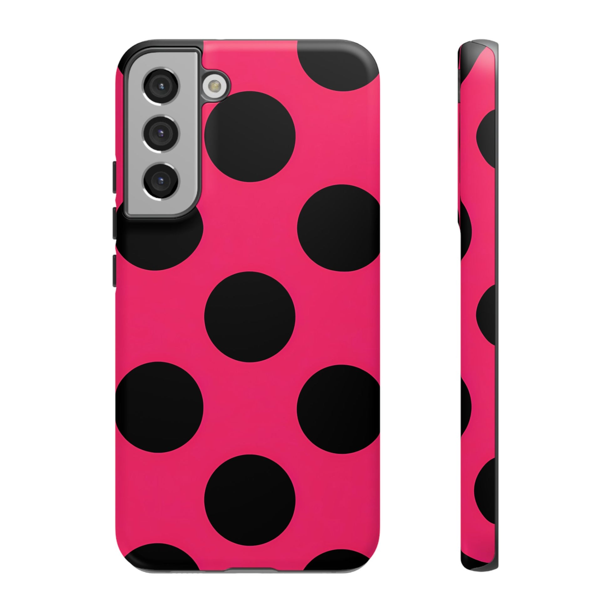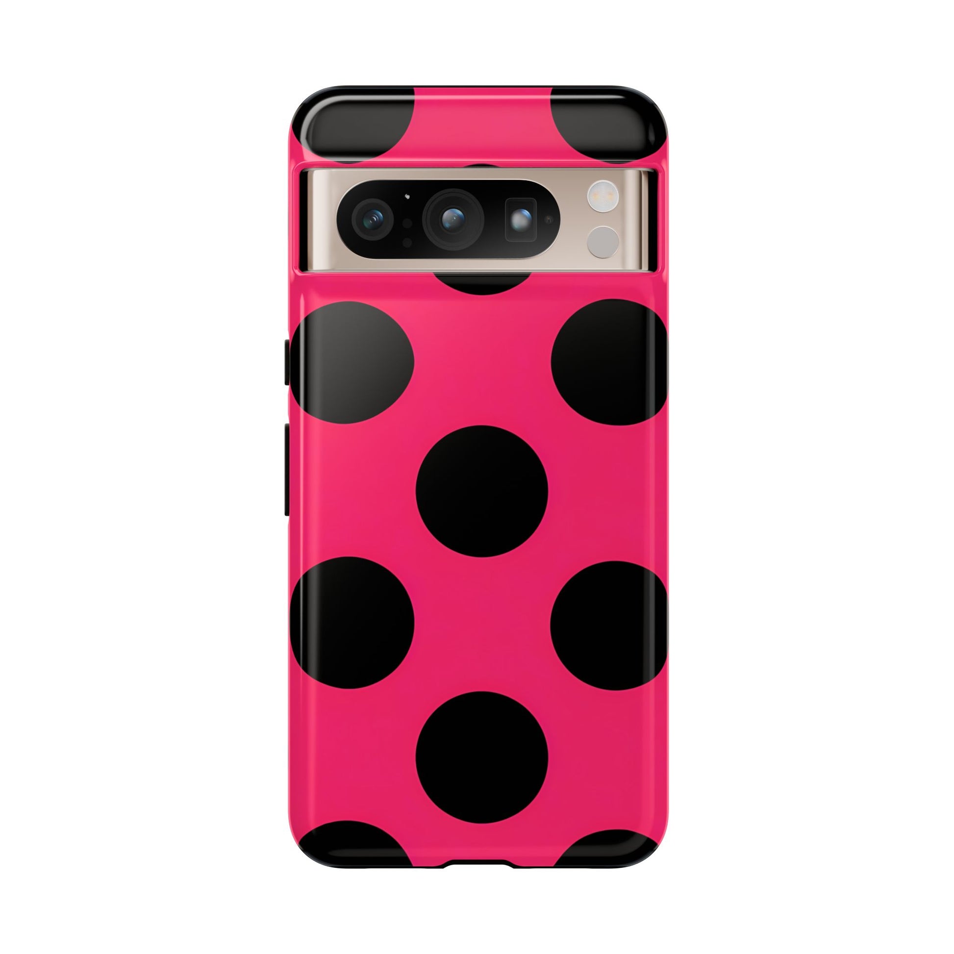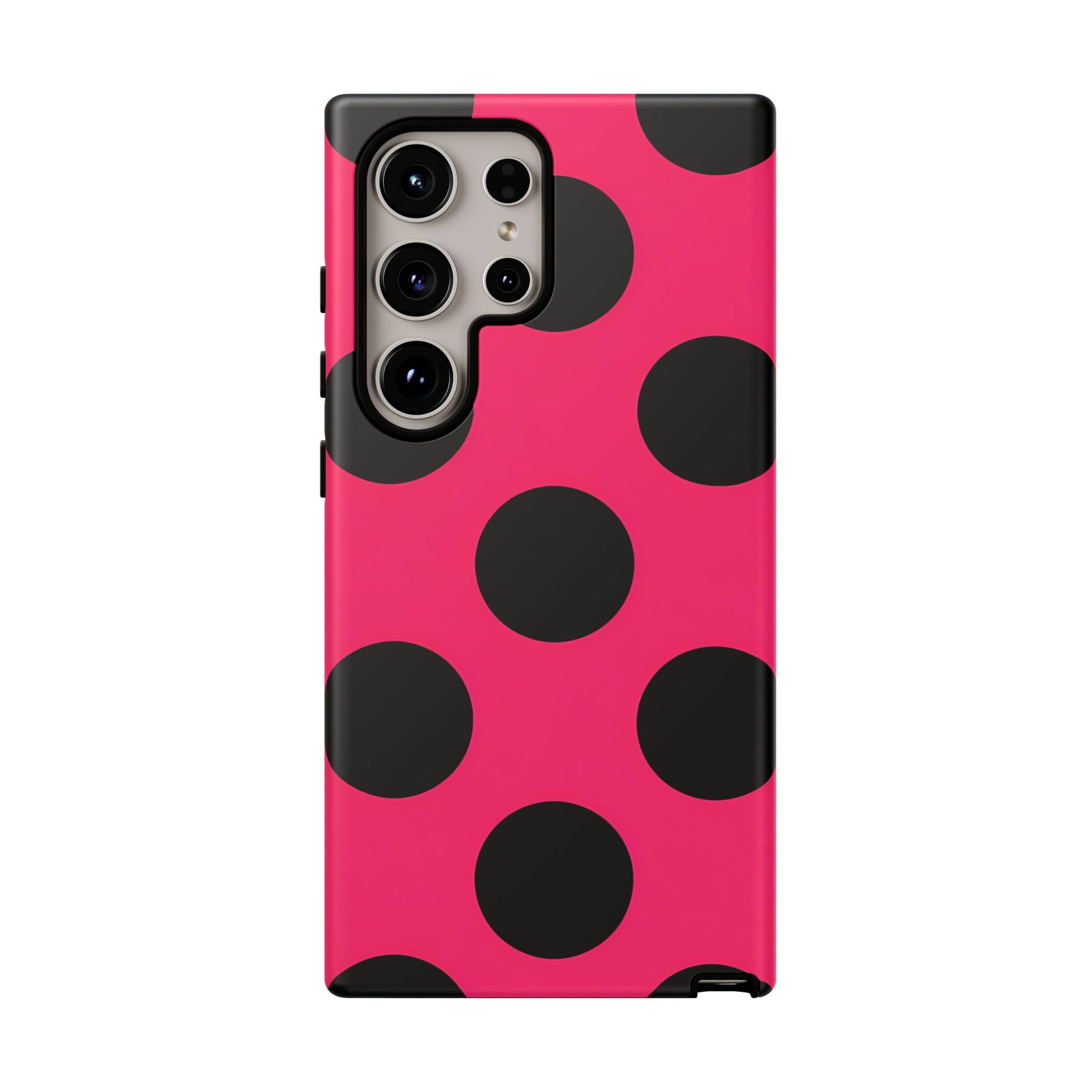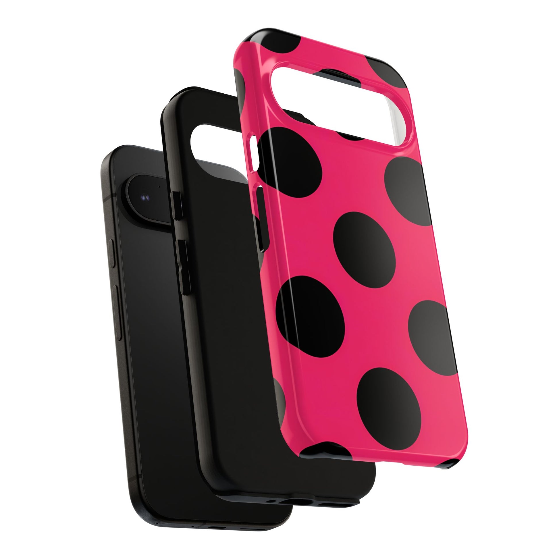 A vivid pink background accented by crisp black polka dots, offering a clean, graphic look that feels both classic and contemporary.