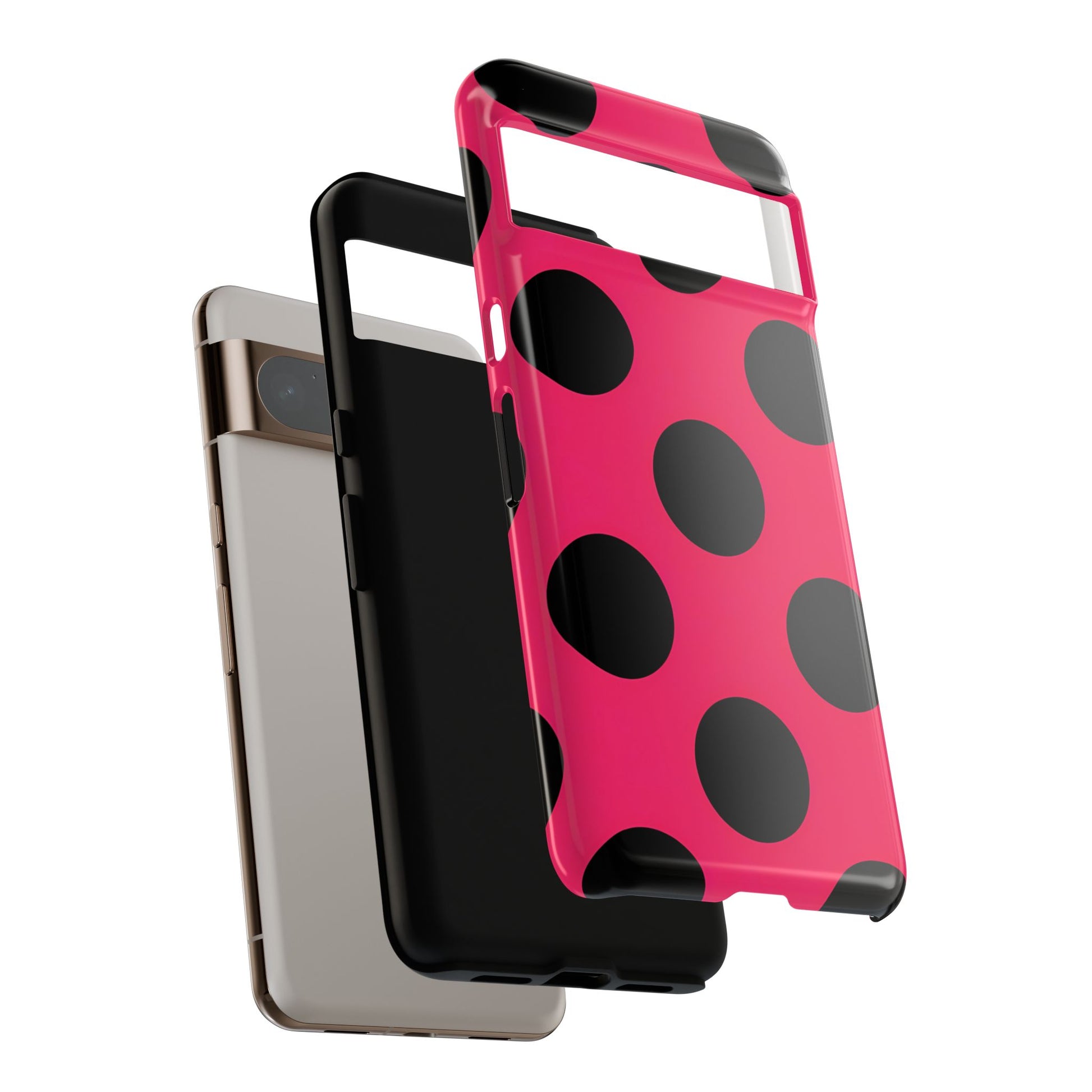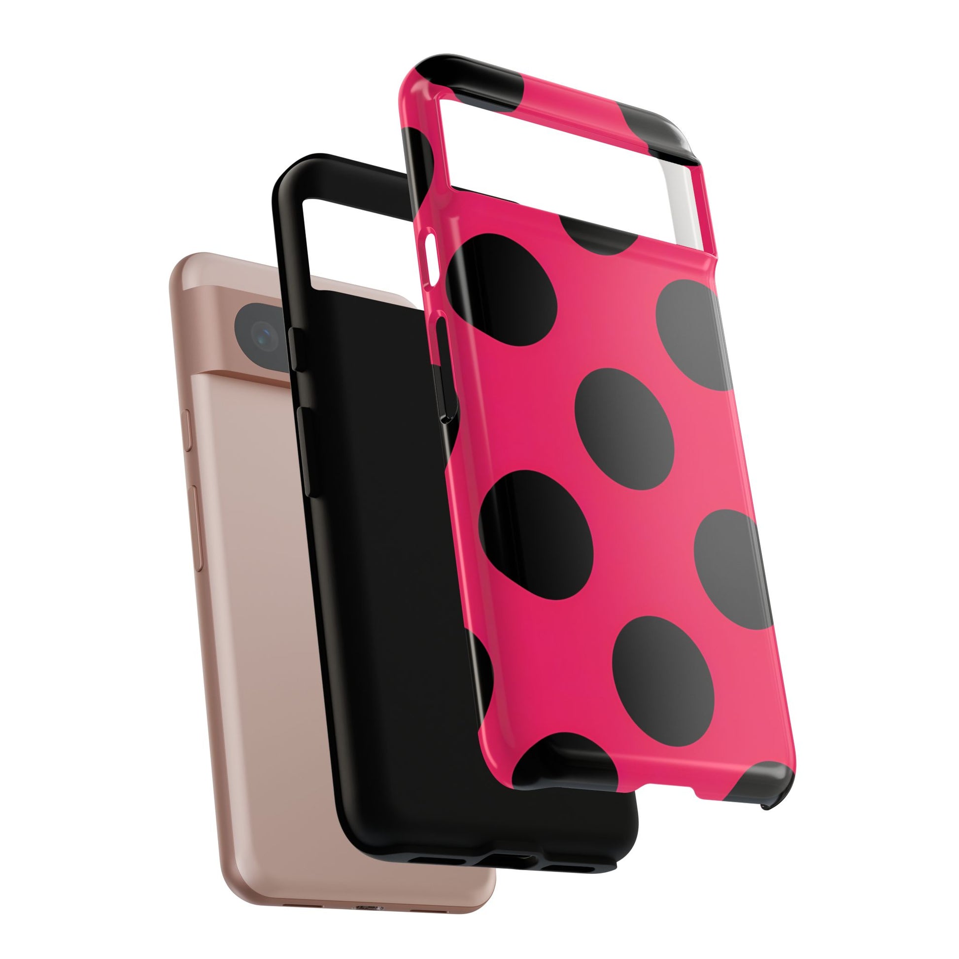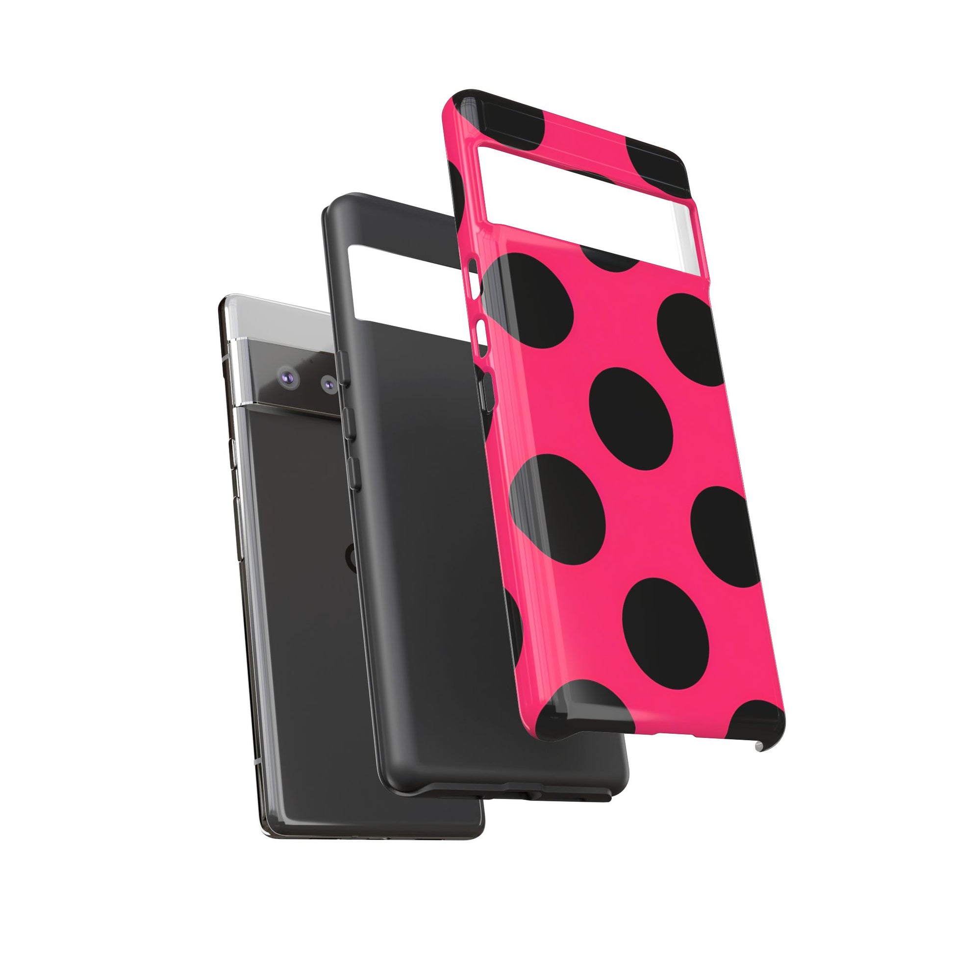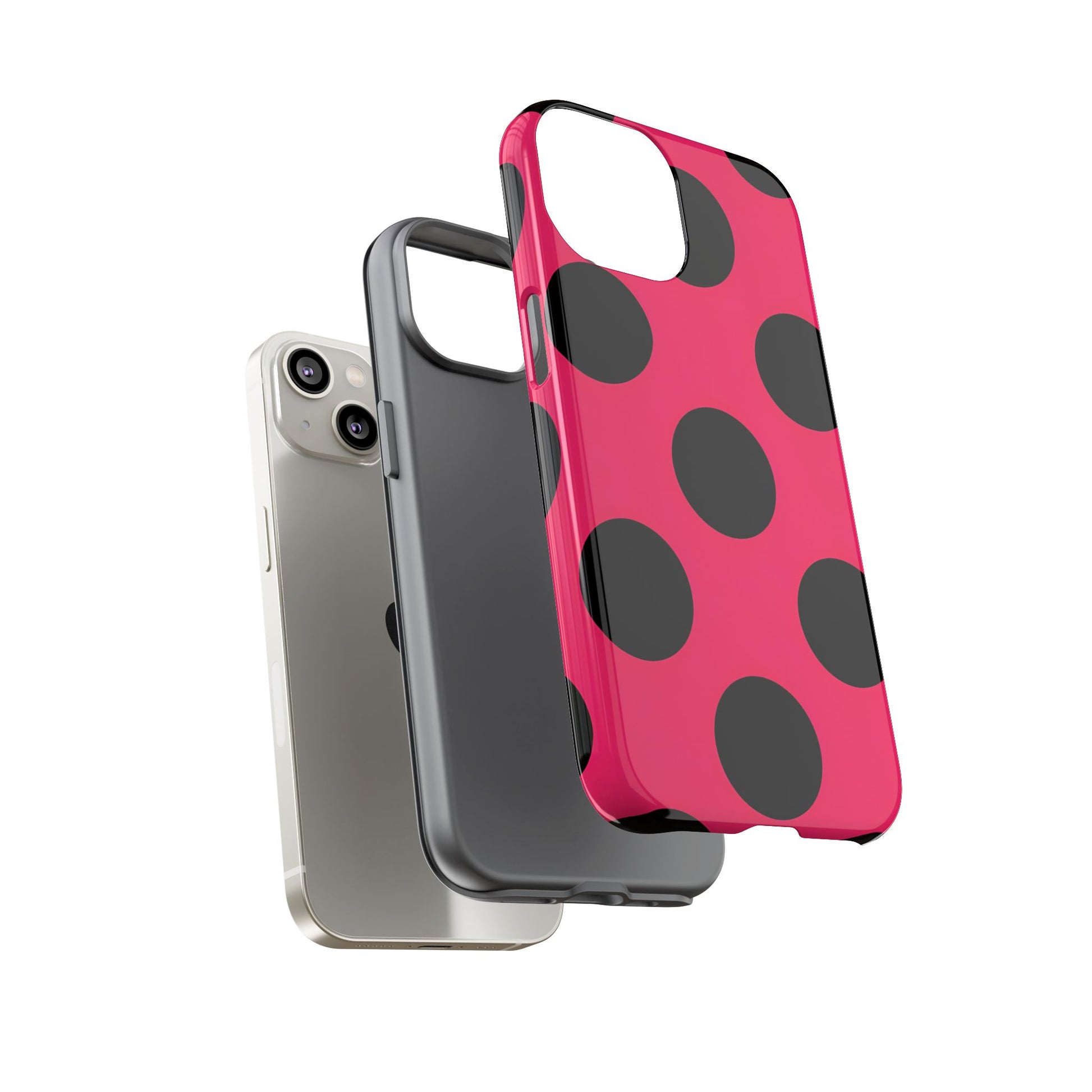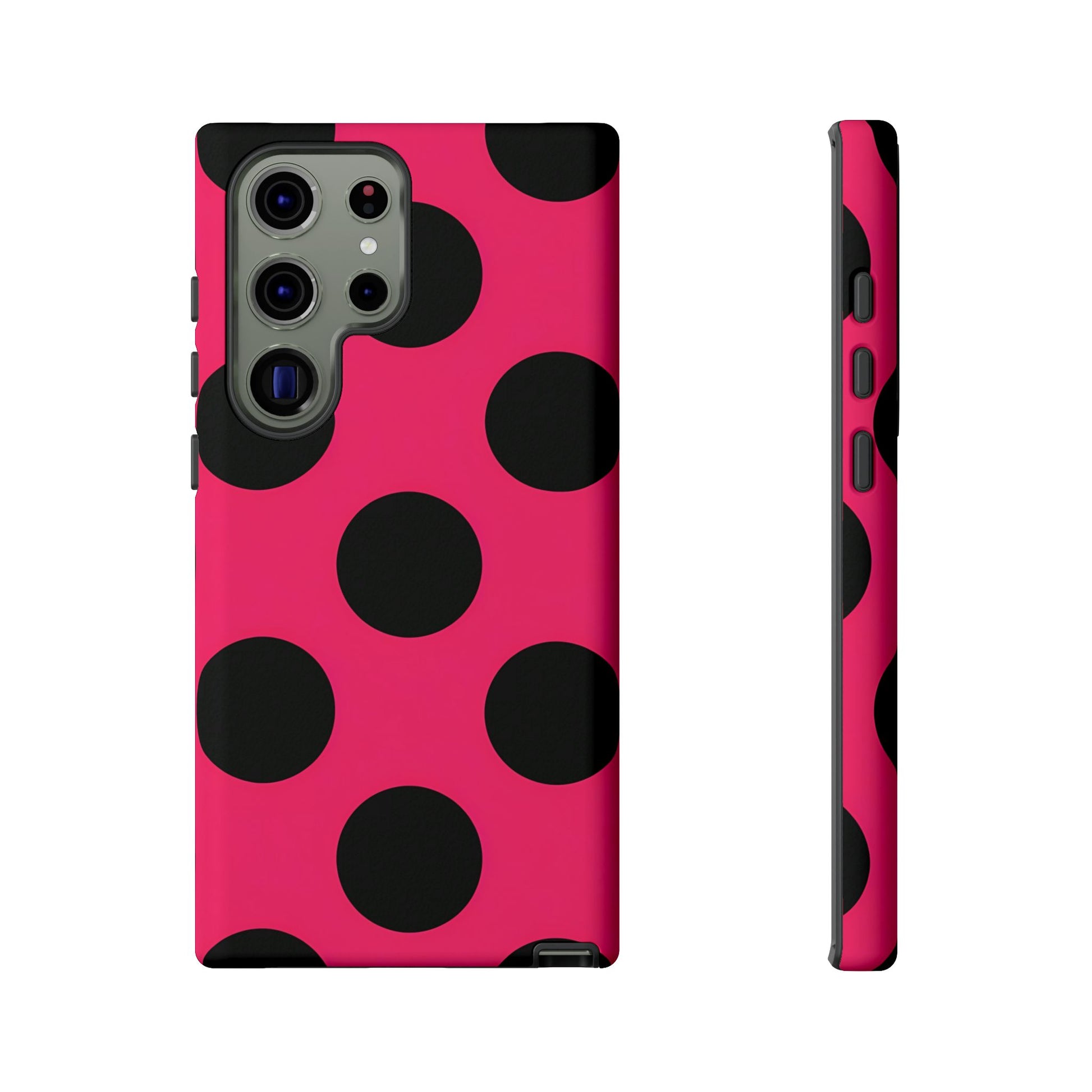 A vivid pink background accented by crisp black polka dots, offering a clean, graphic look that feels both classic and contemporary.