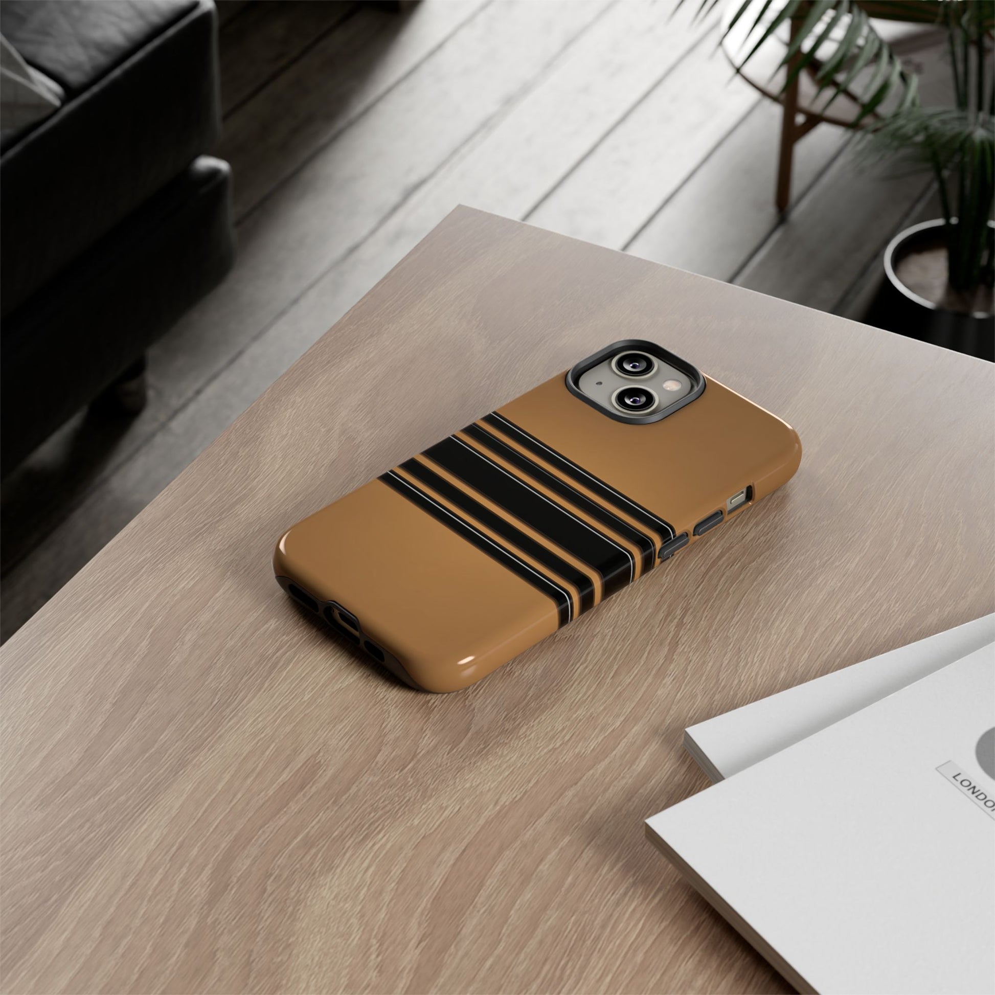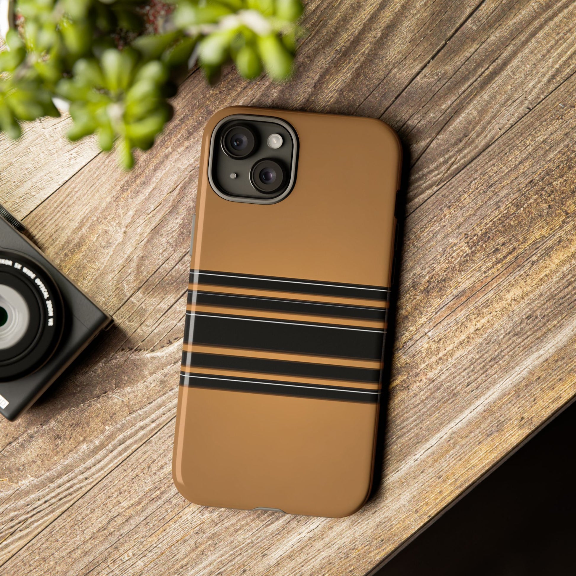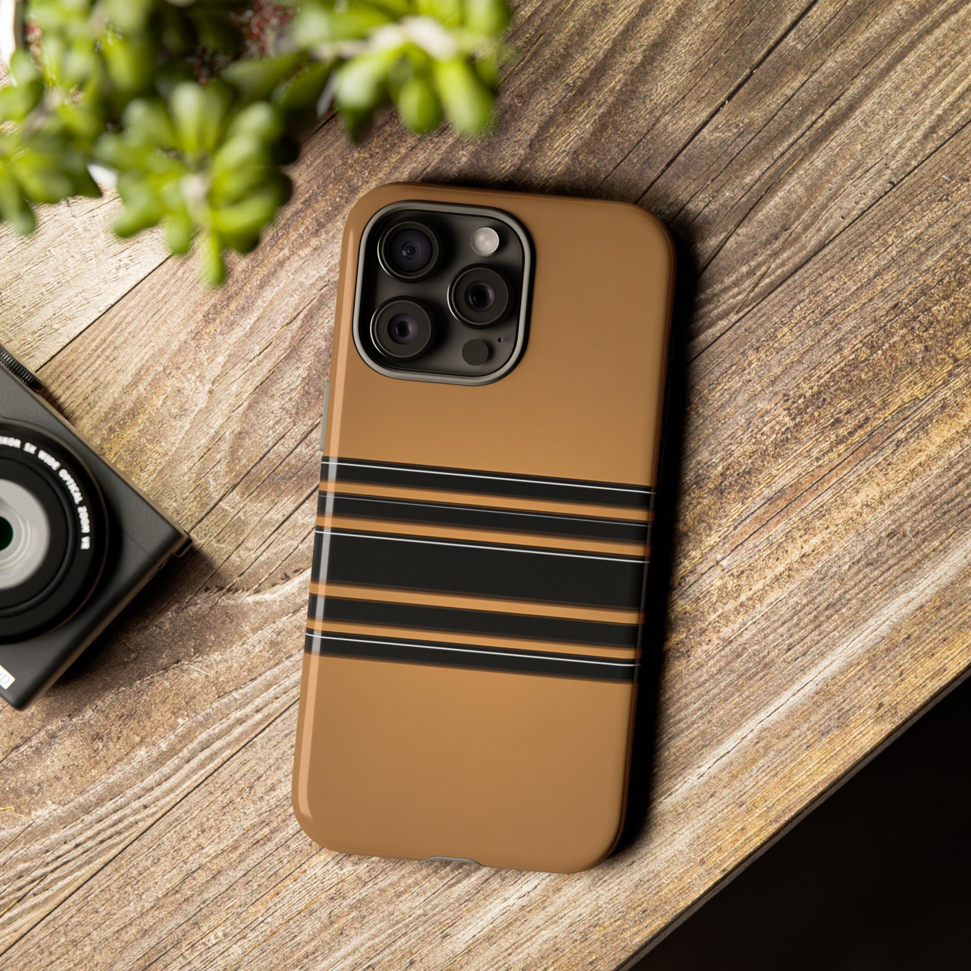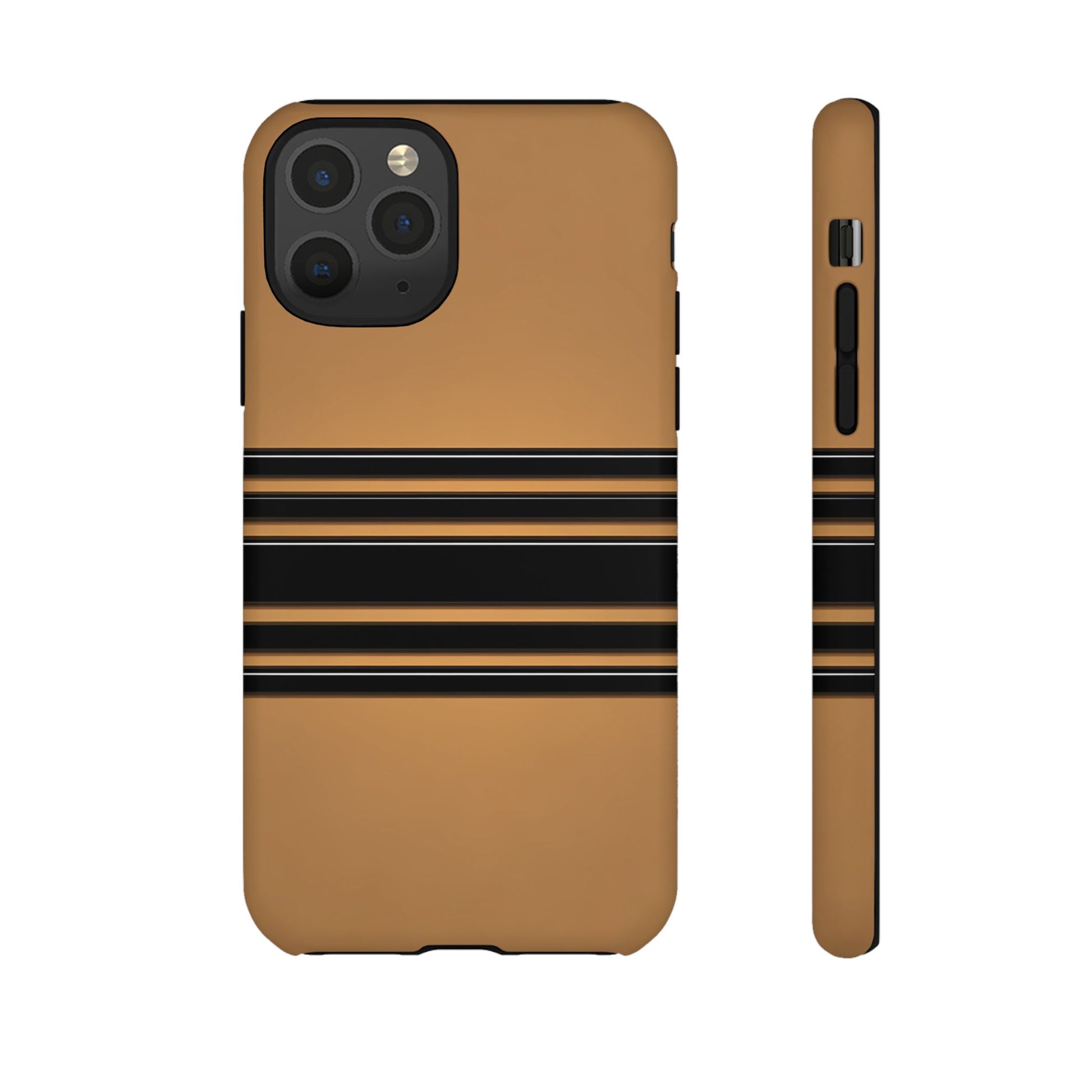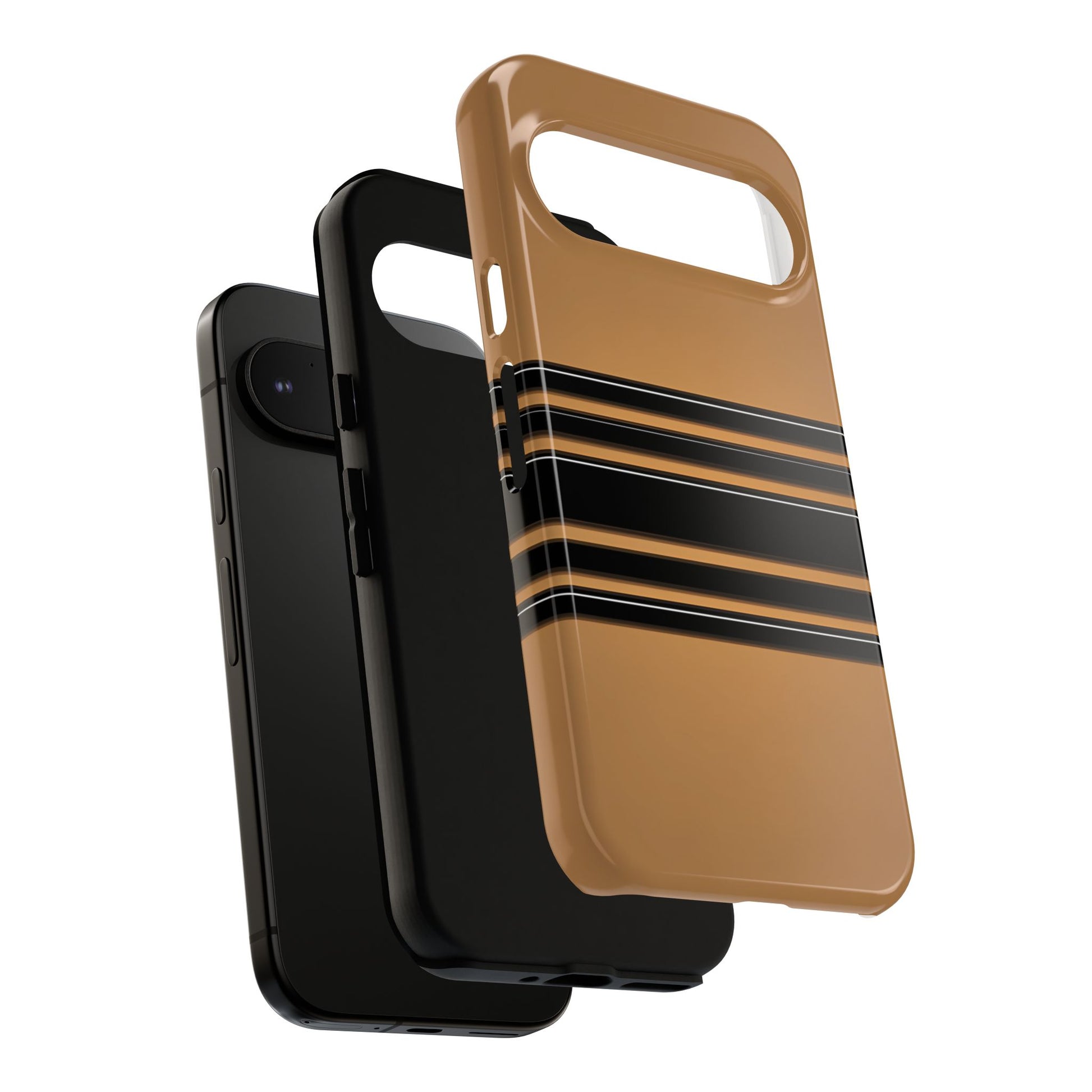 A crisp horizontal stripe centered on a smooth chocolate background for a bold, minimalist look.