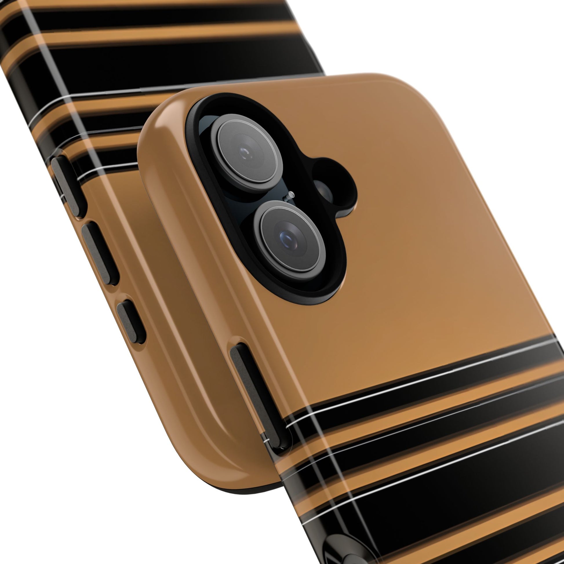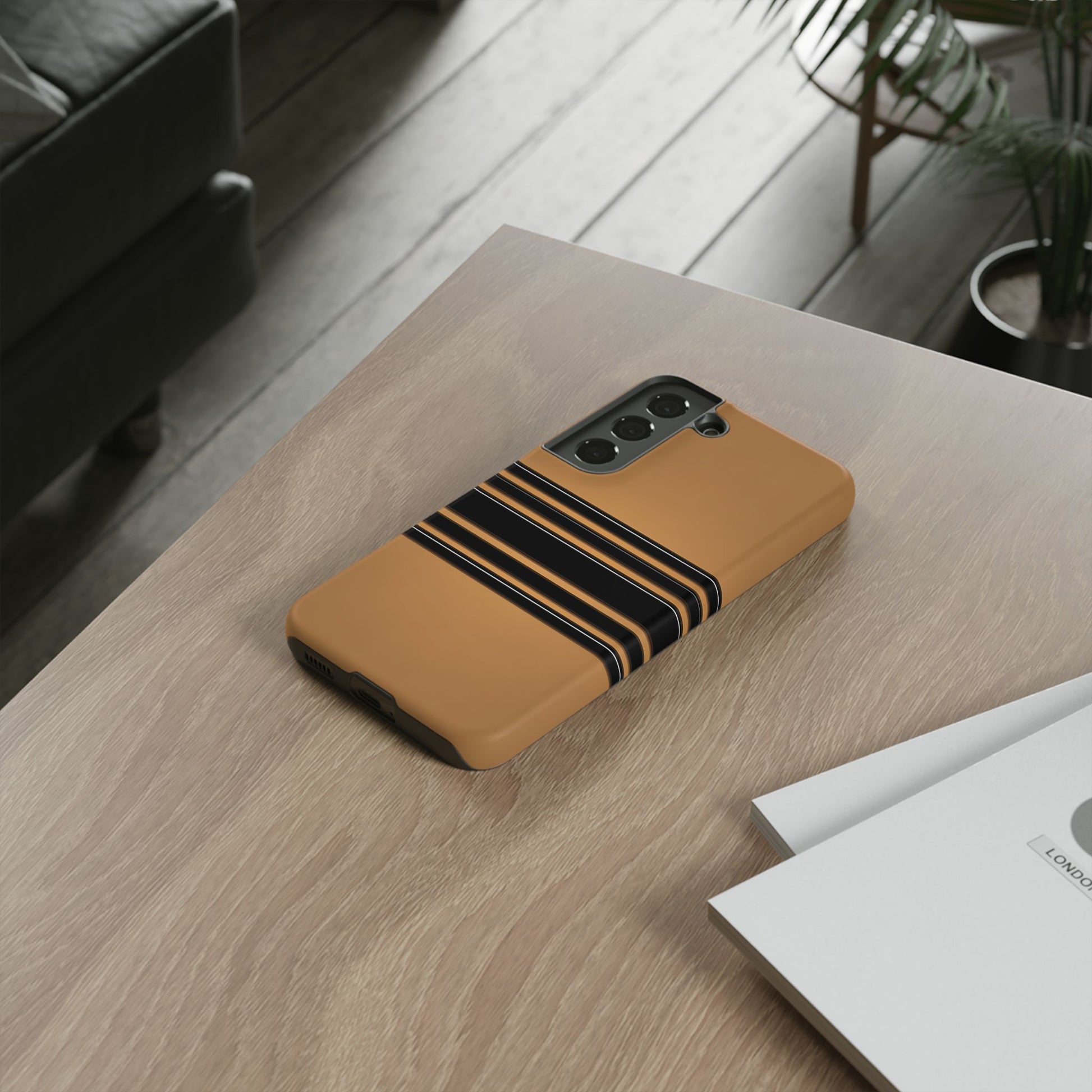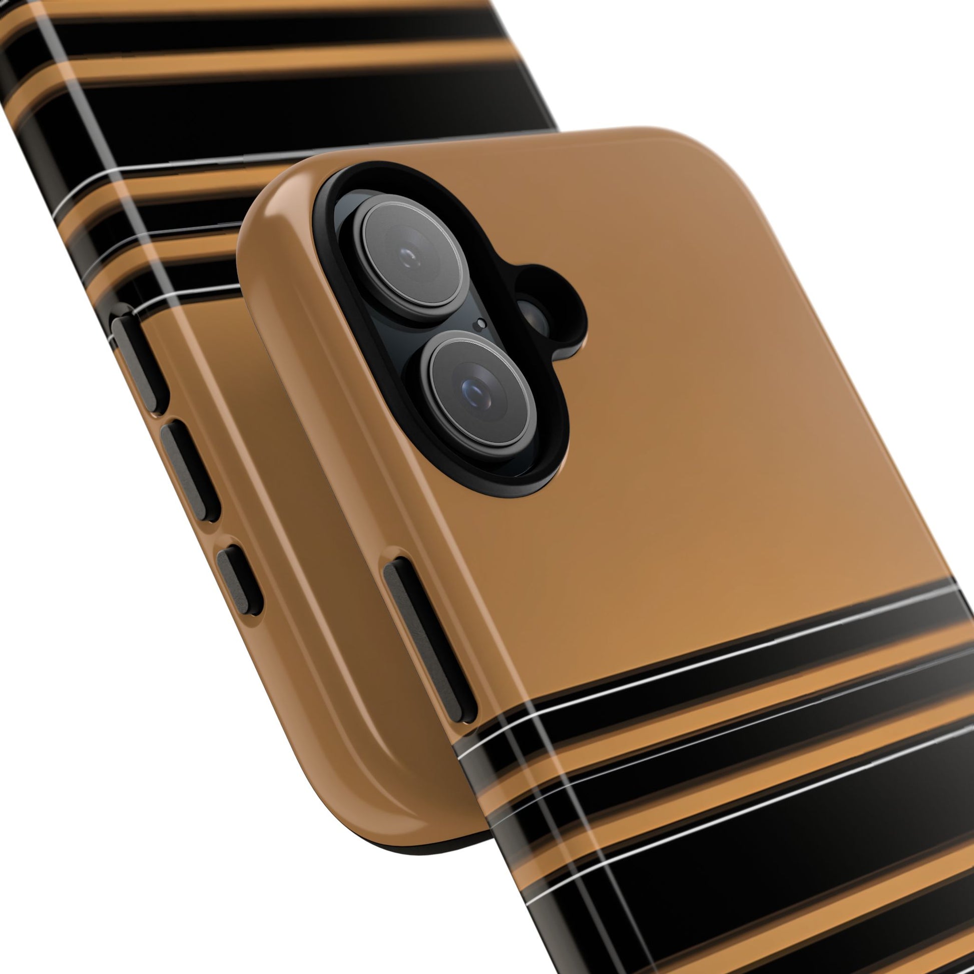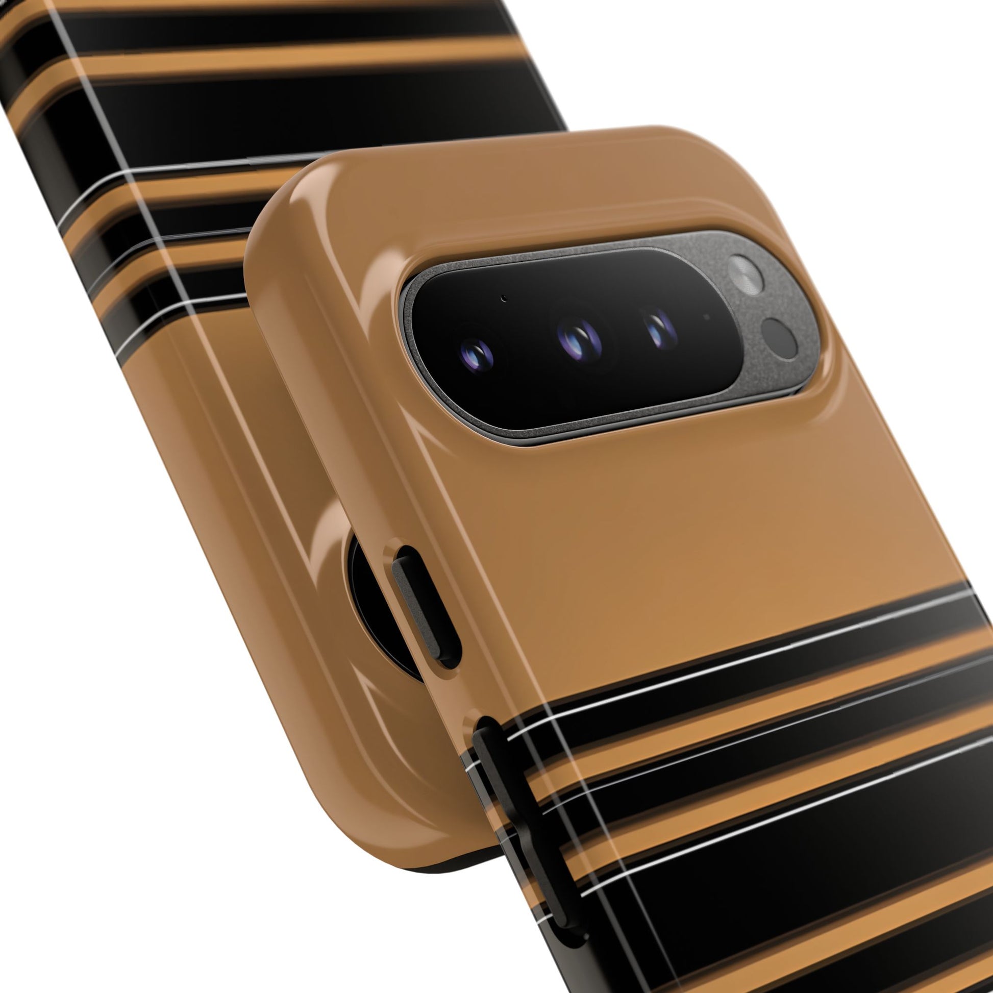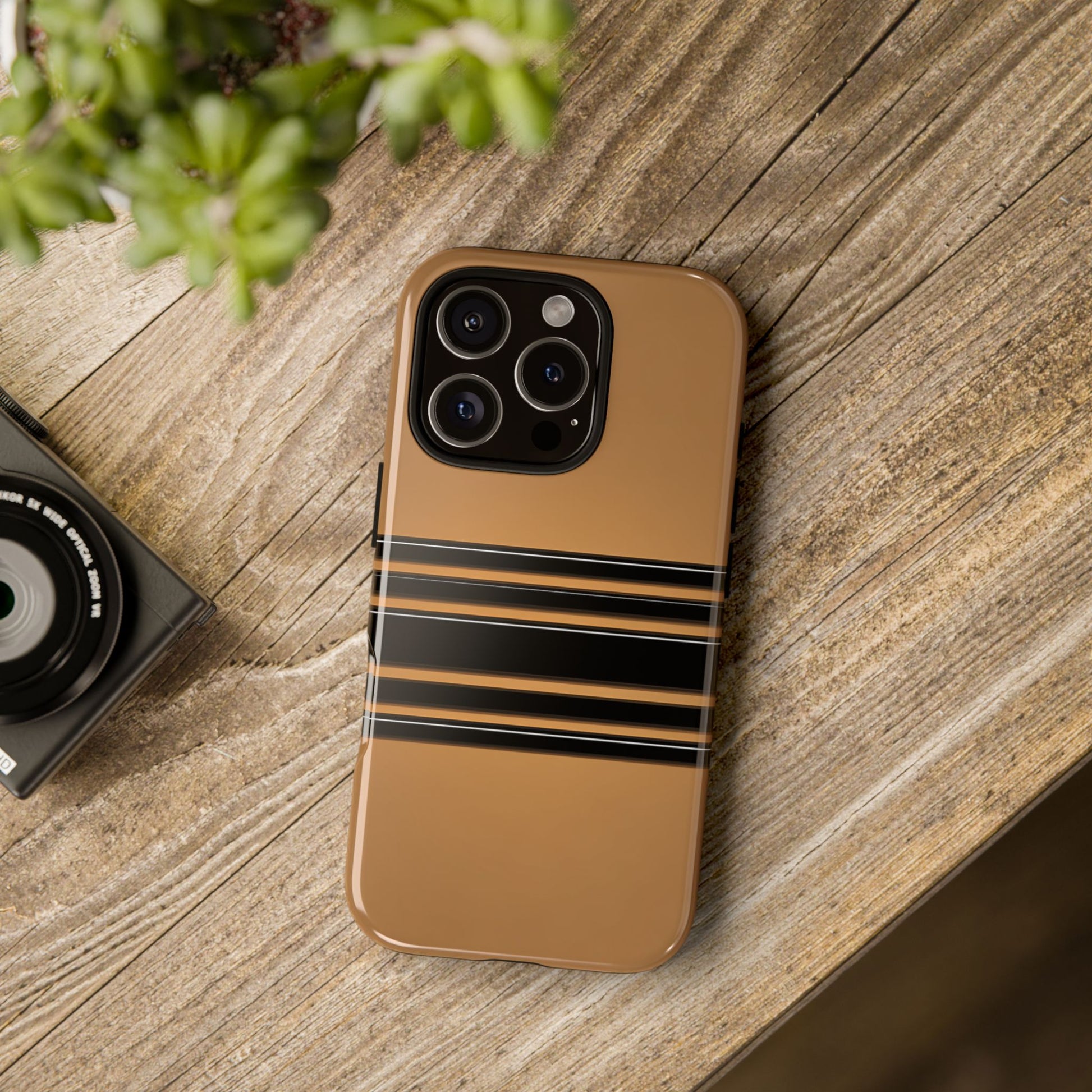 A crisp horizontal stripe centered on a smooth chocolate background for a bold, minimalist look.