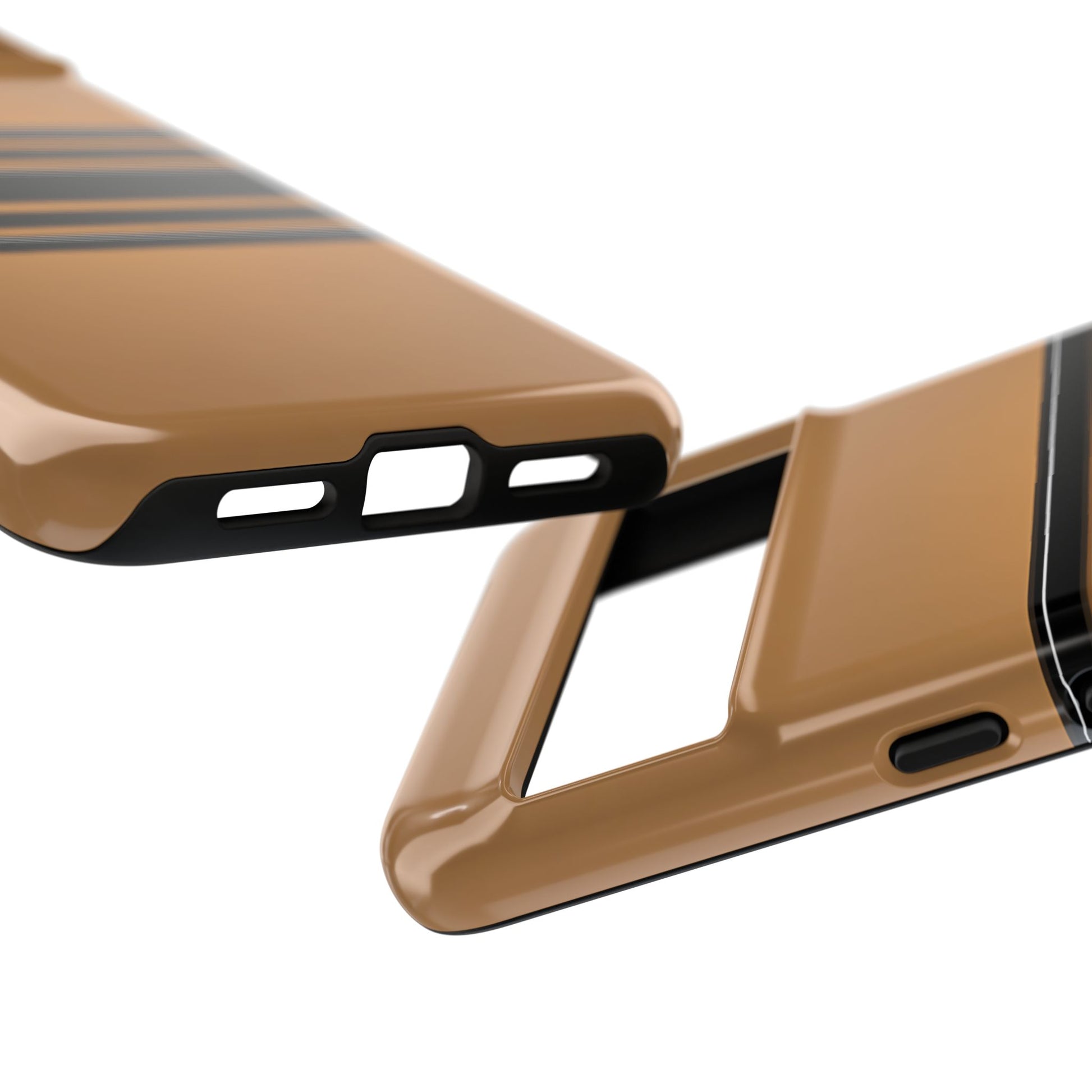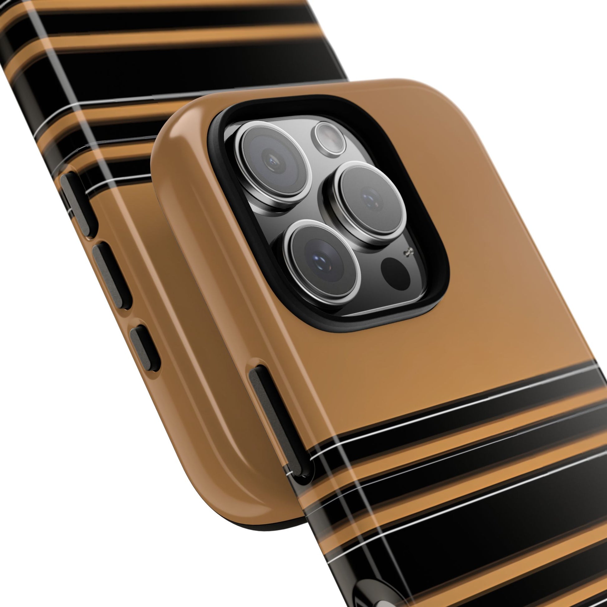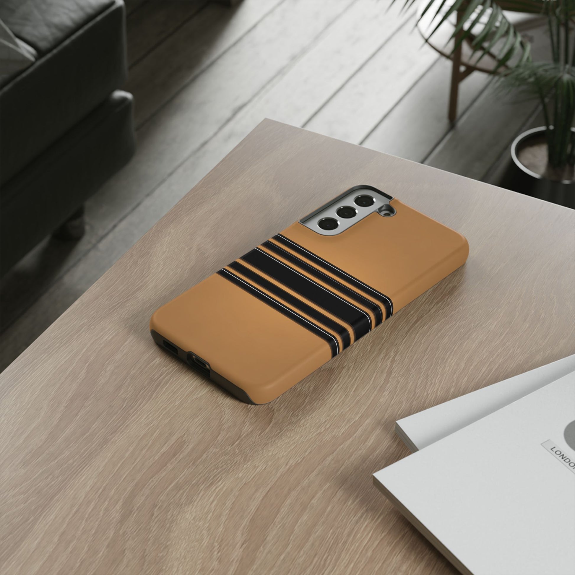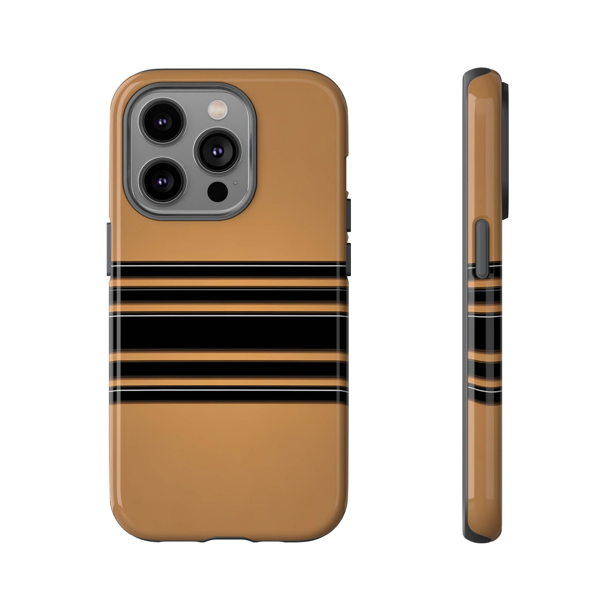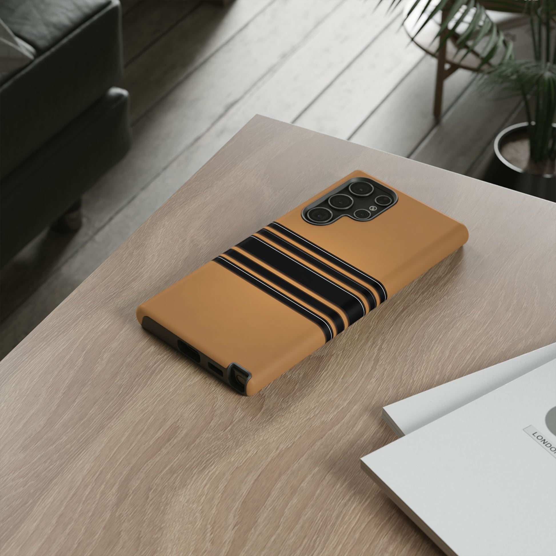 A crisp horizontal stripe centered on a smooth chocolate background for a bold, minimalist look.