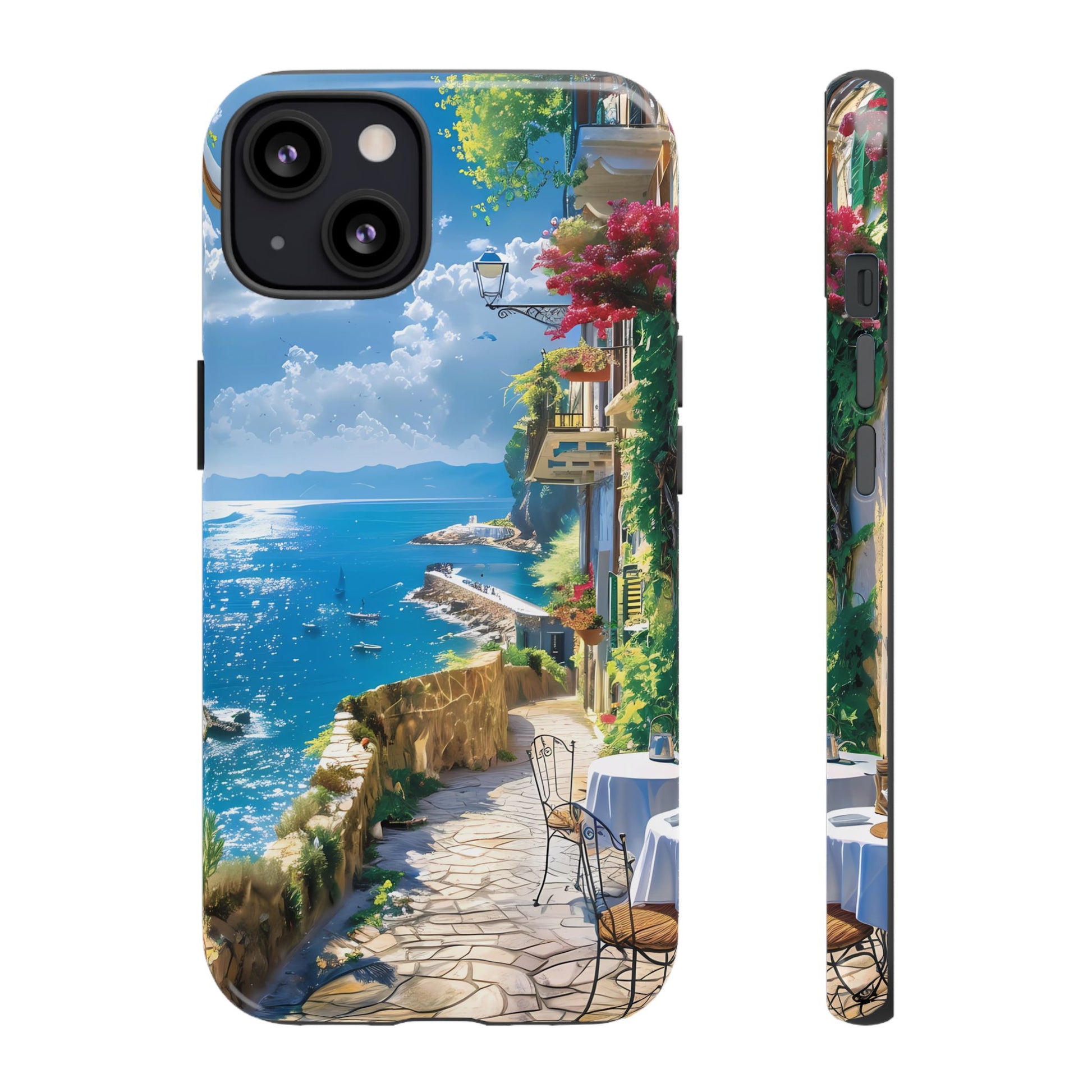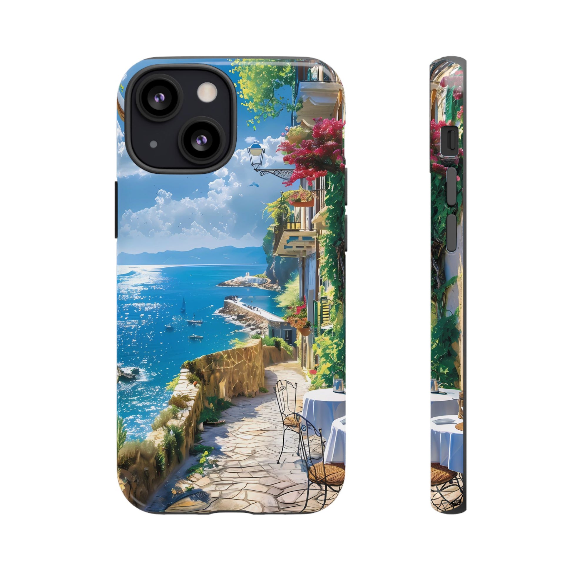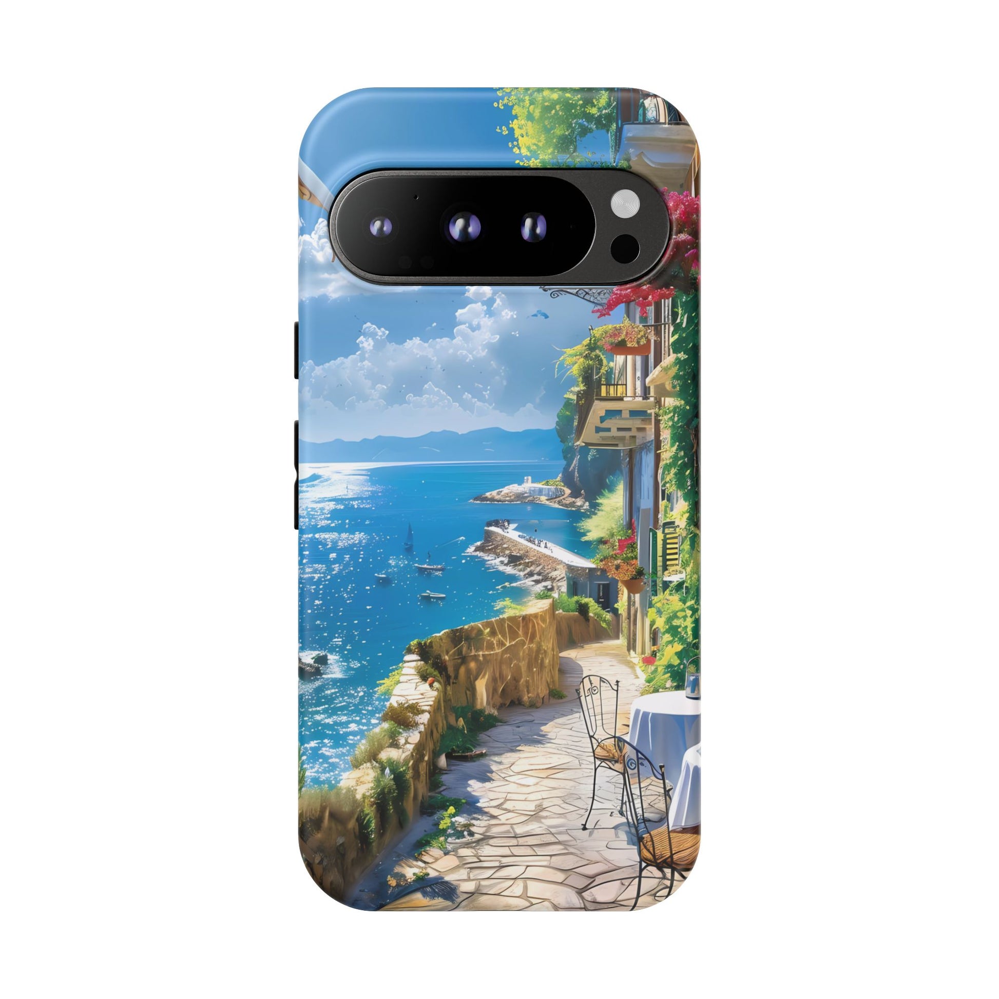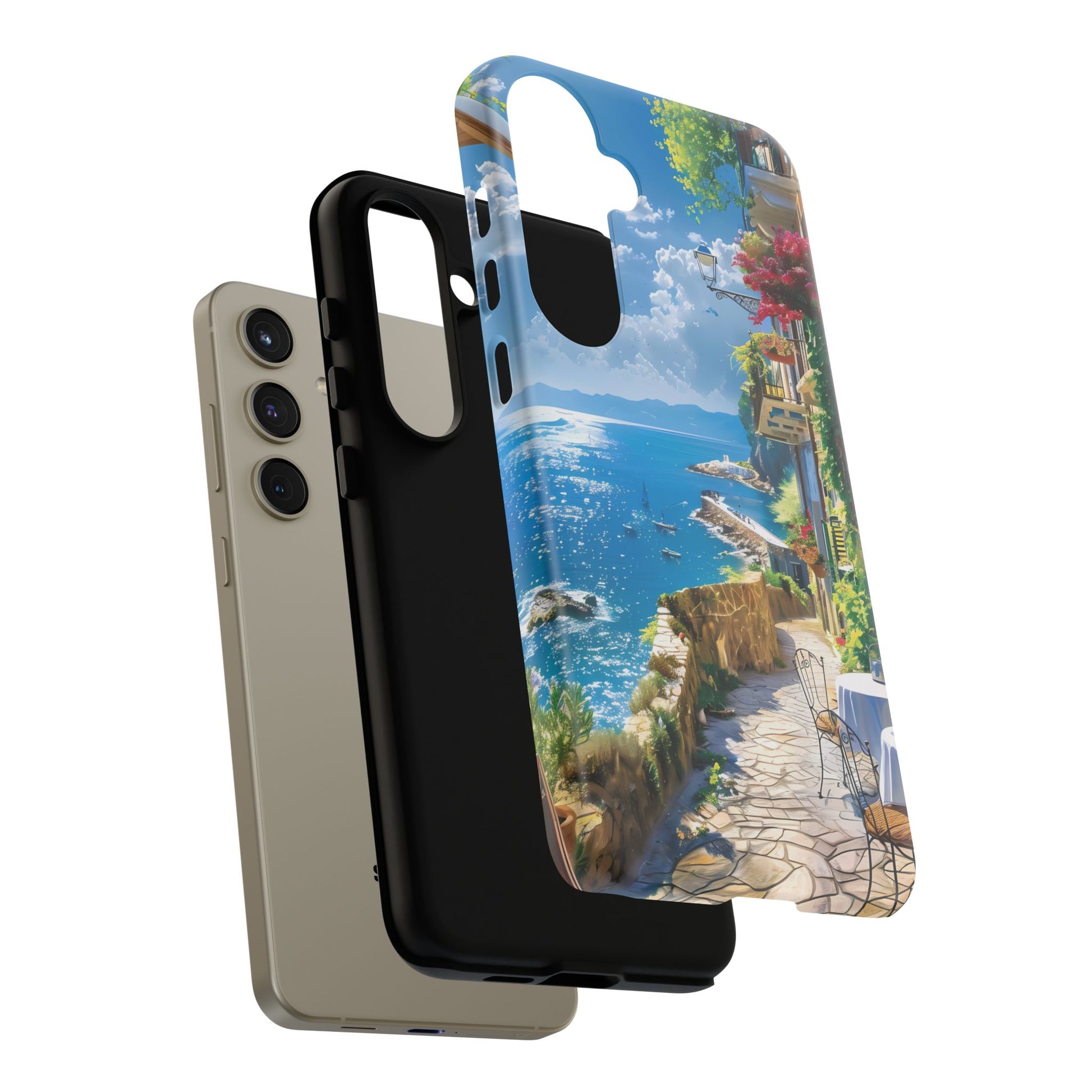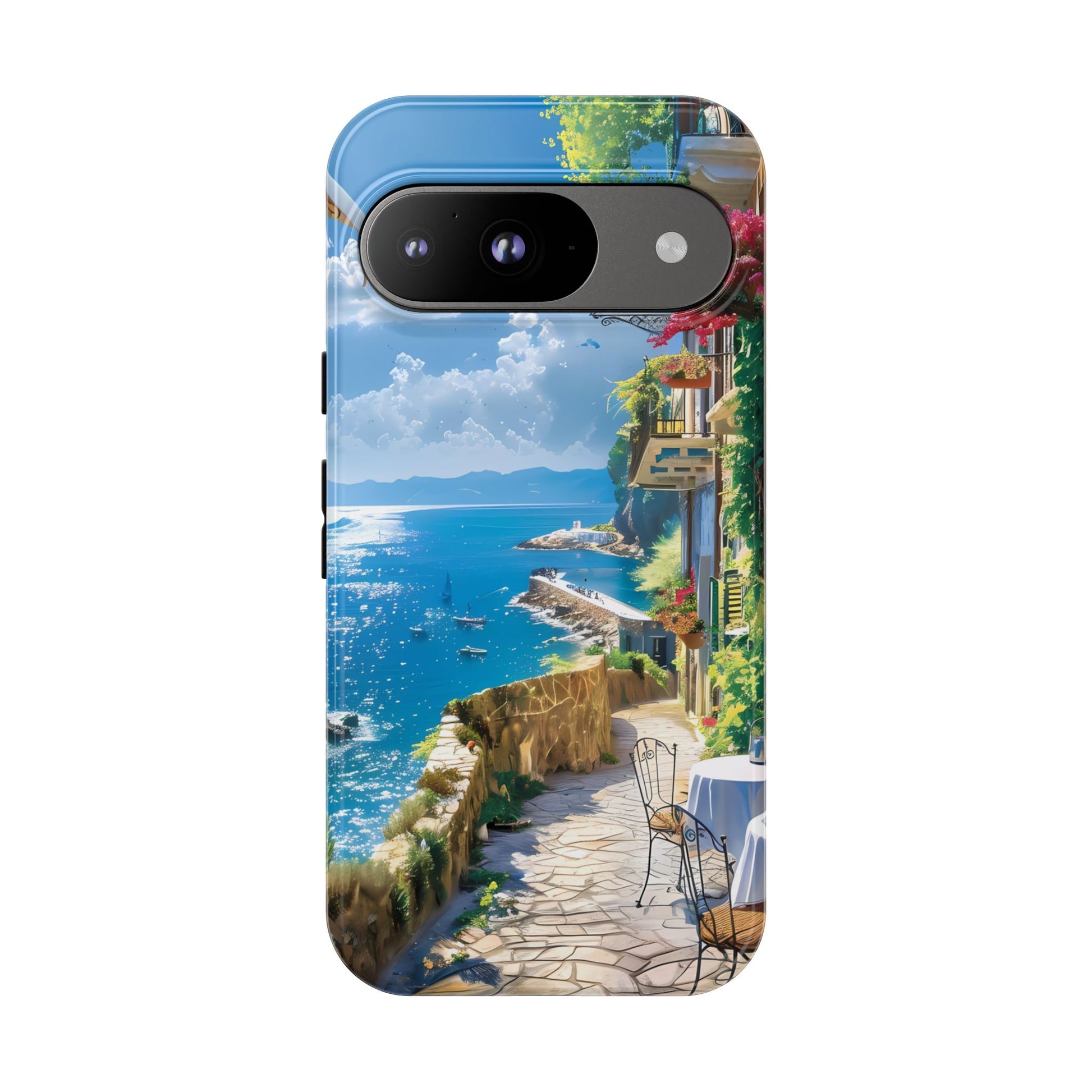 Immerse yourself in the Mediterranean ambiance with this design featuring an outdoor restaurant with a breathtaking ocean view. By day, enjoy the bright, airy setting with elegant furnishings; by night, the scene transforms with soft, glowing lights that highlight the café's relaxed atmosphere