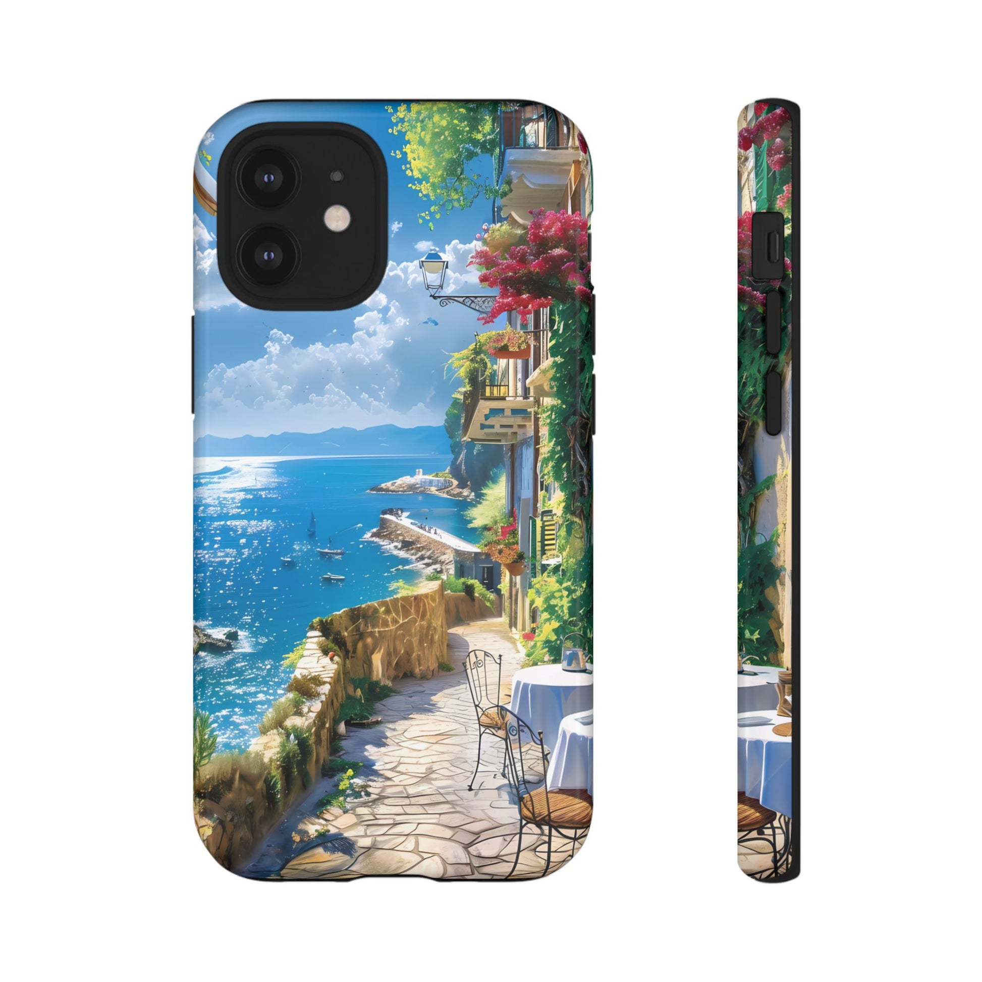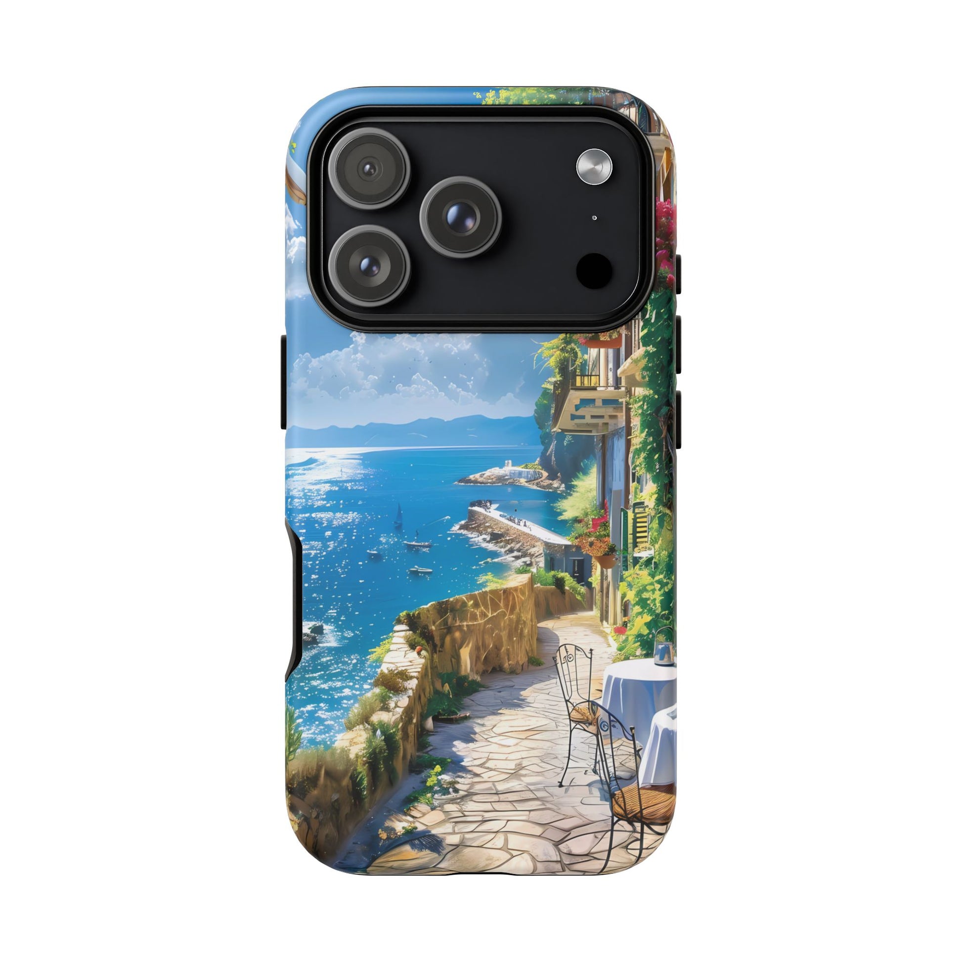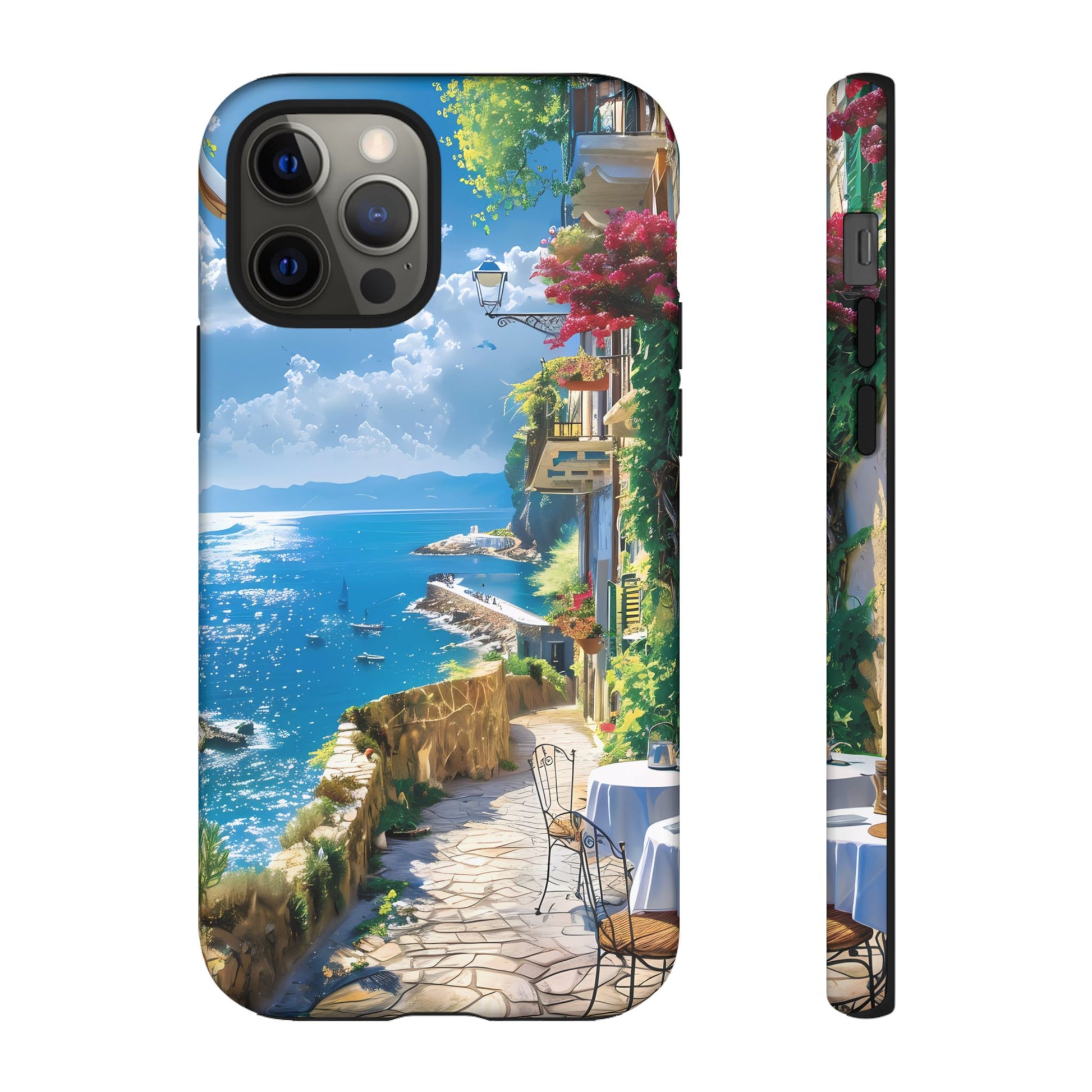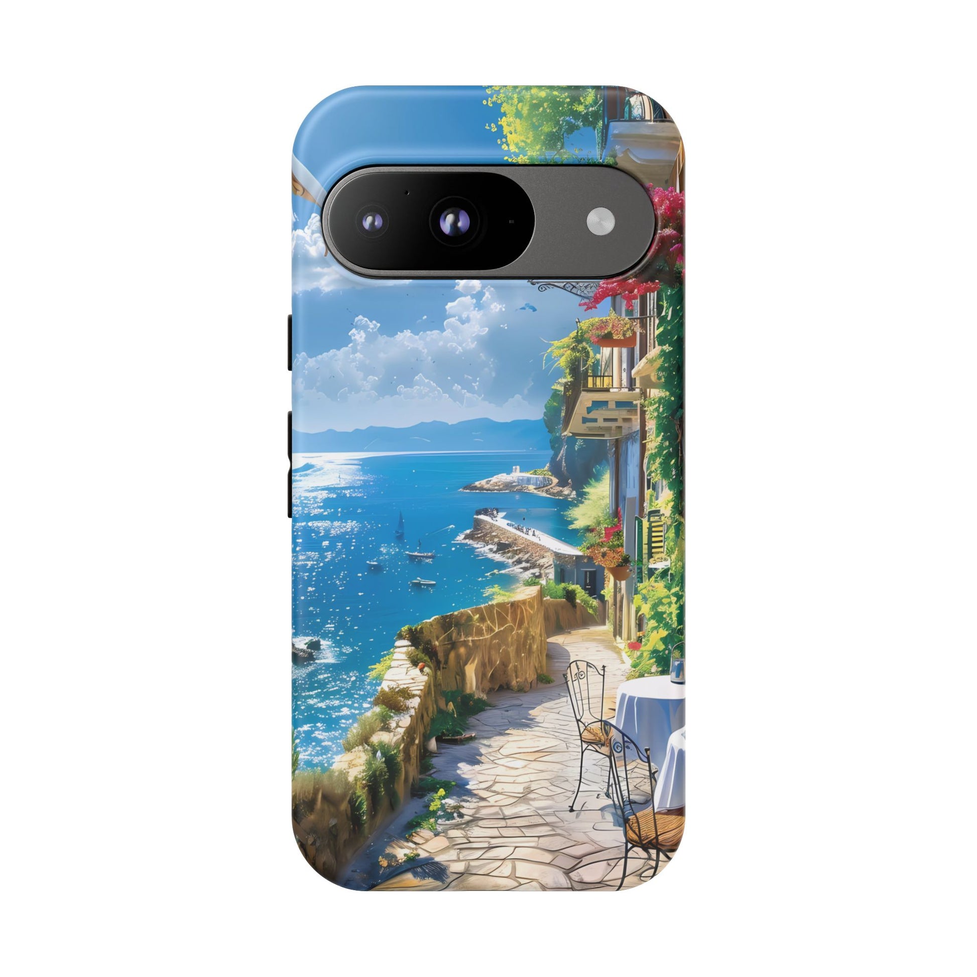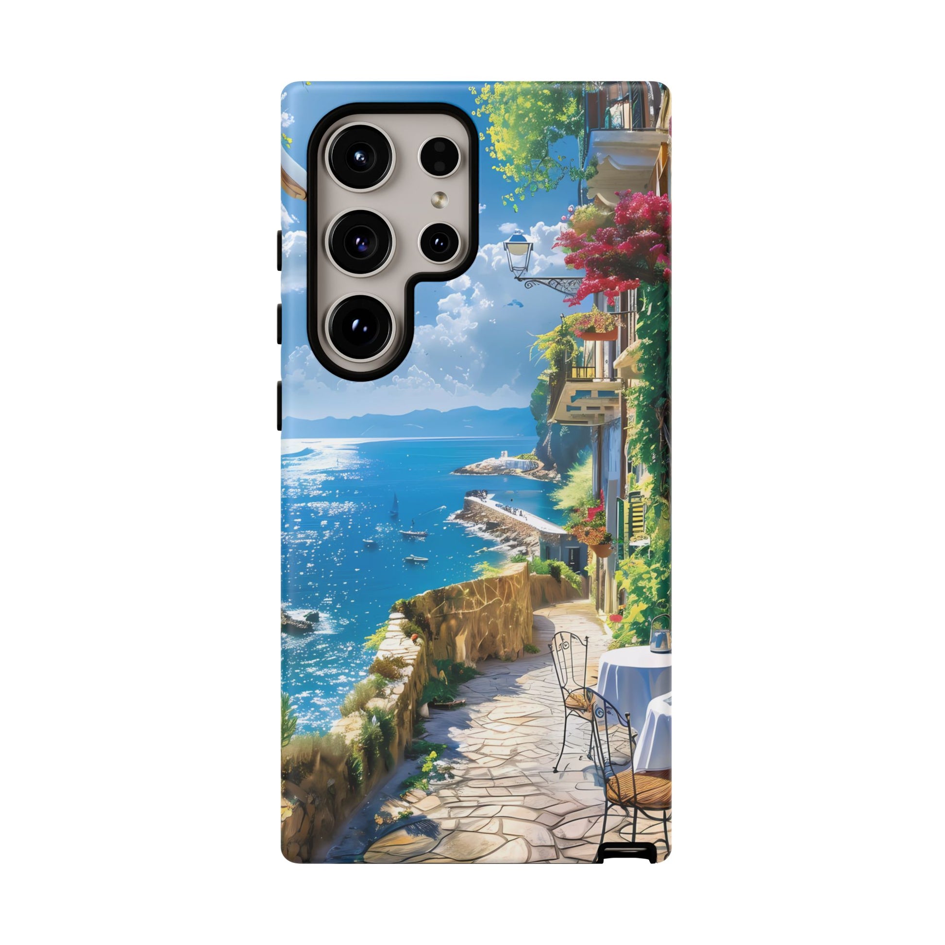 Immerse yourself in the Mediterranean ambiance with this design featuring an outdoor restaurant with a breathtaking ocean view. By day, enjoy the bright, airy setting with elegant furnishings; by night, the scene transforms with soft, glowing lights that highlight the café's relaxed atmosphere