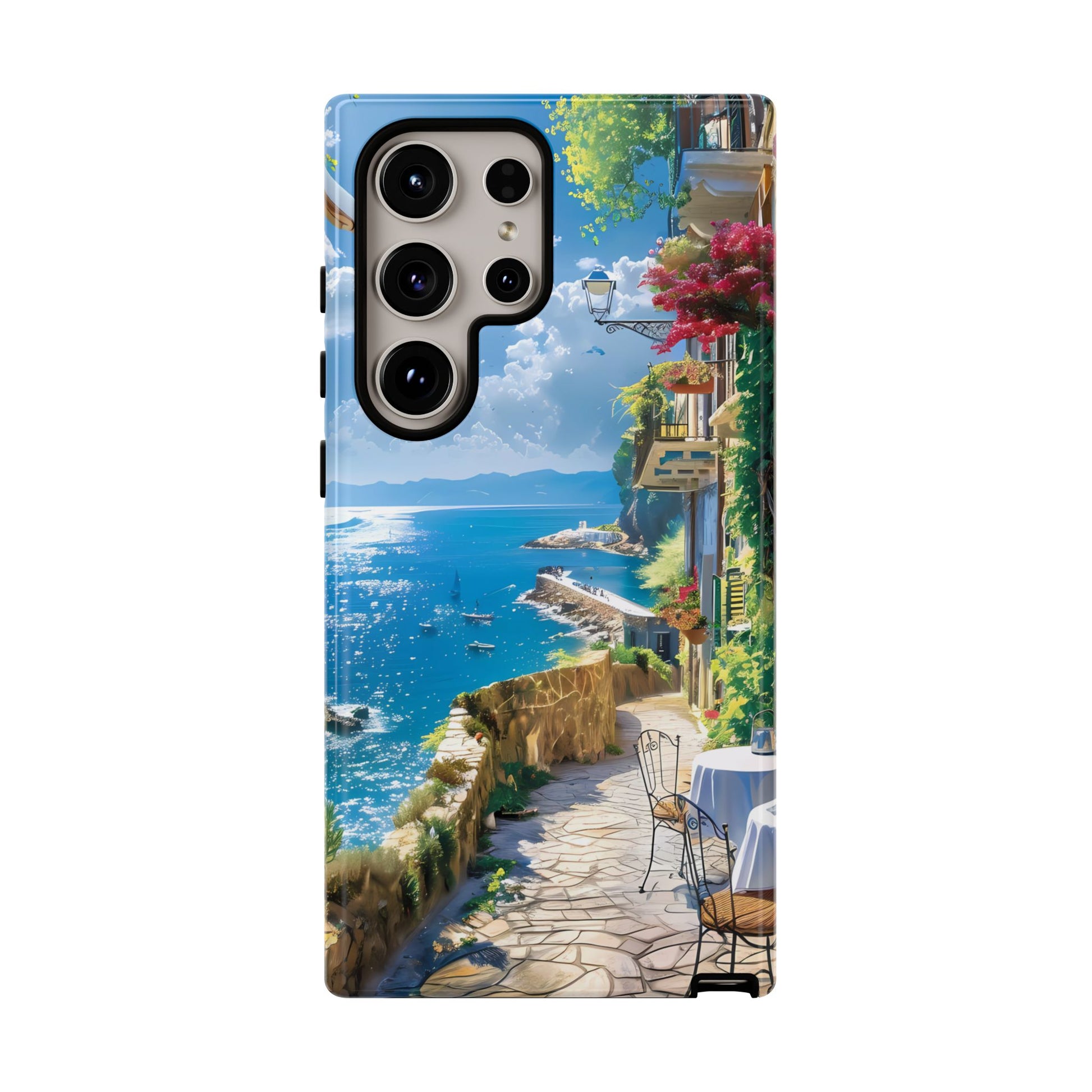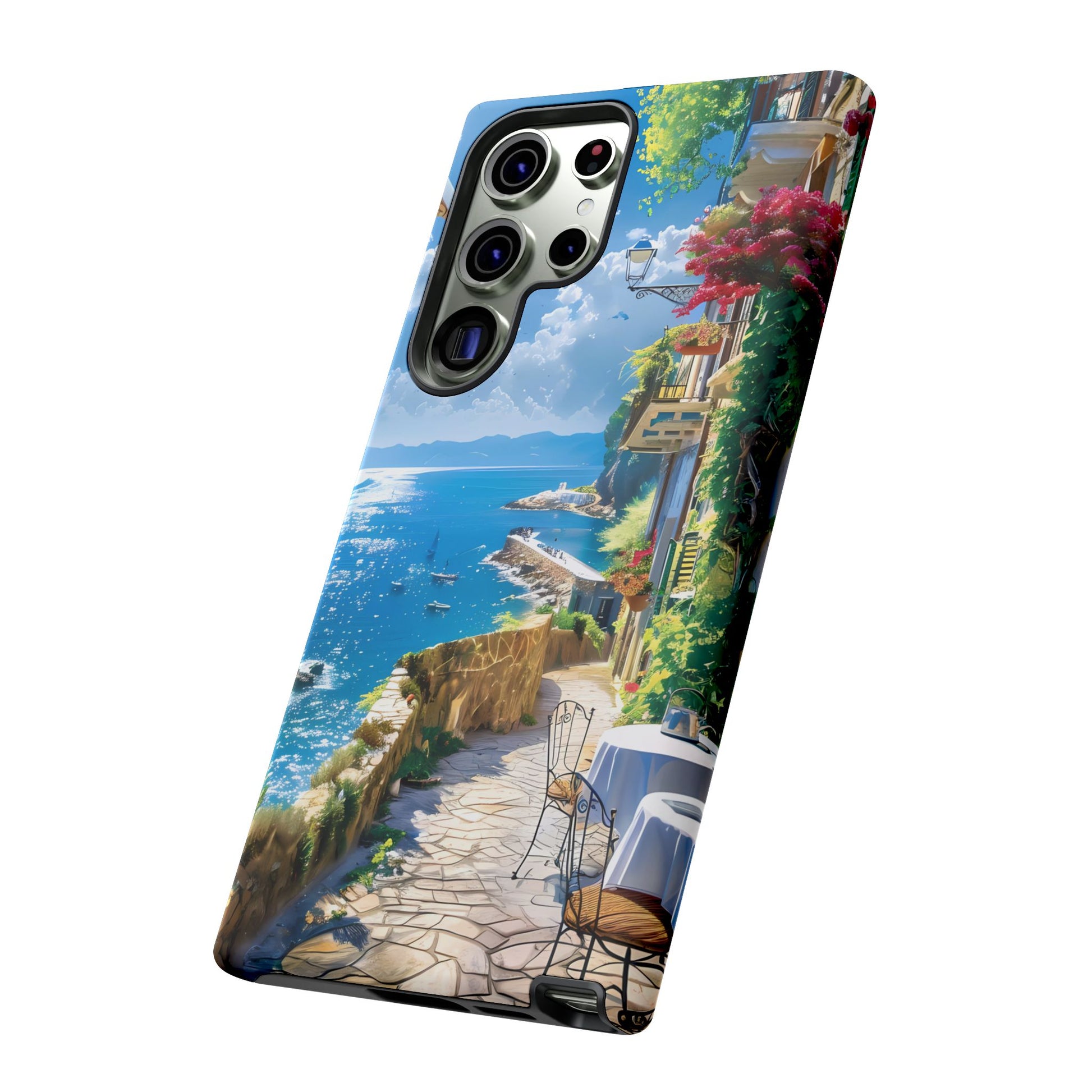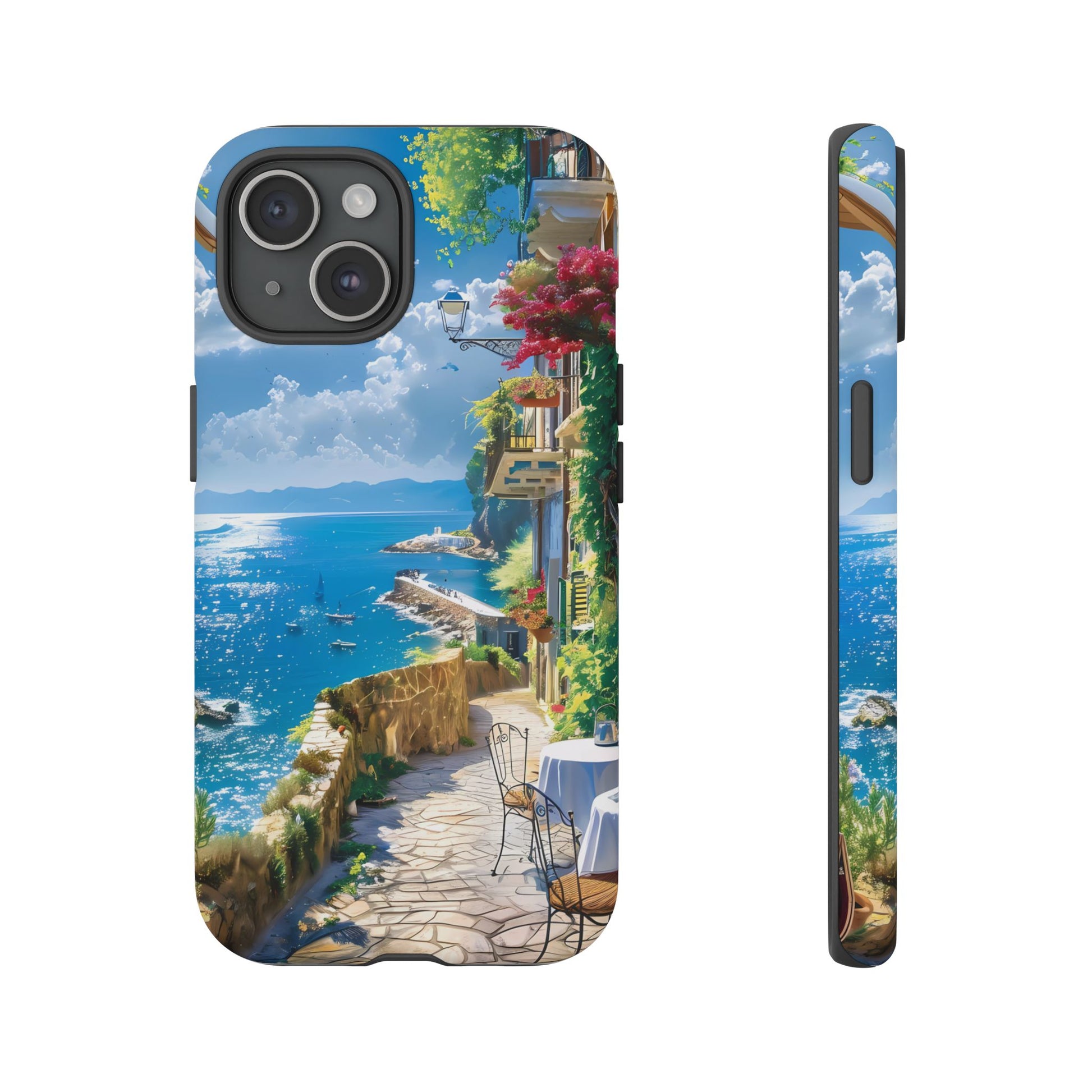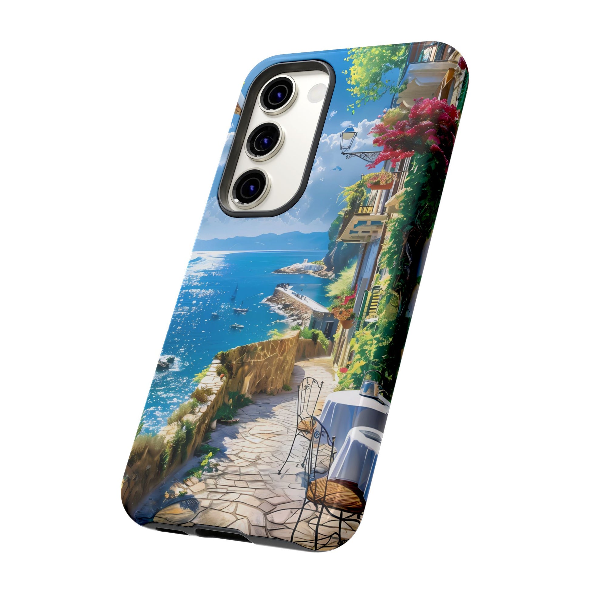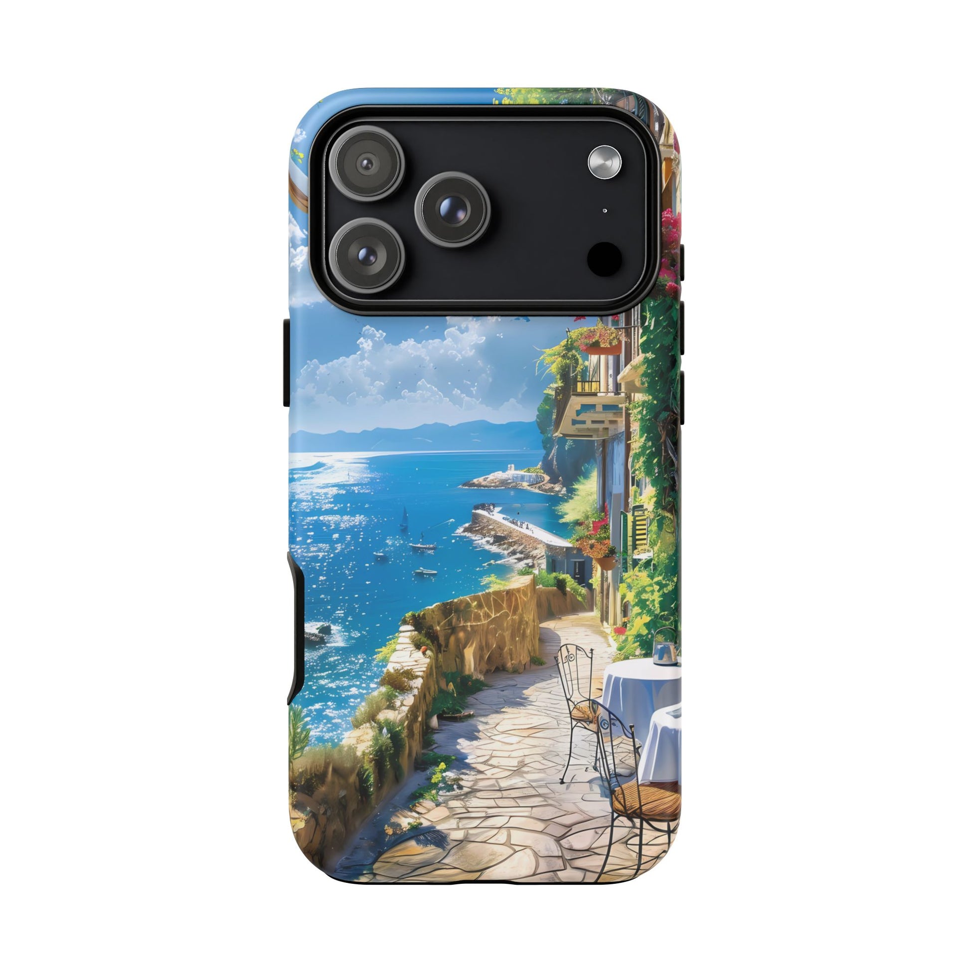 Immerse yourself in the Mediterranean ambiance with this design featuring an outdoor restaurant with a breathtaking ocean view. By day, enjoy the bright, airy setting with elegant furnishings; by night, the scene transforms with soft, glowing lights that highlight the café's relaxed atmosphere