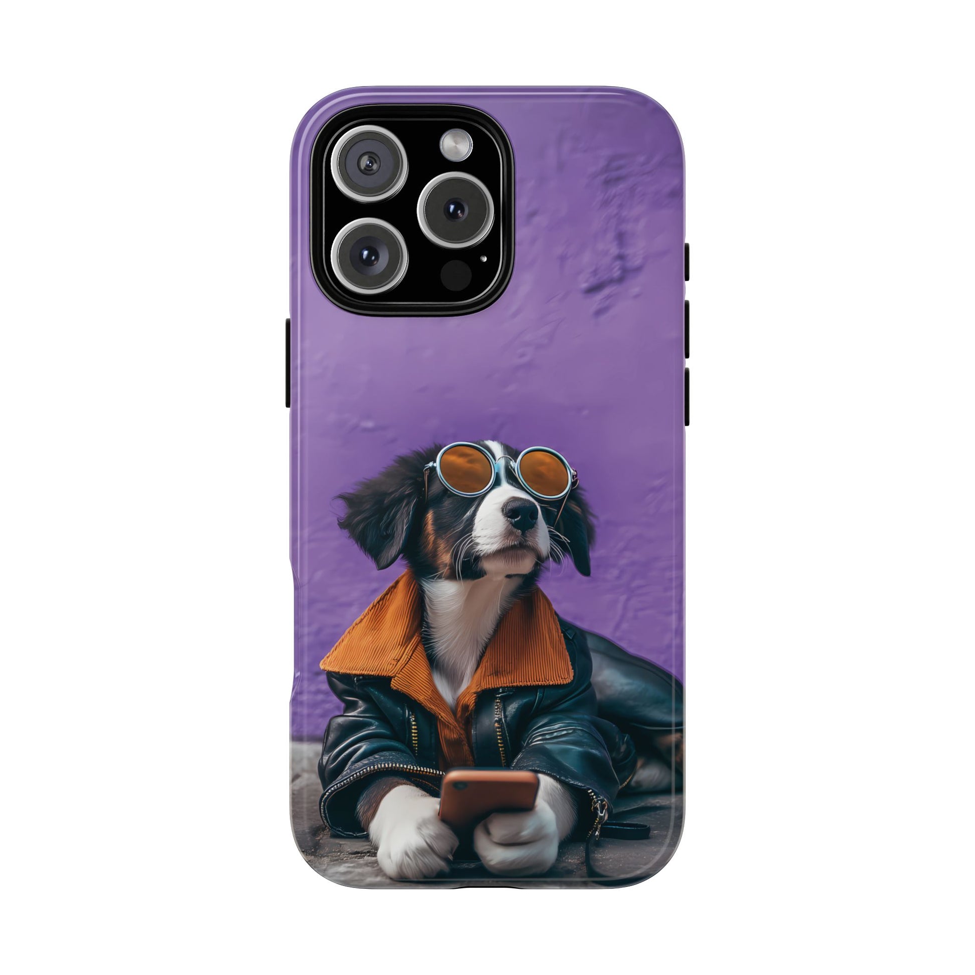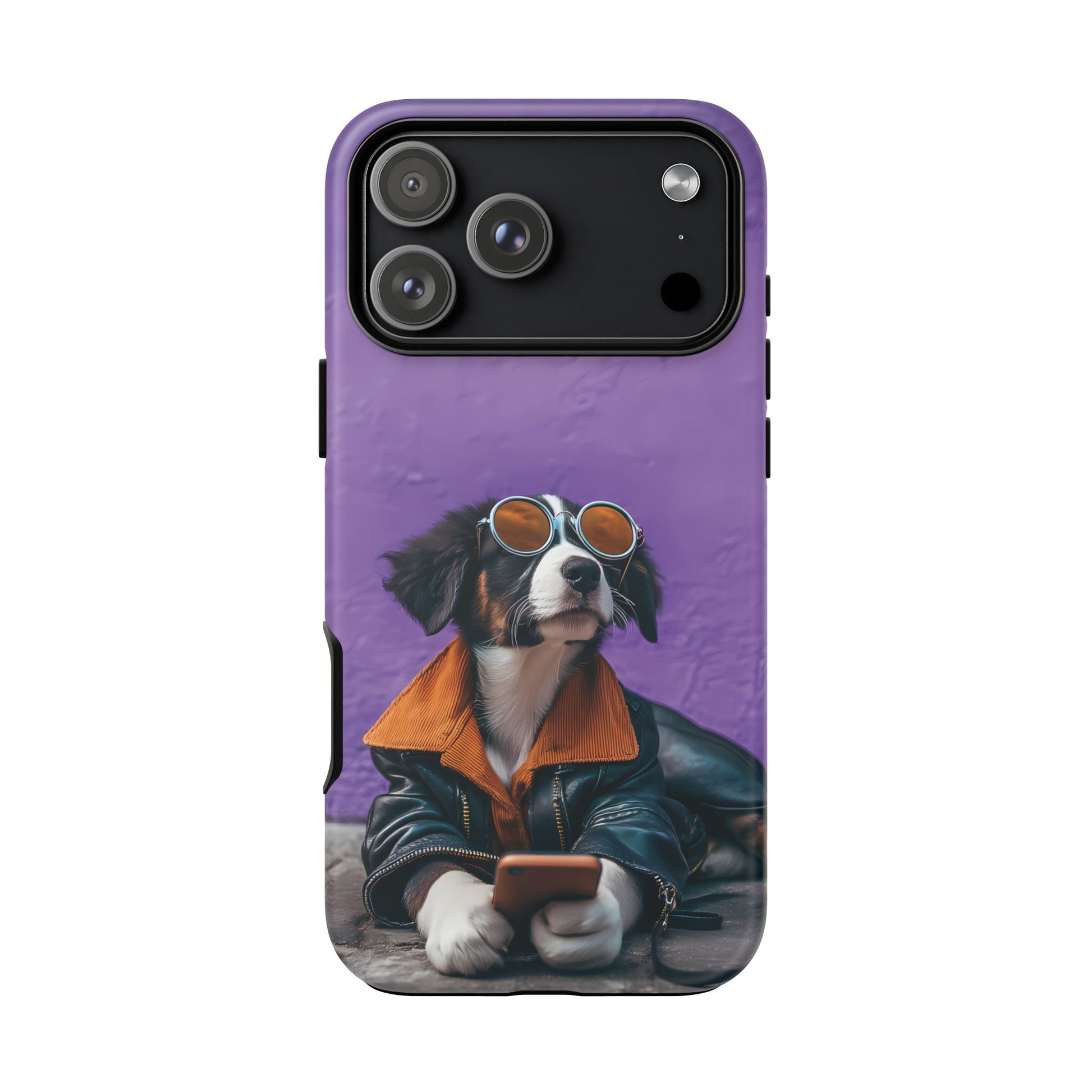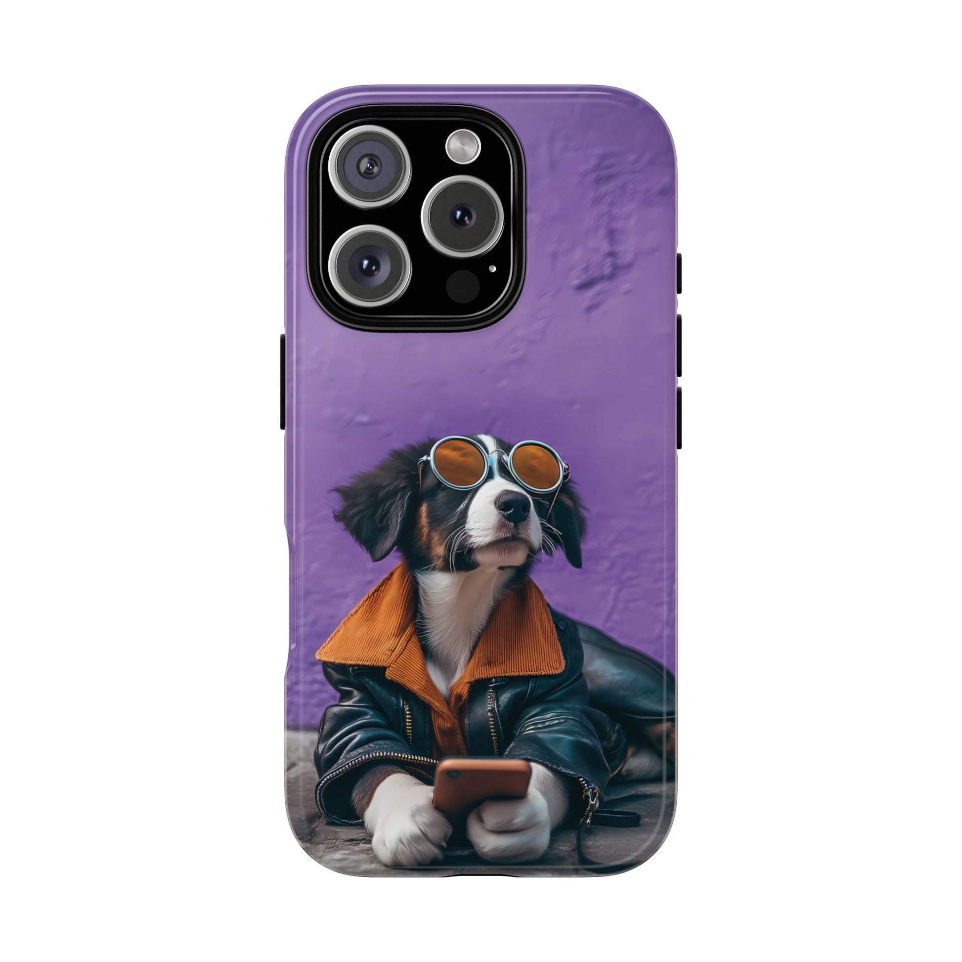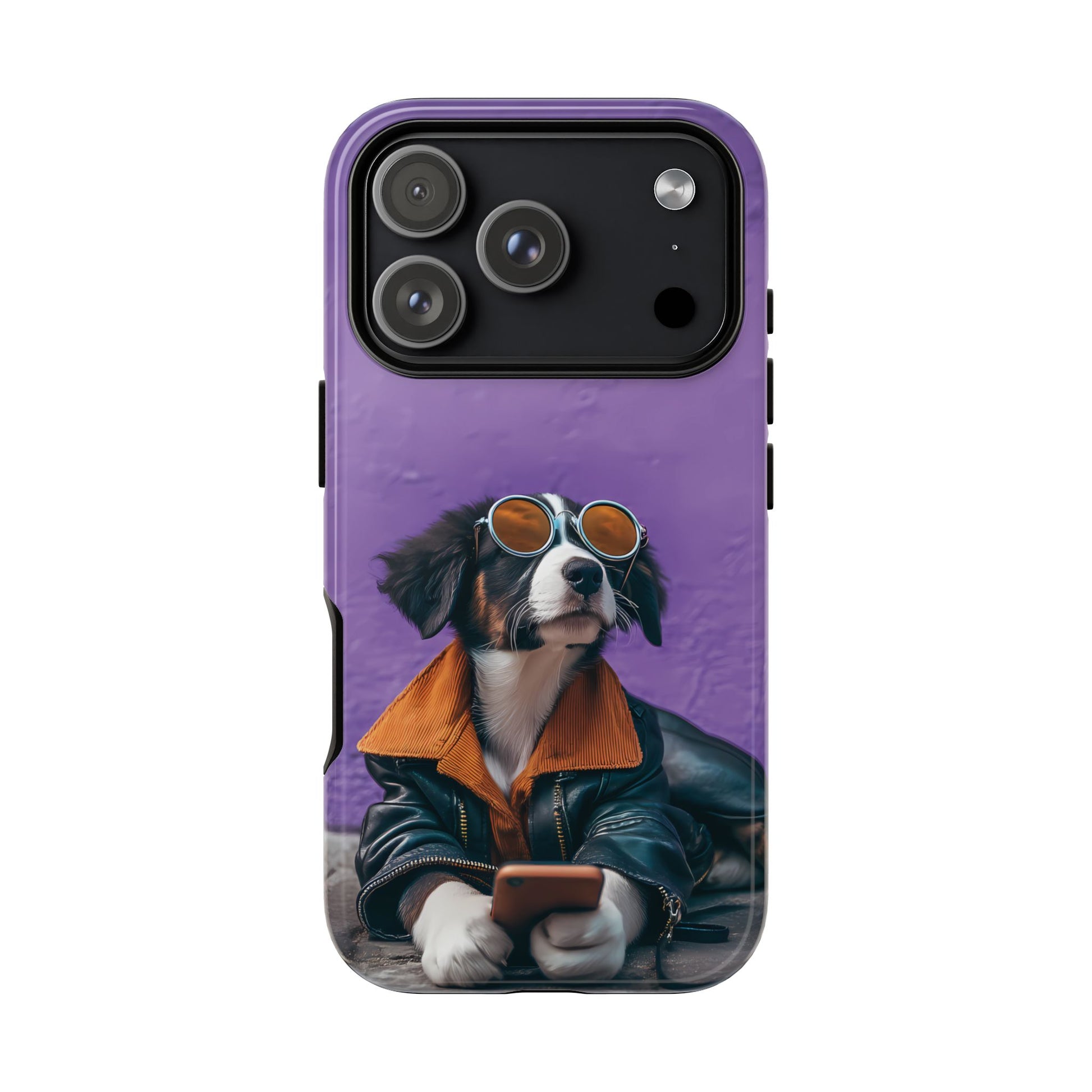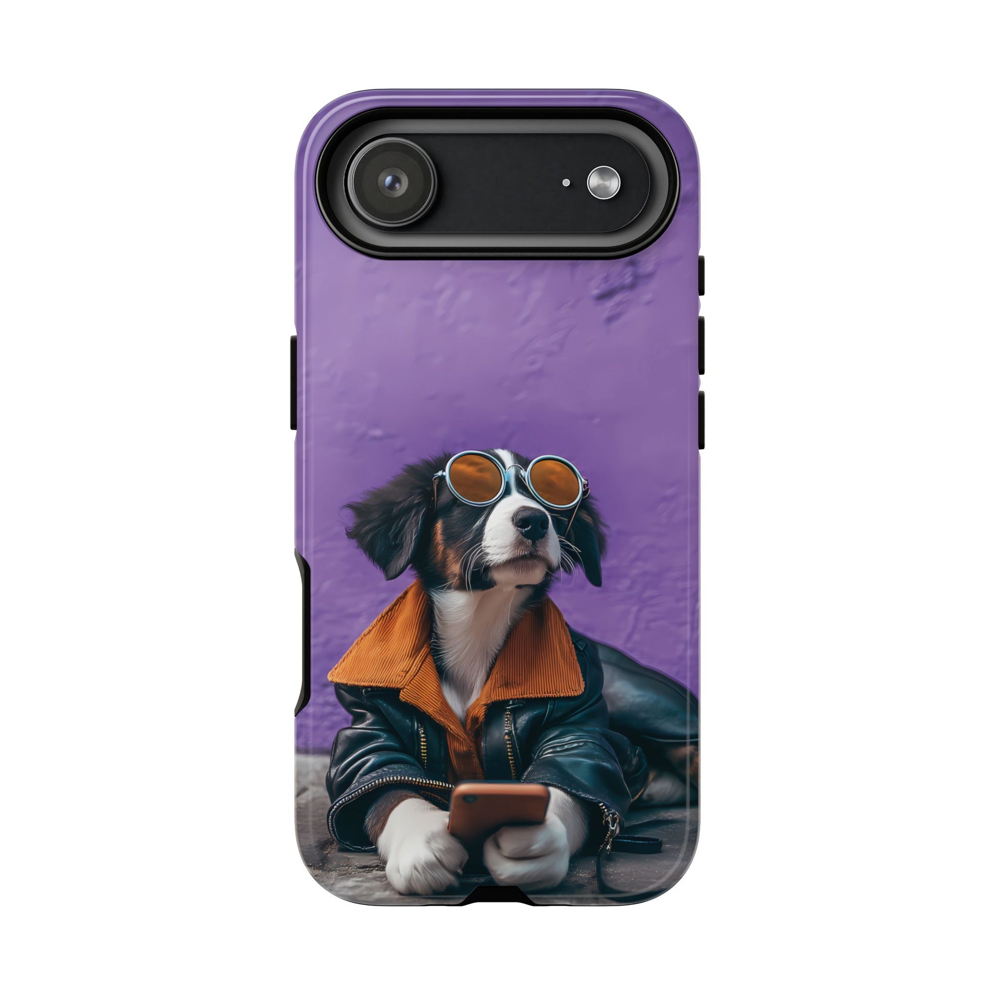 Turn heads with this playful pup in shades and a leather jacket, vibing against a purple wall in a colorful cityscape. Perfect for dog lovers and trendsetters who want fun, fashion, and phone protection in one.