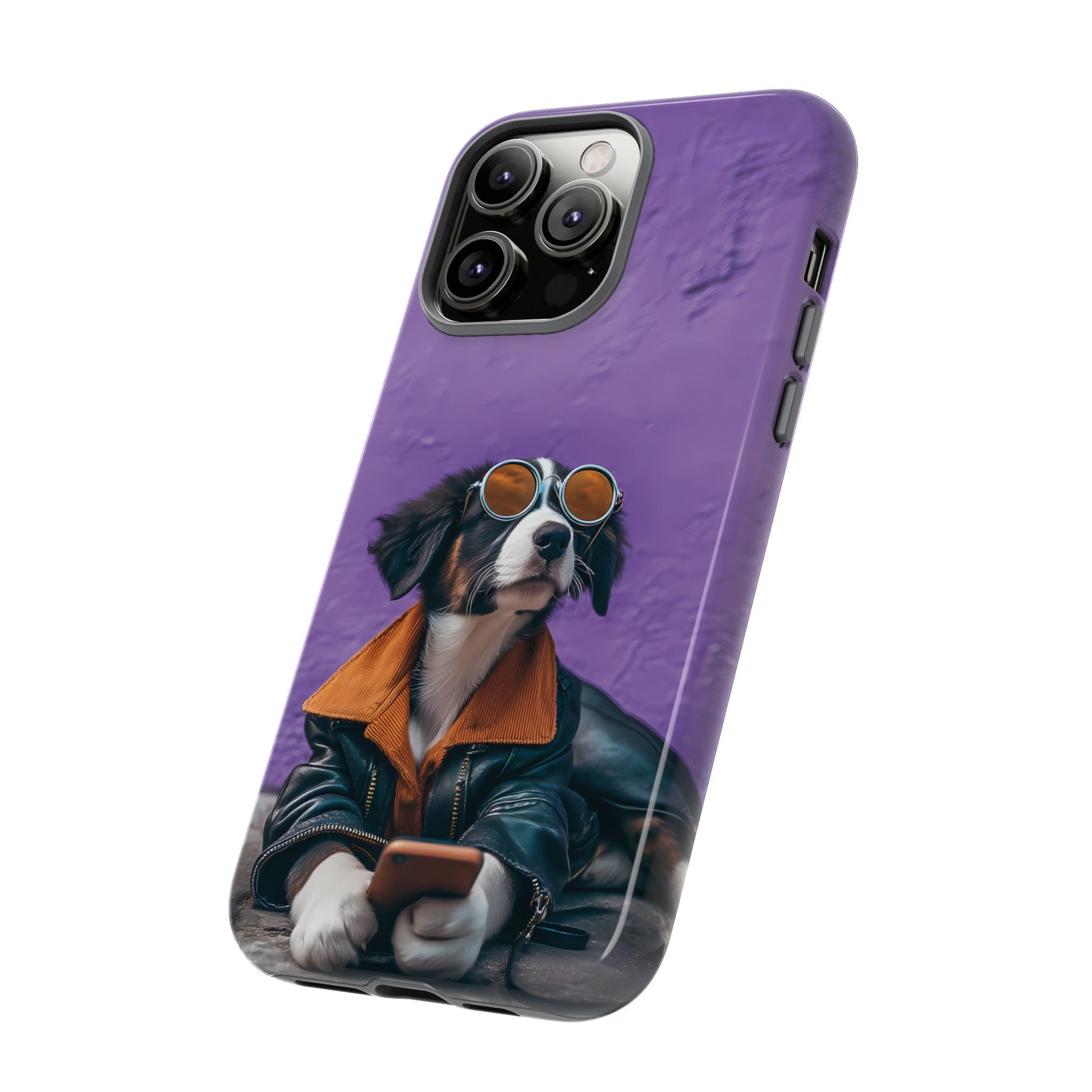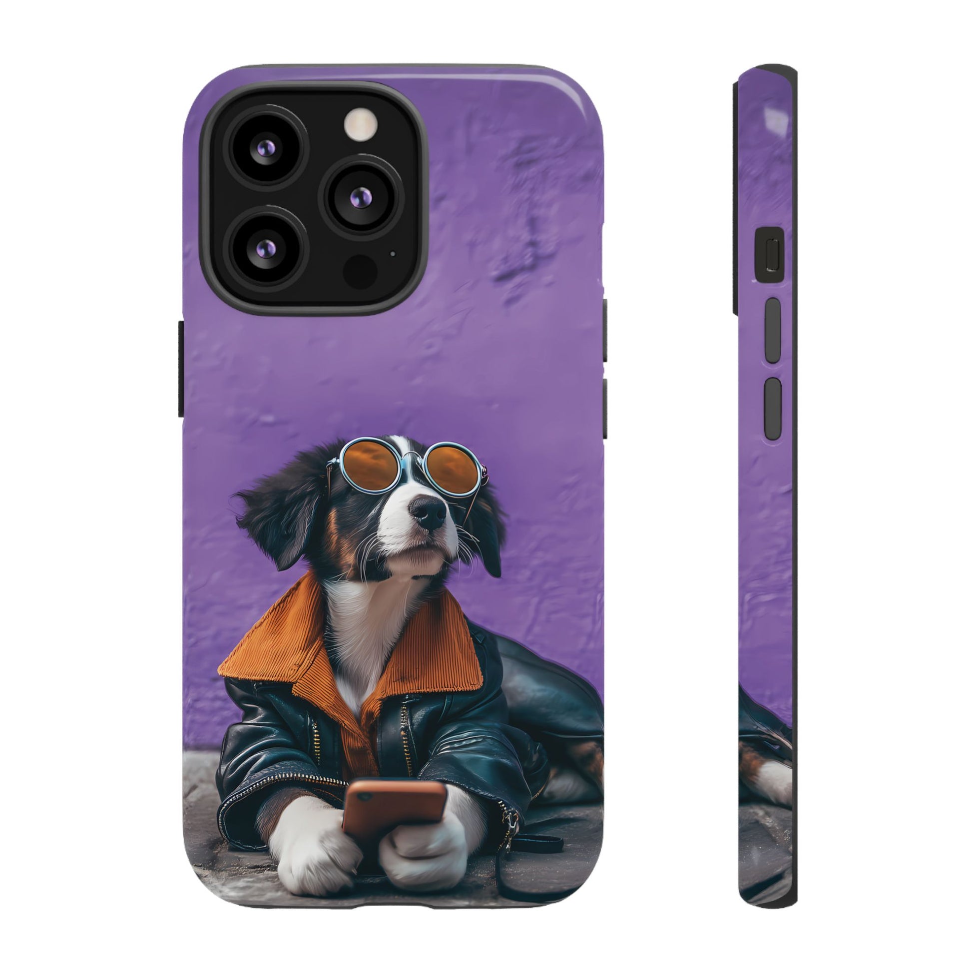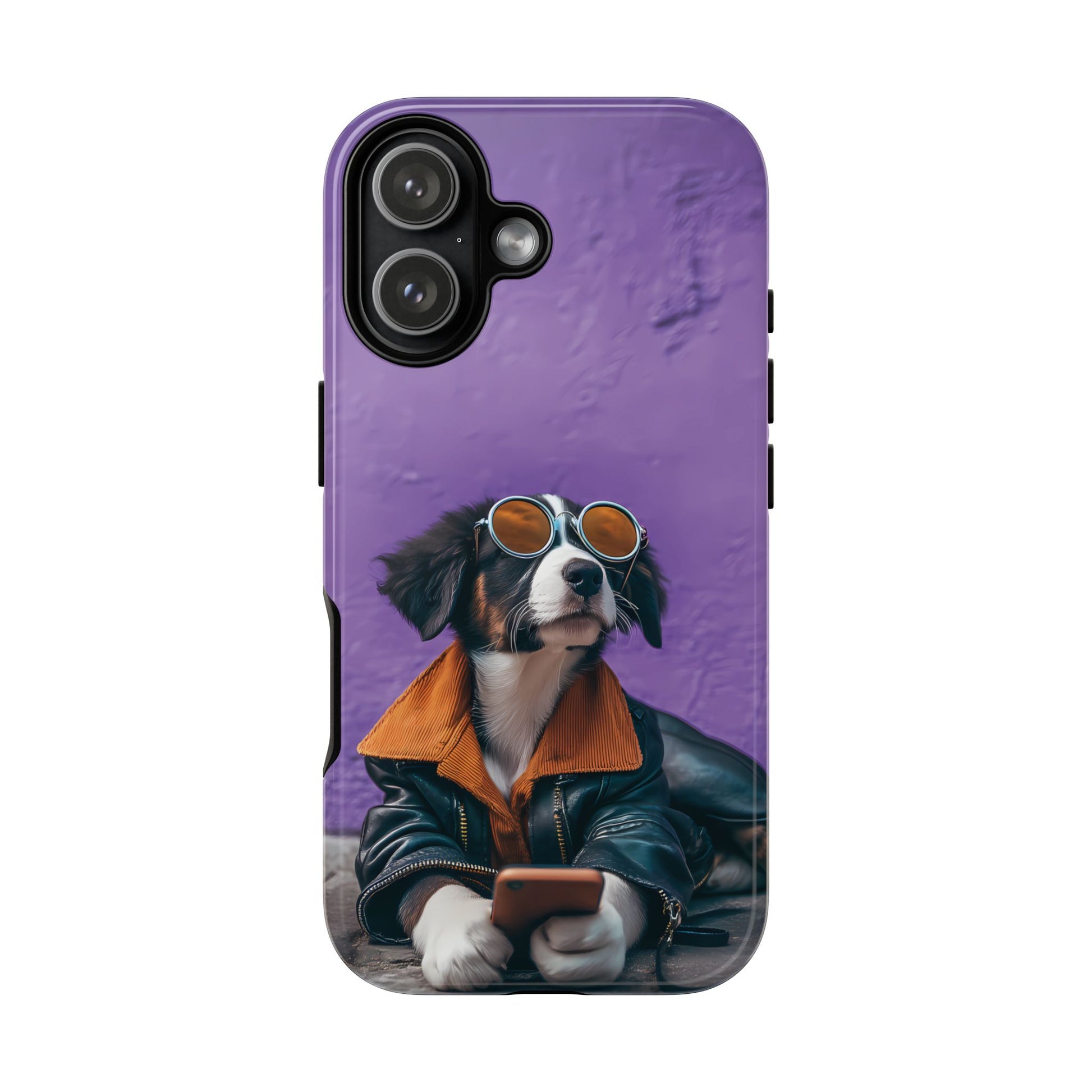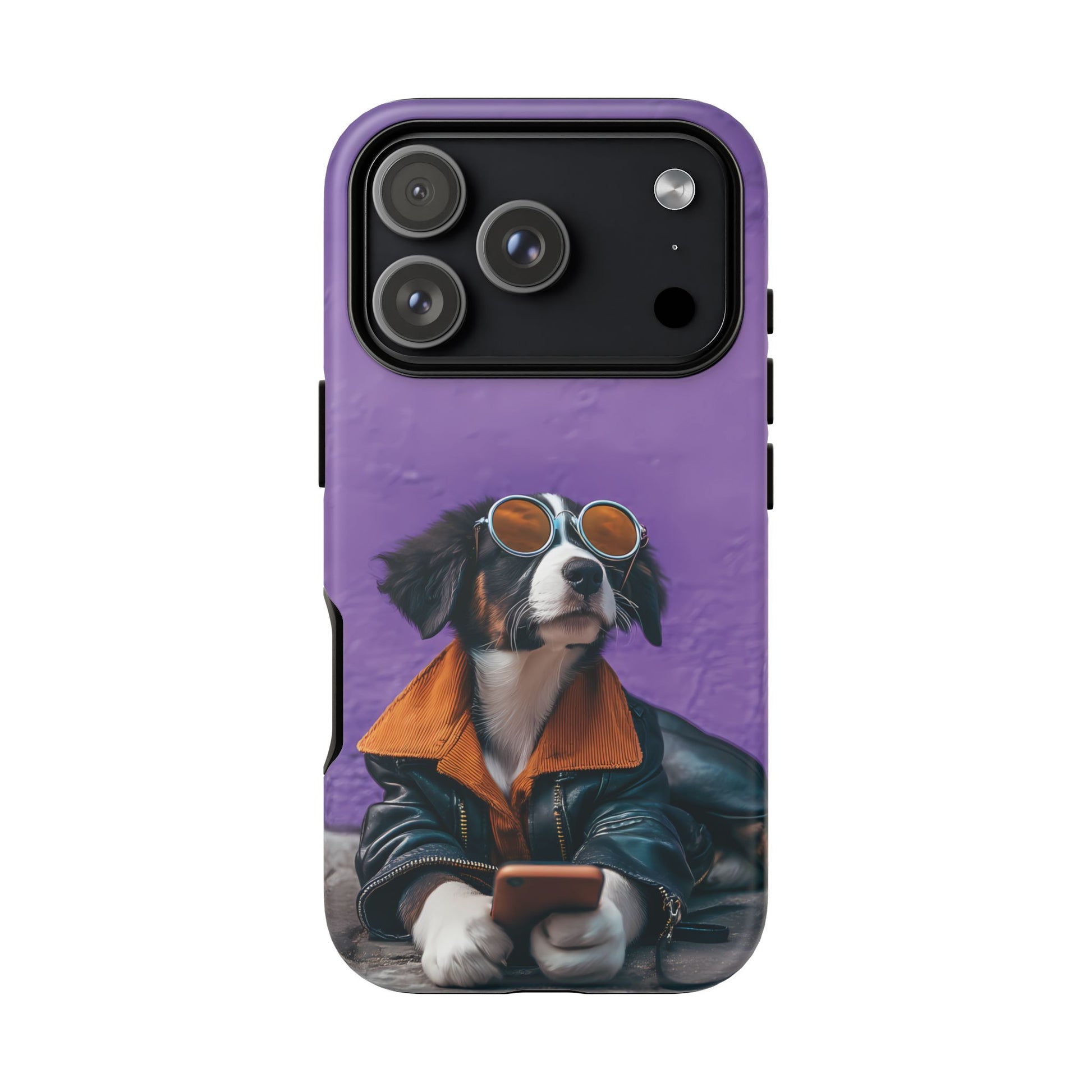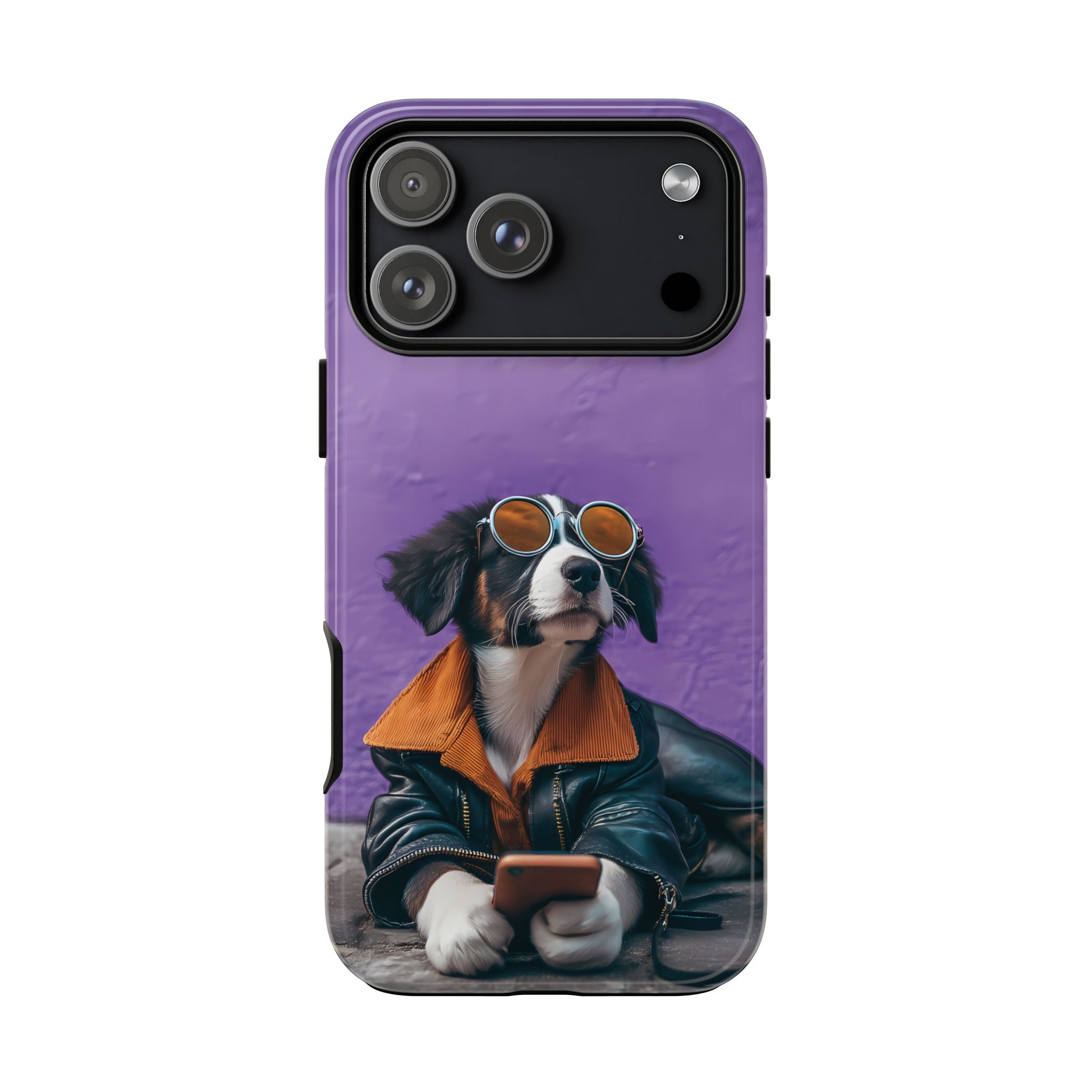 Turn heads with this playful pup in shades and a leather jacket, vibing against a purple wall in a colorful cityscape. Perfect for dog lovers and trendsetters who want fun, fashion, and phone protection in one.