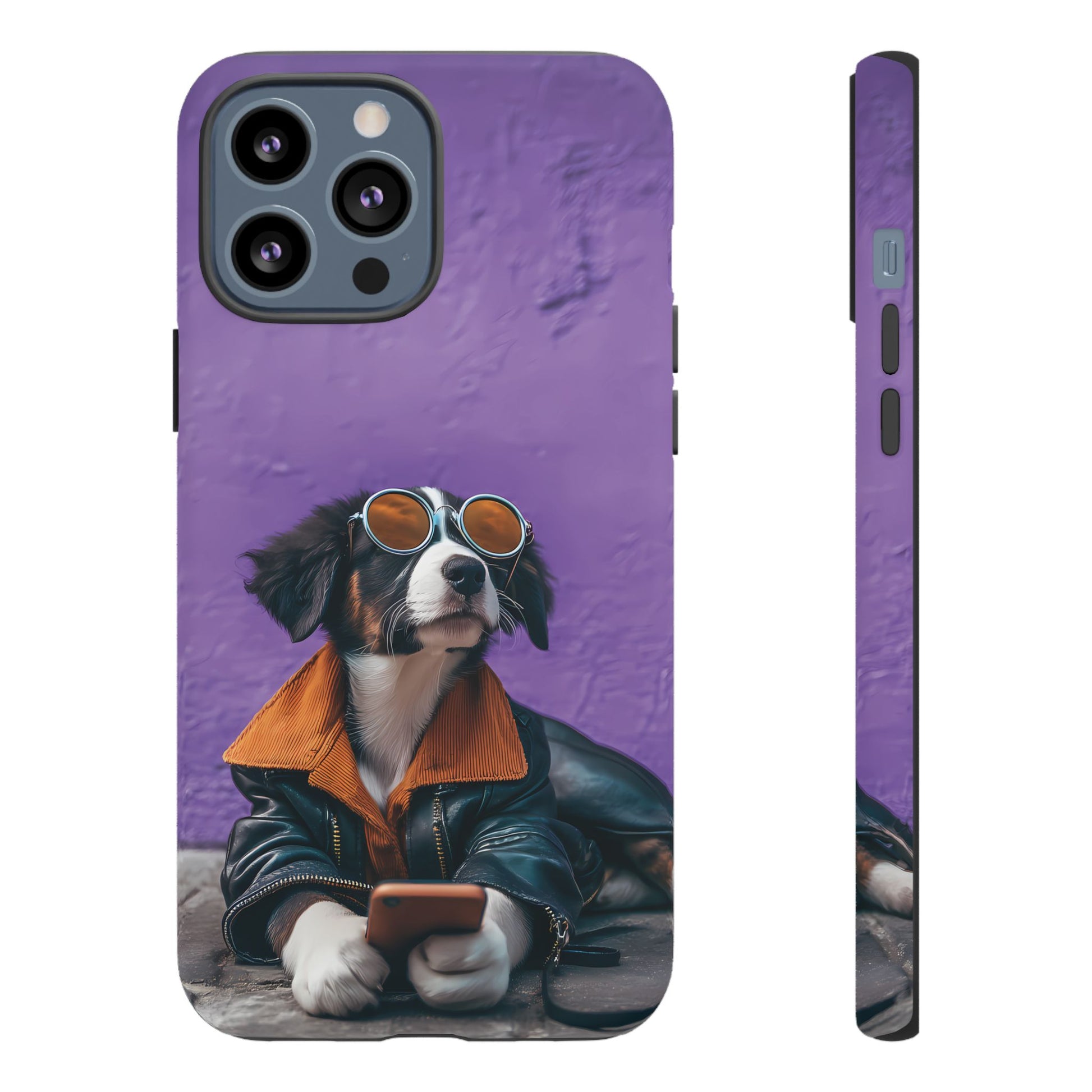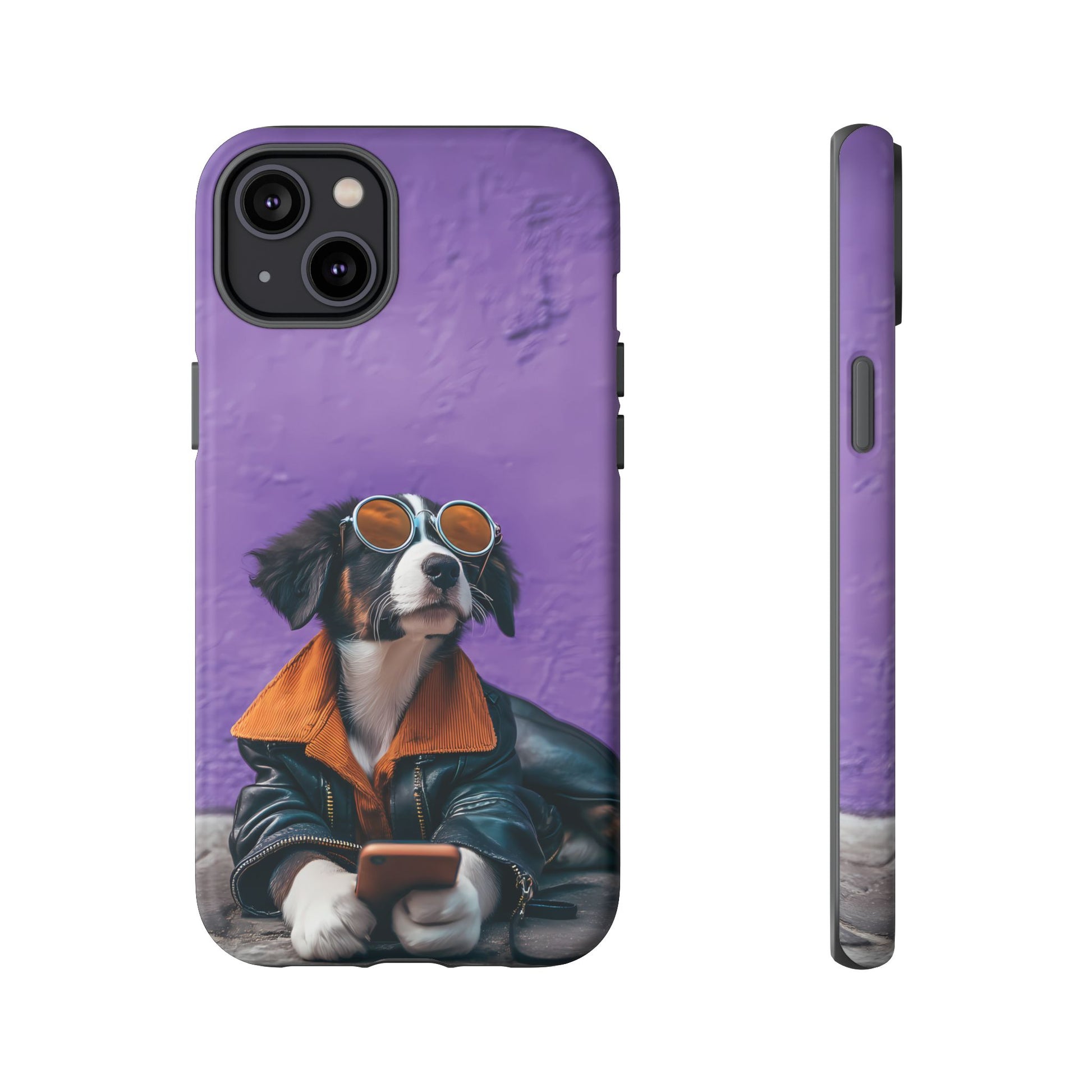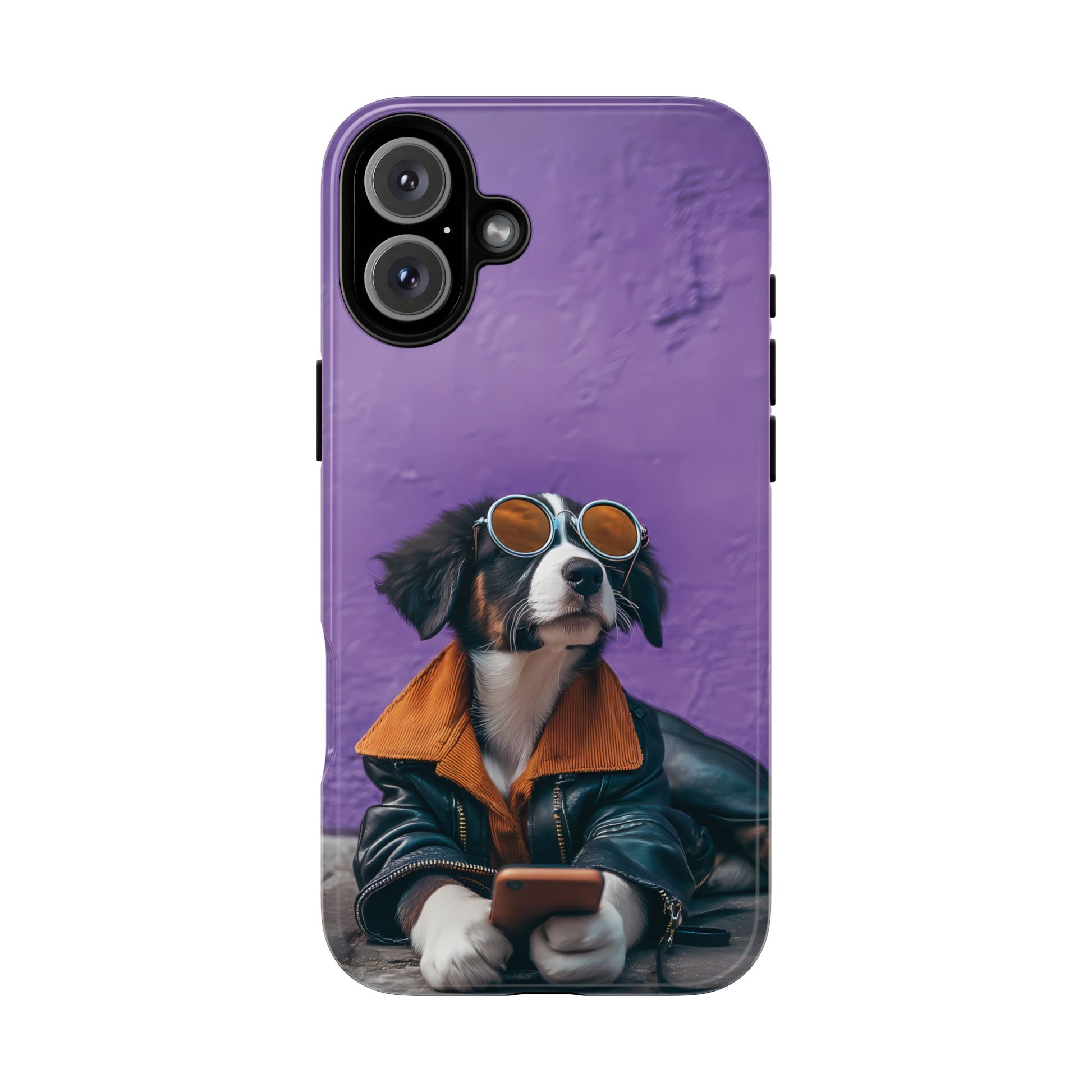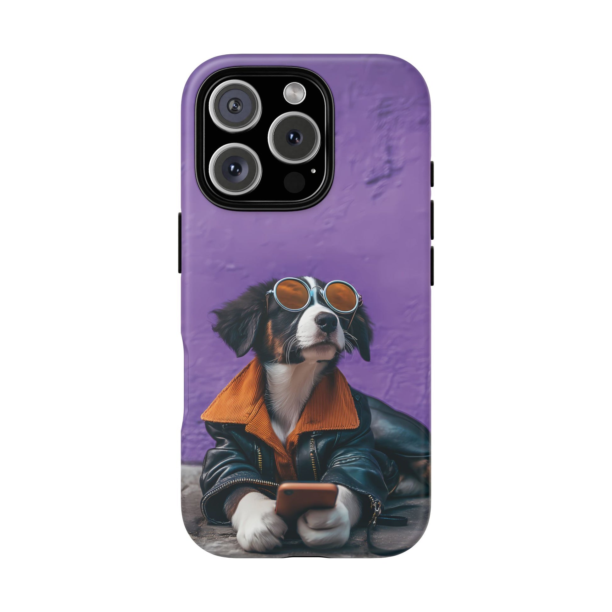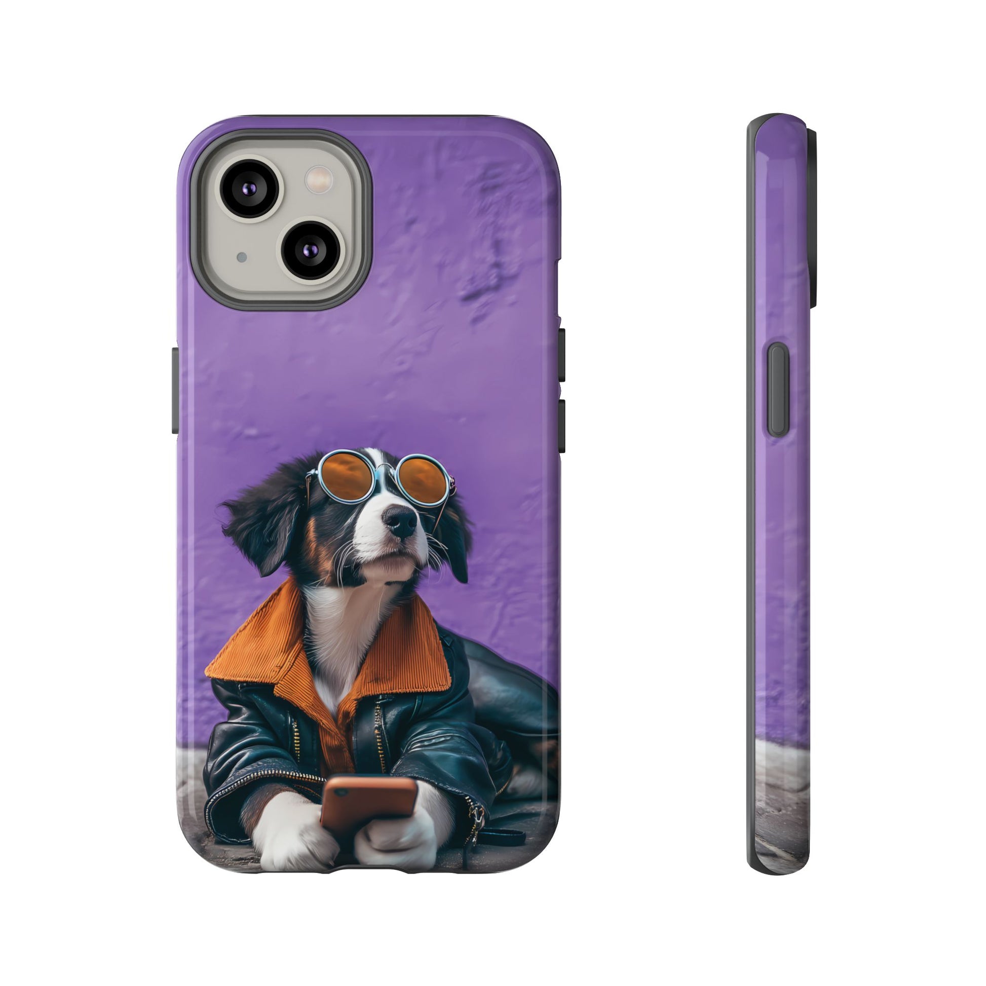 Turn heads with this playful pup in shades and a leather jacket, vibing against a purple wall in a colorful cityscape. Perfect for dog lovers and trendsetters who want fun, fashion, and phone protection in one.