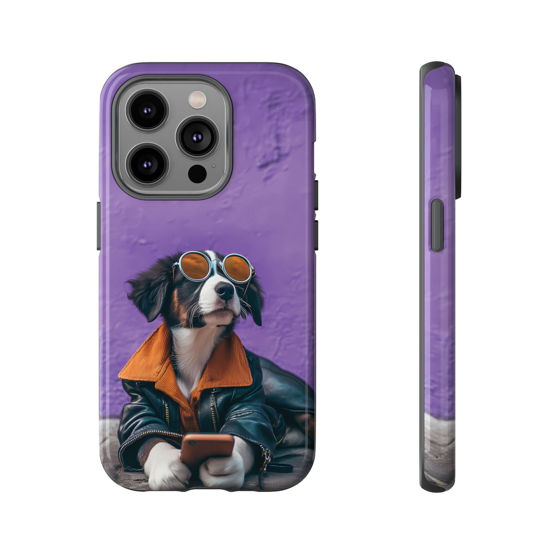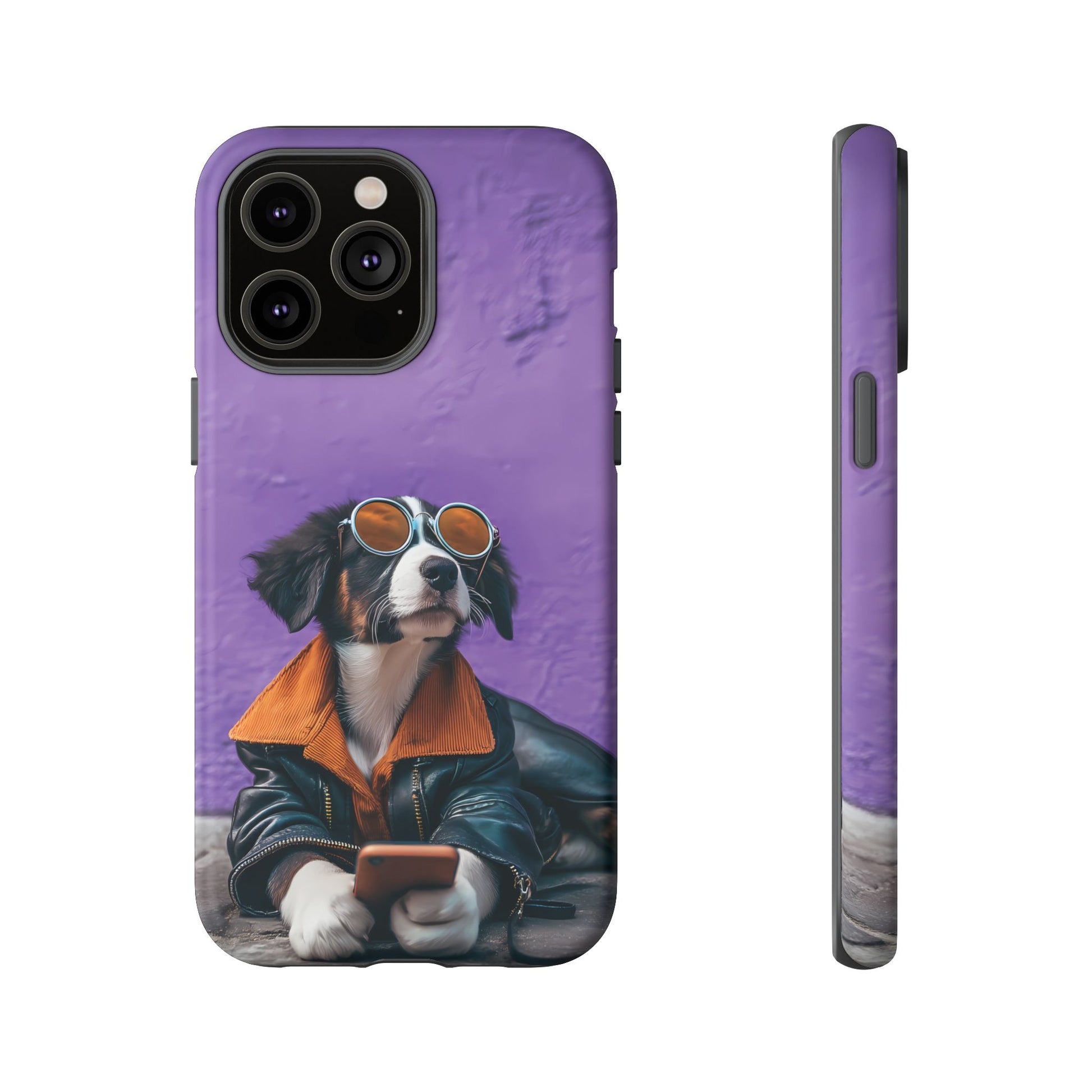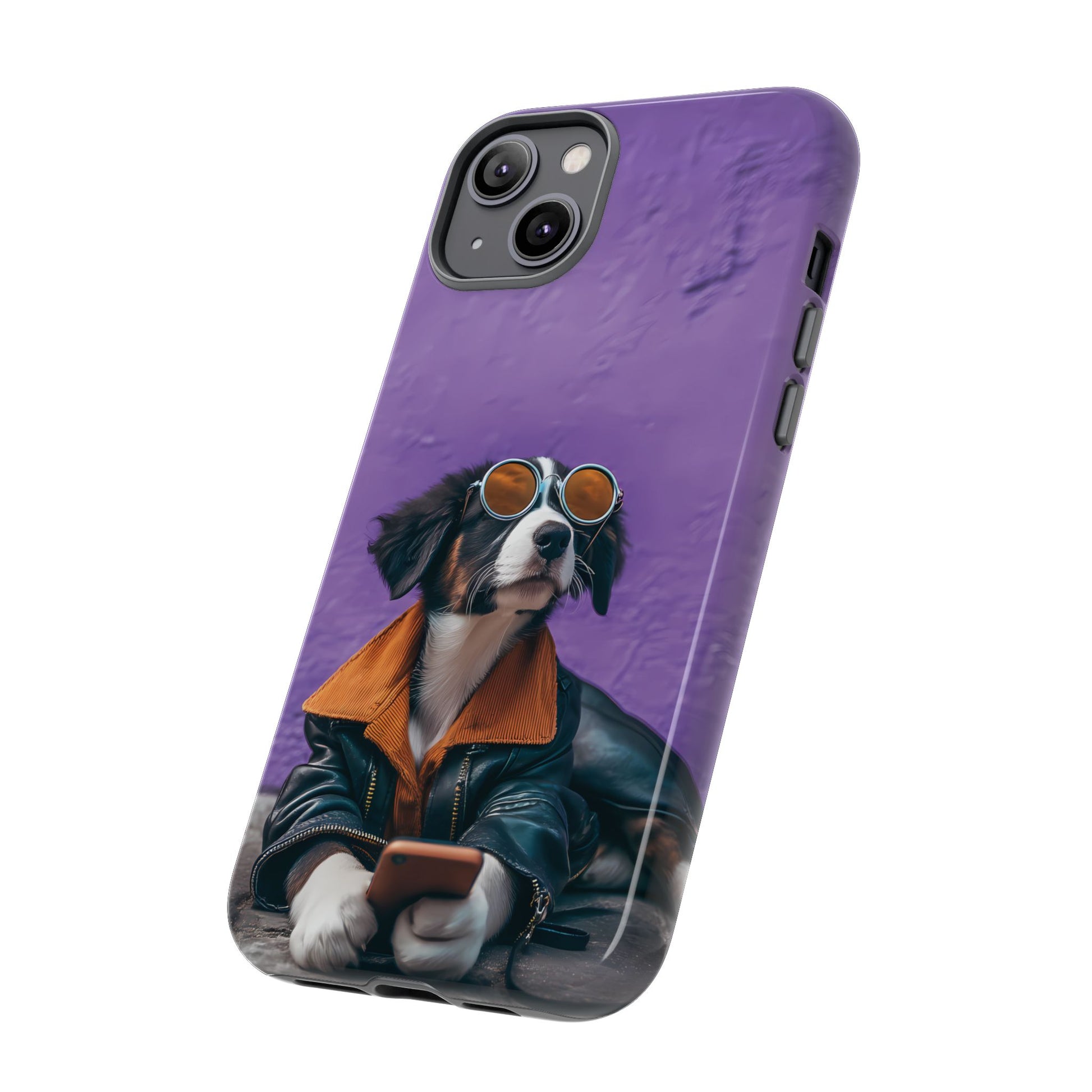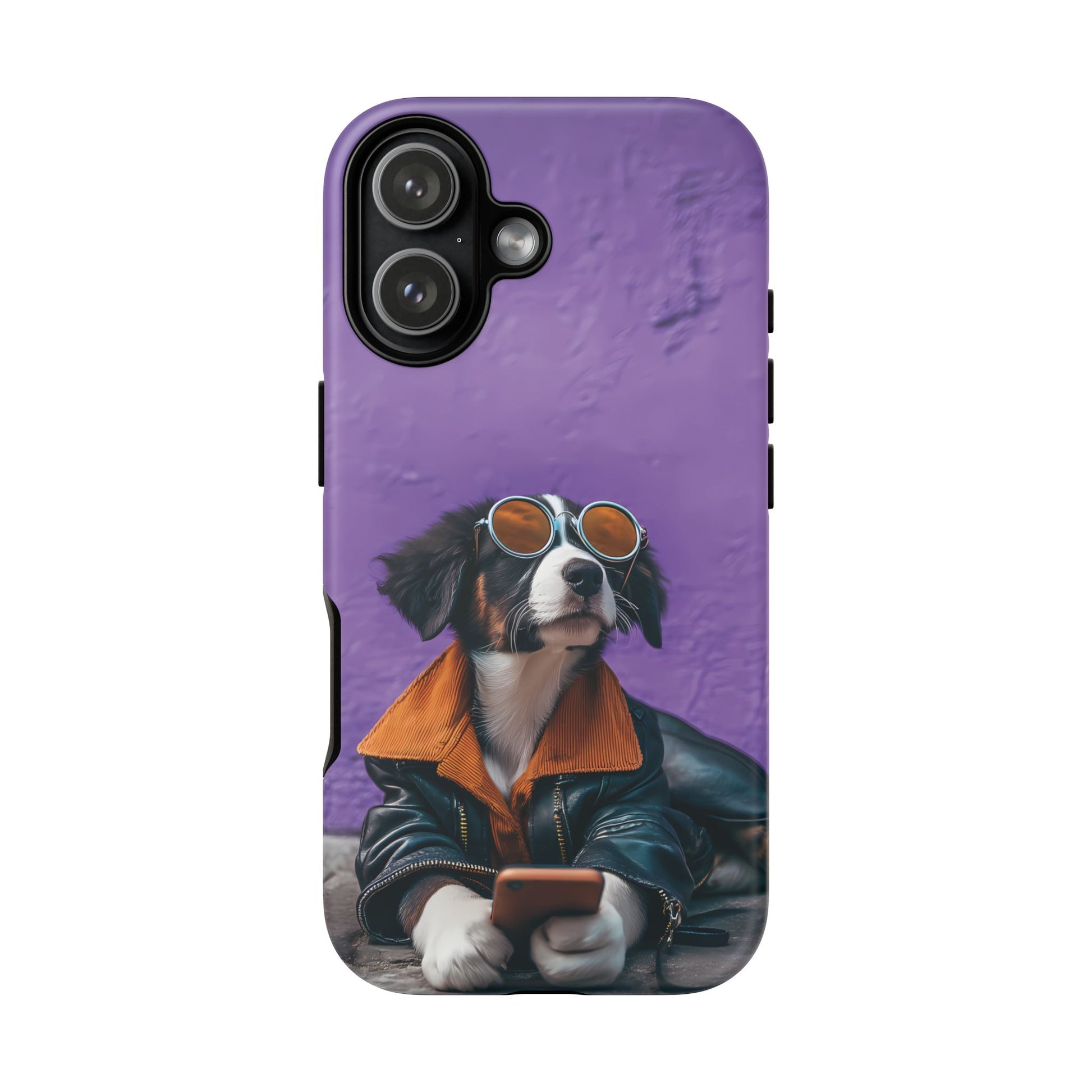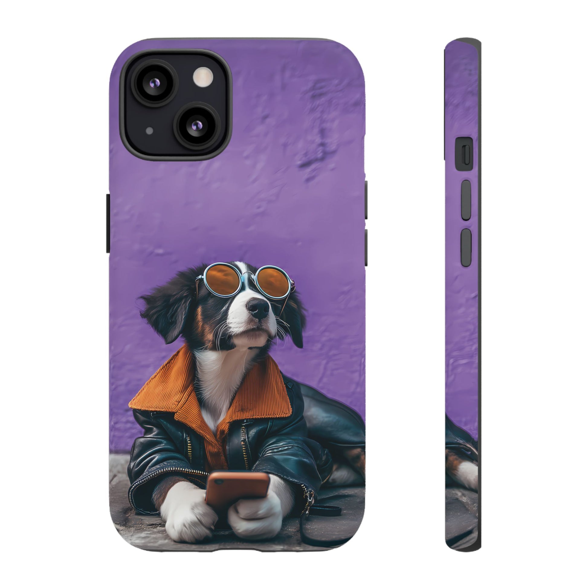 Turn heads with this playful pup in shades and a leather jacket, vibing against a purple wall in a colorful cityscape. Perfect for dog lovers and trendsetters who want fun, fashion, and phone protection in one.