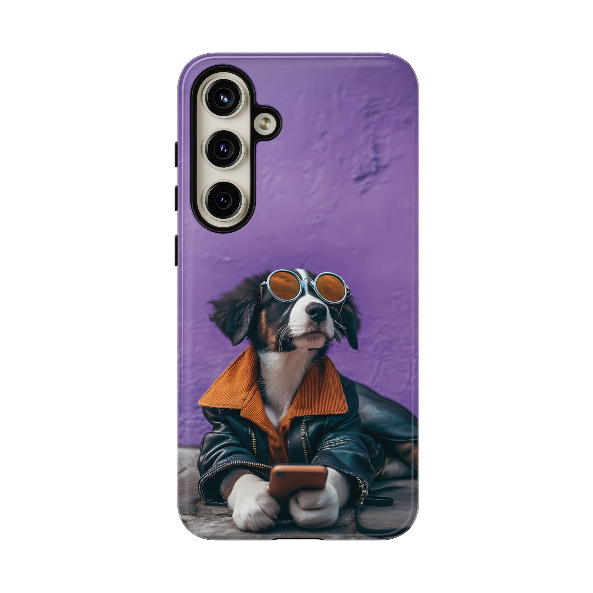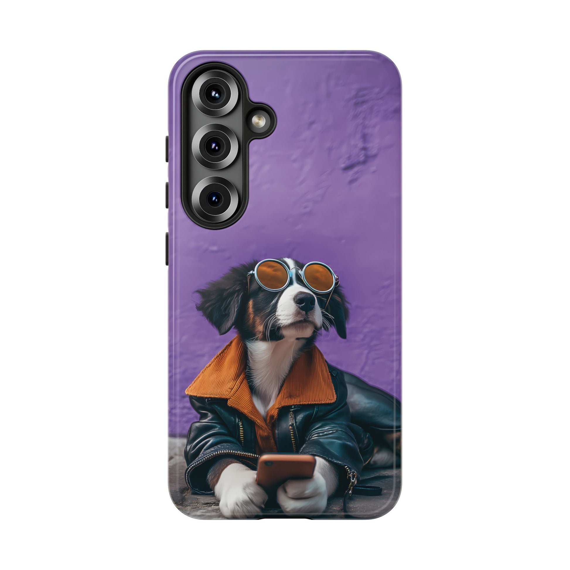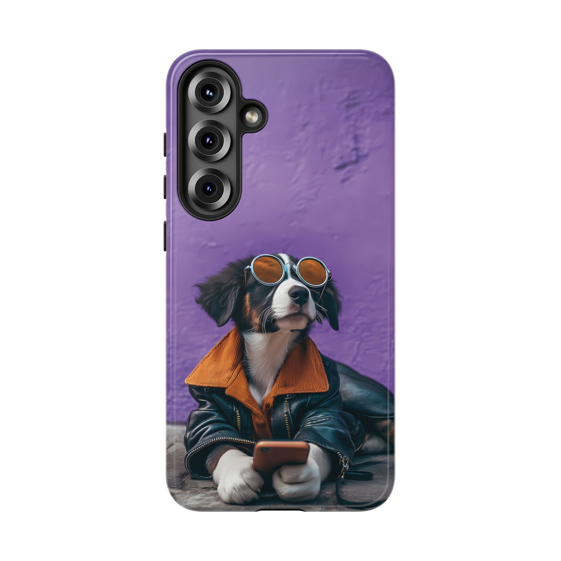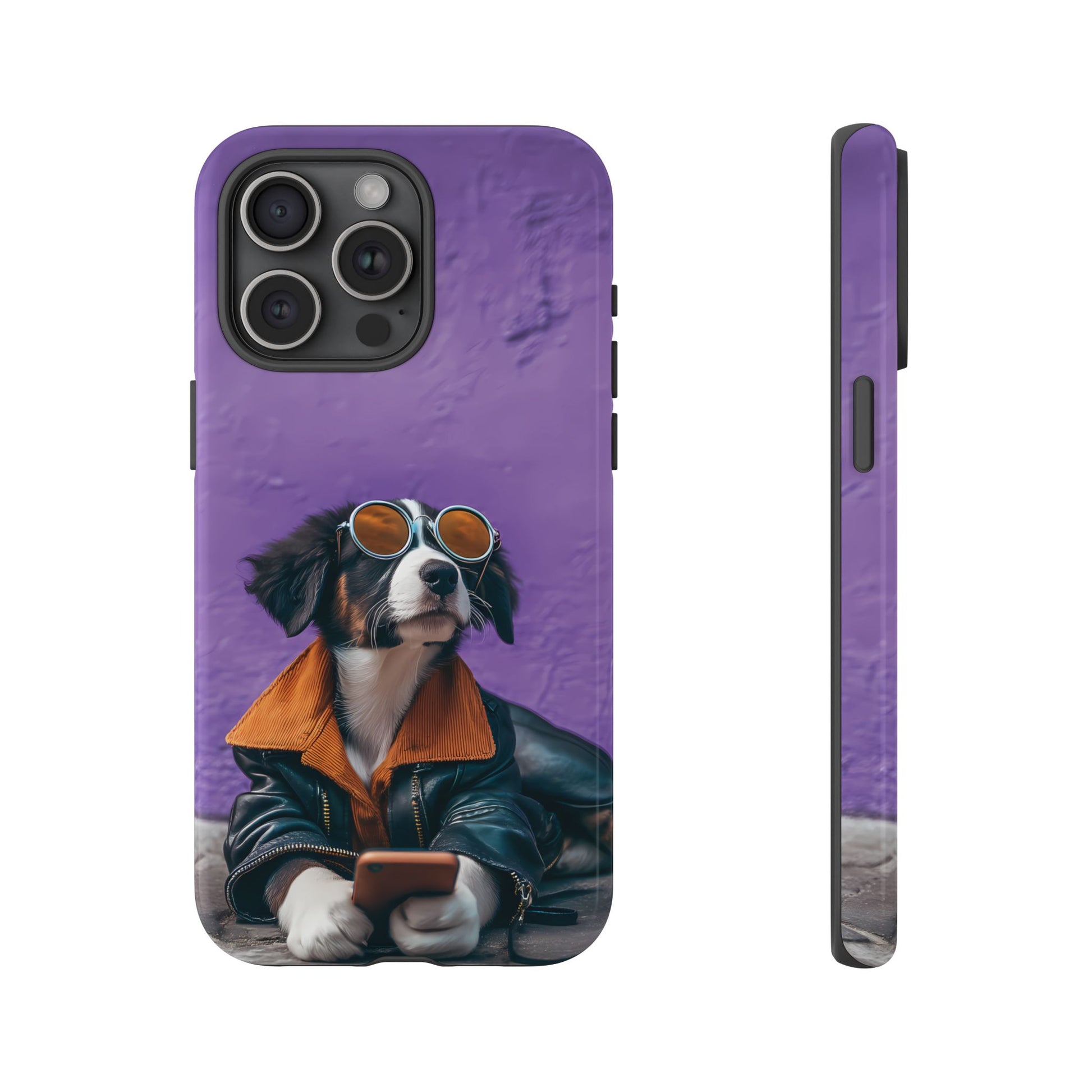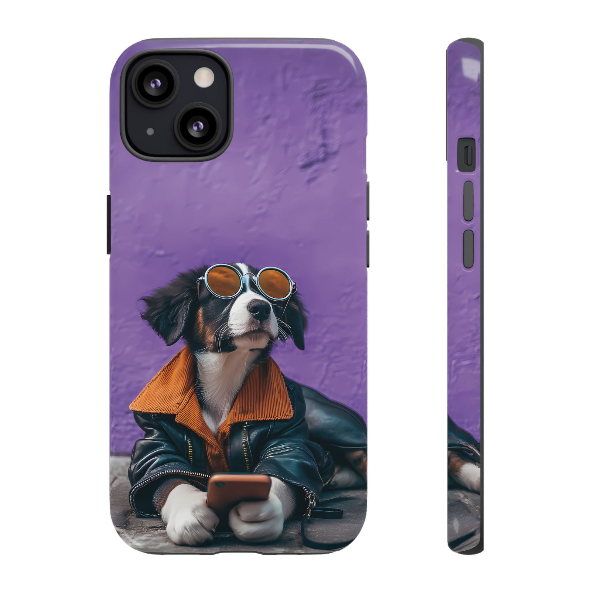 Turn heads with this playful pup in shades and a leather jacket, vibing against a purple wall in a colorful cityscape. Perfect for dog lovers and trendsetters who want fun, fashion, and phone protection in one.