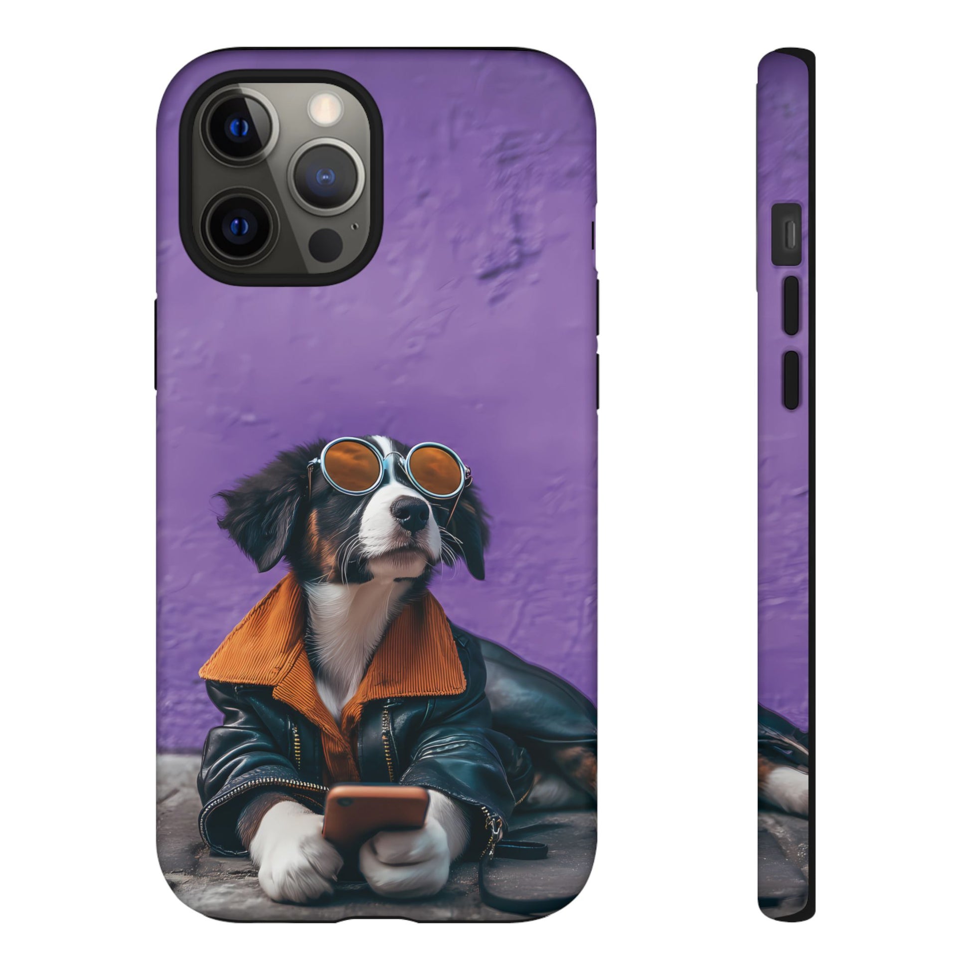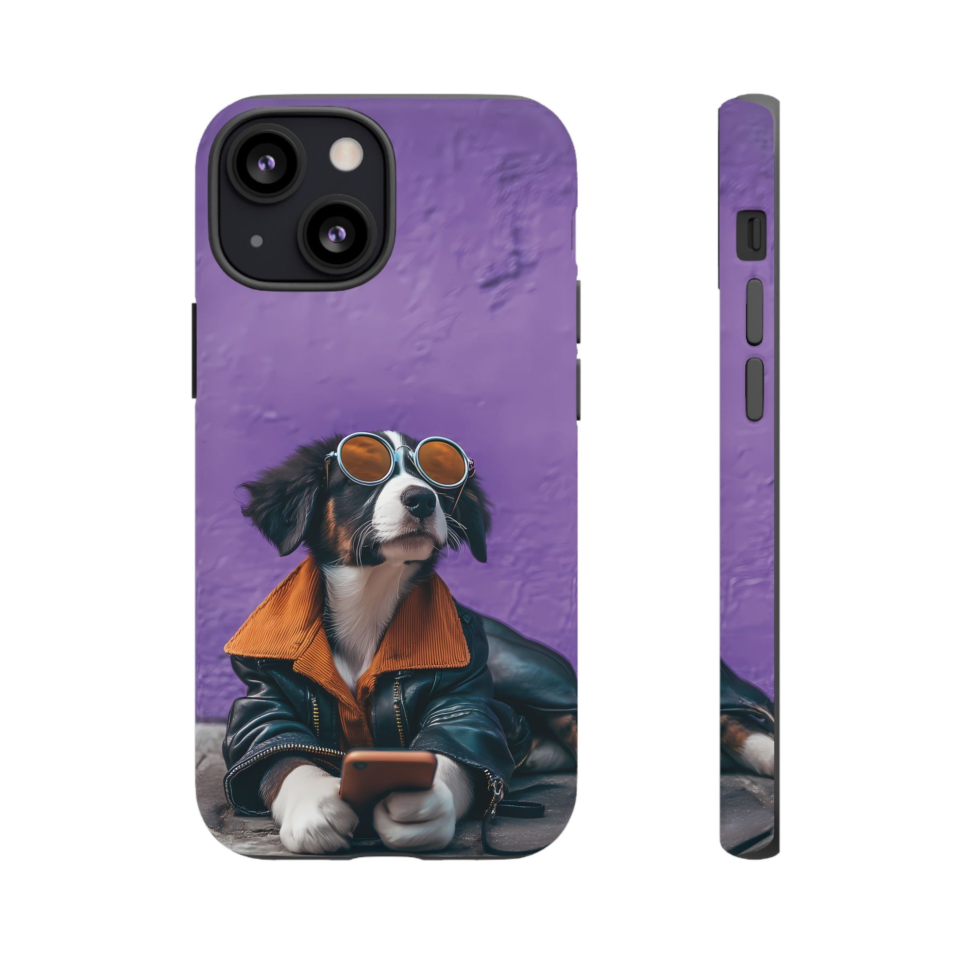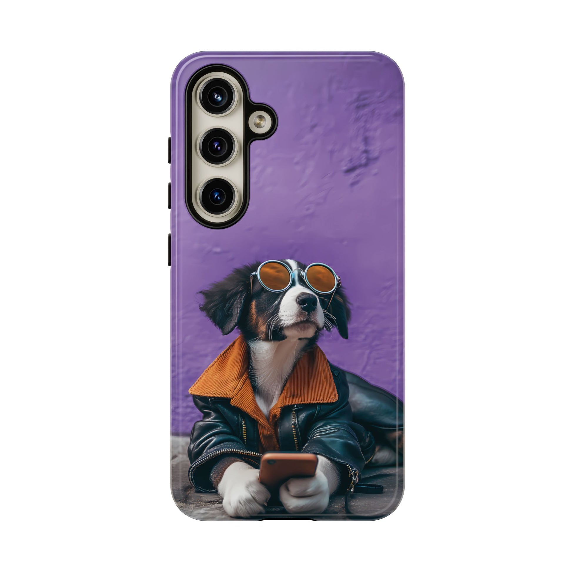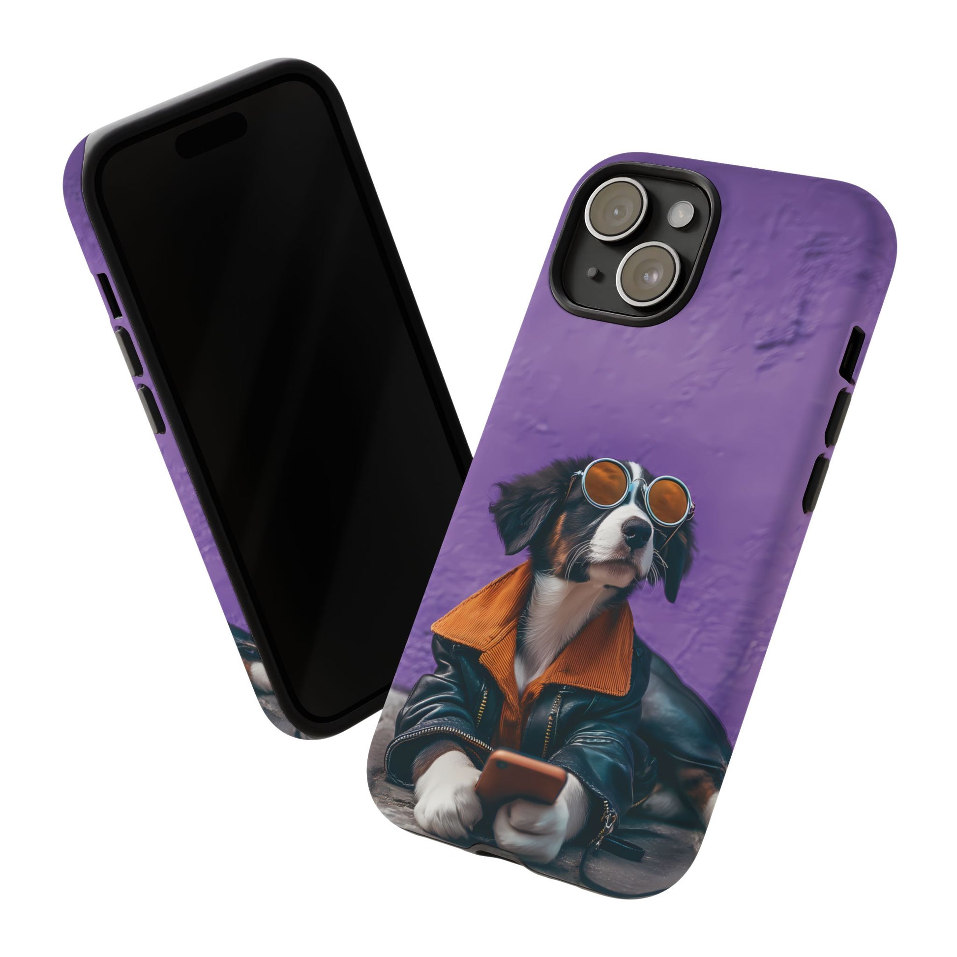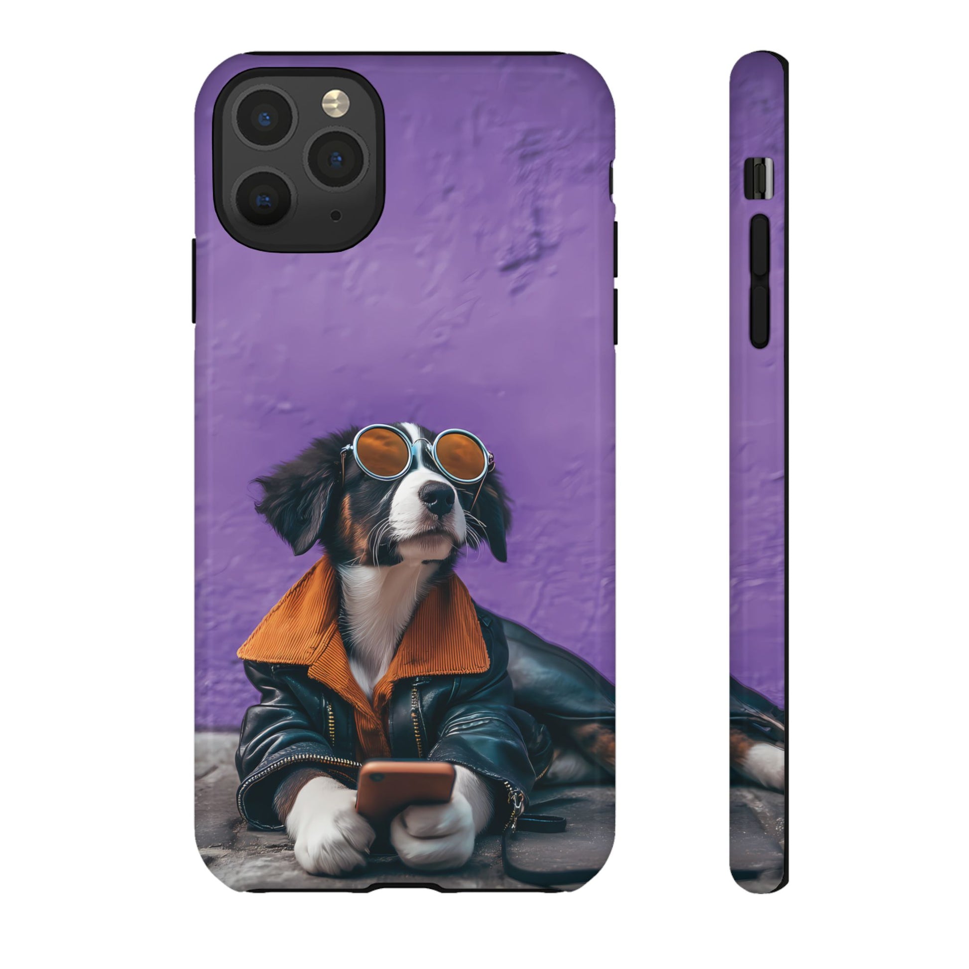 Turn heads with this playful pup in shades and a leather jacket, vibing against a purple wall in a colorful cityscape. Perfect for dog lovers and trendsetters who want fun, fashion, and phone protection in one.