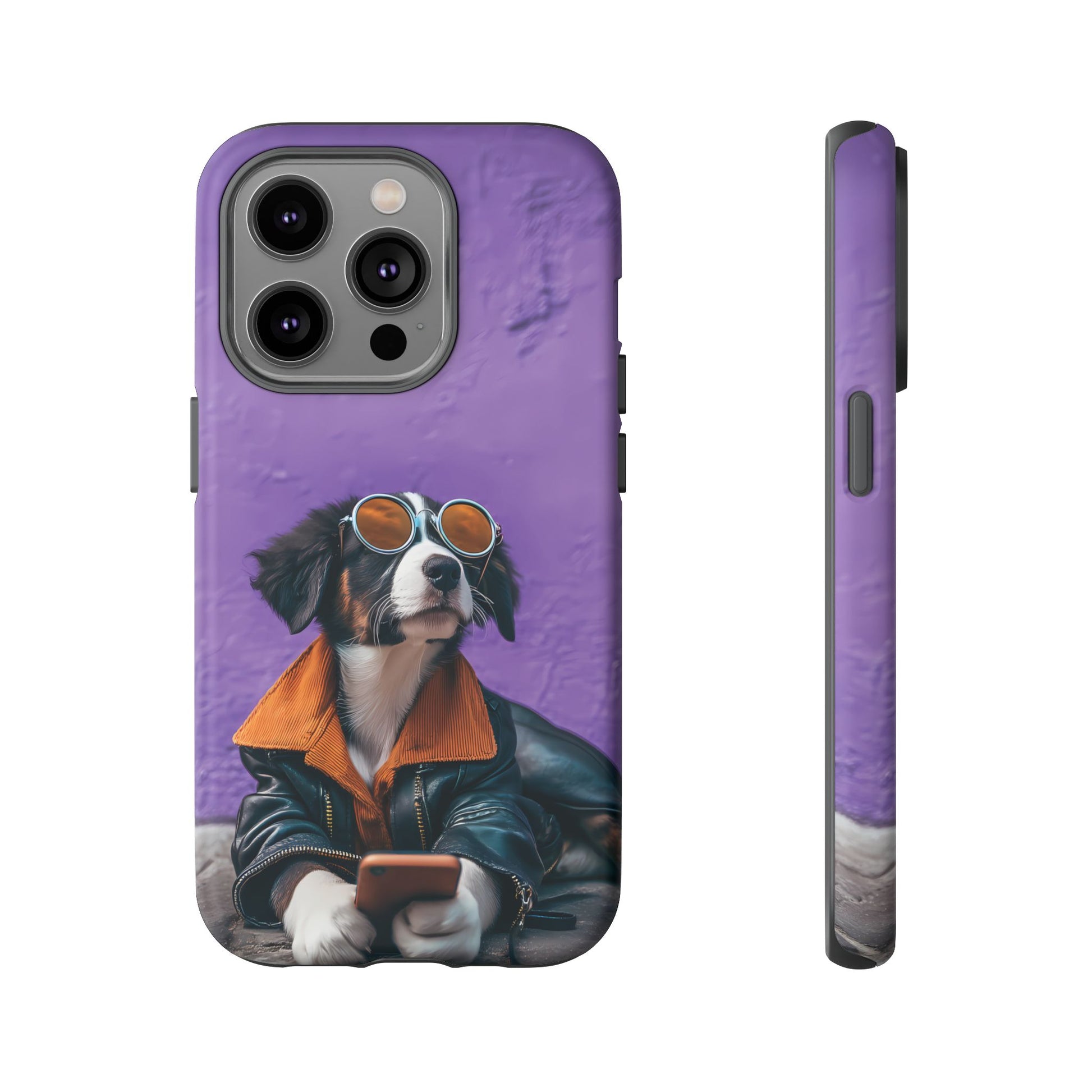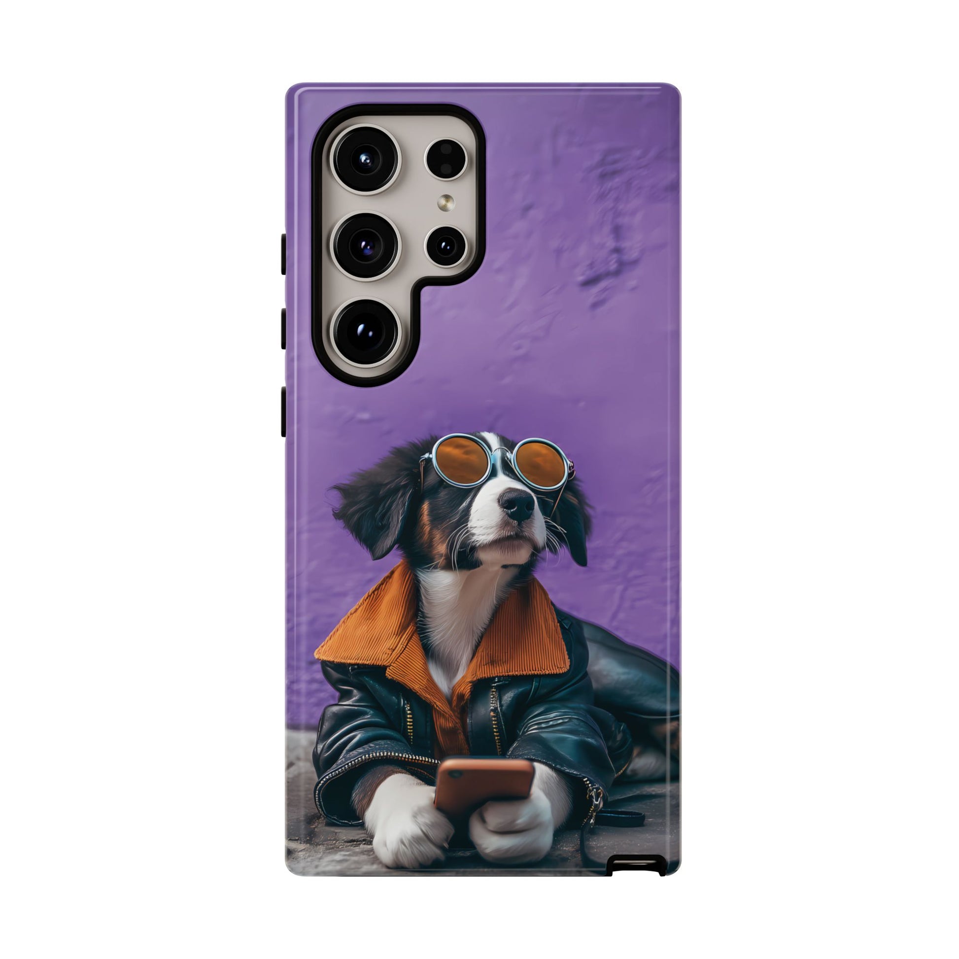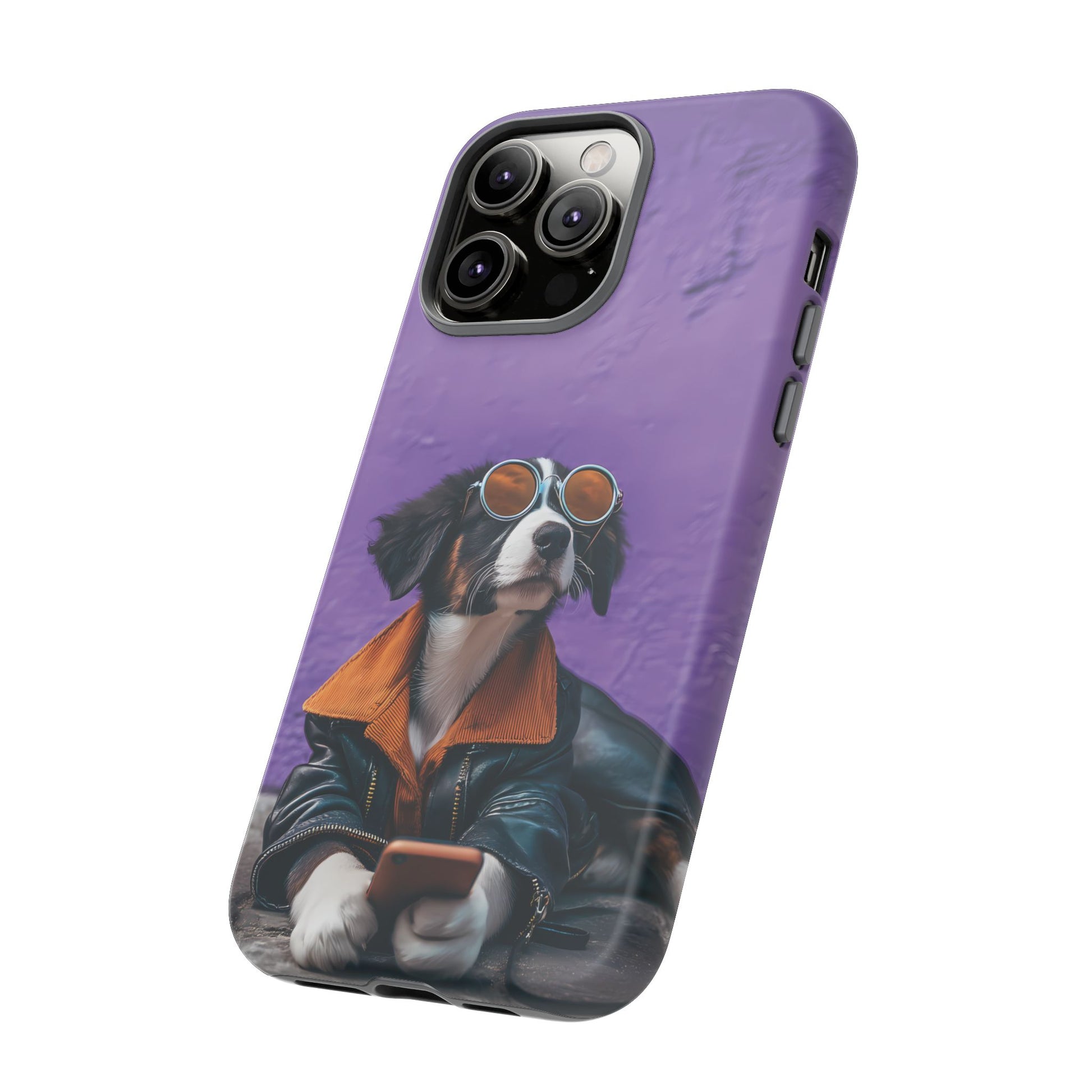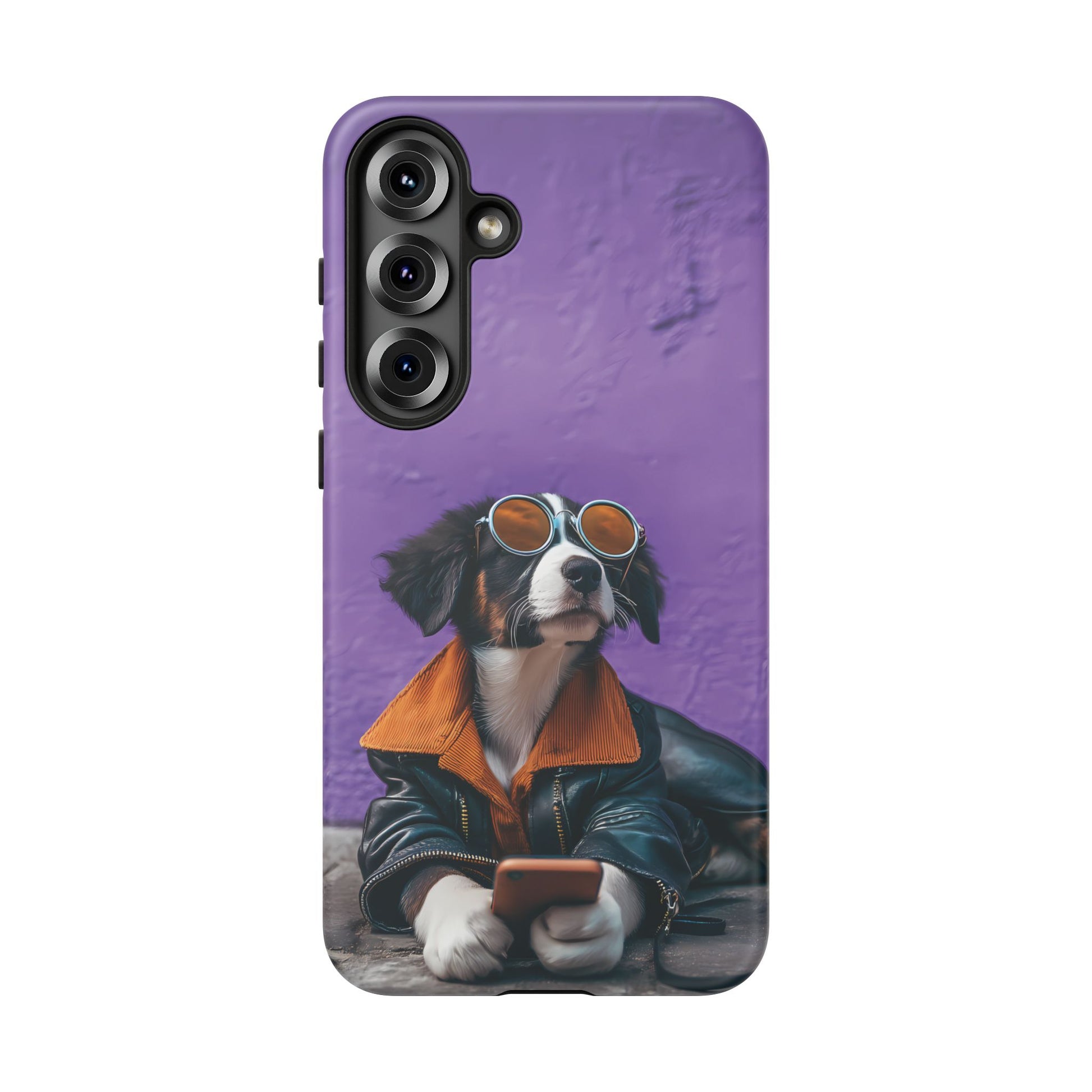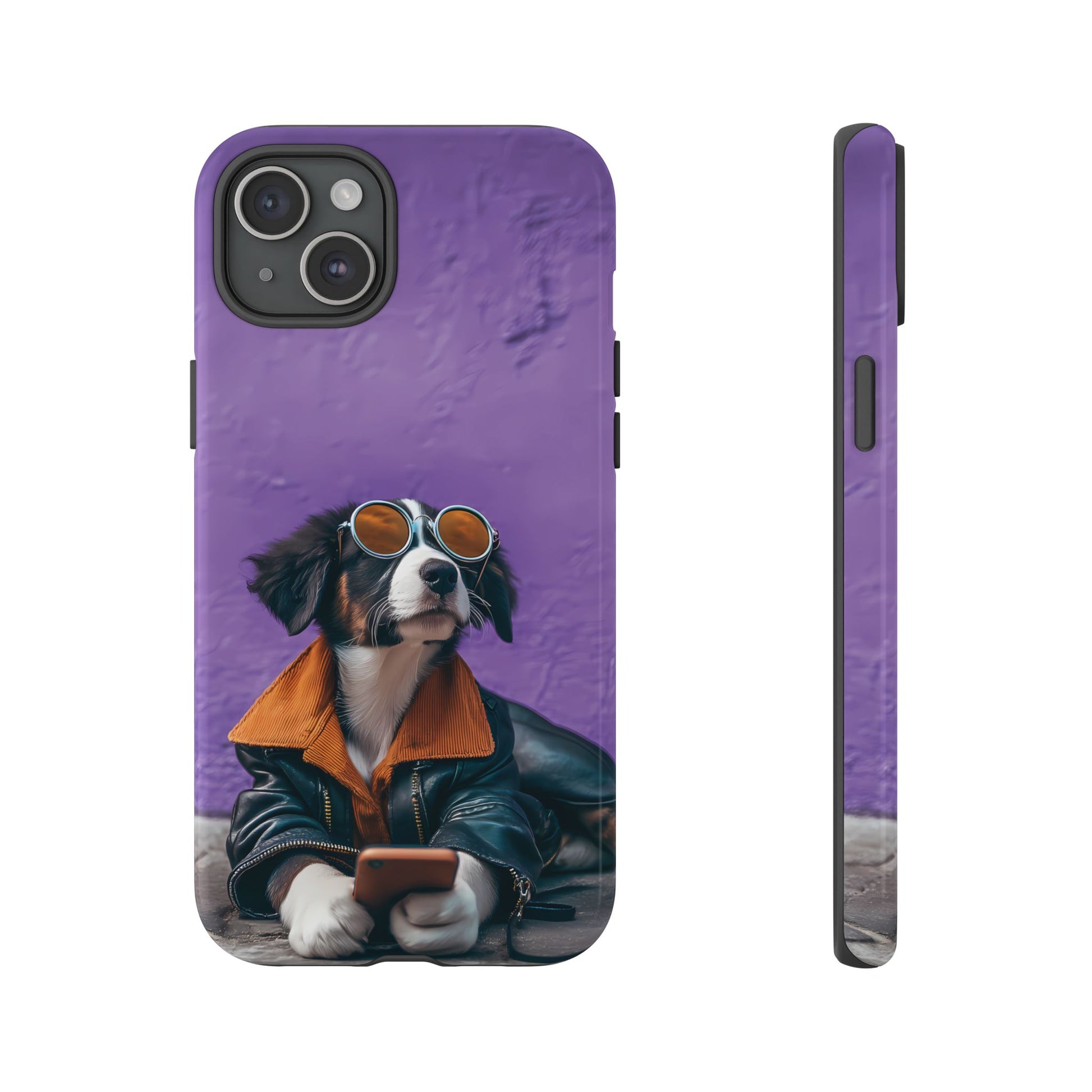 Turn heads with this playful pup in shades and a leather jacket, vibing against a purple wall in a colorful cityscape. Perfect for dog lovers and trendsetters who want fun, fashion, and phone protection in one.