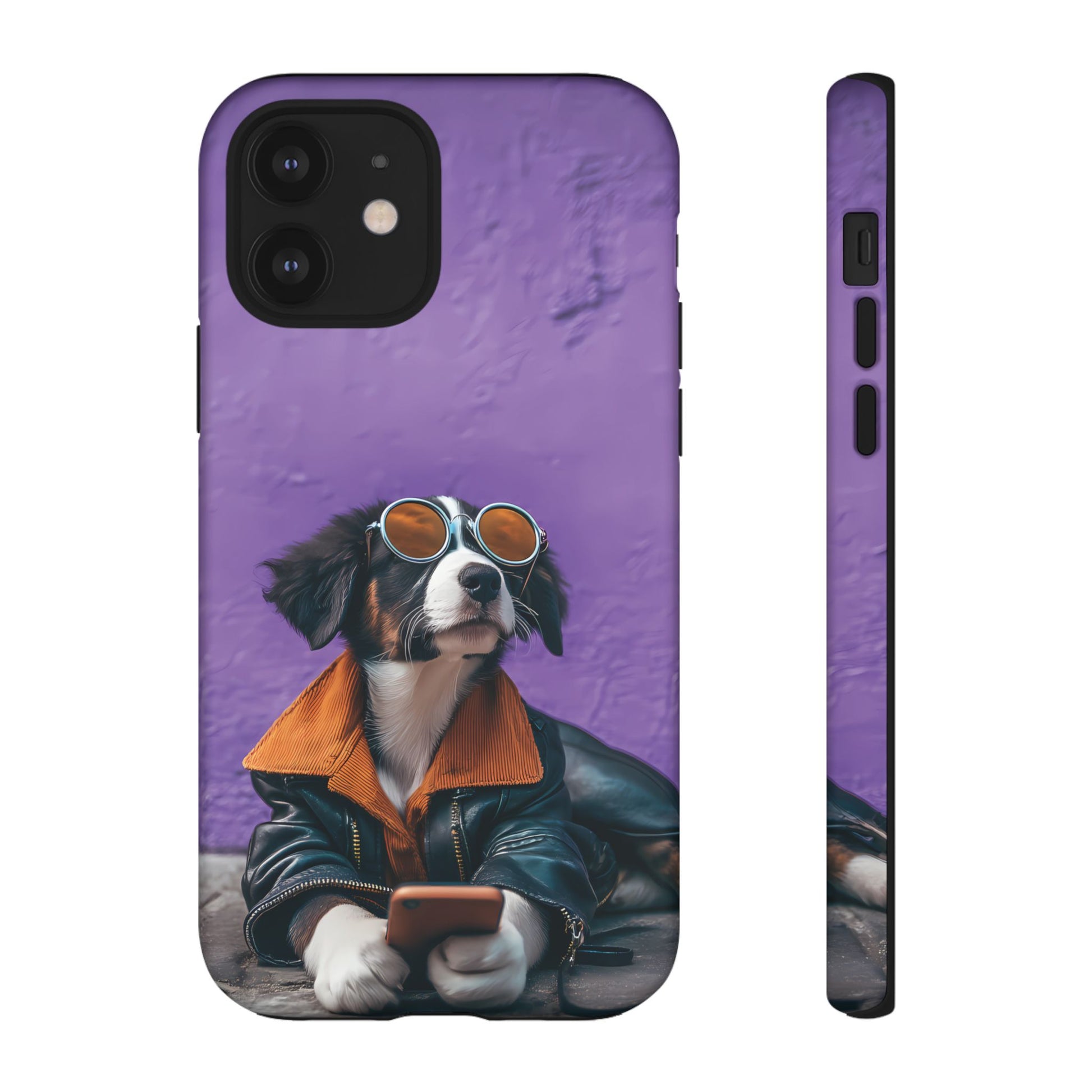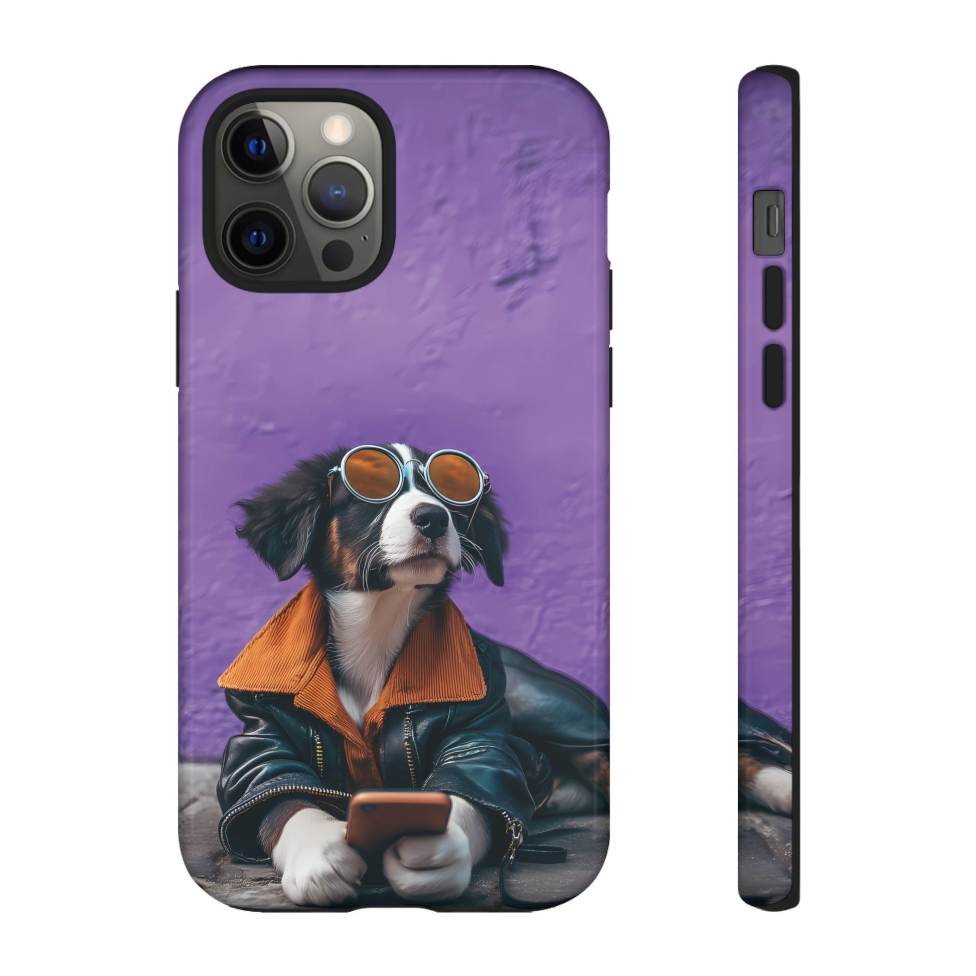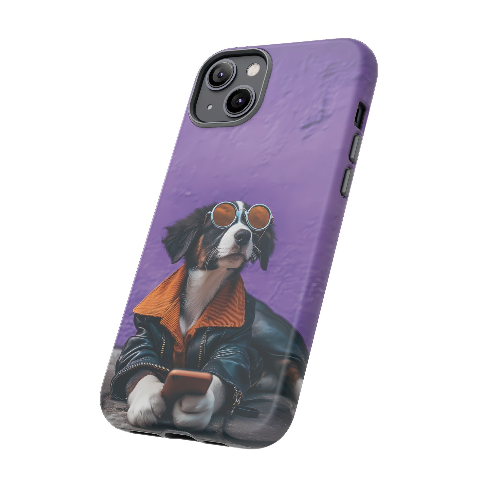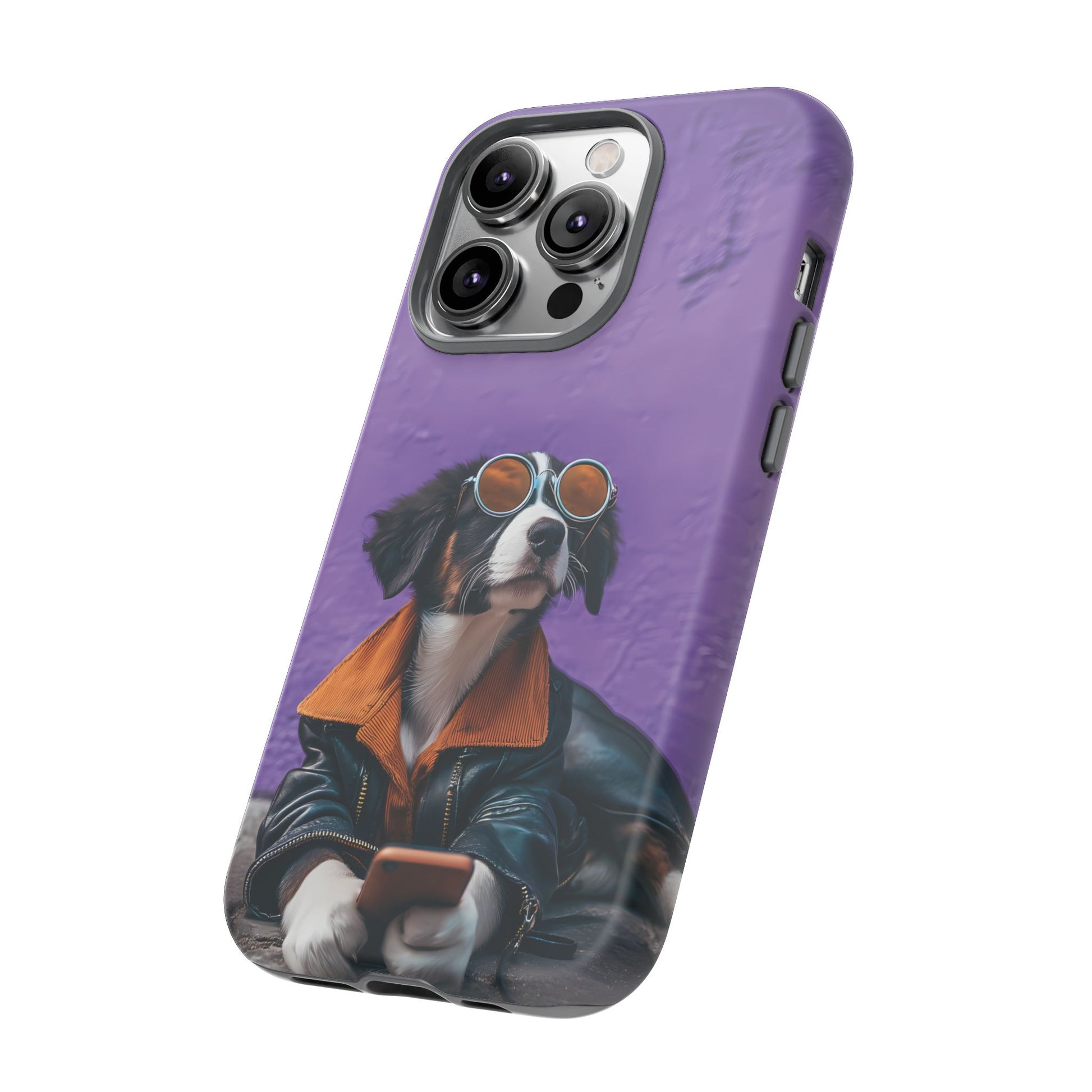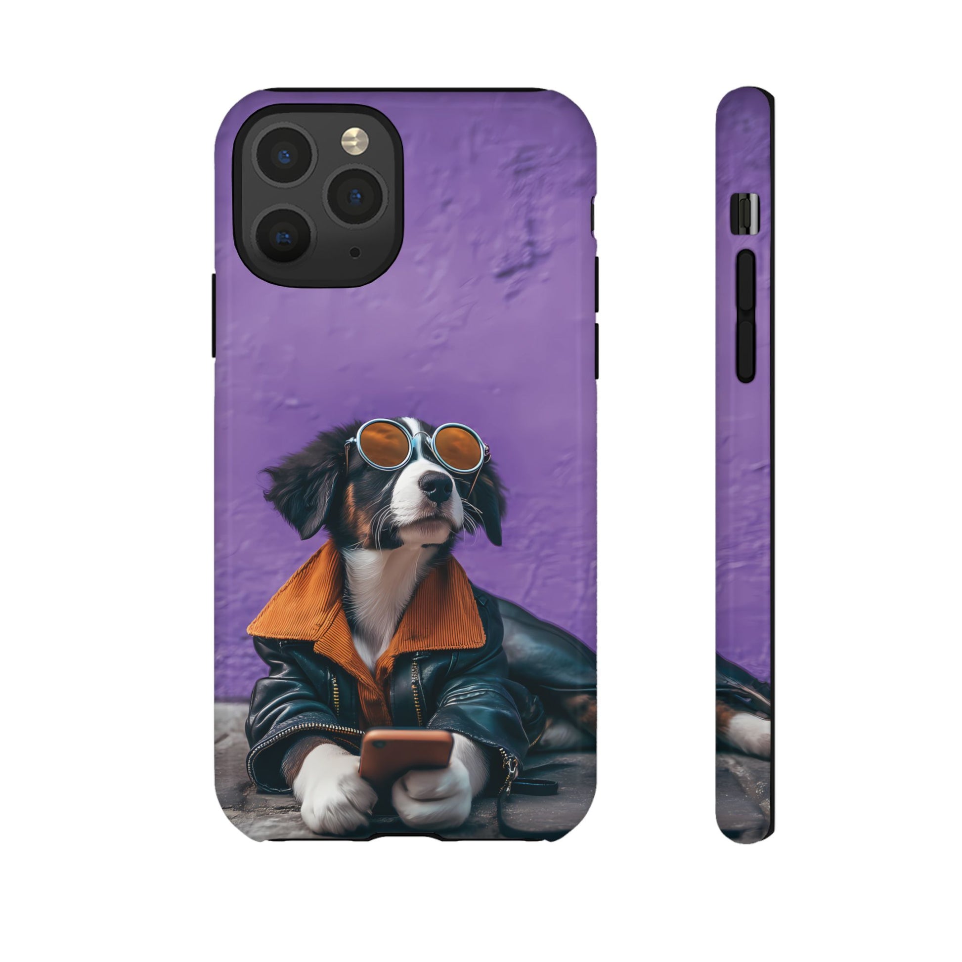 Turn heads with this playful pup in shades and a leather jacket, vibing against a purple wall in a colorful cityscape. Perfect for dog lovers and trendsetters who want fun, fashion, and phone protection in one.