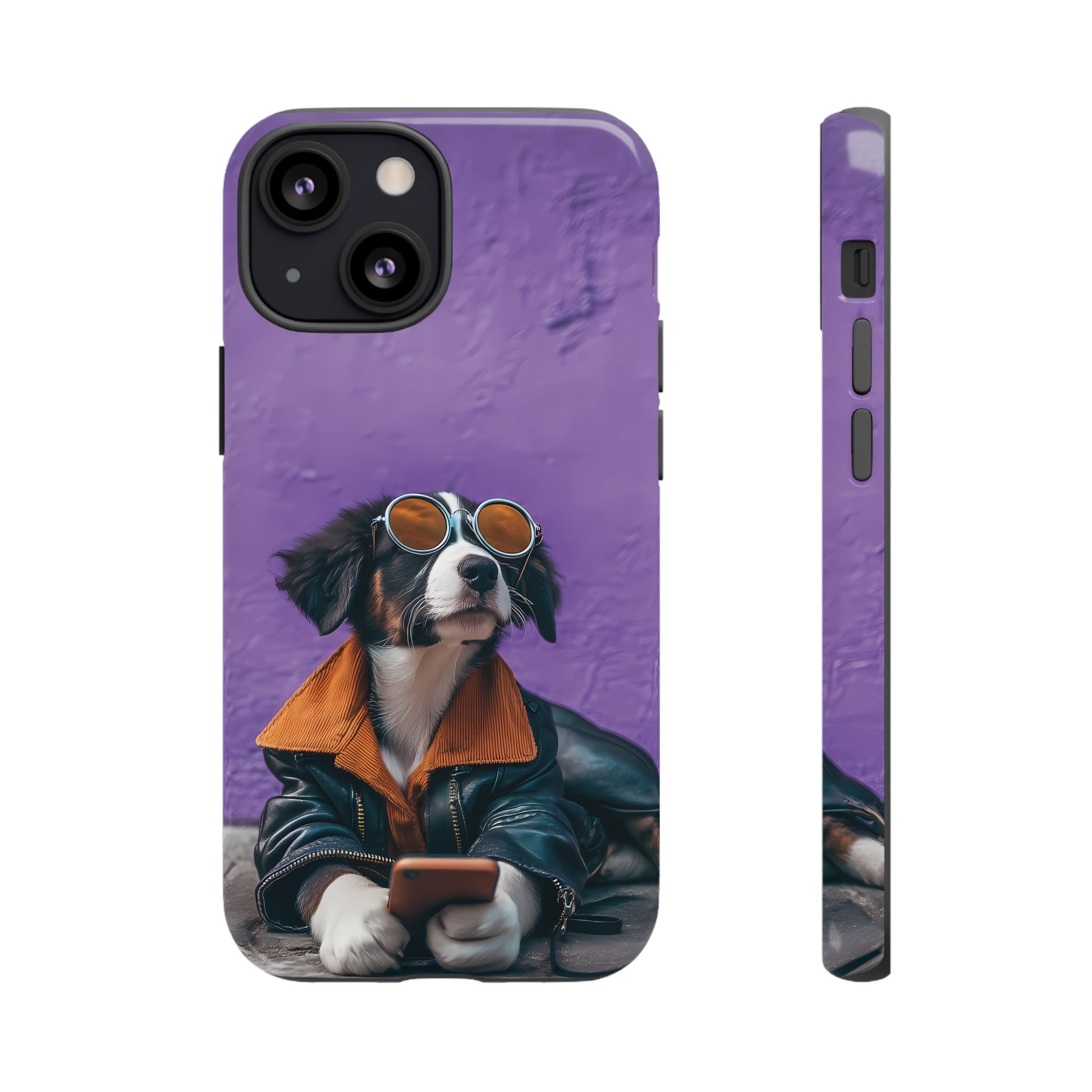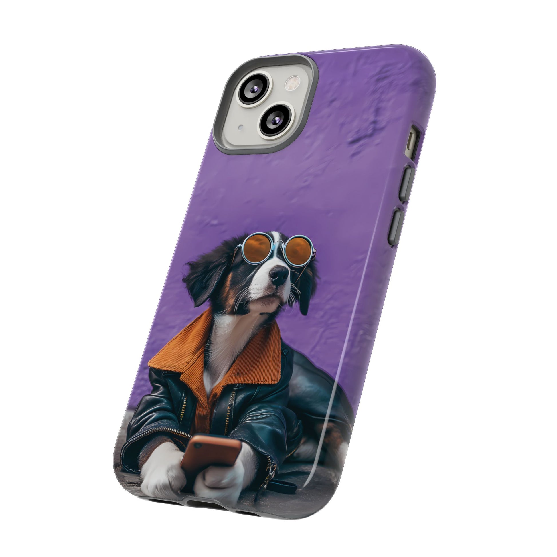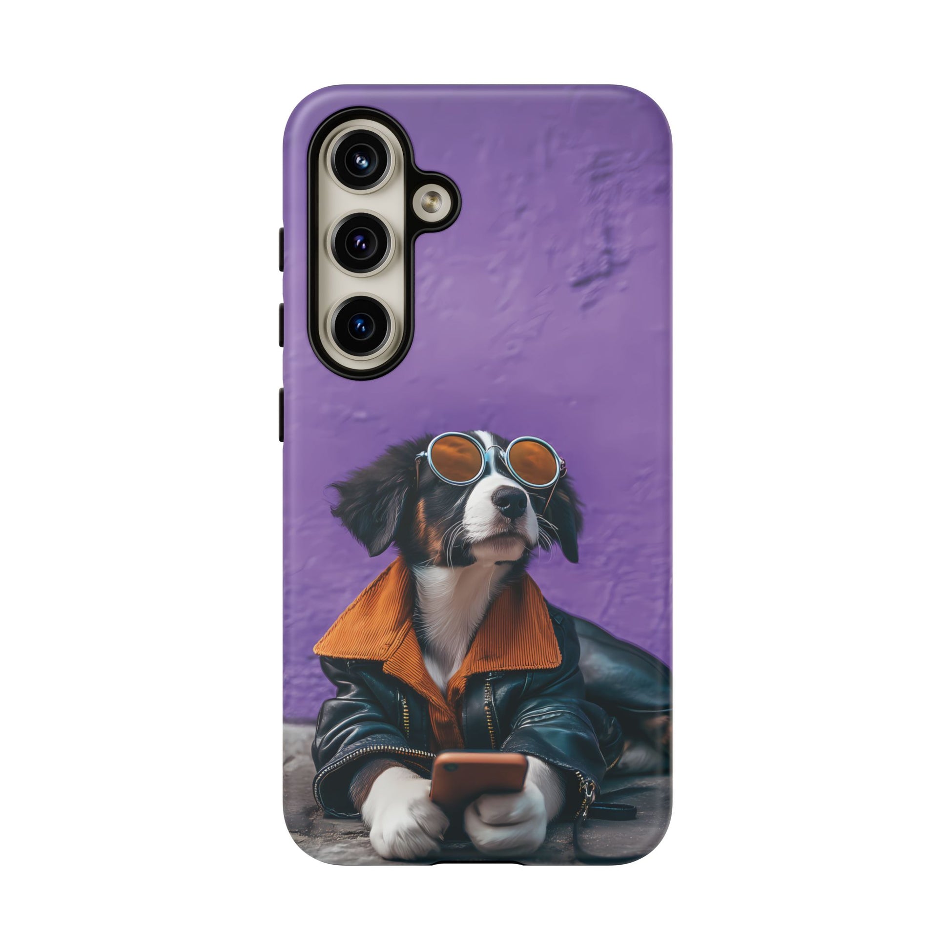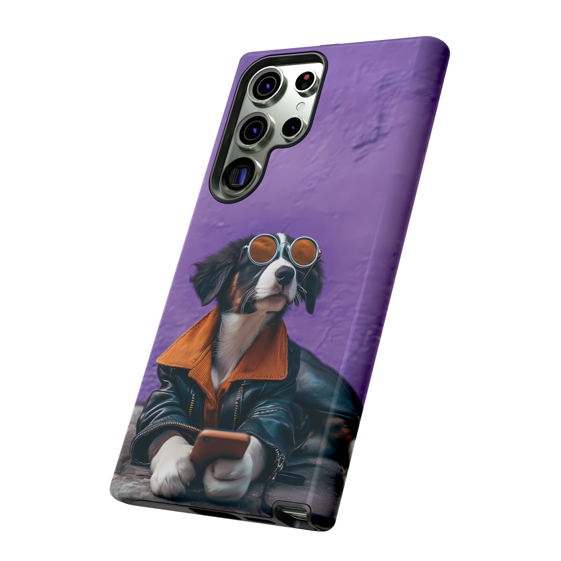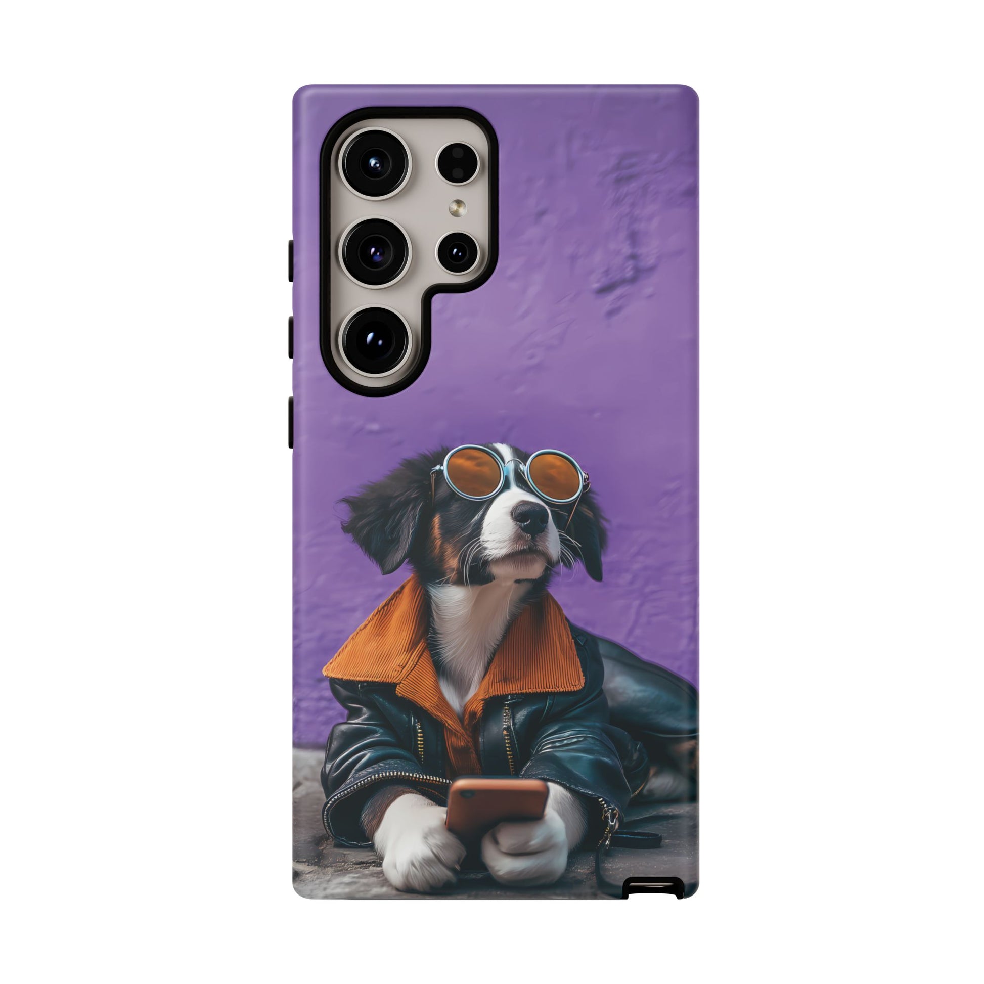 Turn heads with this playful pup in shades and a leather jacket, vibing against a purple wall in a colorful cityscape. Perfect for dog lovers and trendsetters who want fun, fashion, and phone protection in one.