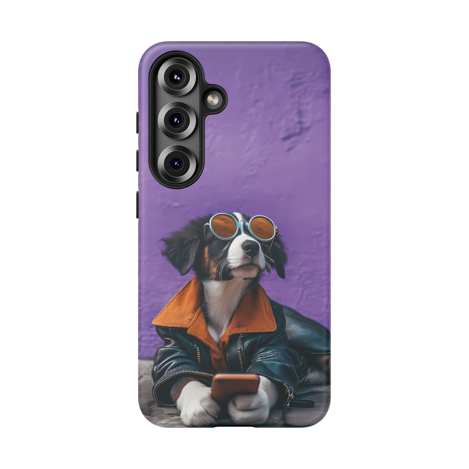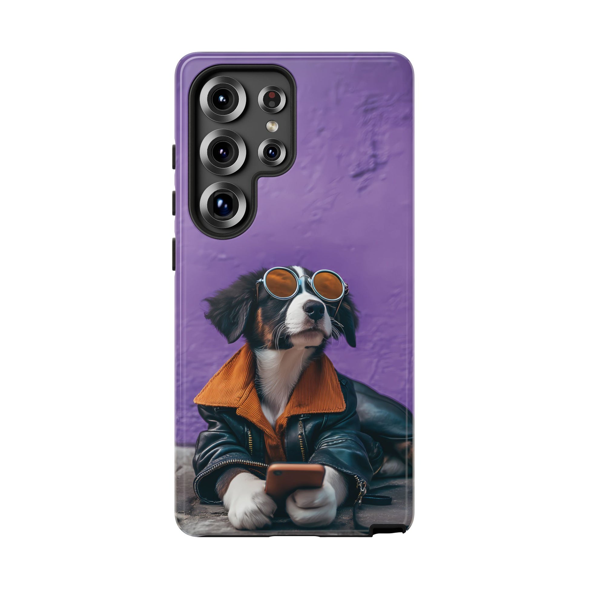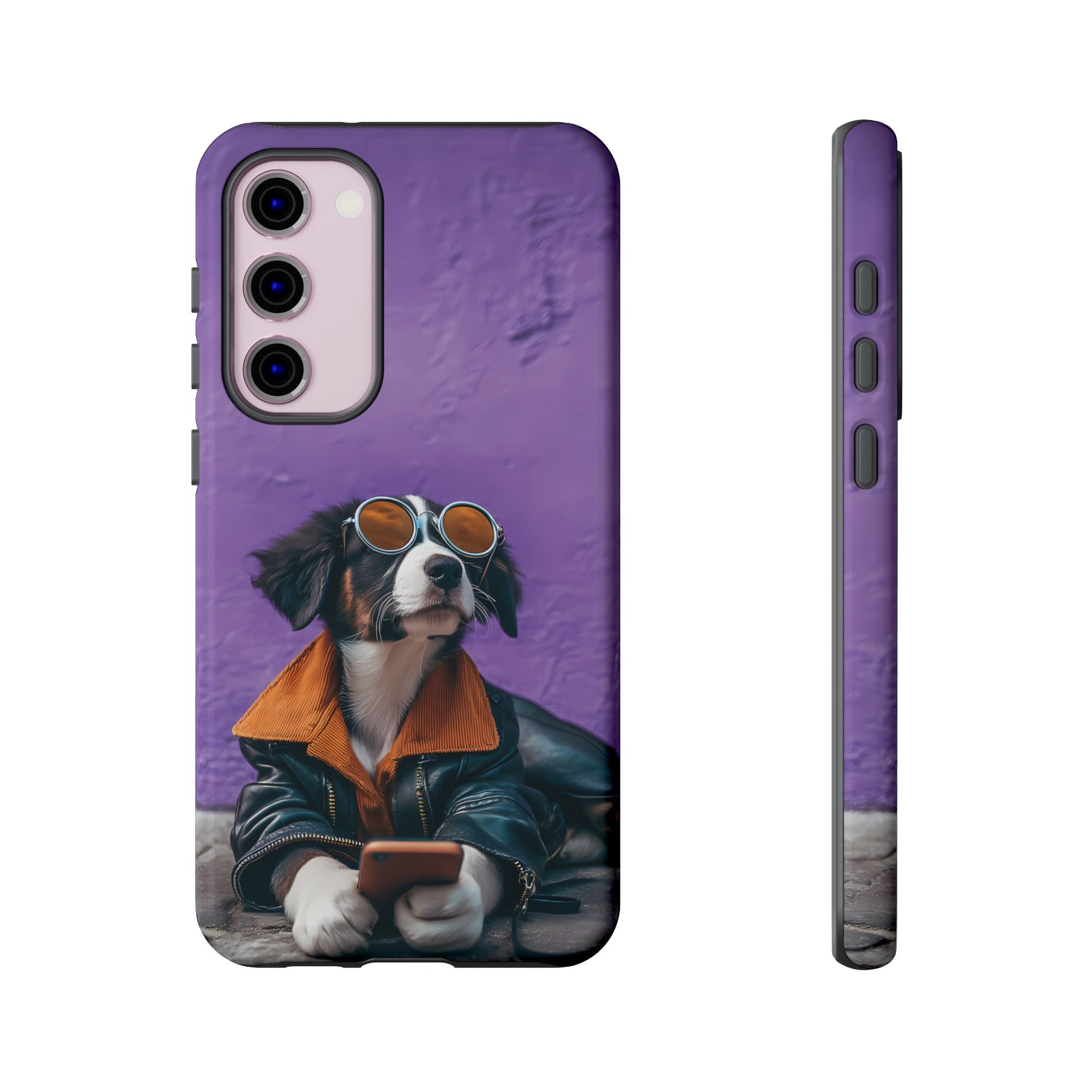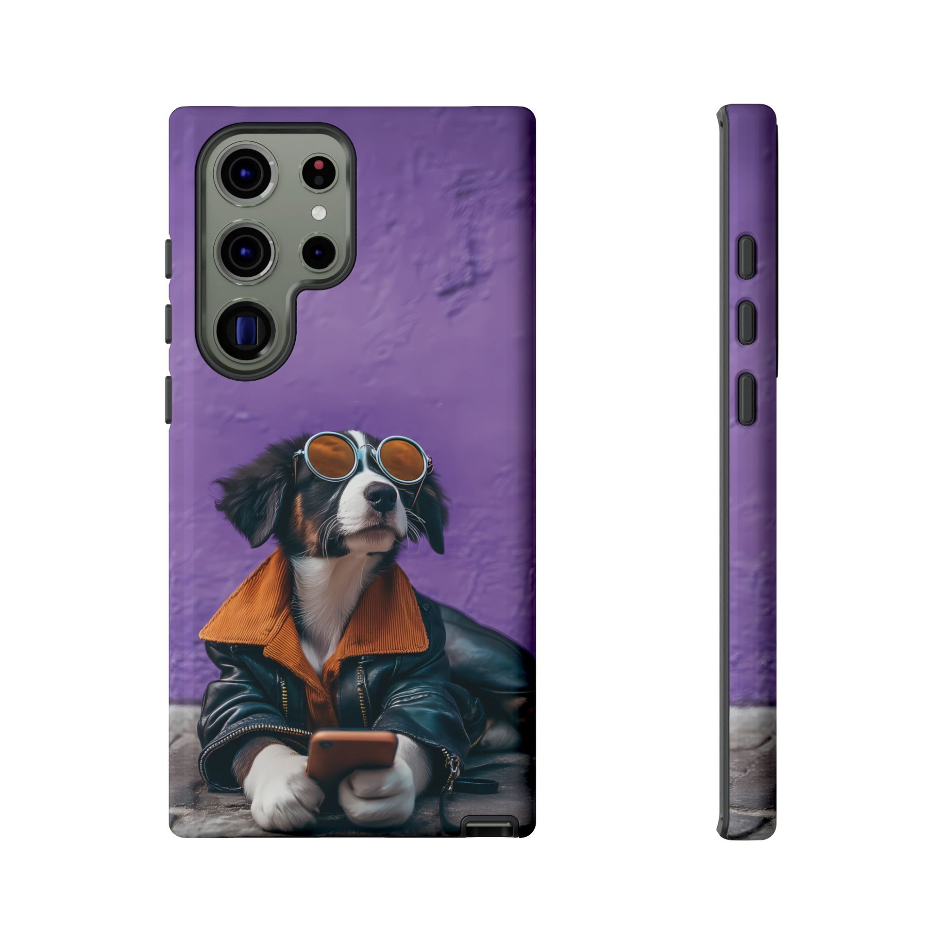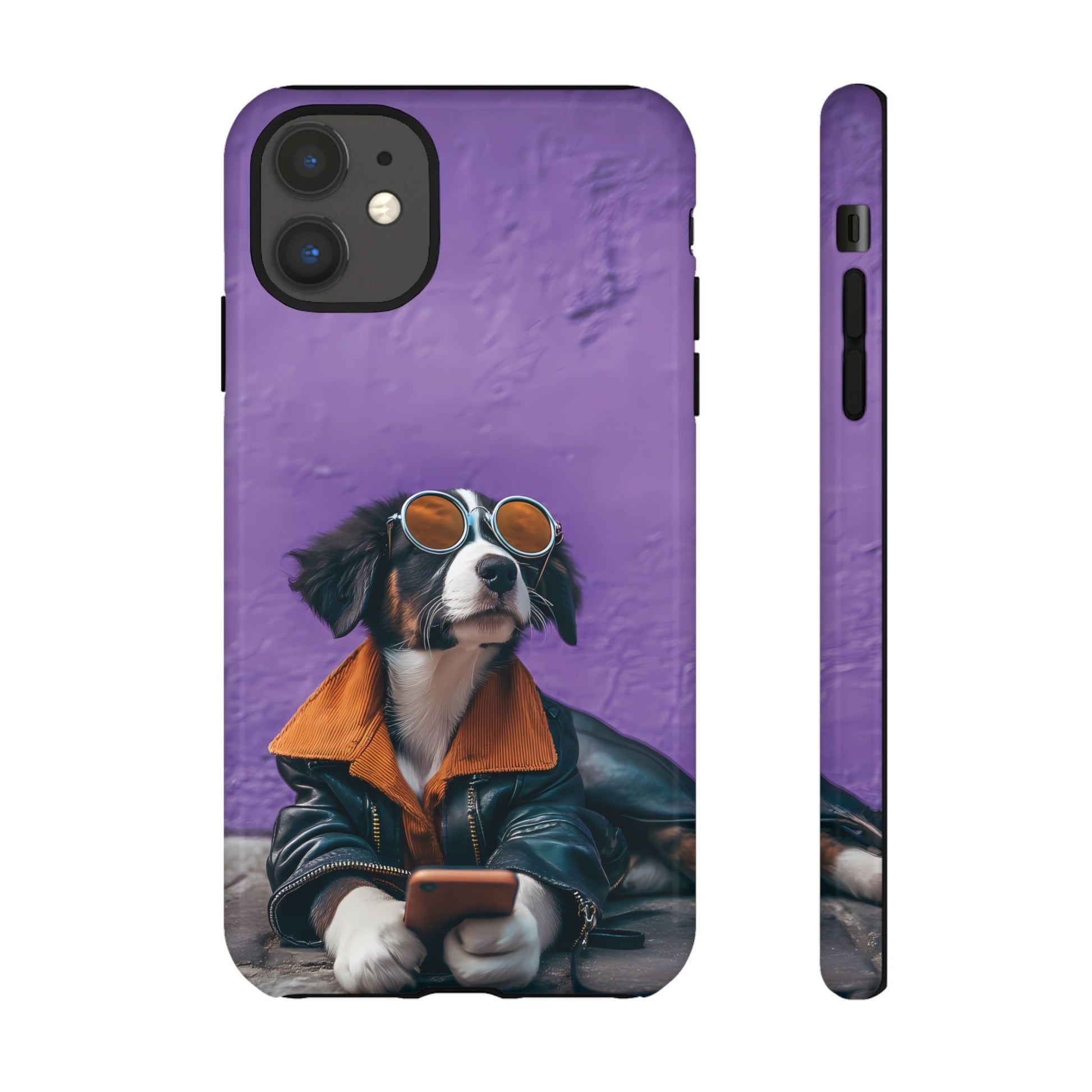 Turn heads with this playful pup in shades and a leather jacket, vibing against a purple wall in a colorful cityscape. Perfect for dog lovers and trendsetters who want fun, fashion, and phone protection in one.