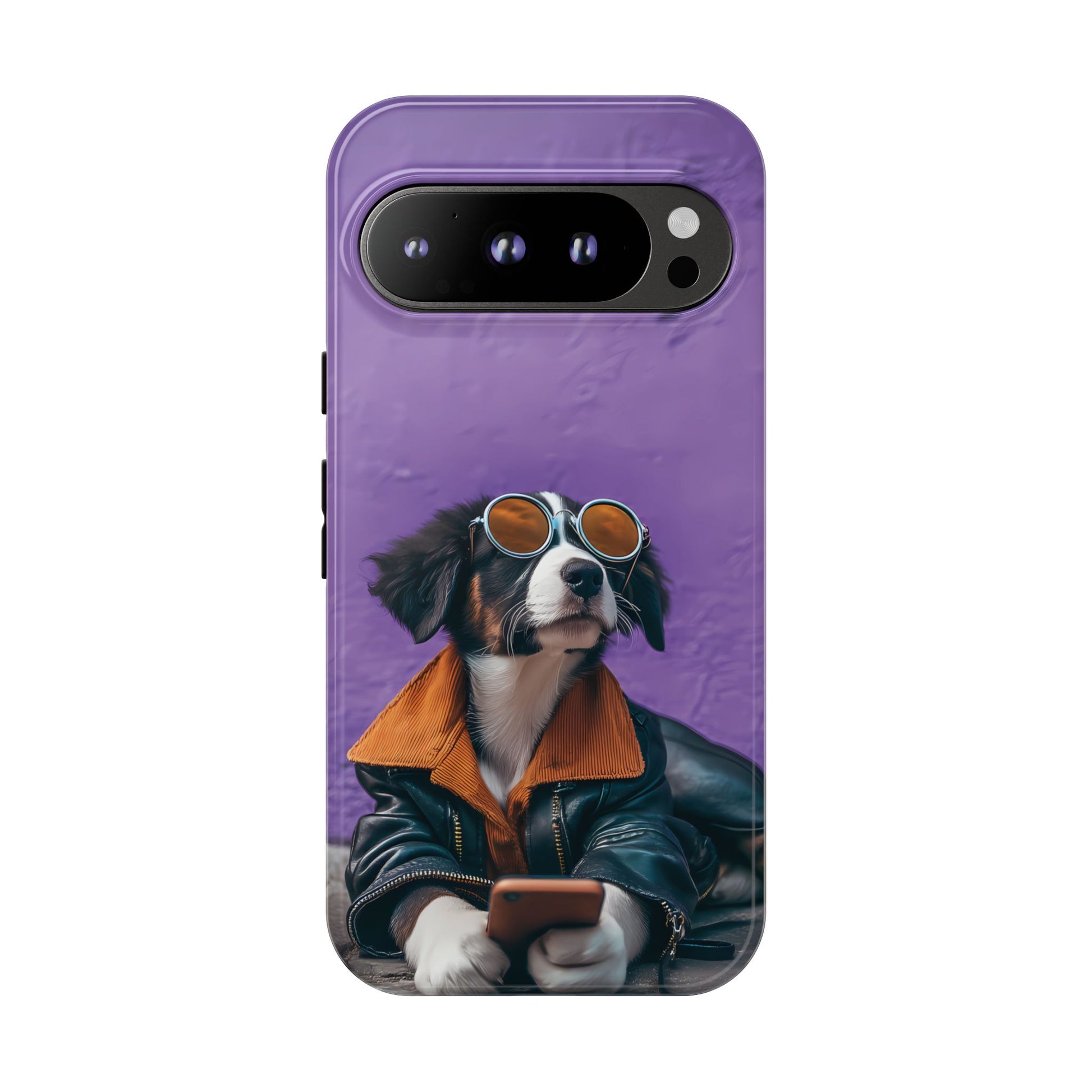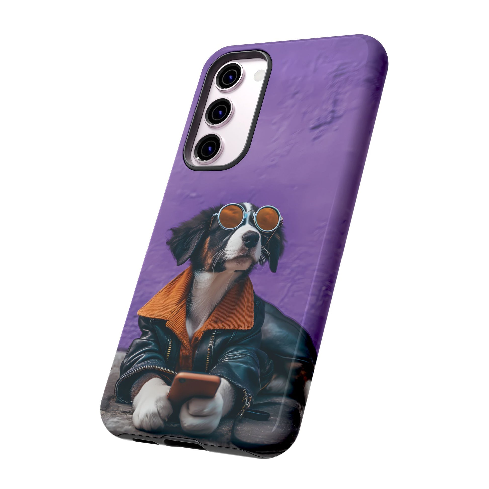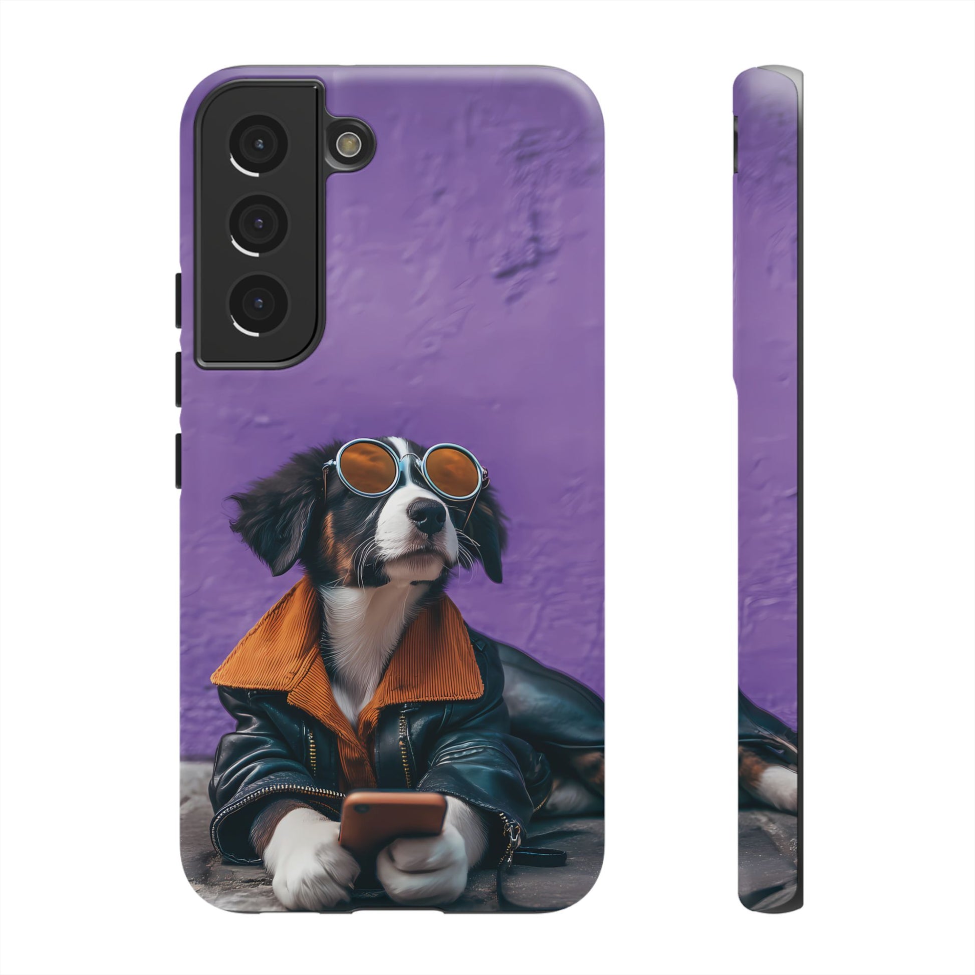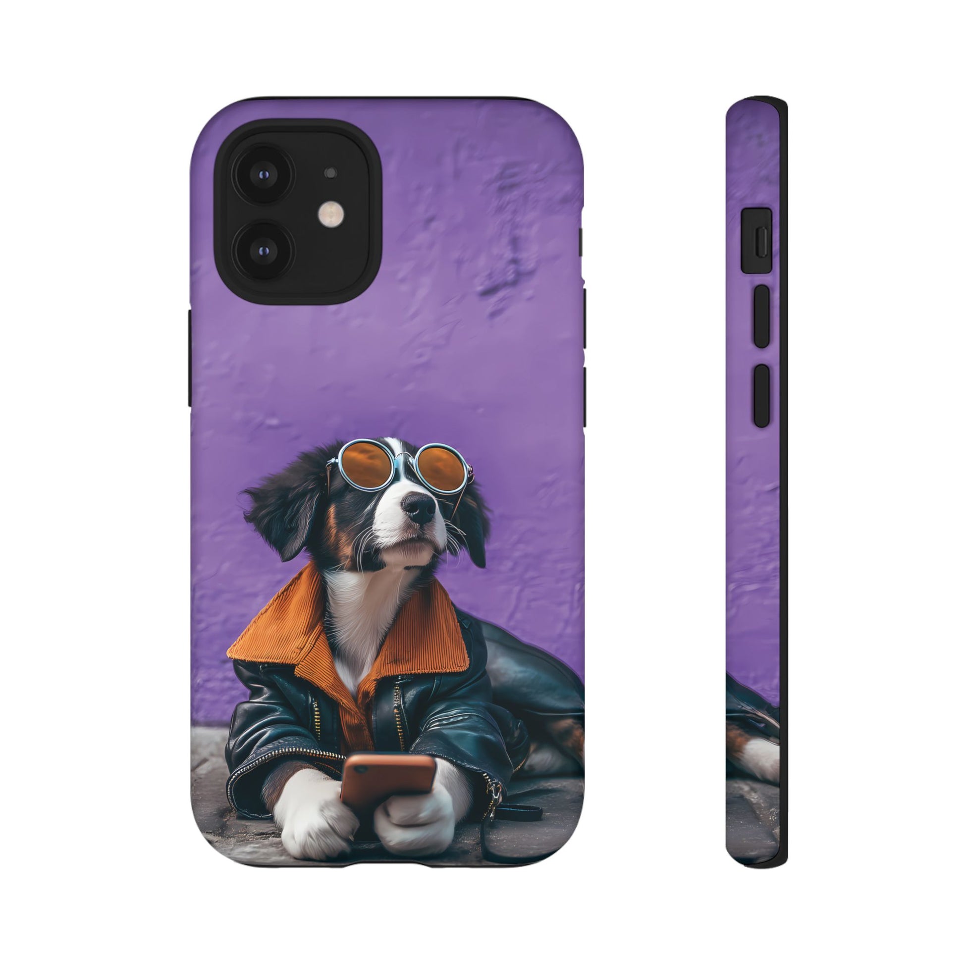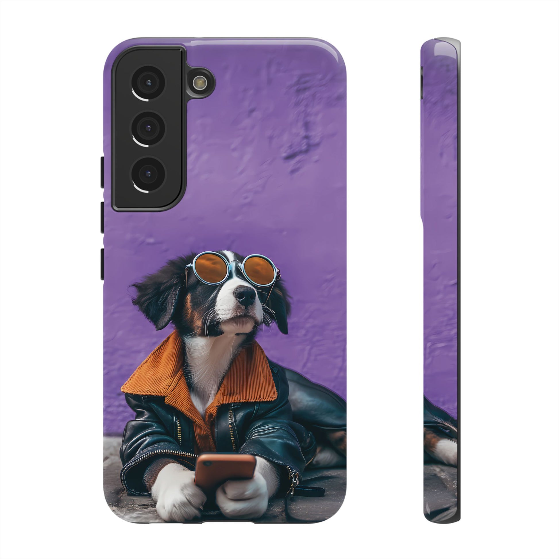 Turn heads with this playful pup in shades and a leather jacket, vibing against a purple wall in a colorful cityscape. Perfect for dog lovers and trendsetters who want fun, fashion, and phone protection in one.