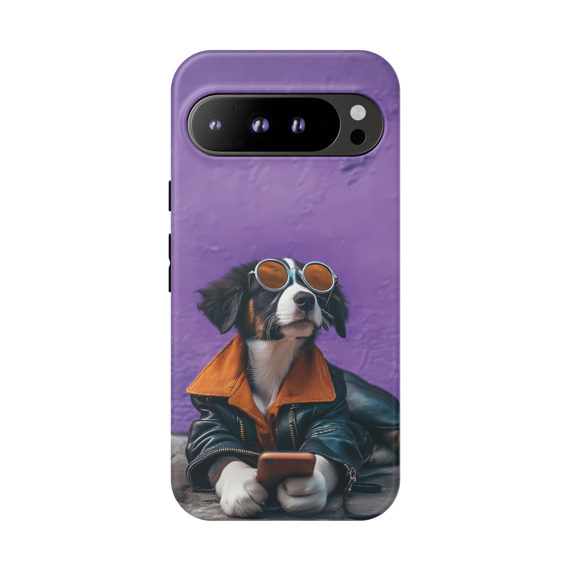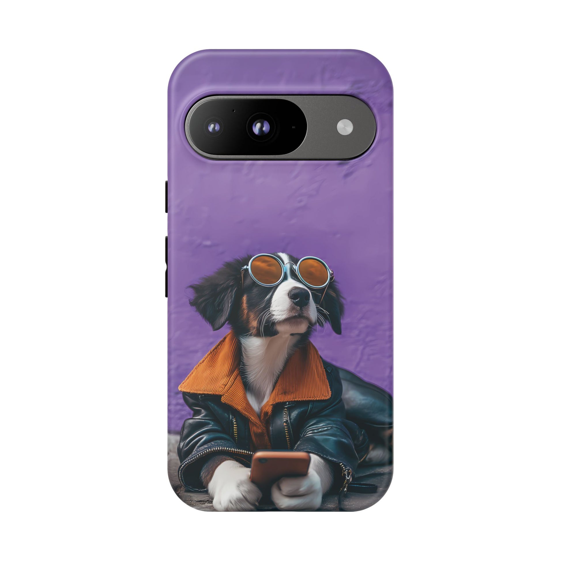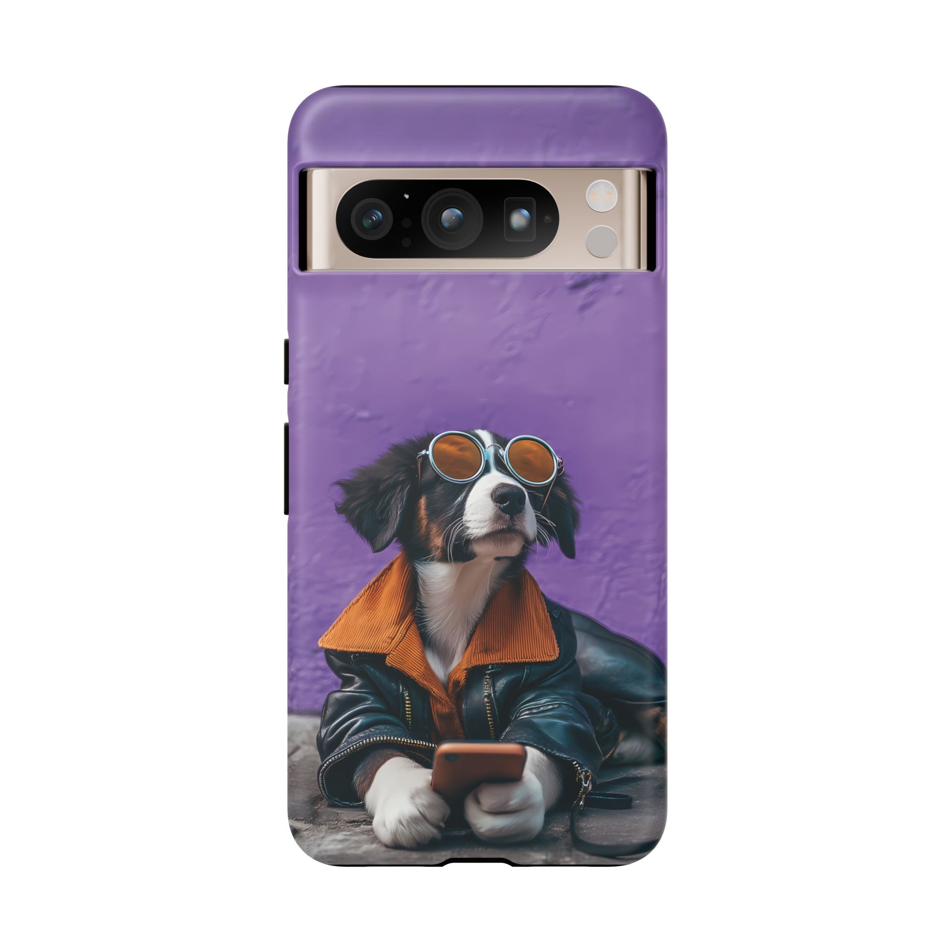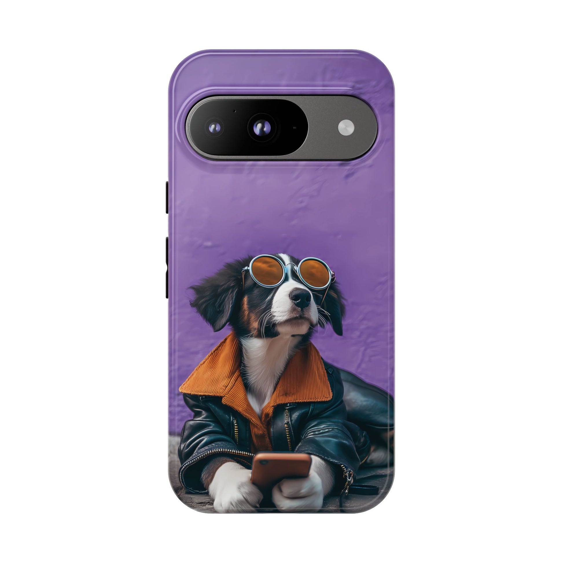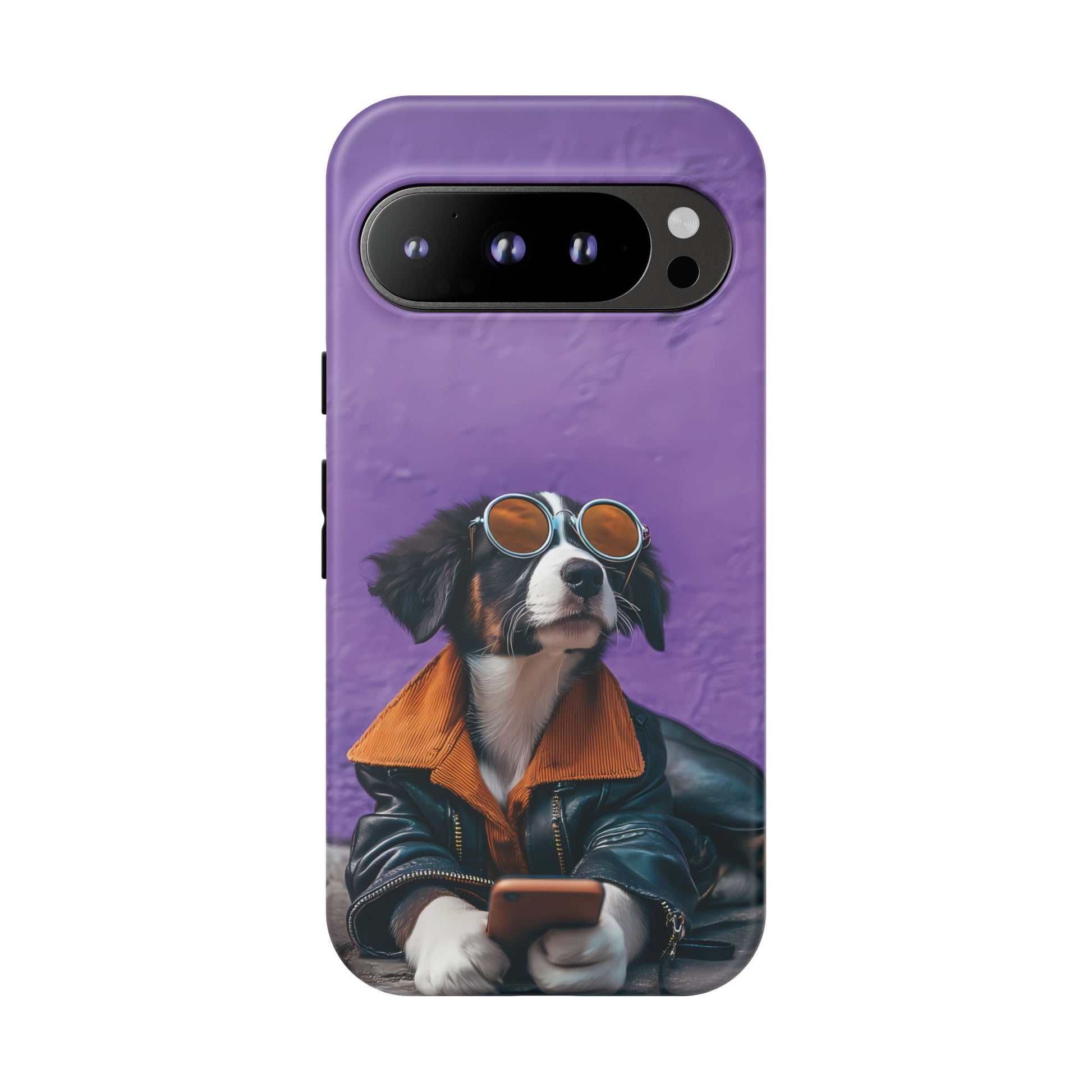 Turn heads with this playful pup in shades and a leather jacket, vibing against a purple wall in a colorful cityscape. Perfect for dog lovers and trendsetters who want fun, fashion, and phone protection in one.
