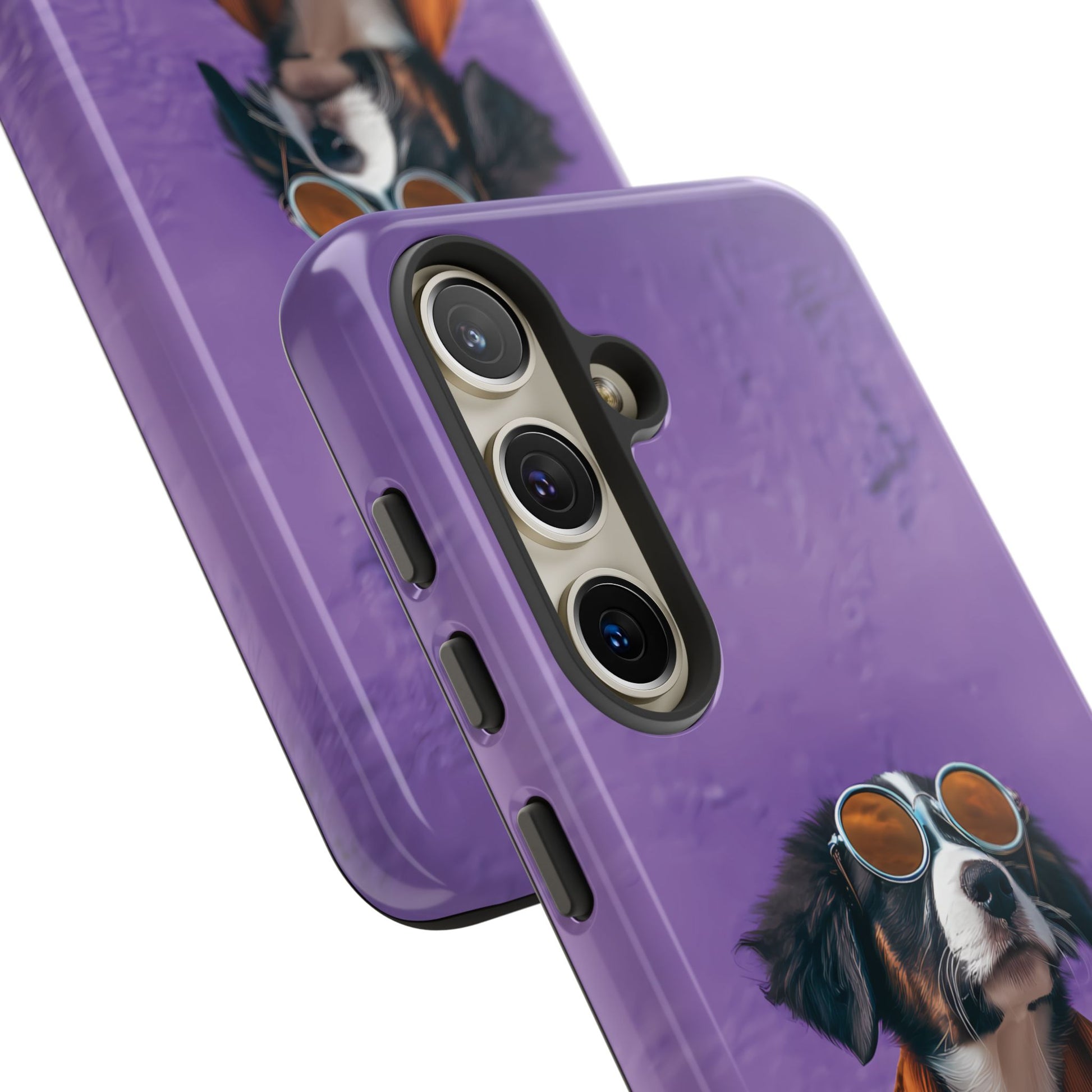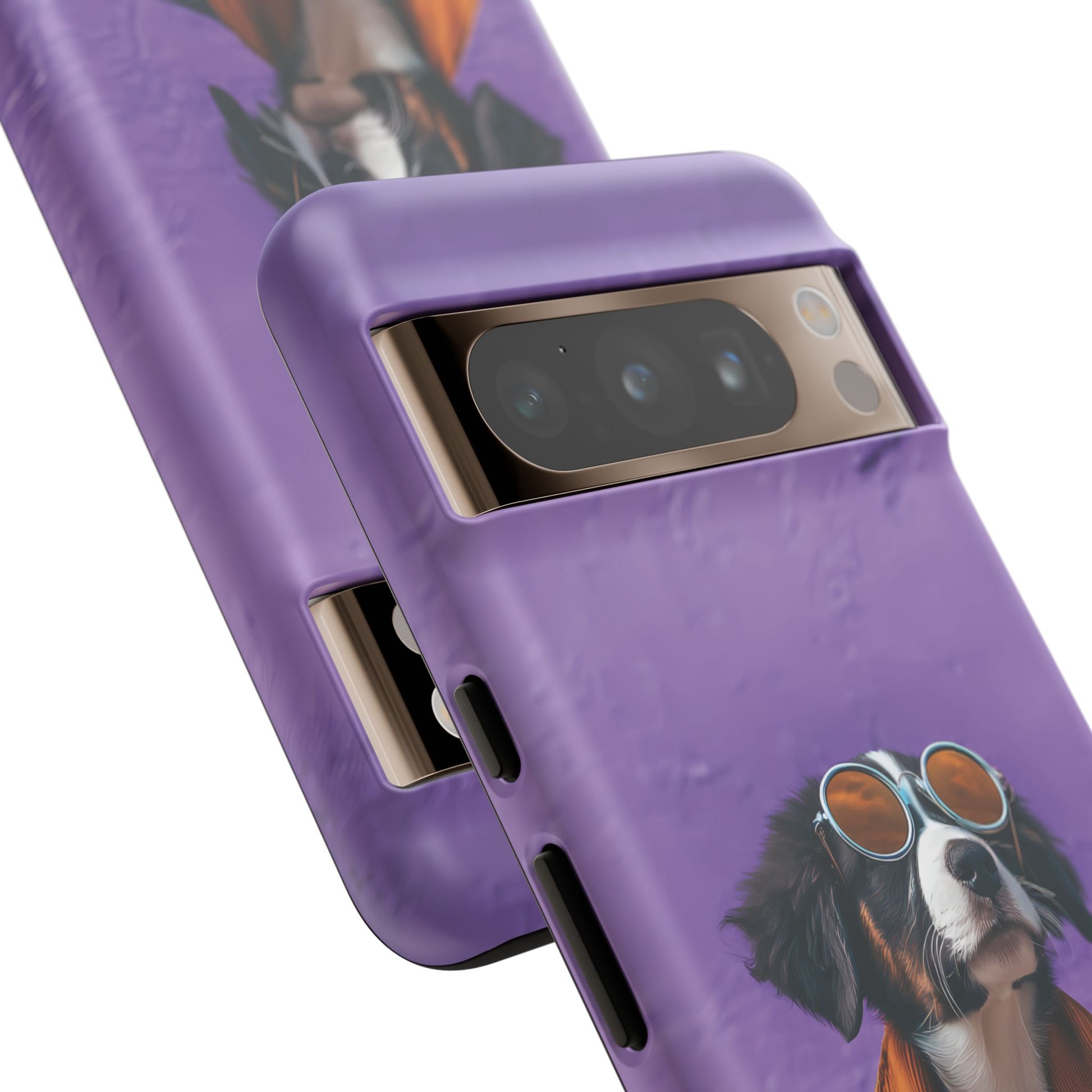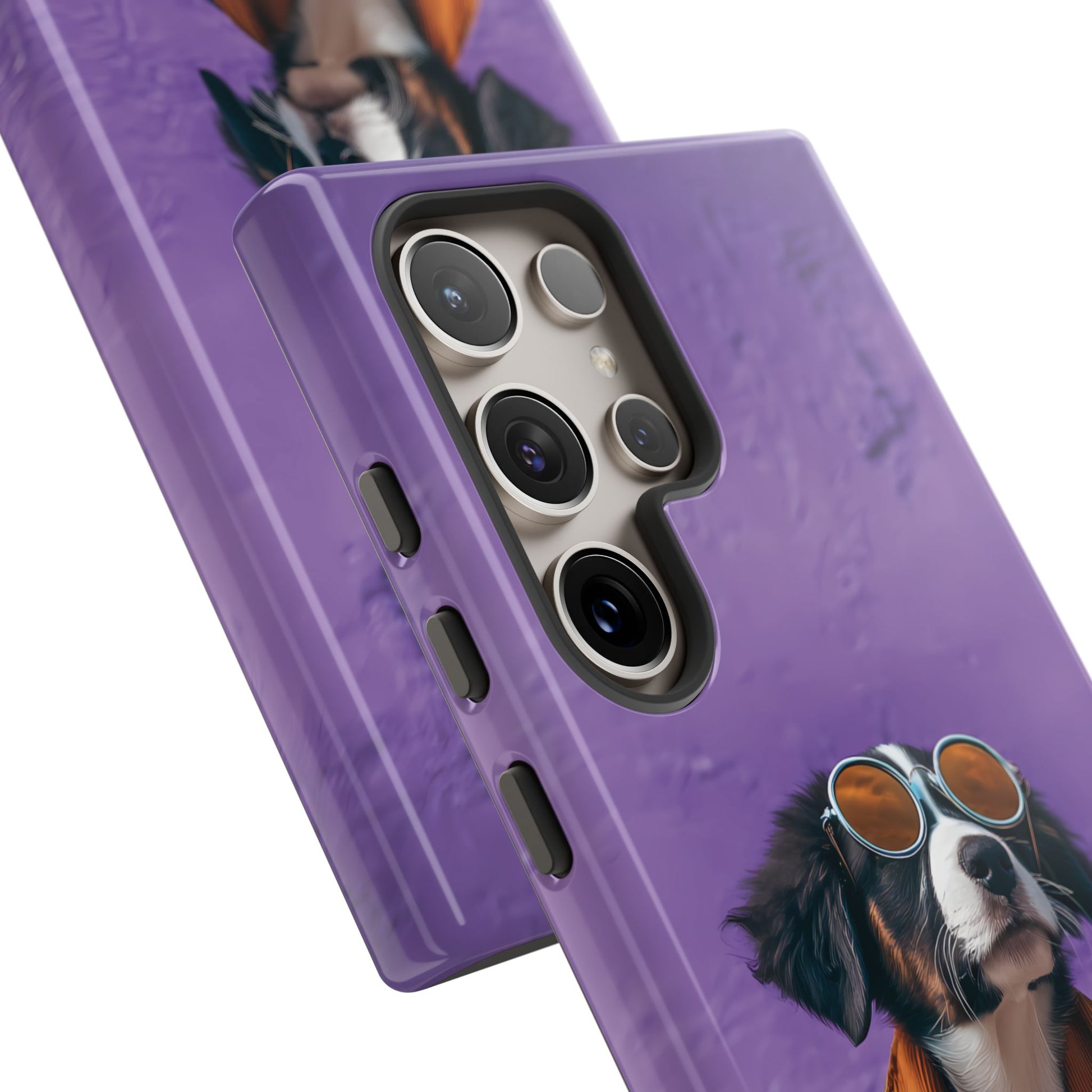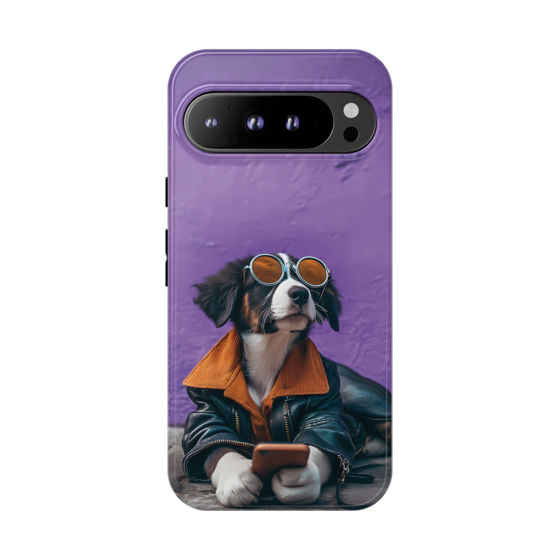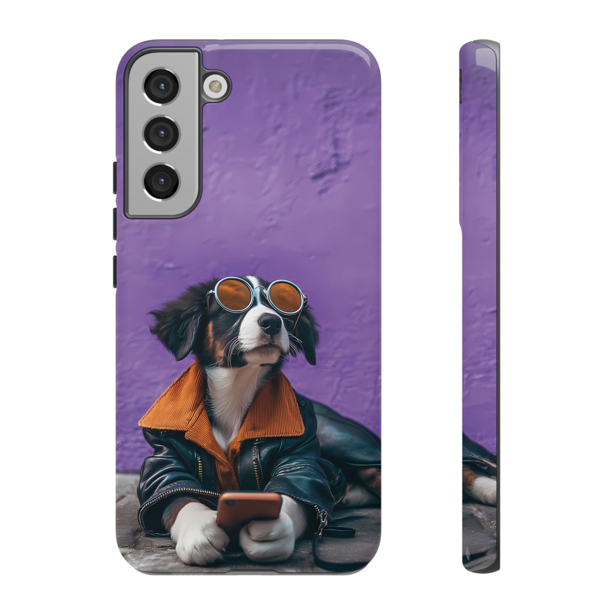 Turn heads with this playful pup in shades and a leather jacket, vibing against a purple wall in a colorful cityscape. Perfect for dog lovers and trendsetters who want fun, fashion, and phone protection in one.