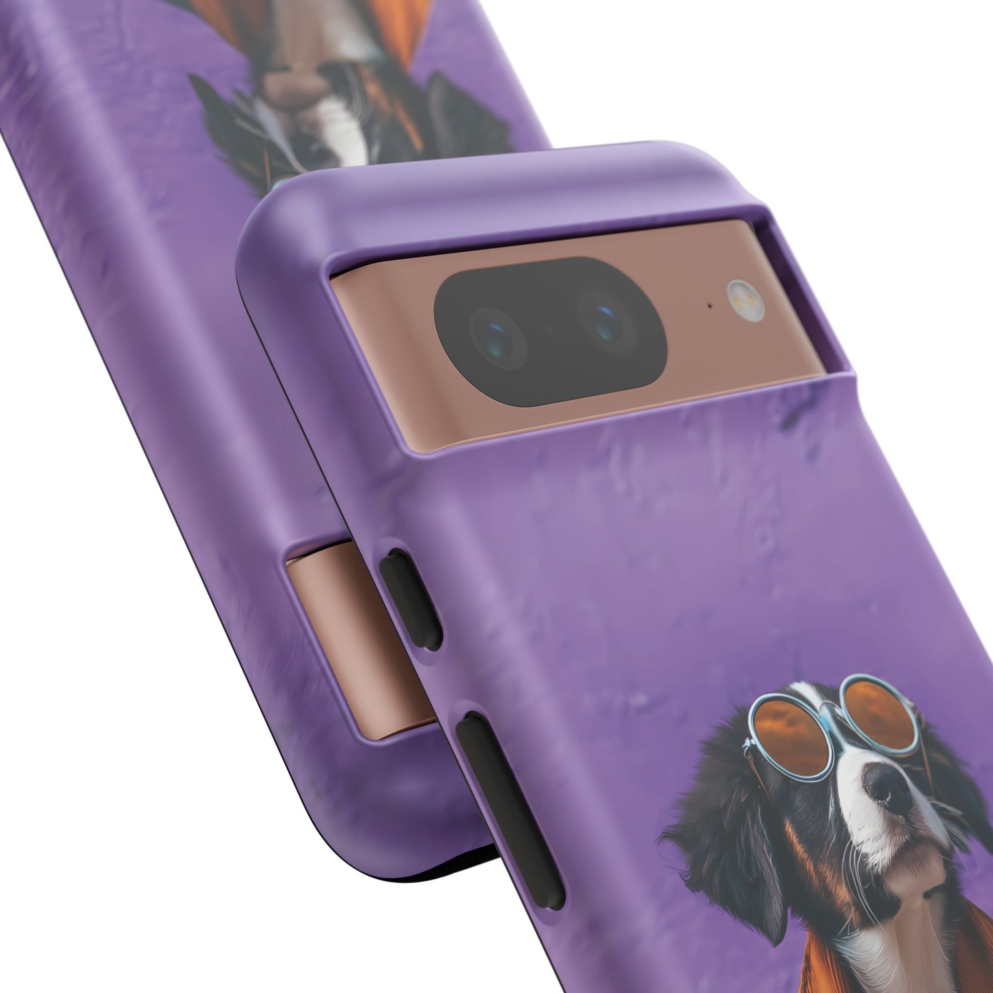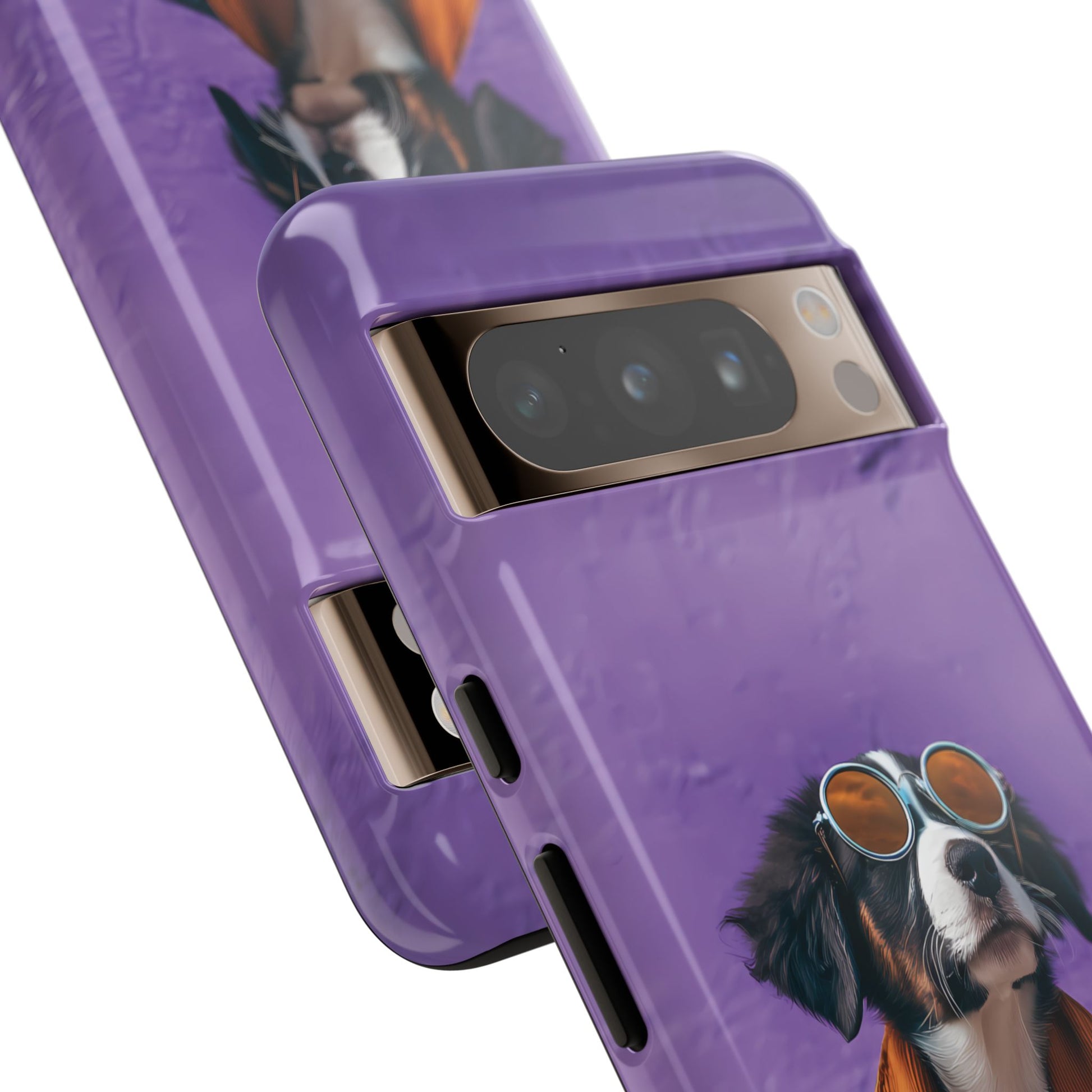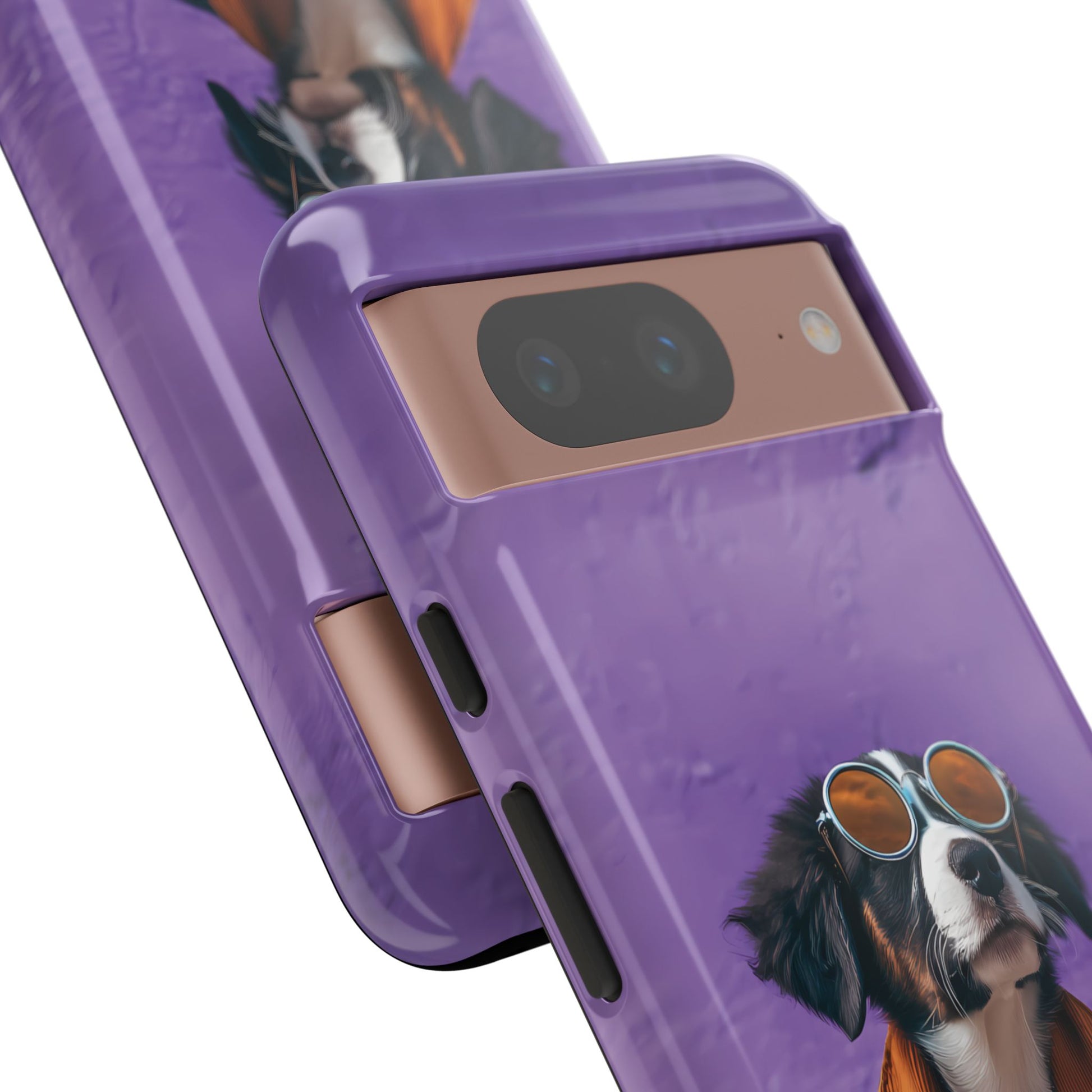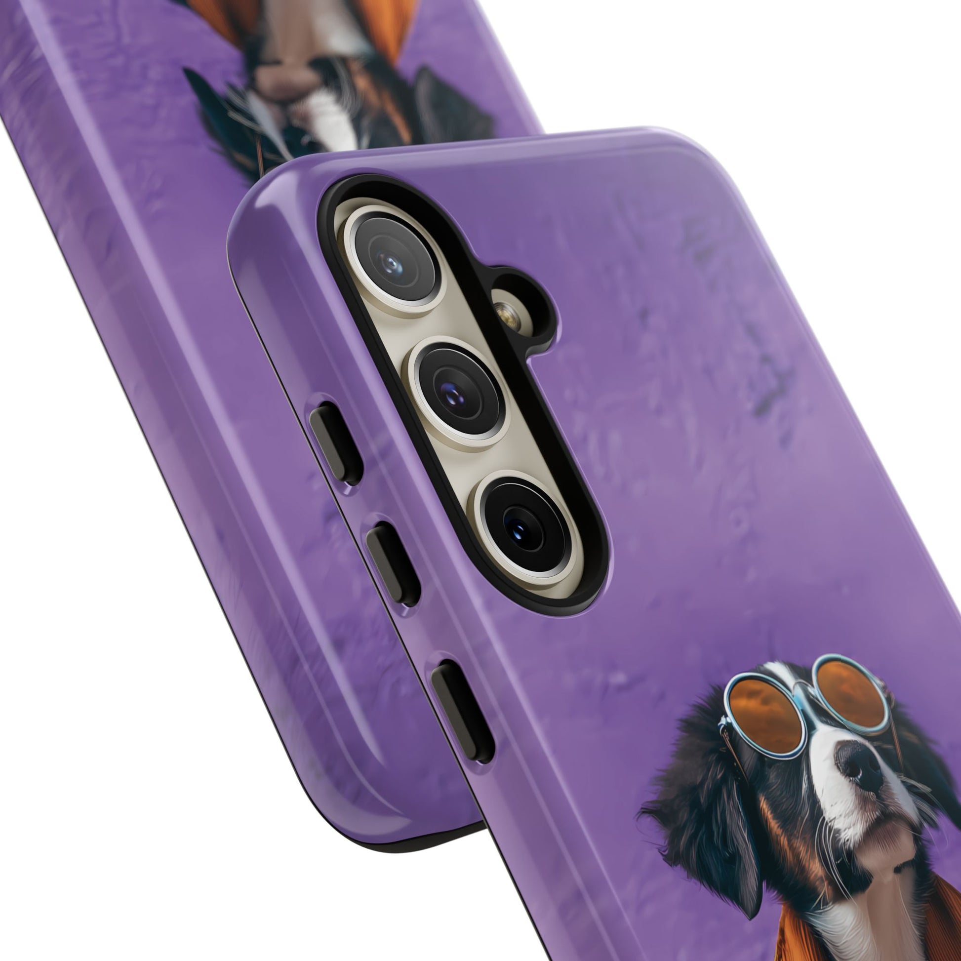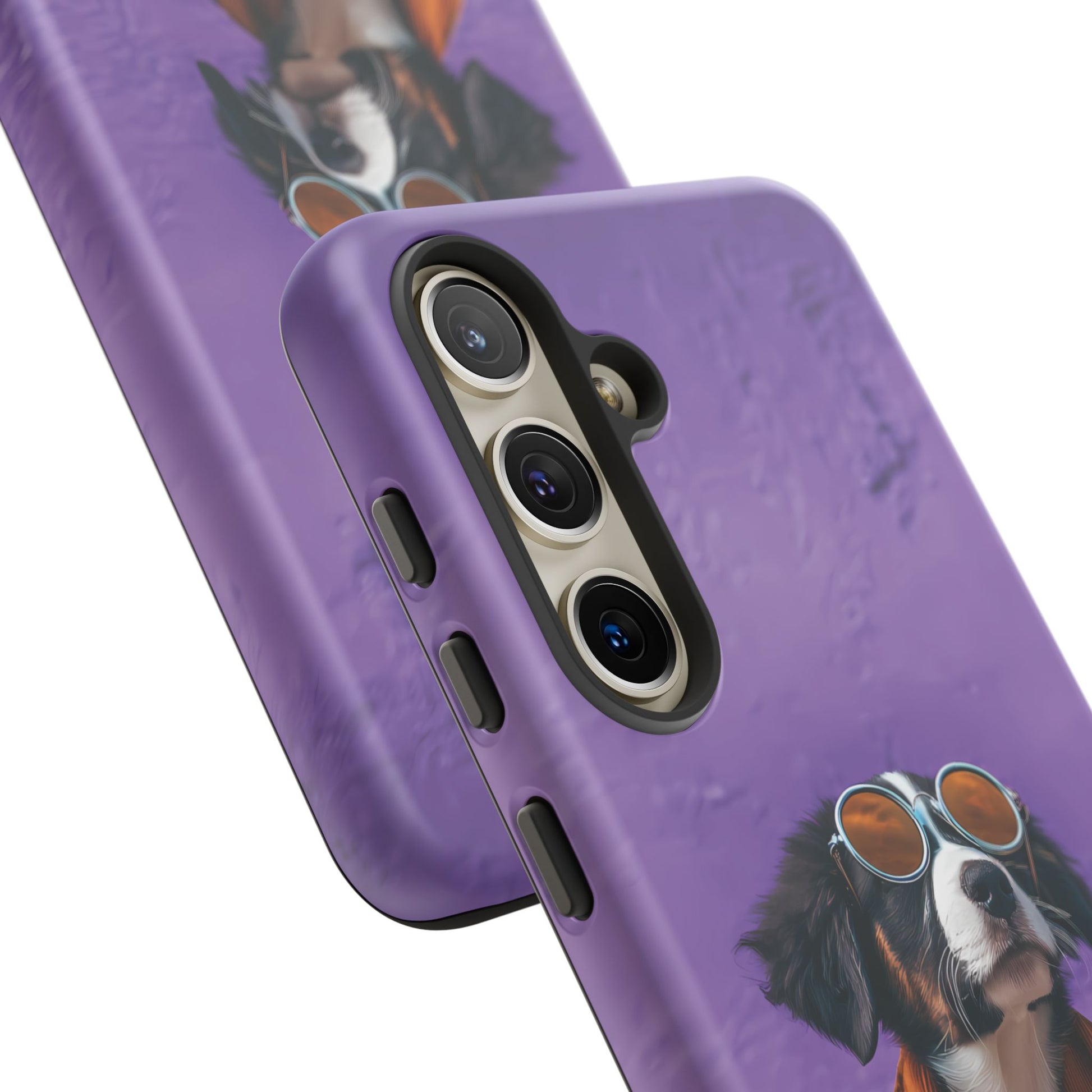 Turn heads with this playful pup in shades and a leather jacket, vibing against a purple wall in a colorful cityscape. Perfect for dog lovers and trendsetters who want fun, fashion, and phone protection in one.
