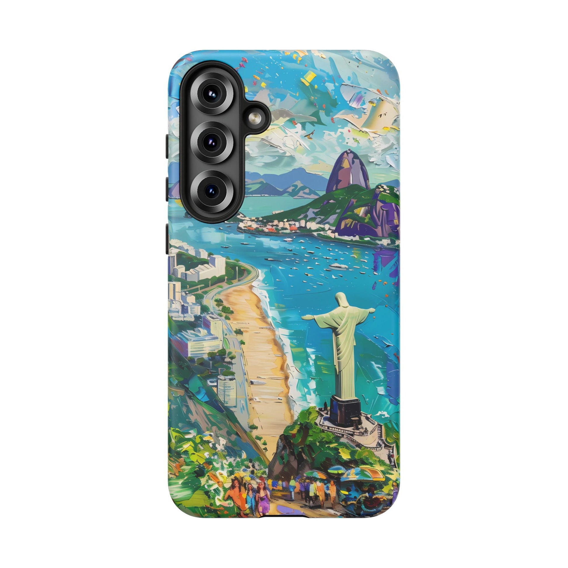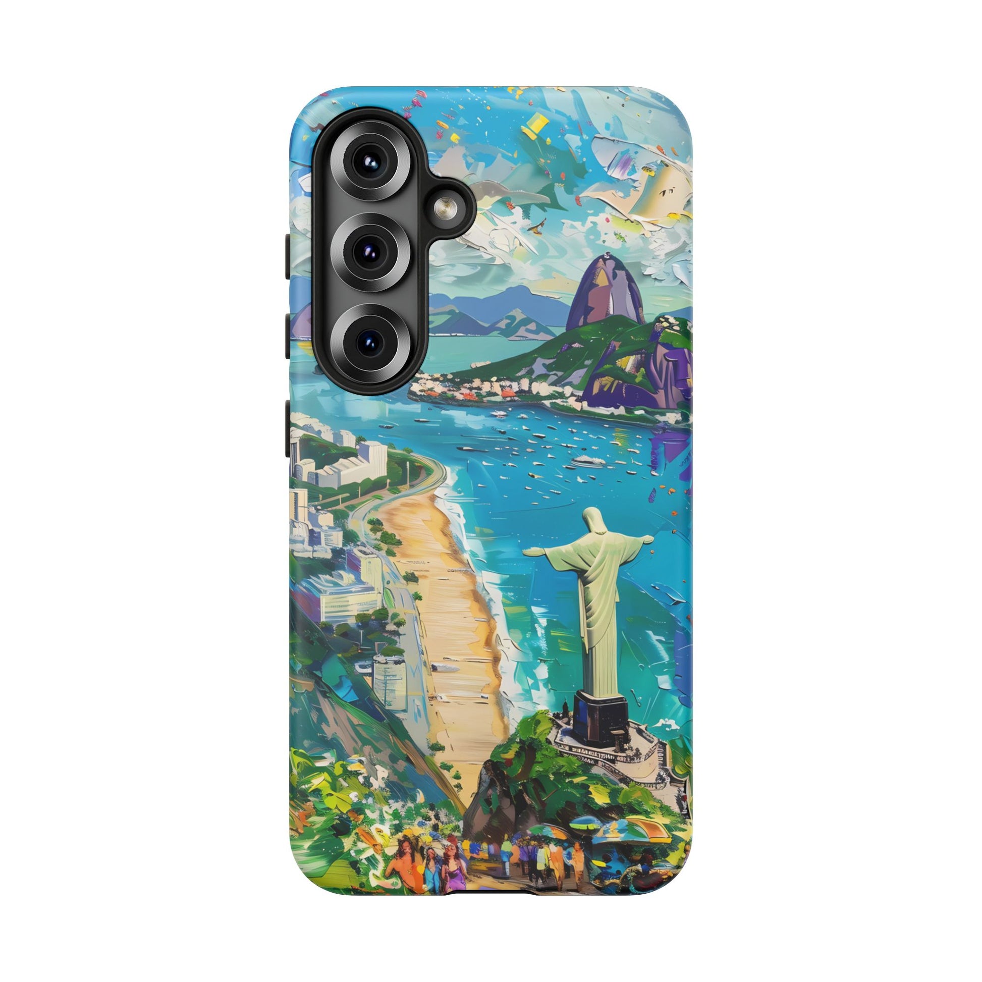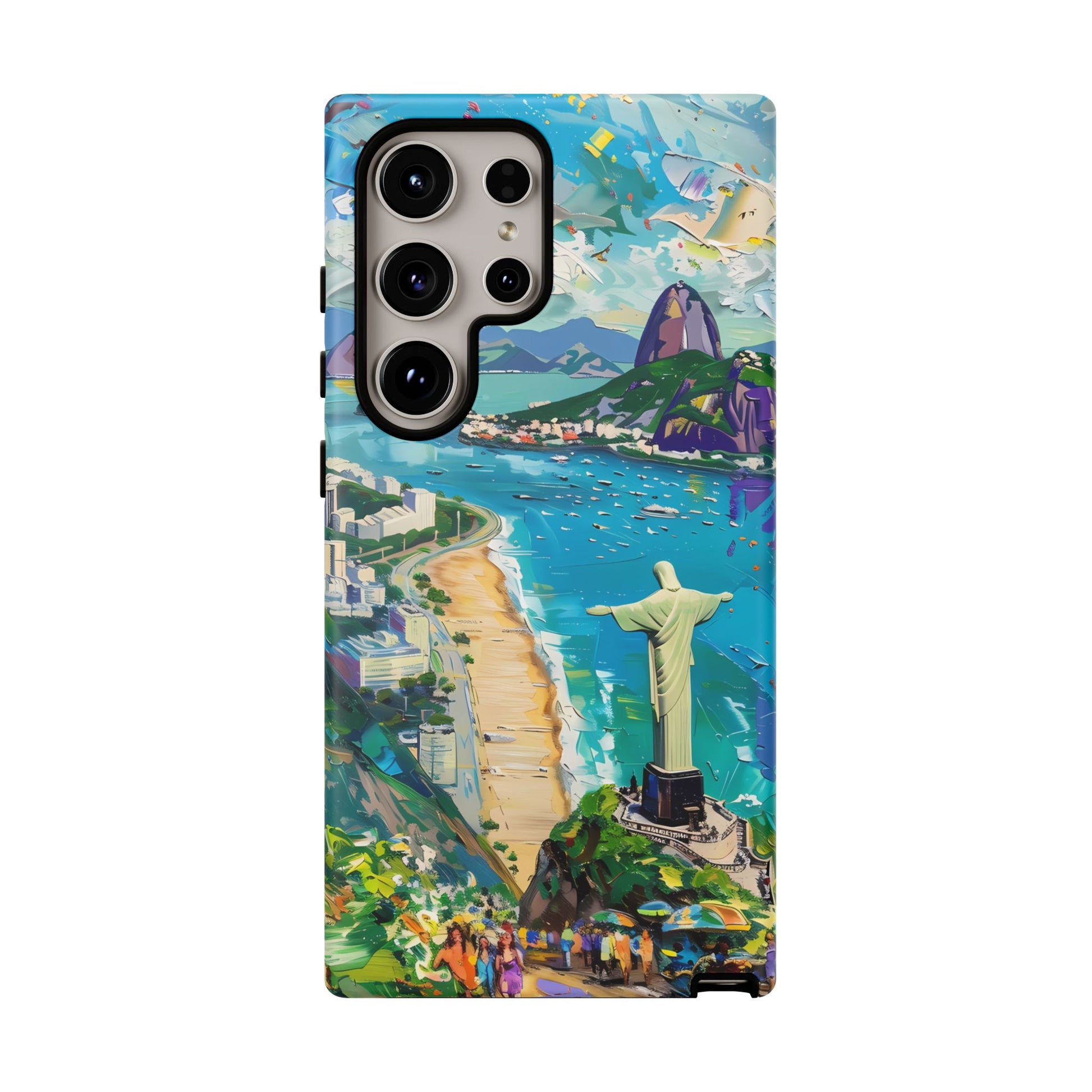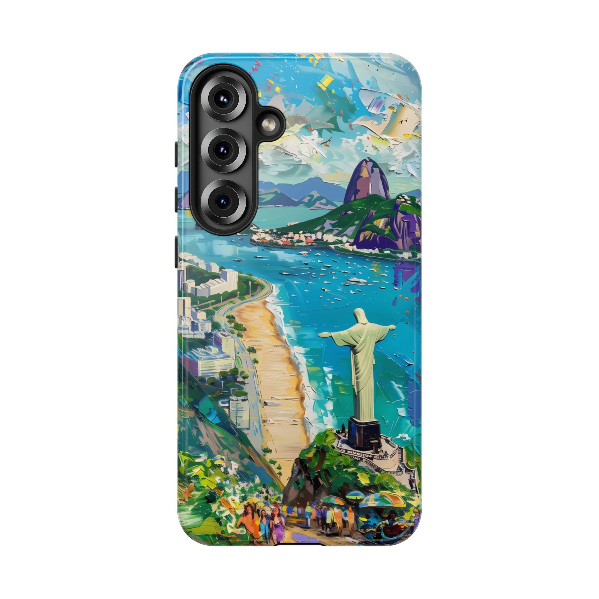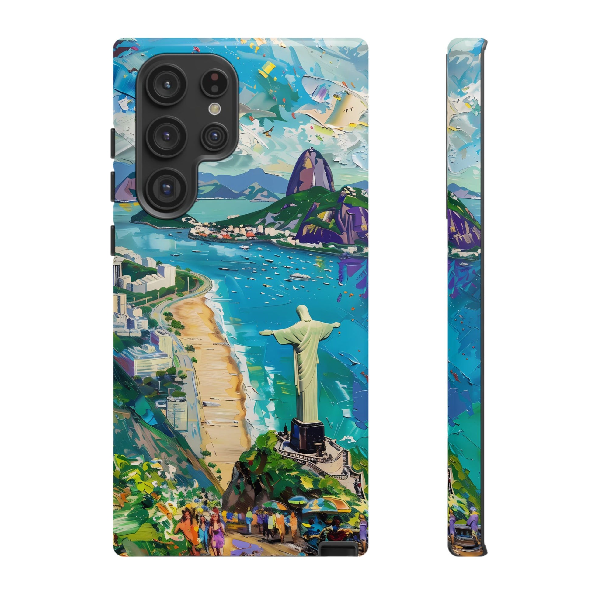 Step into the sun-drenched world of Rio de Janeiro with the "Copacabana Dreams" phone cover. This cover showcases a beautiful oil painting of the Christ the Redeemer statue overlooking the bustling Copacabana Beach, with vibrant Carnival scenes adding a splash of color and joy.