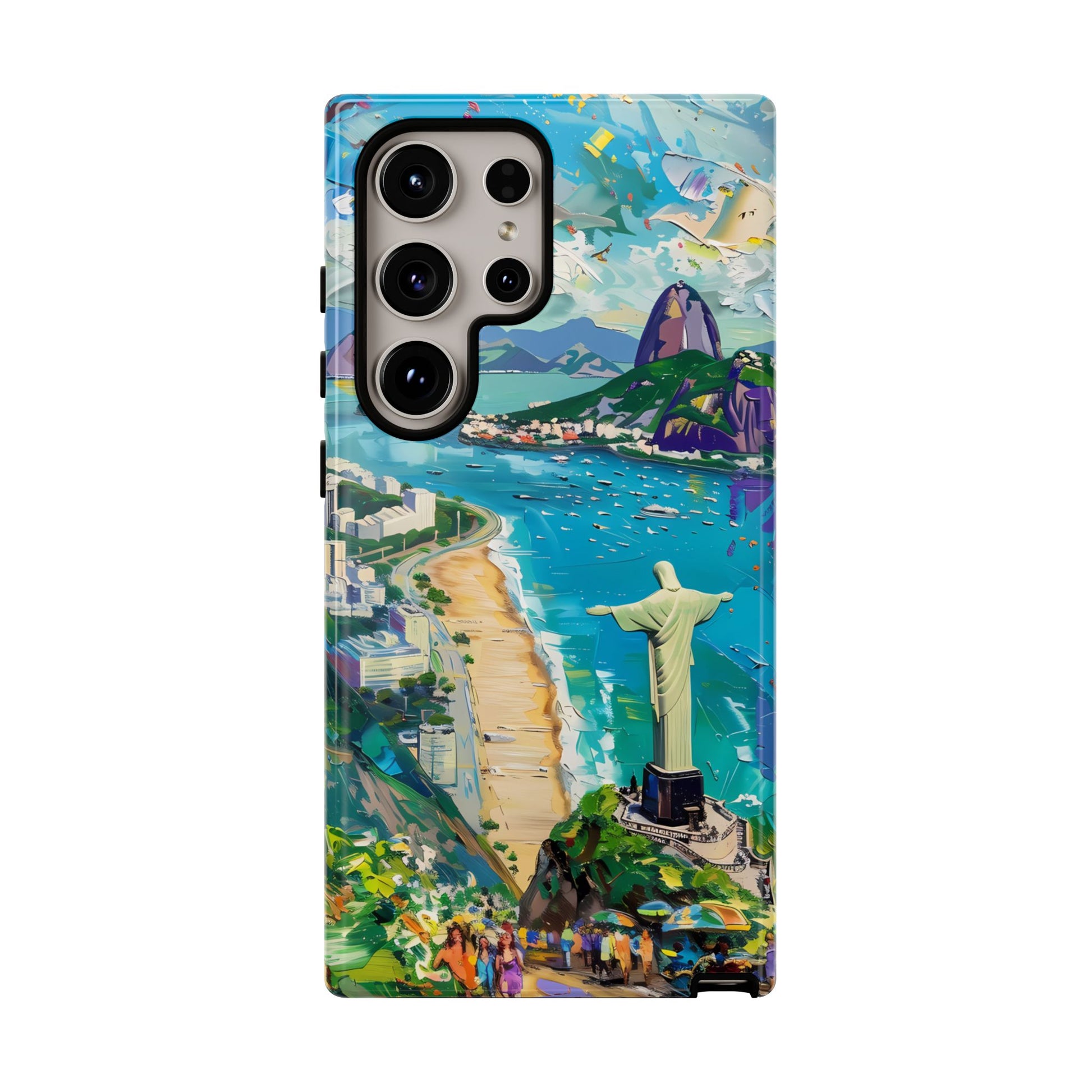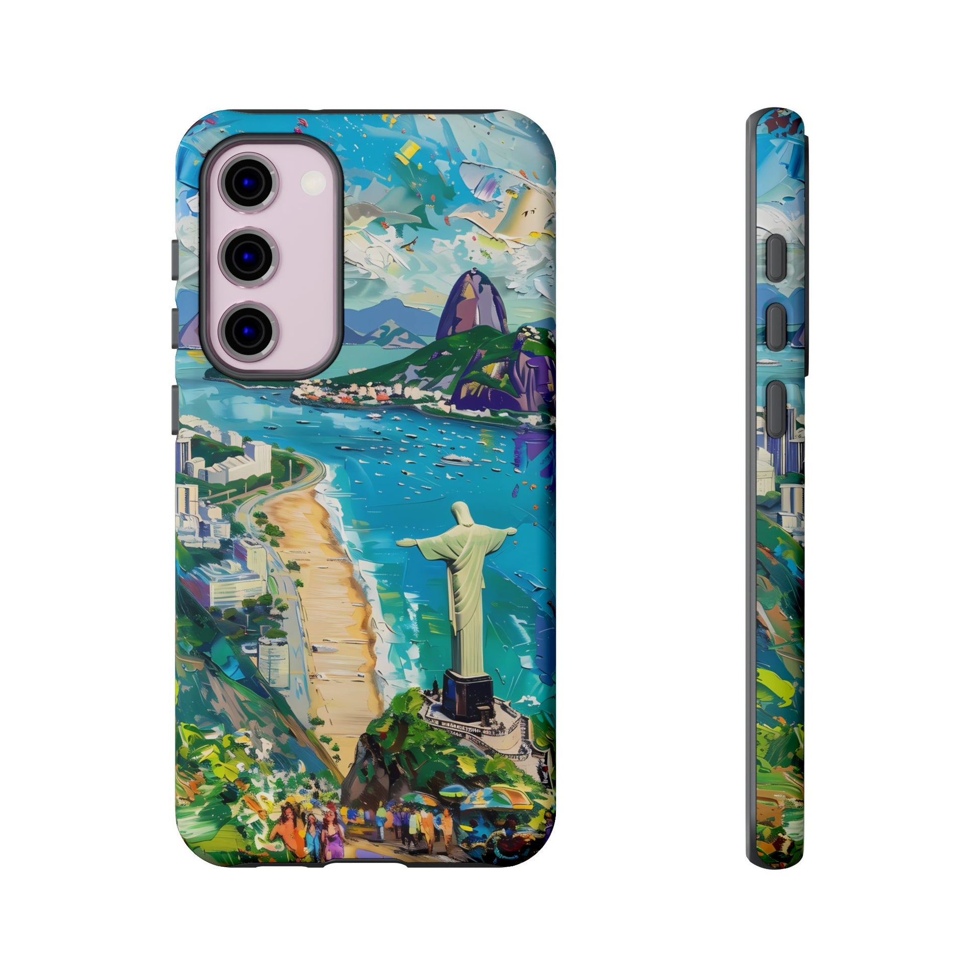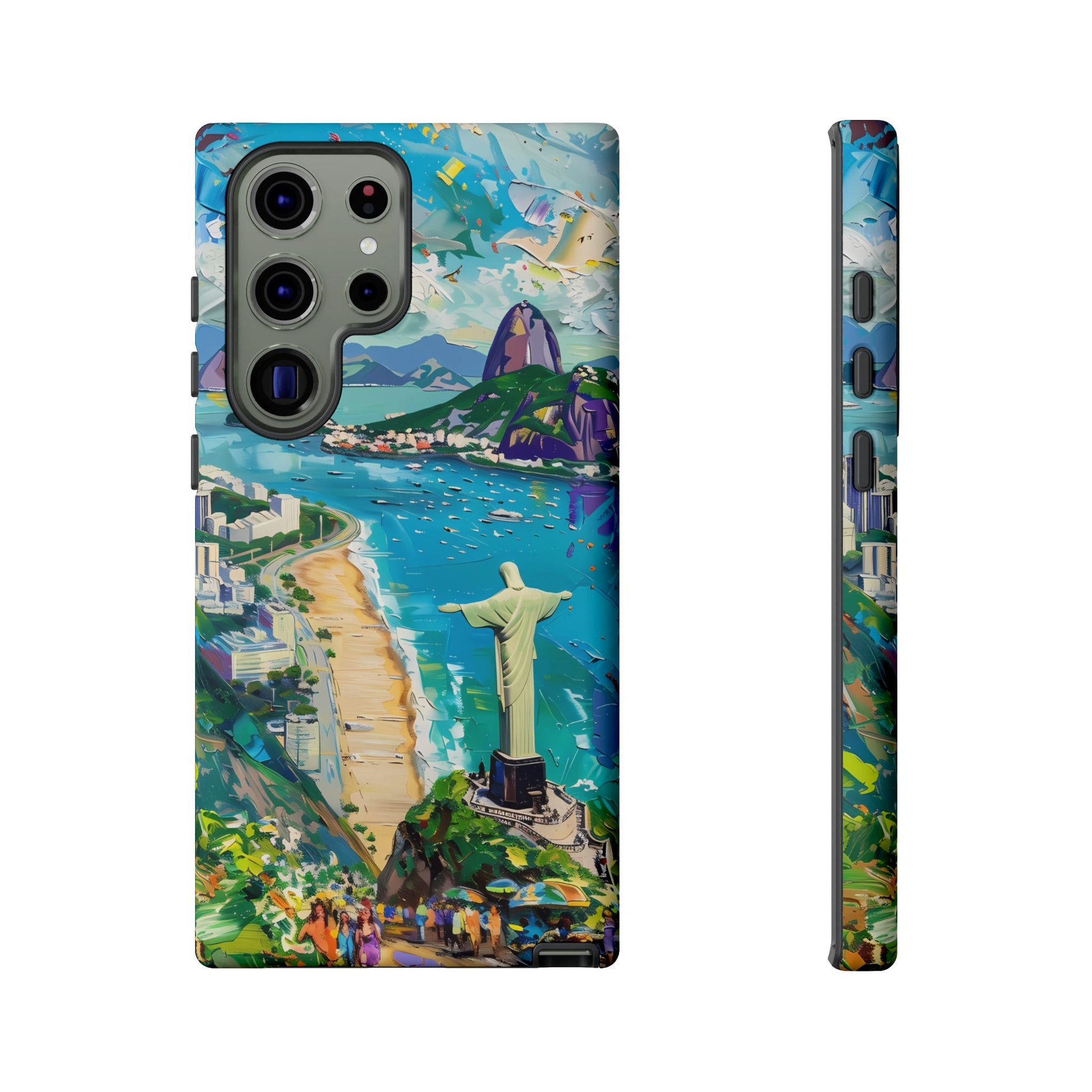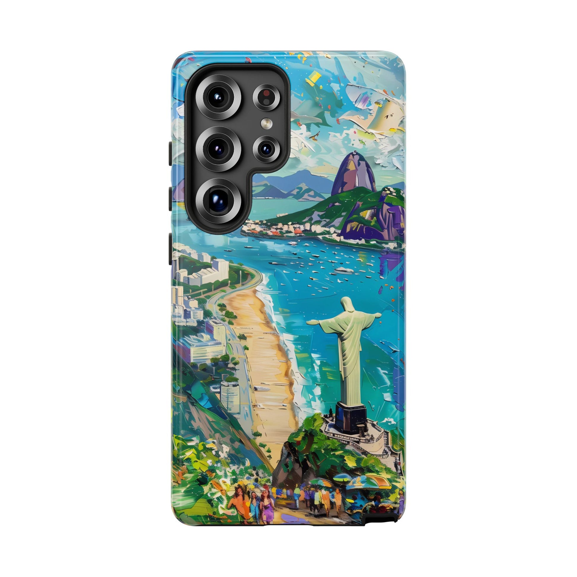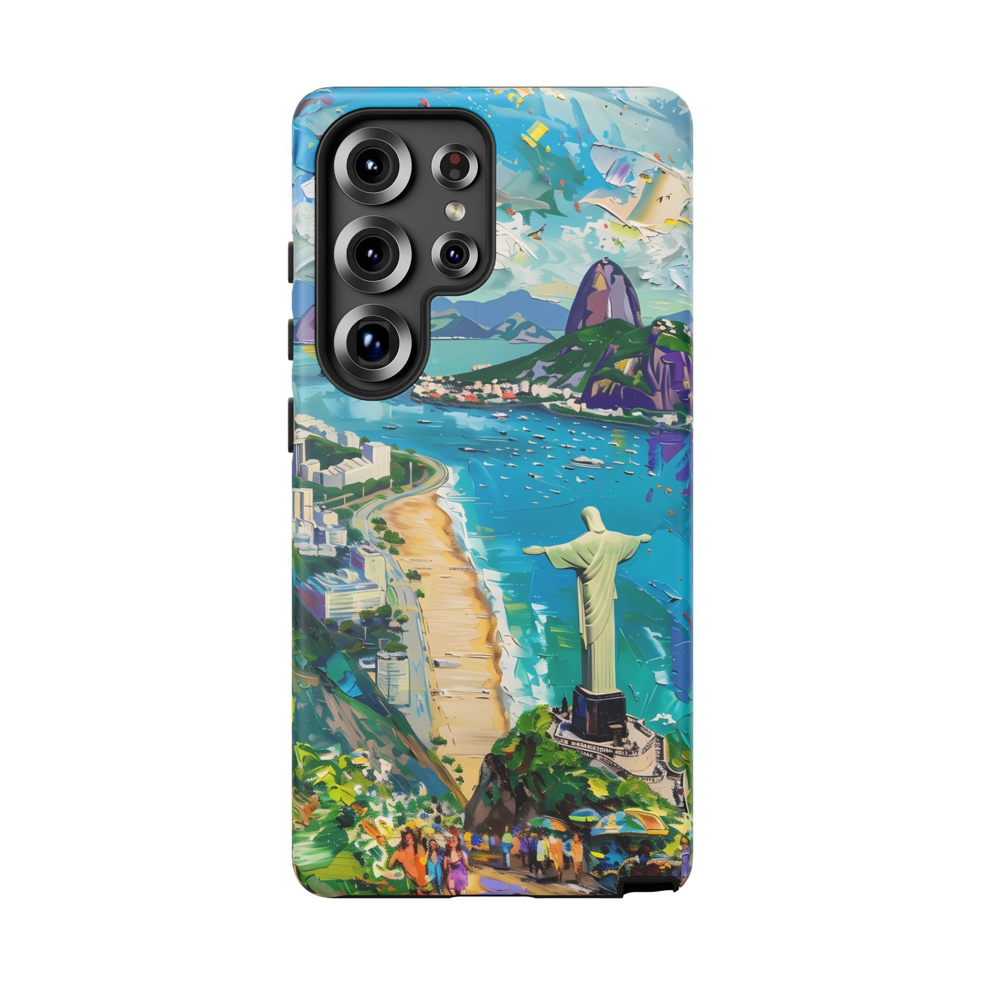 Step into the sun-drenched world of Rio de Janeiro with the "Copacabana Dreams" phone cover. This cover showcases a beautiful oil painting of the Christ the Redeemer statue overlooking the bustling Copacabana Beach, with vibrant Carnival scenes adding a splash of color and joy.