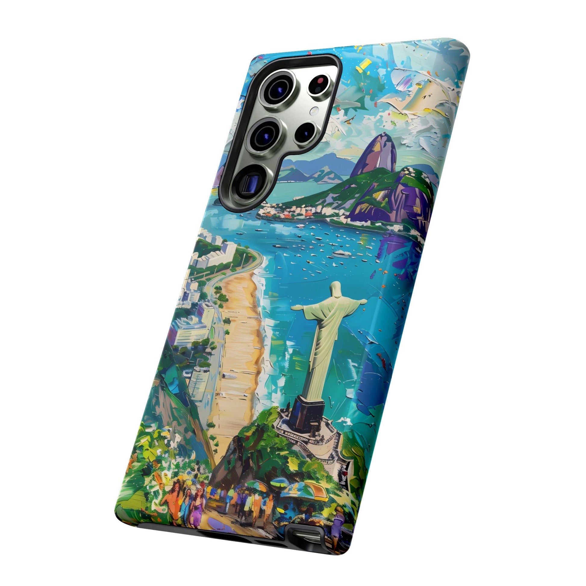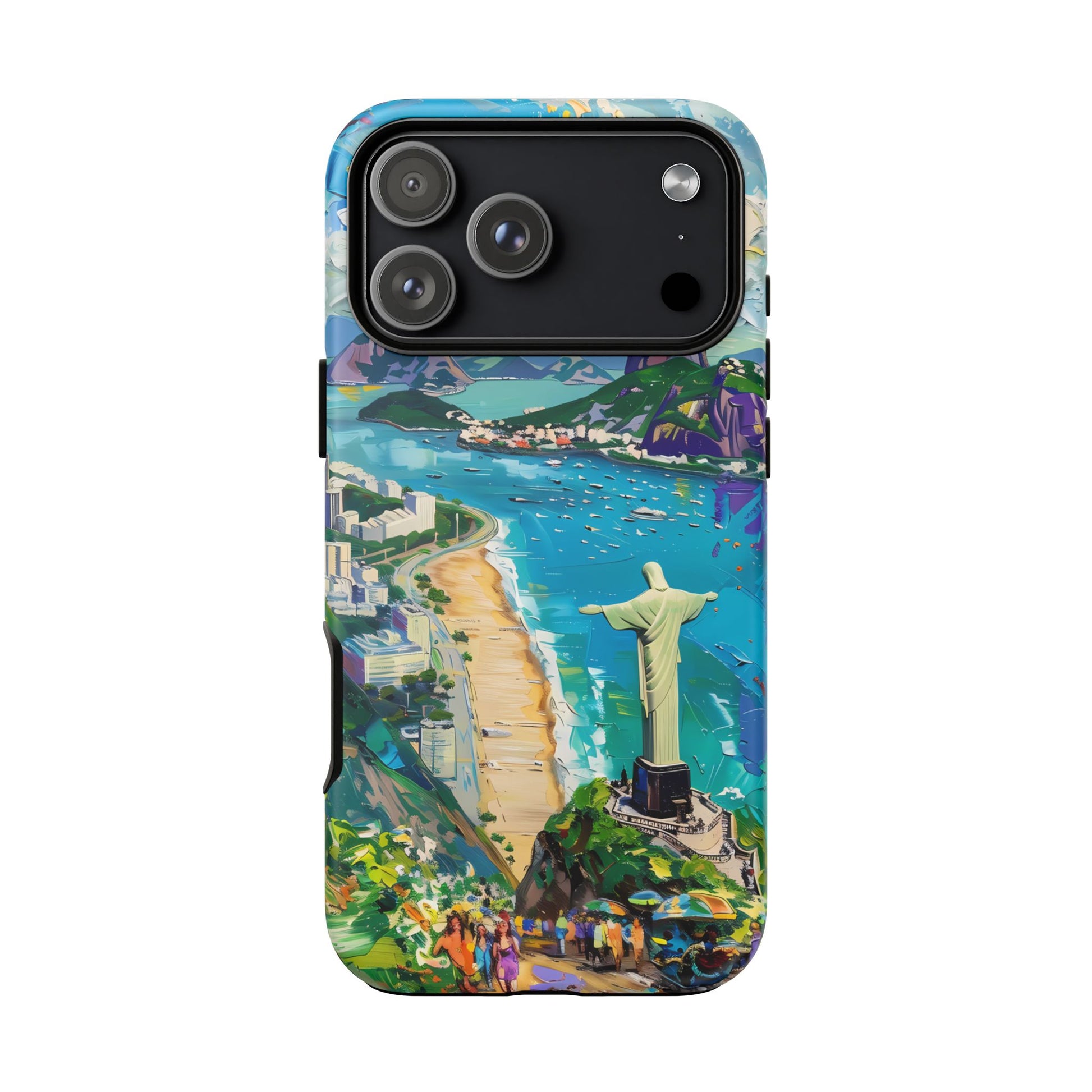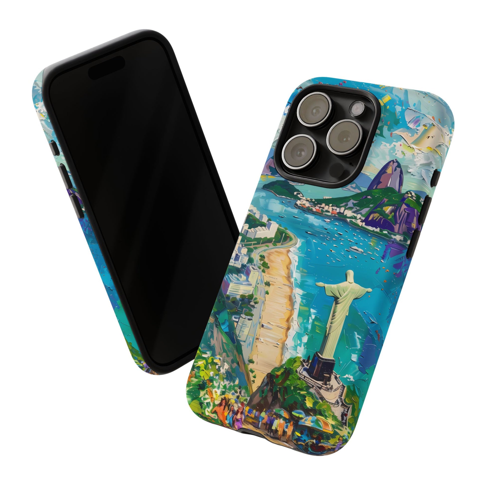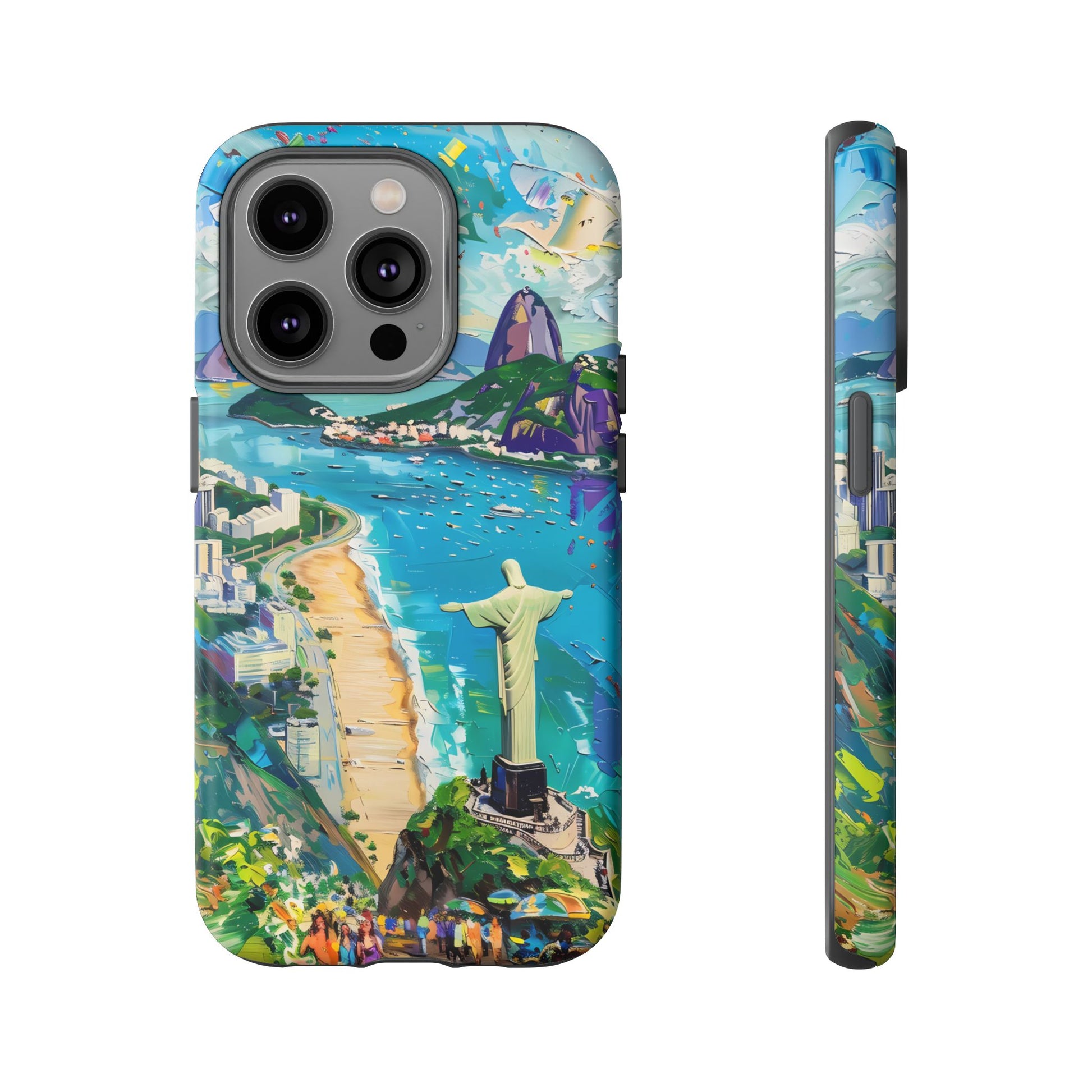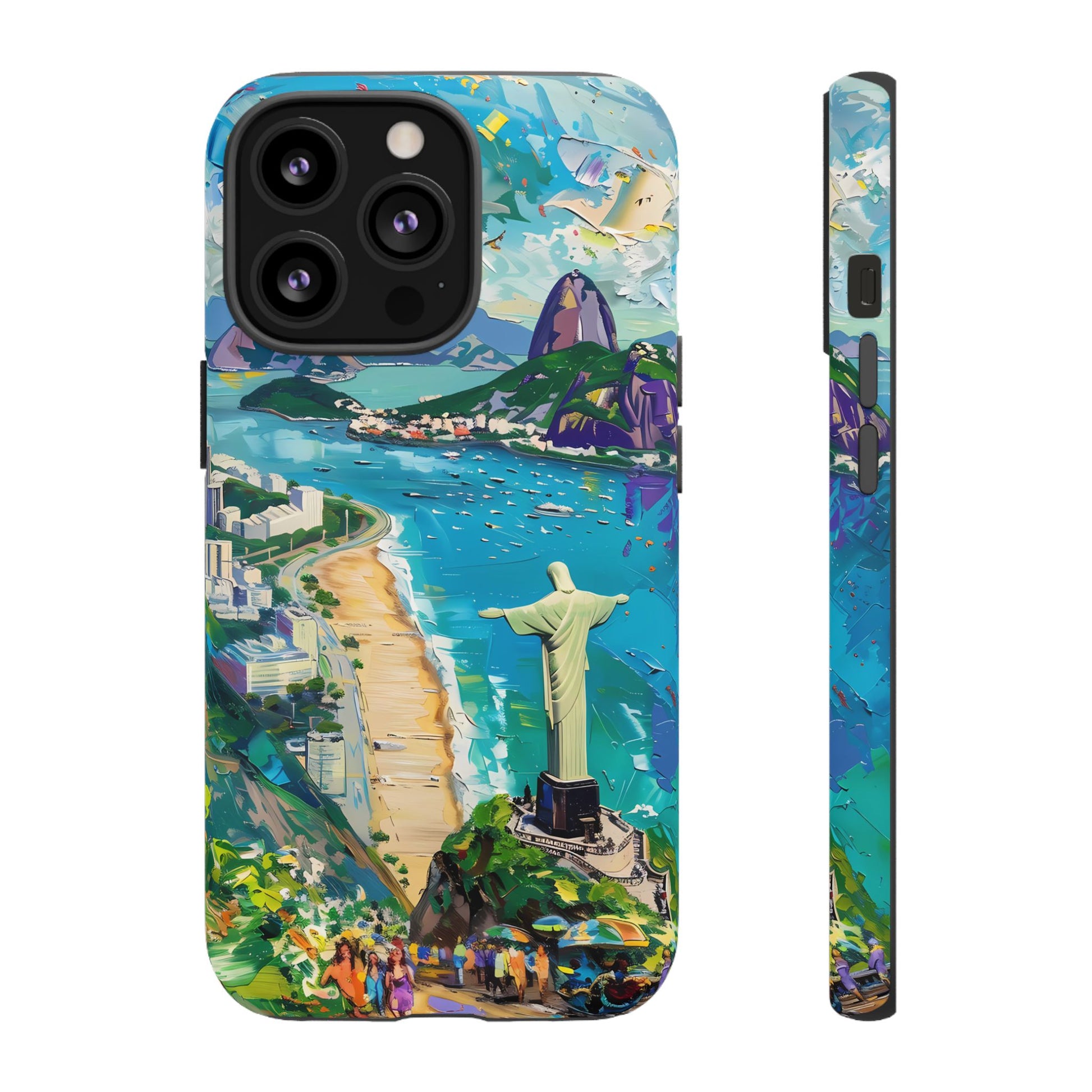 Step into the sun-drenched world of Rio de Janeiro with the "Copacabana Dreams" phone cover. This cover showcases a beautiful oil painting of the Christ the Redeemer statue overlooking the bustling Copacabana Beach, with vibrant Carnival scenes adding a splash of color and joy.