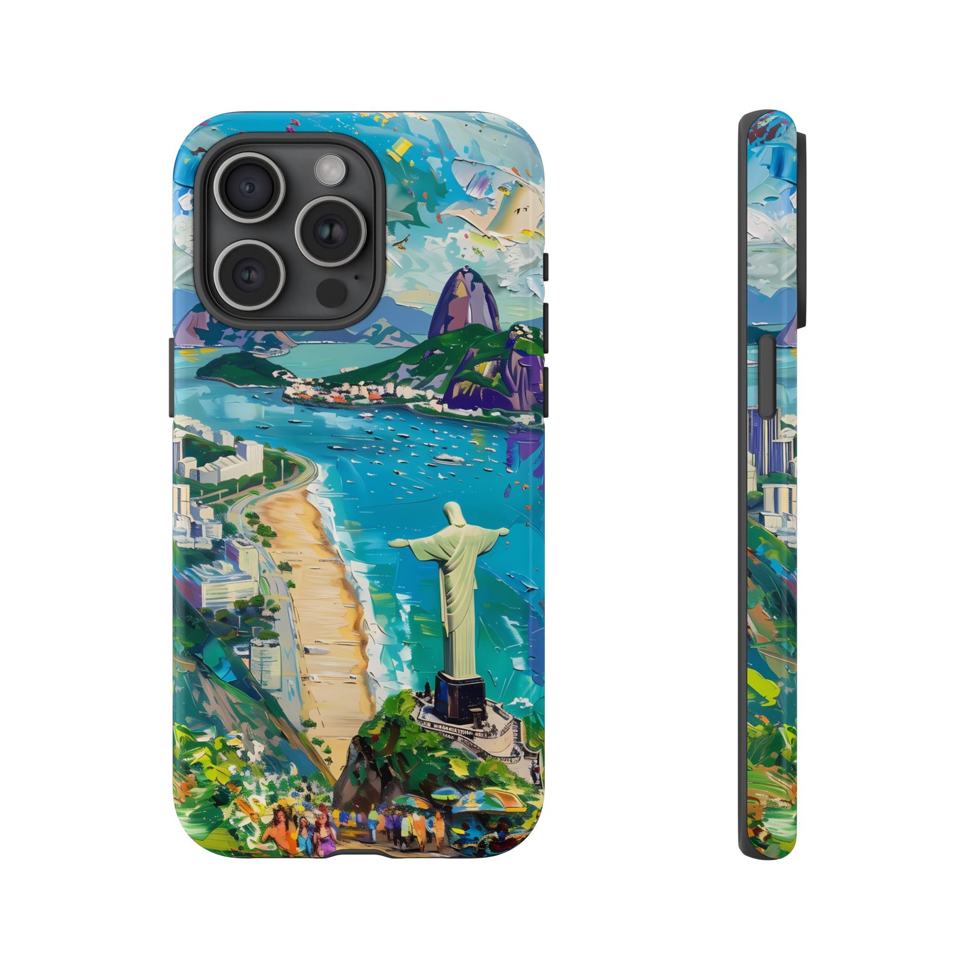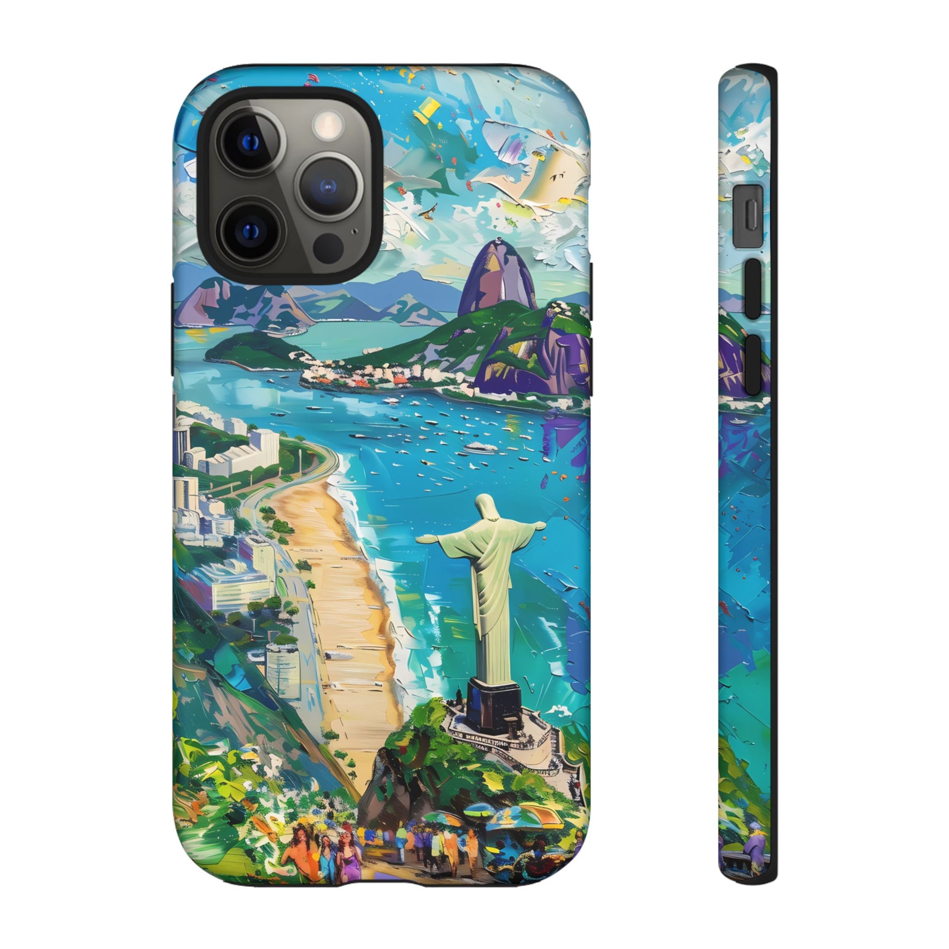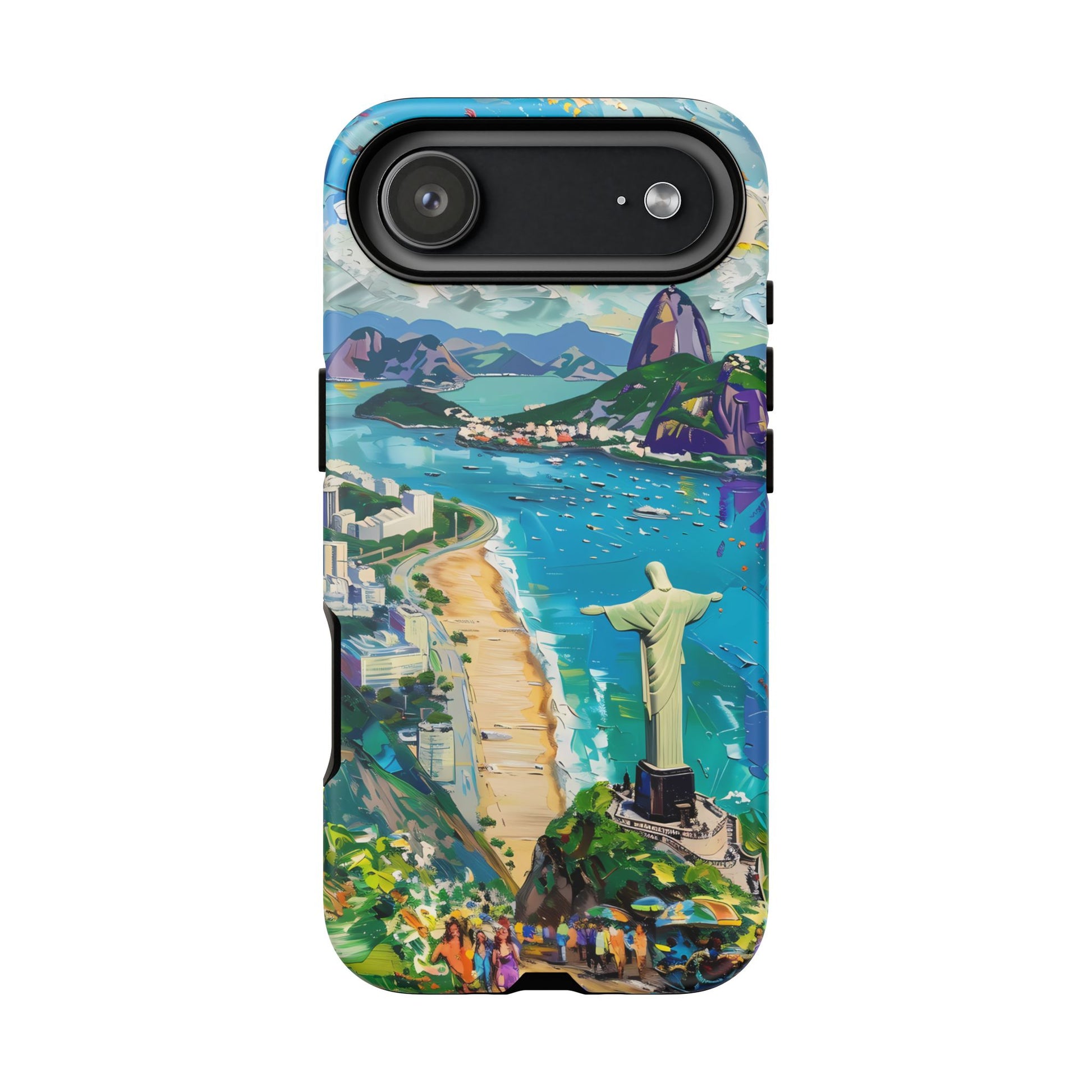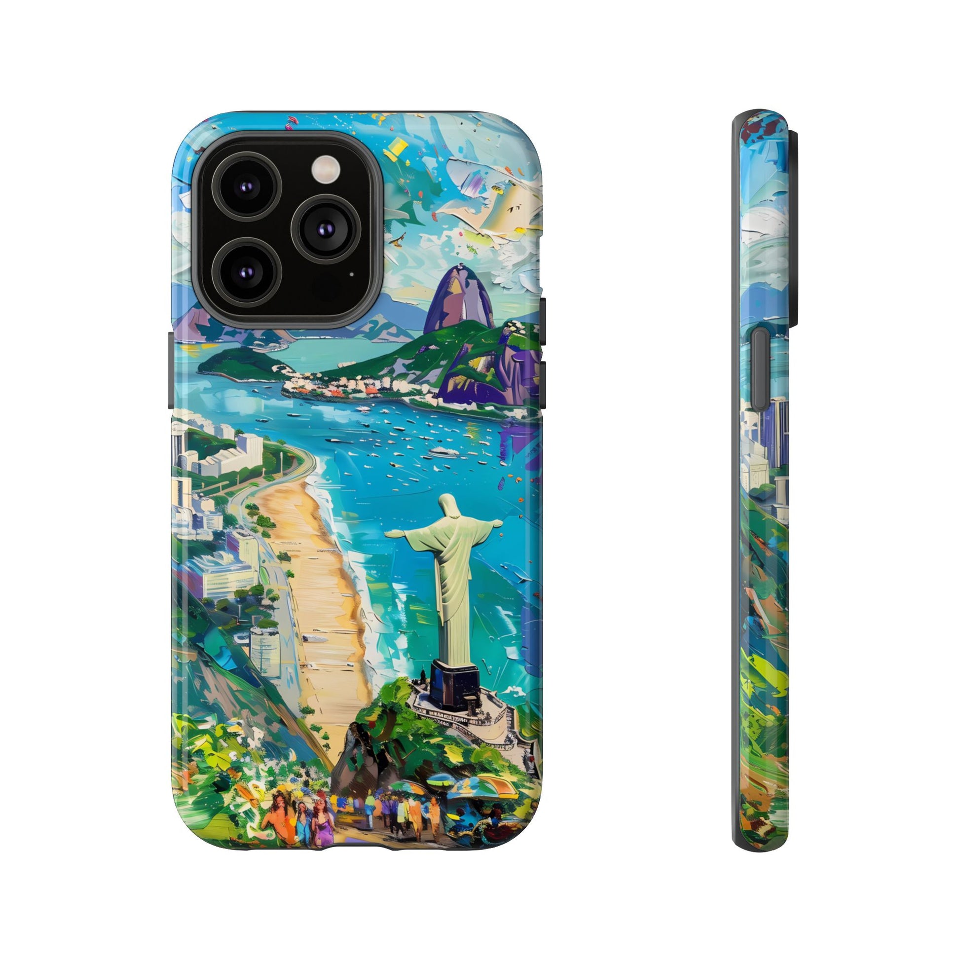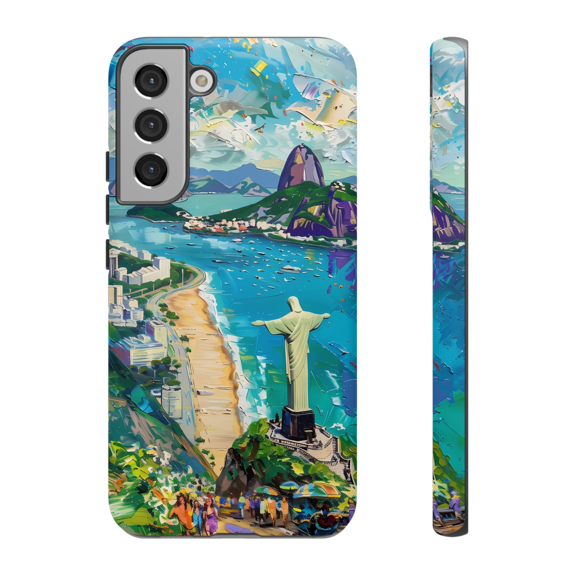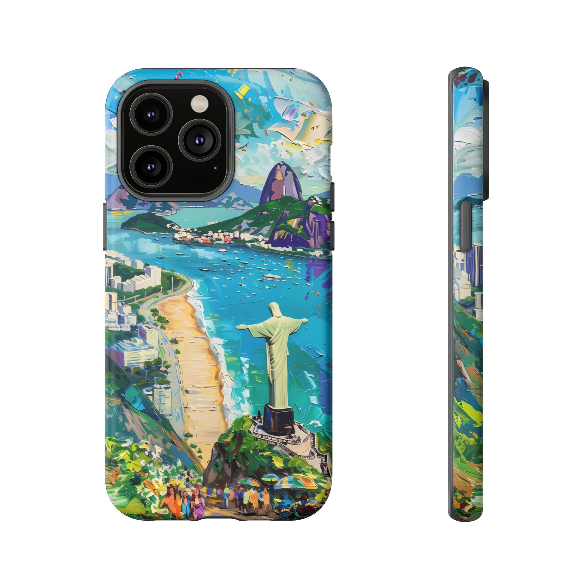 Step into the sun-drenched world of Rio de Janeiro with the "Copacabana Dreams" phone cover. This cover showcases a beautiful oil painting of the Christ the Redeemer statue overlooking the bustling Copacabana Beach, with vibrant Carnival scenes adding a splash of color and joy.