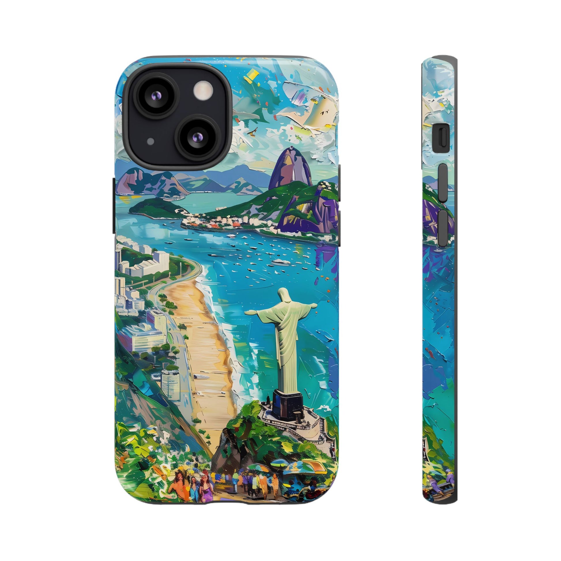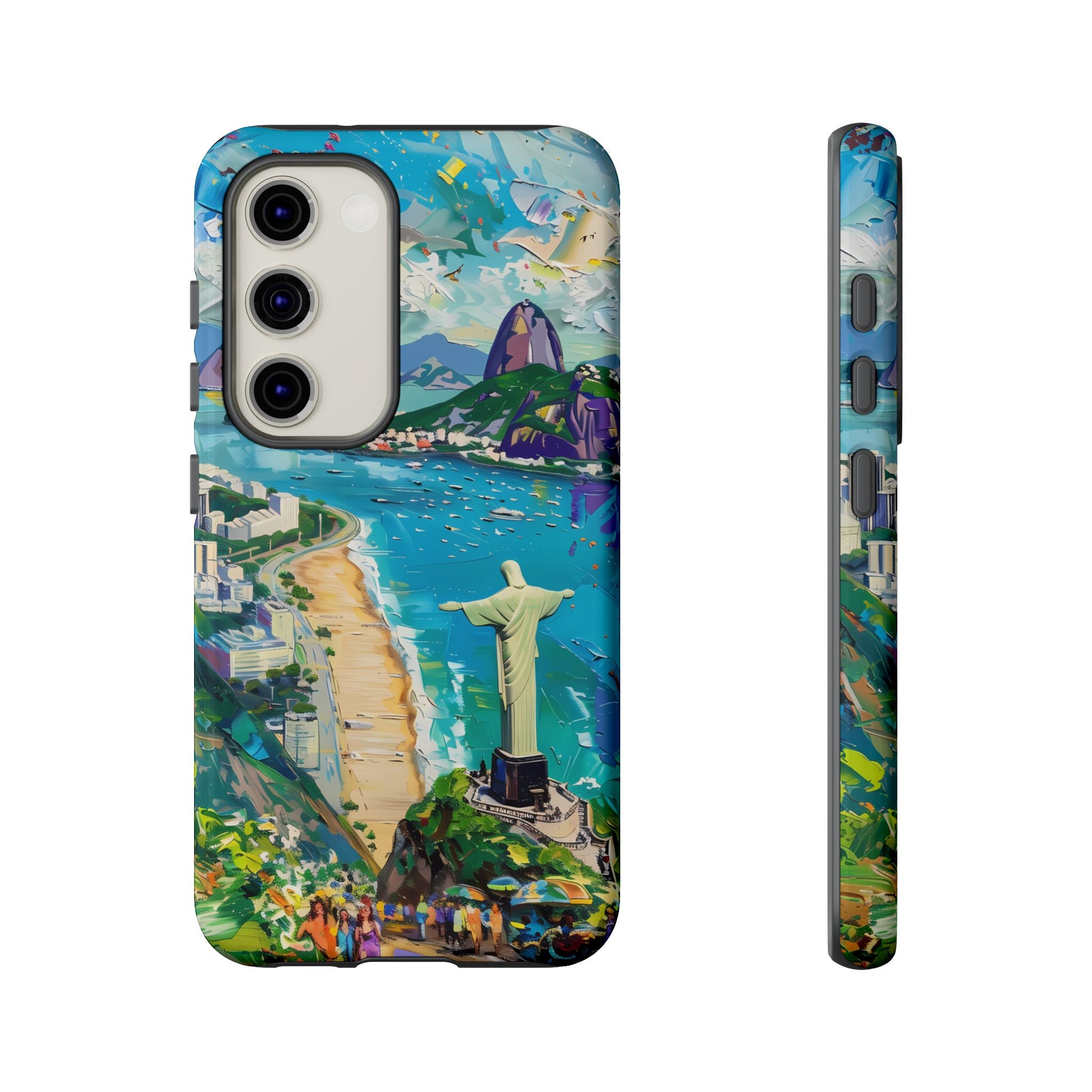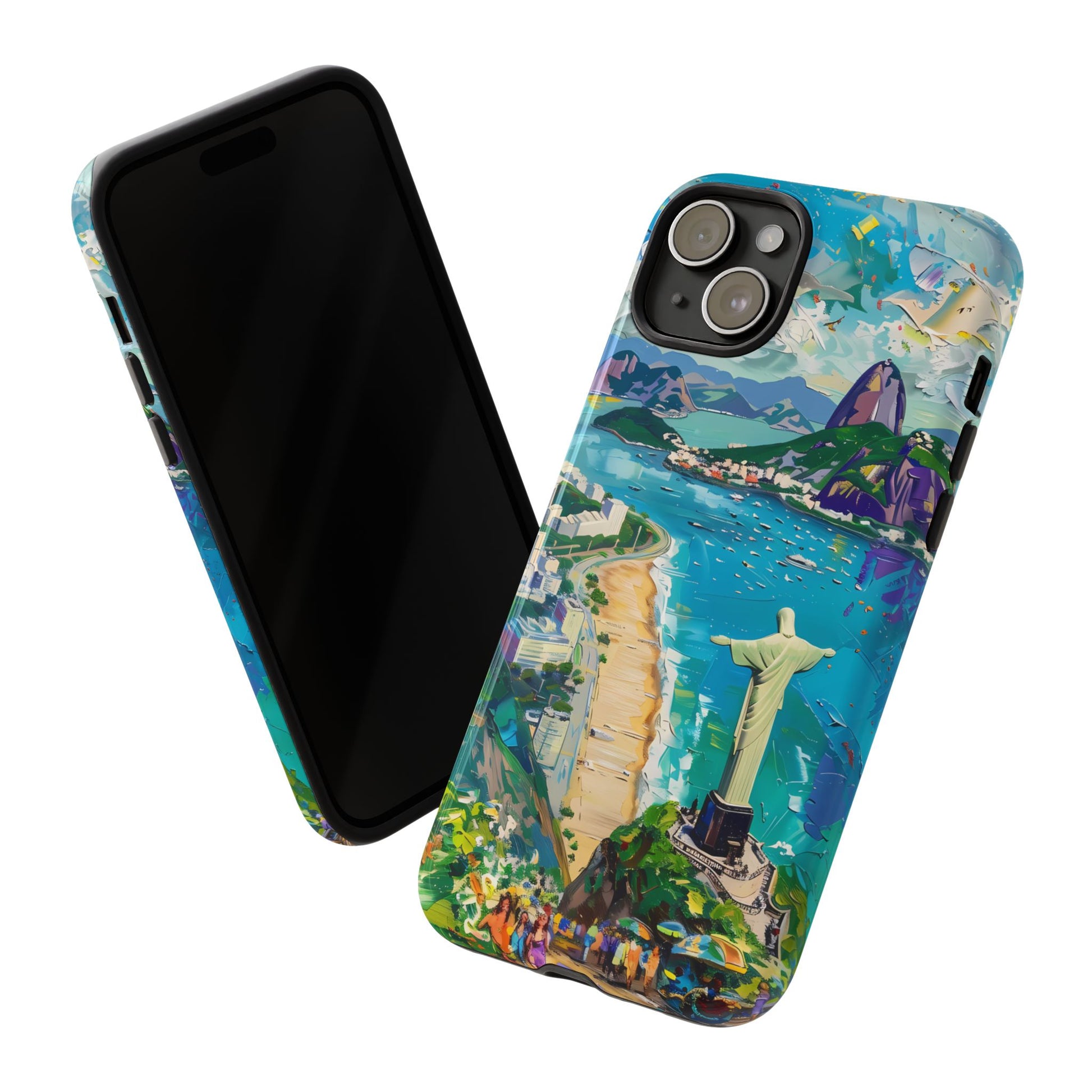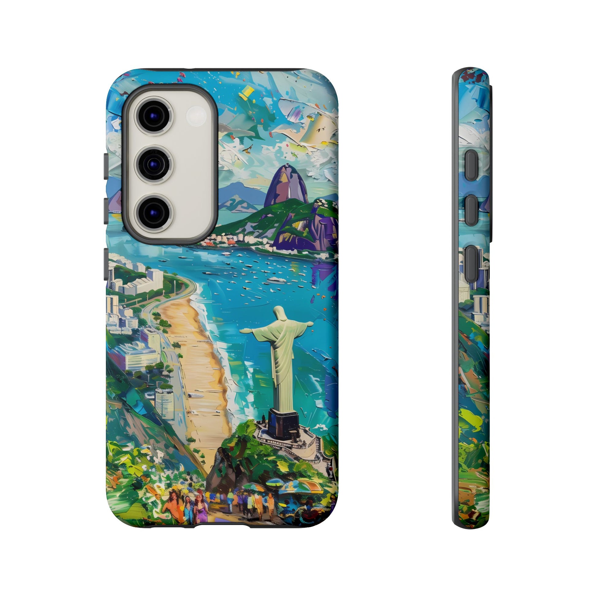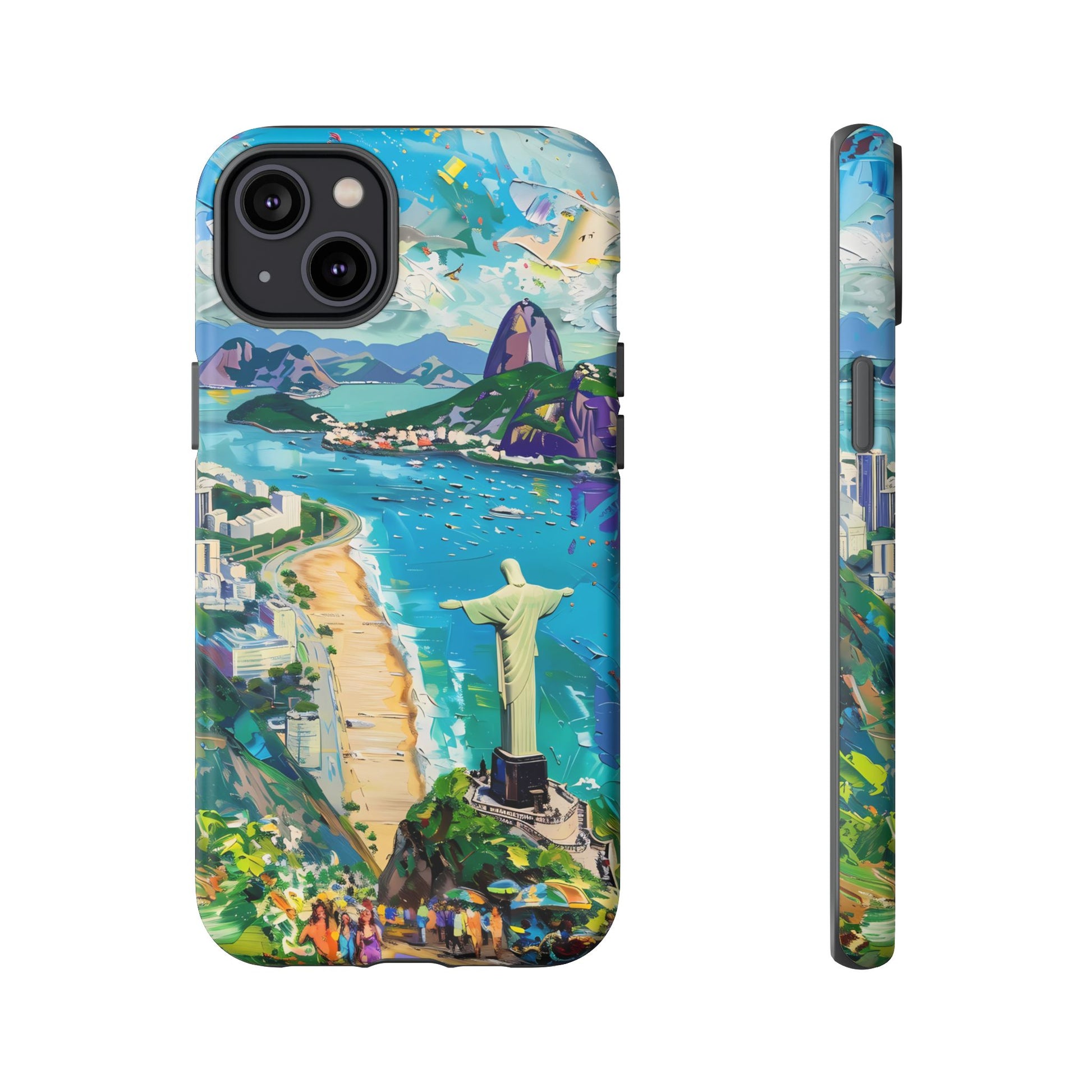 Step into the sun-drenched world of Rio de Janeiro with the "Copacabana Dreams" phone cover. This cover showcases a beautiful oil painting of the Christ the Redeemer statue overlooking the bustling Copacabana Beach, with vibrant Carnival scenes adding a splash of color and joy.