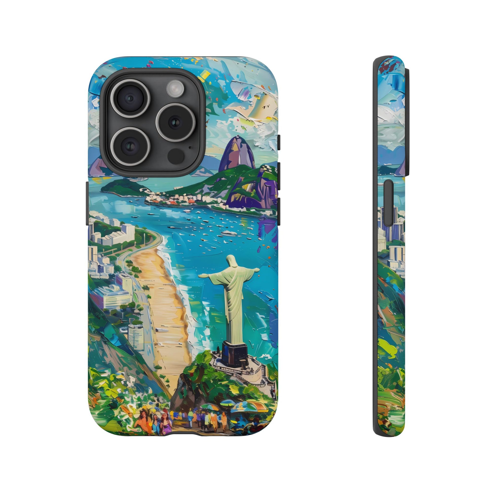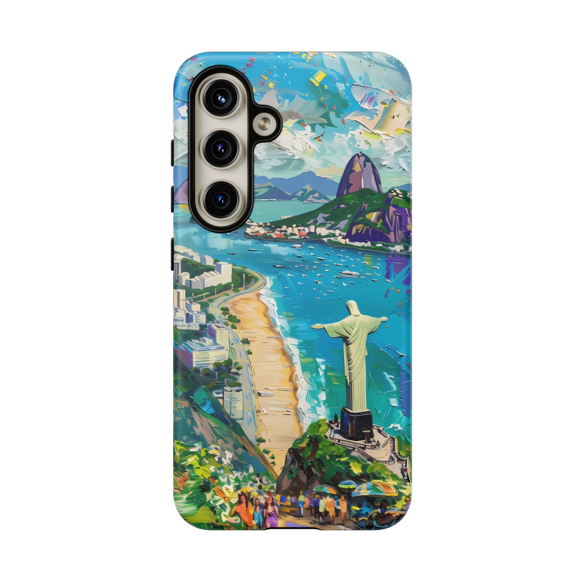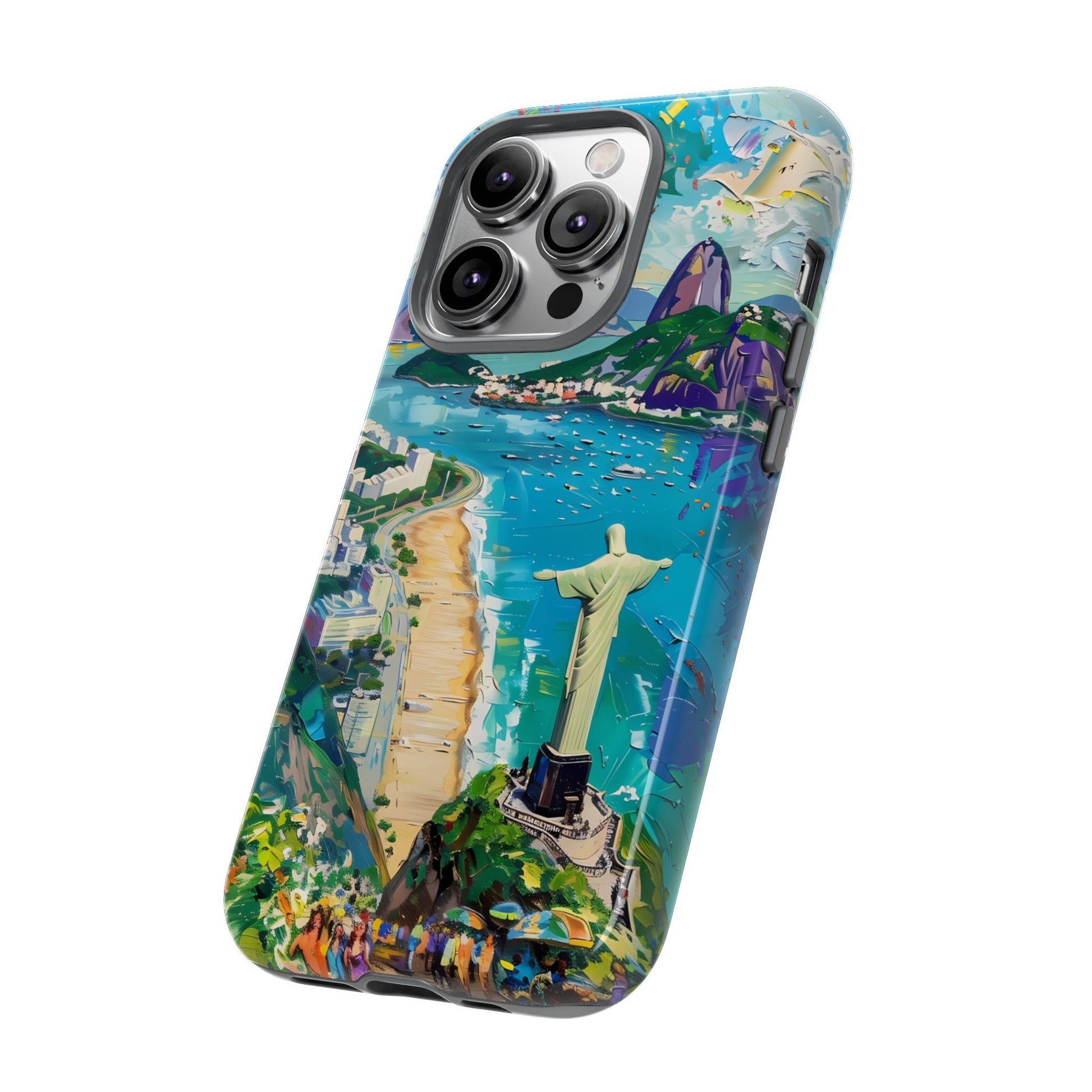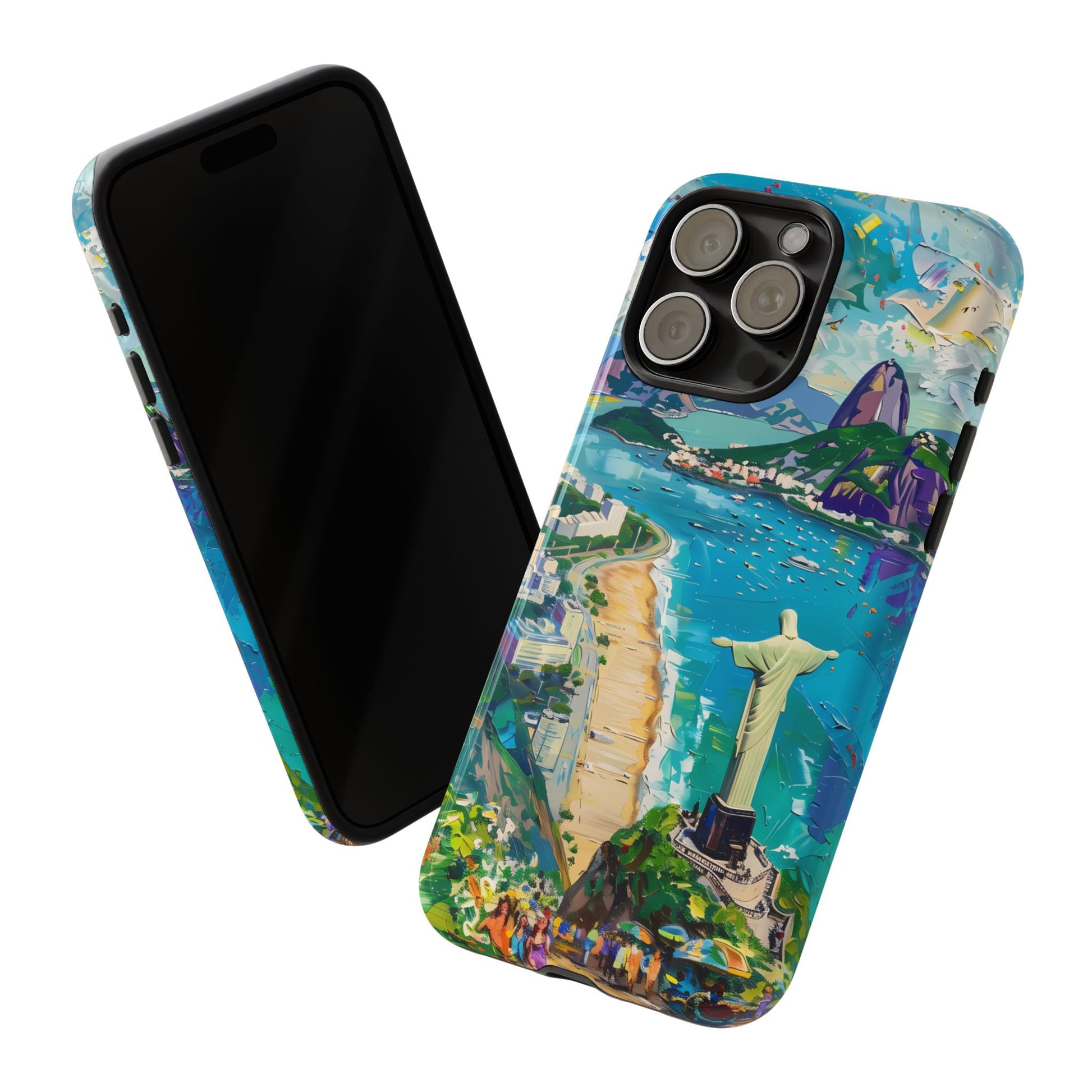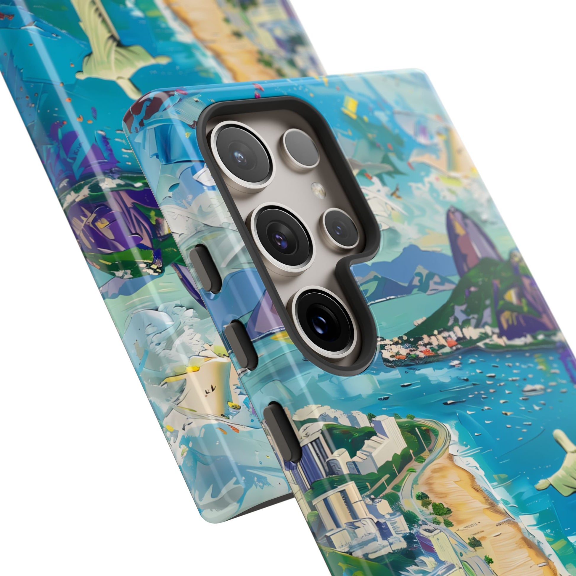 Step into the sun-drenched world of Rio de Janeiro with the "Copacabana Dreams" phone cover. This cover showcases a beautiful oil painting of the Christ the Redeemer statue overlooking the bustling Copacabana Beach, with vibrant Carnival scenes adding a splash of color and joy.