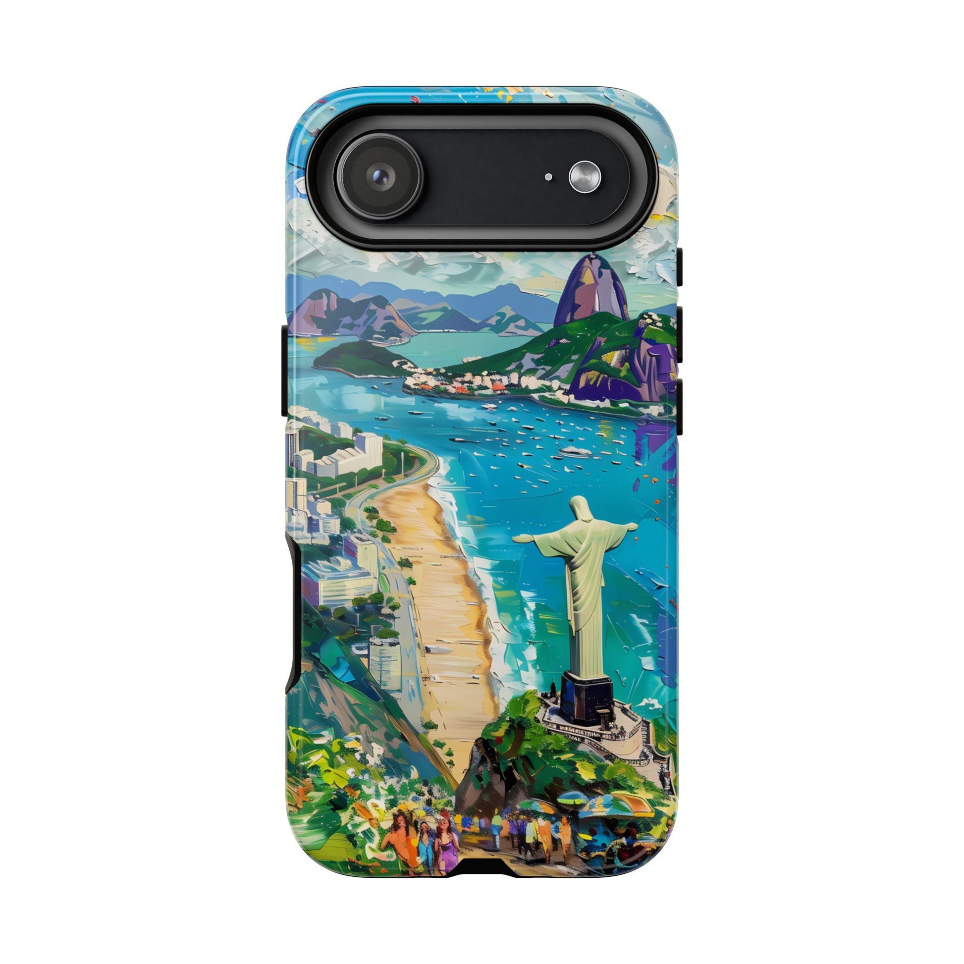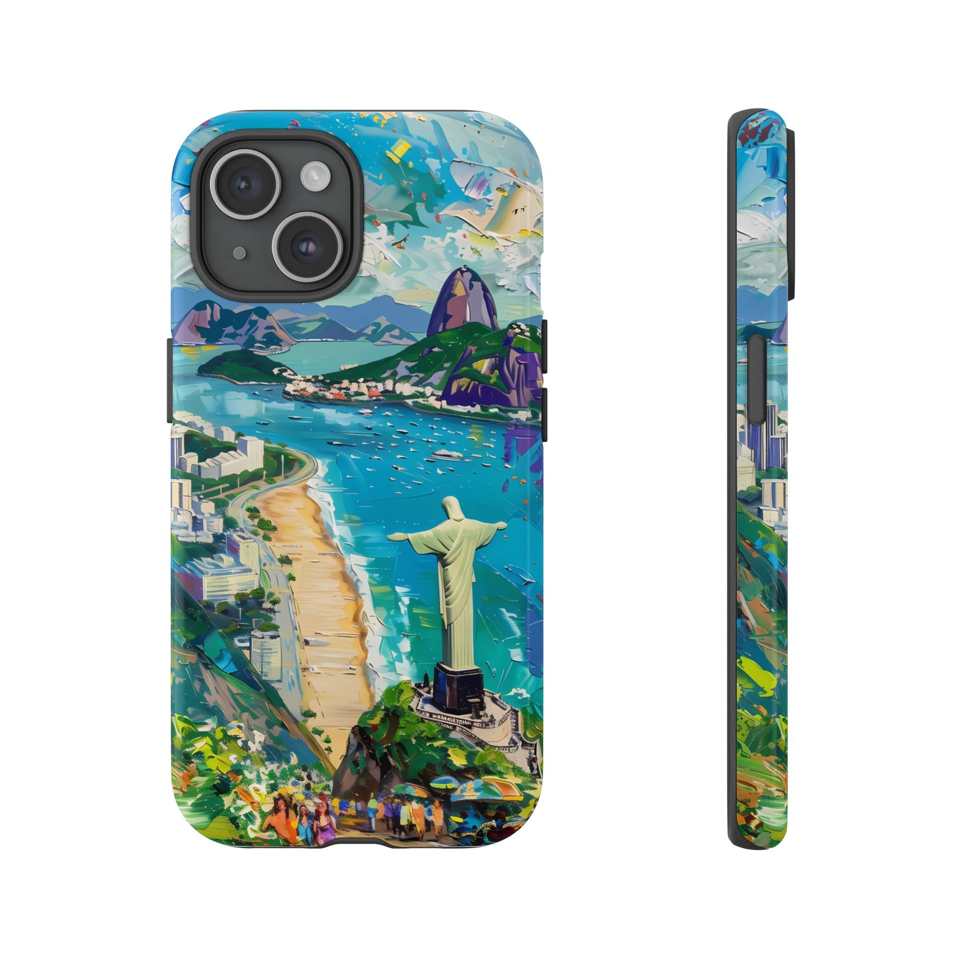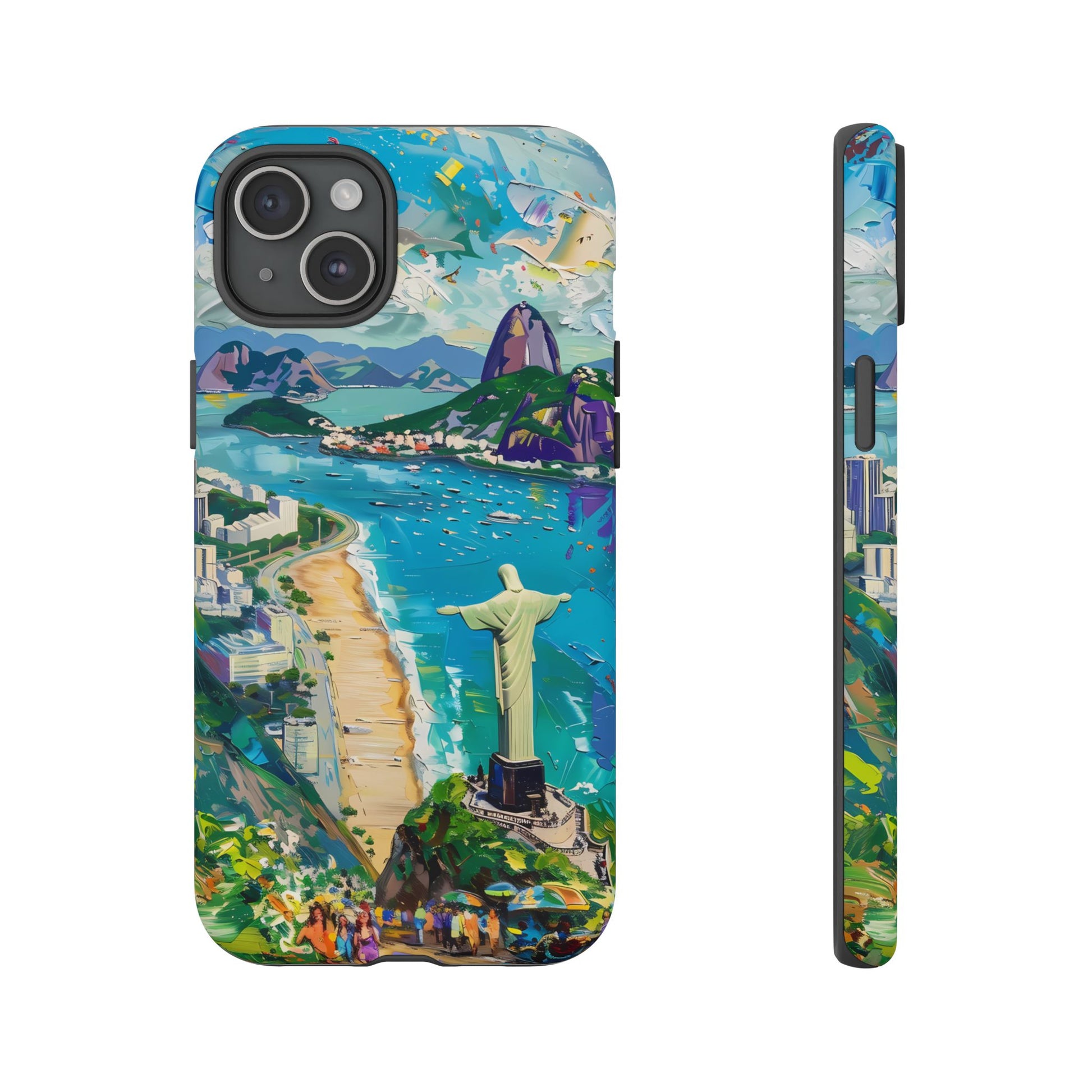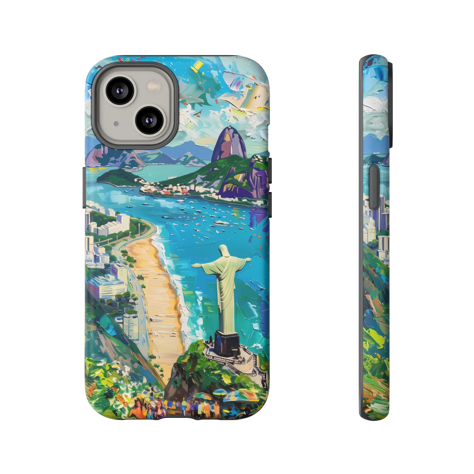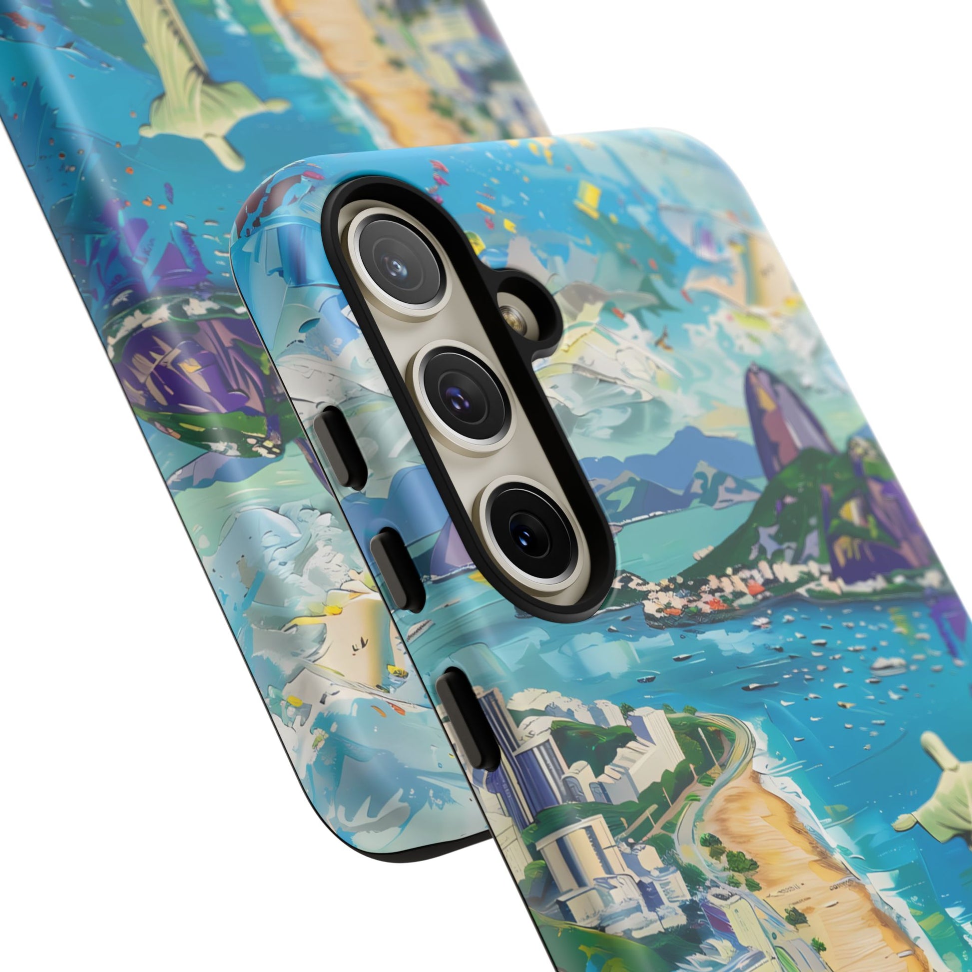 Step into the sun-drenched world of Rio de Janeiro with the "Copacabana Dreams" phone cover. This cover showcases a beautiful oil painting of the Christ the Redeemer statue overlooking the bustling Copacabana Beach, with vibrant Carnival scenes adding a splash of color and joy.
