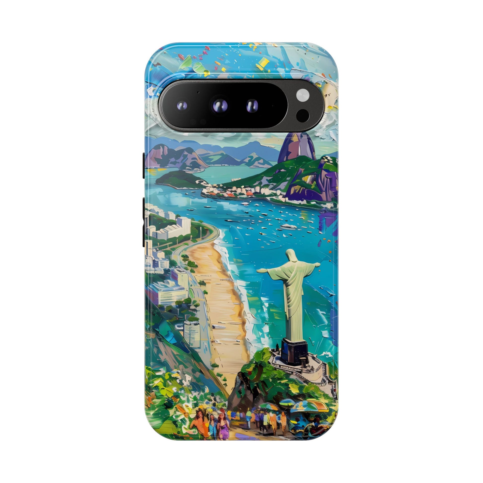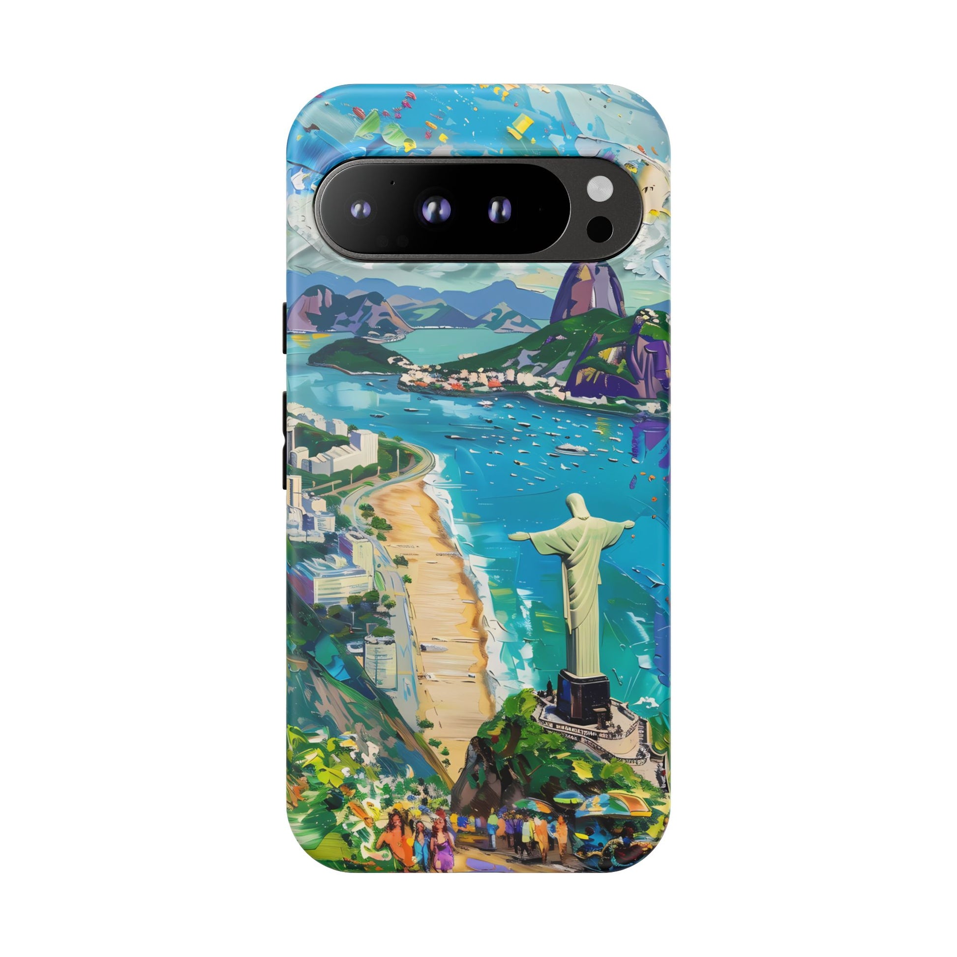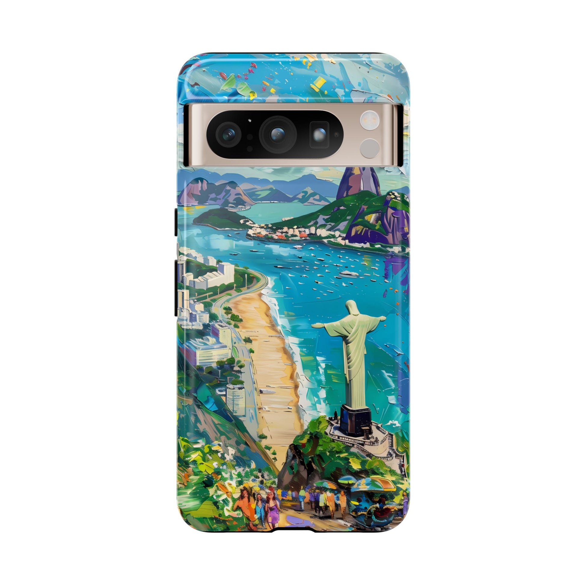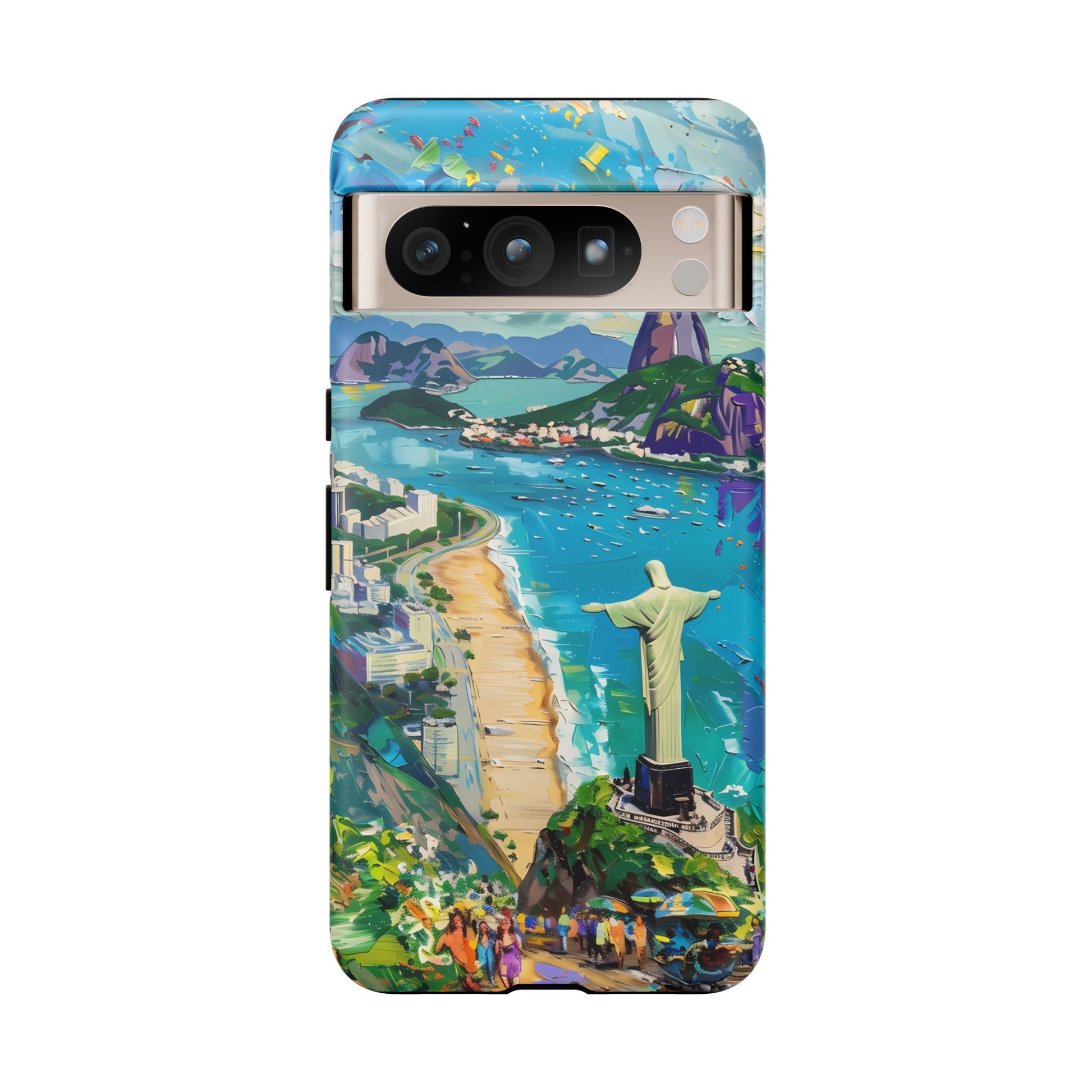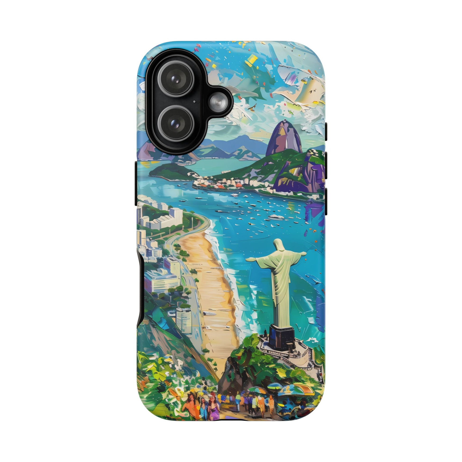 Step into the sun-drenched world of Rio de Janeiro with the "Copacabana Dreams" phone cover. This cover showcases a beautiful oil painting of the Christ the Redeemer statue overlooking the bustling Copacabana Beach, with vibrant Carnival scenes adding a splash of color and joy.