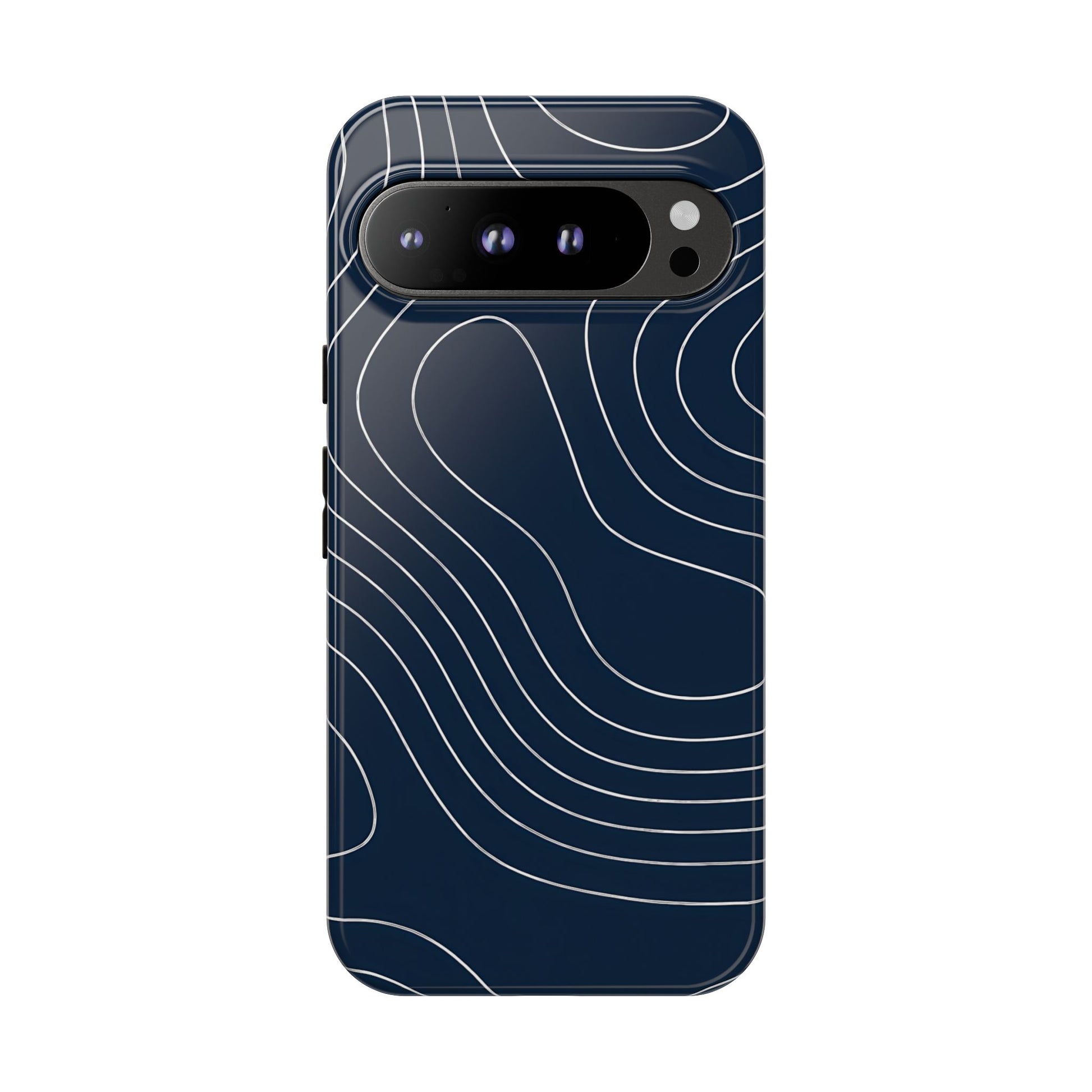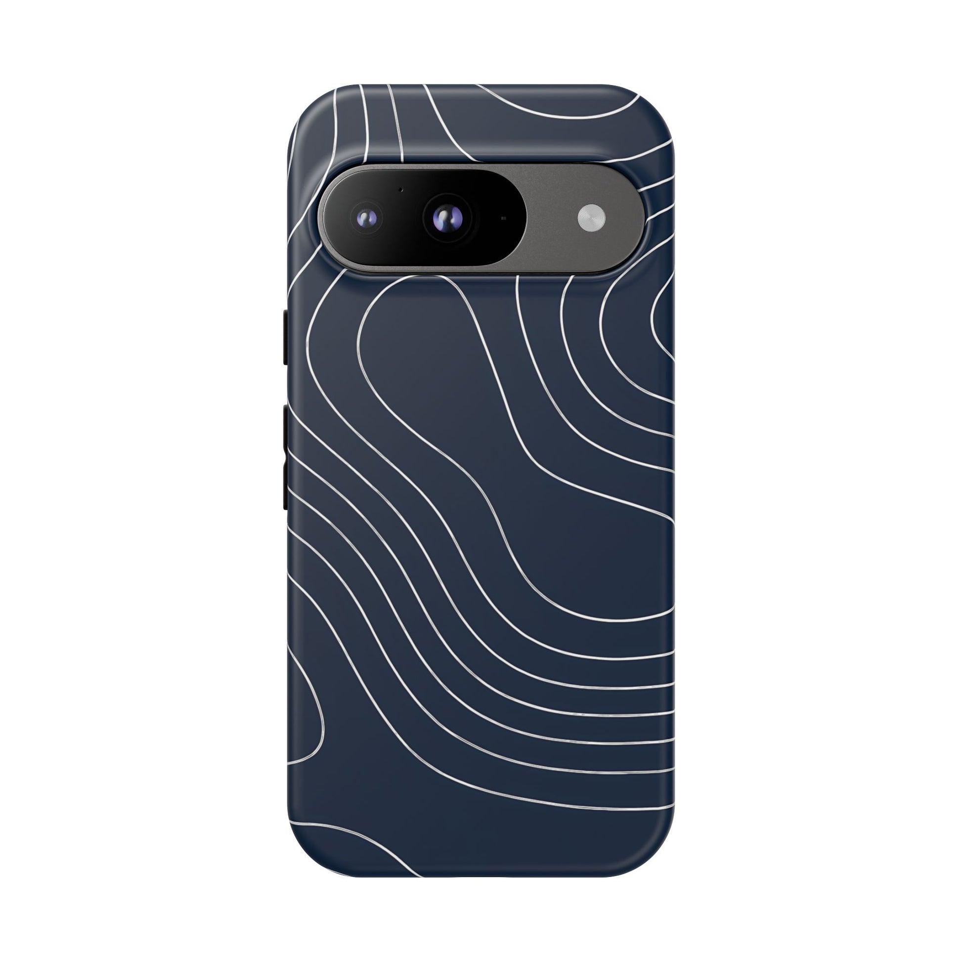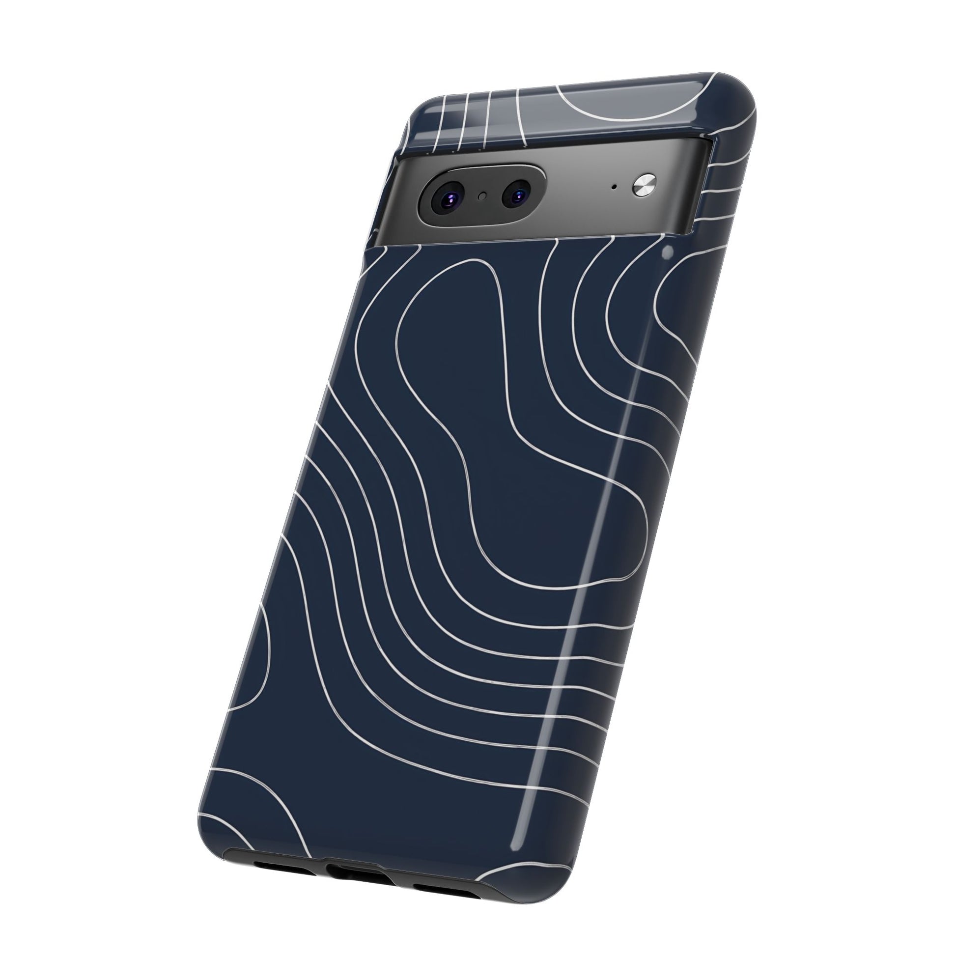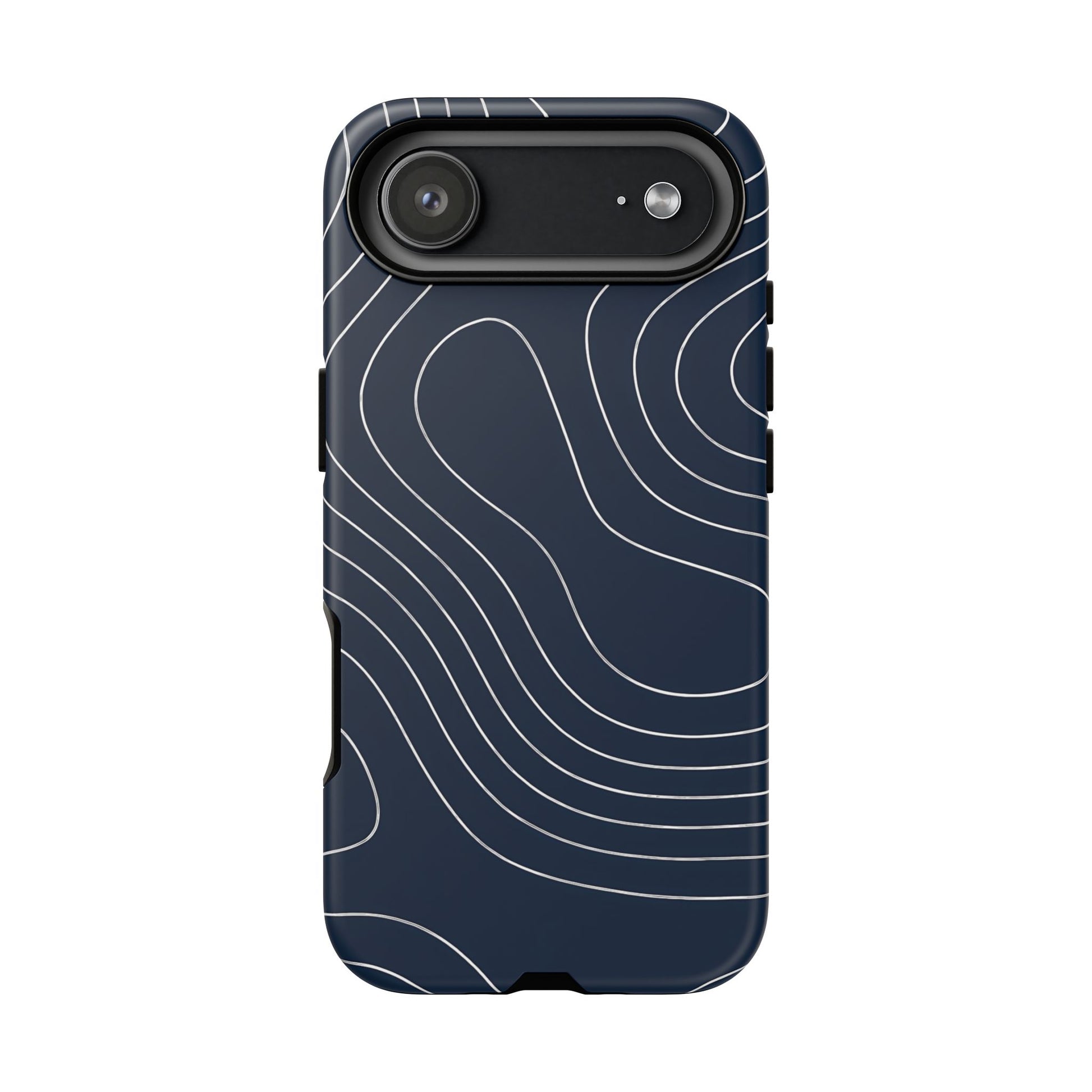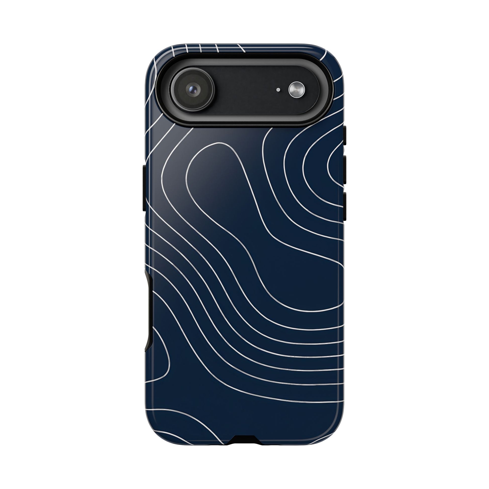 A clean, modern map-inspired pattern featuring seamless white elevation lines over a dark navy canvas, defined by high contrast and precise linework