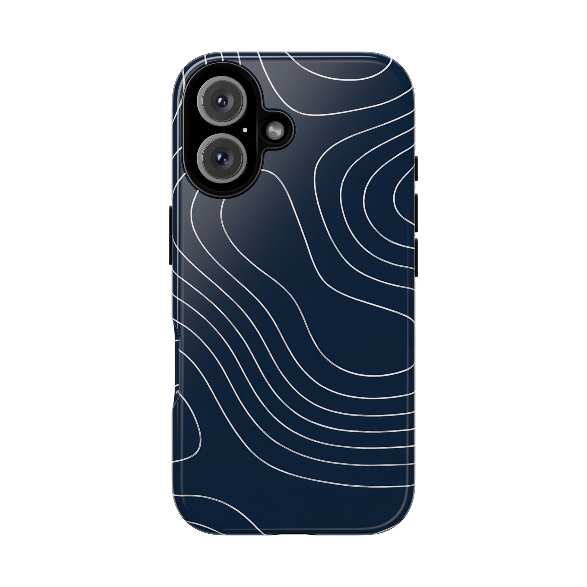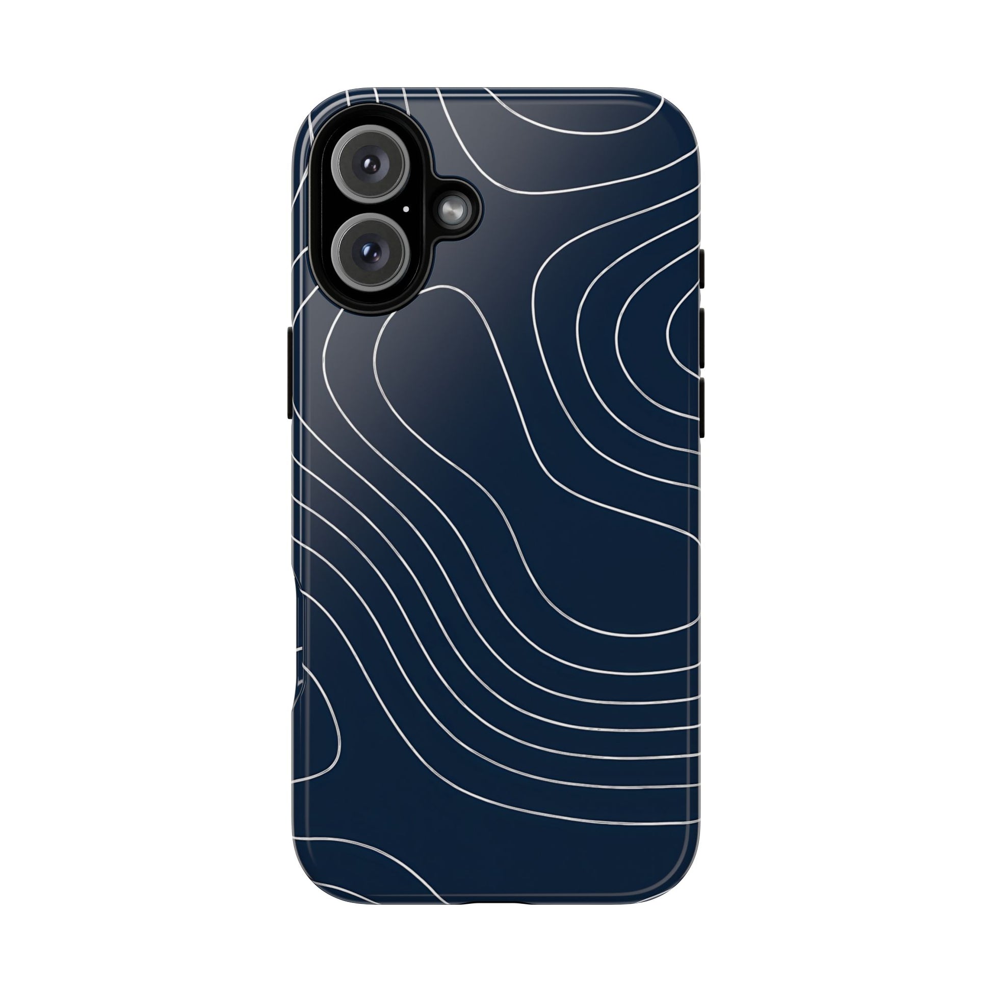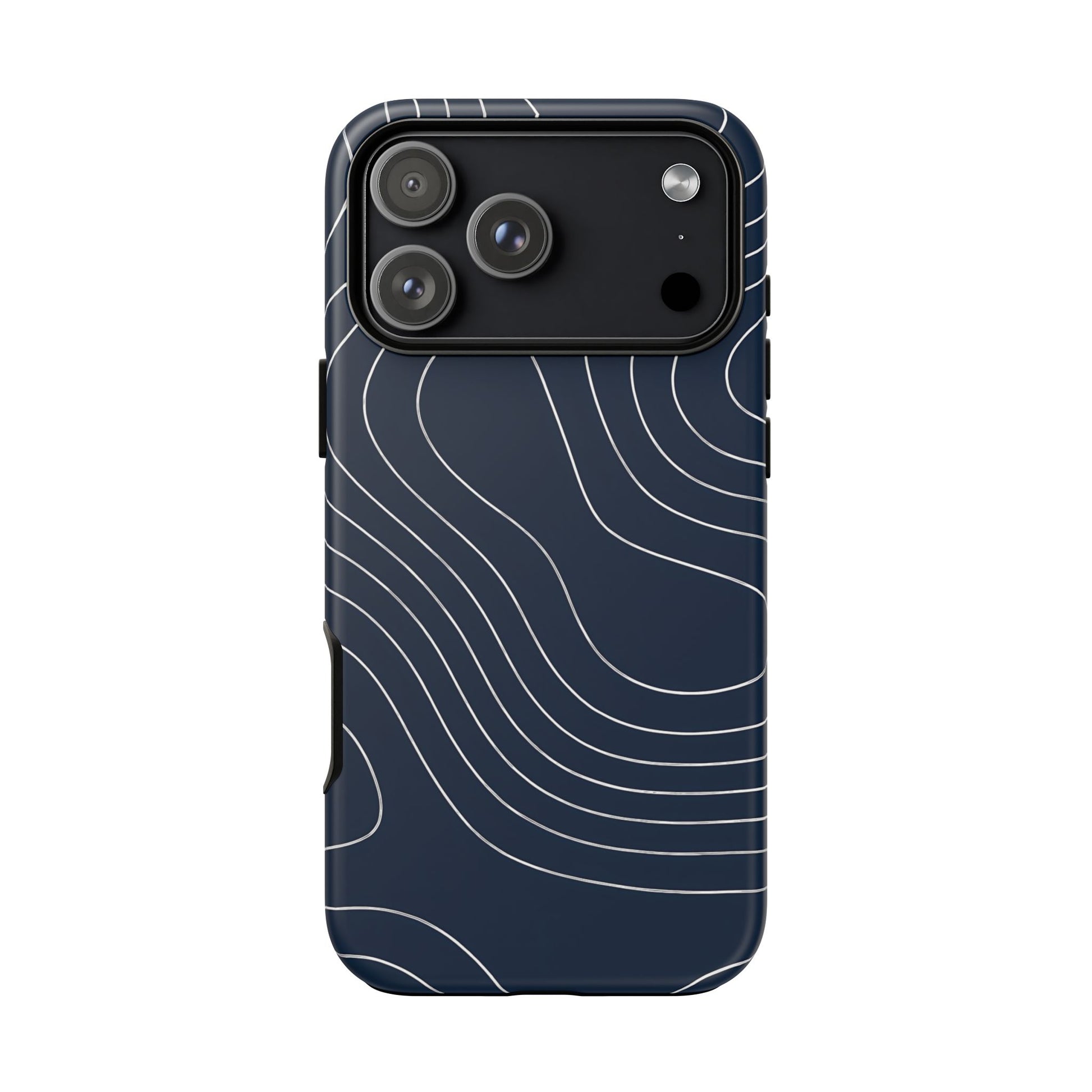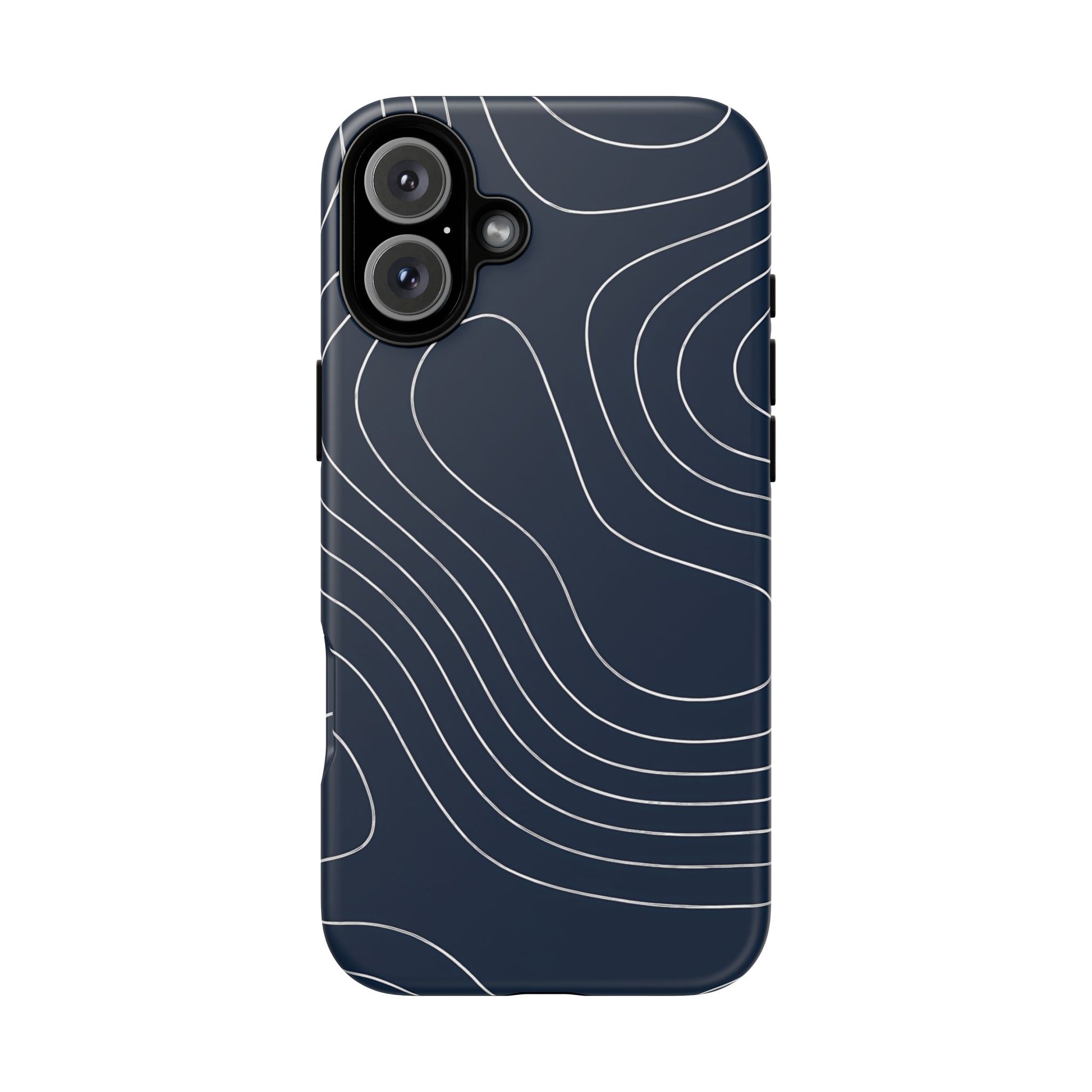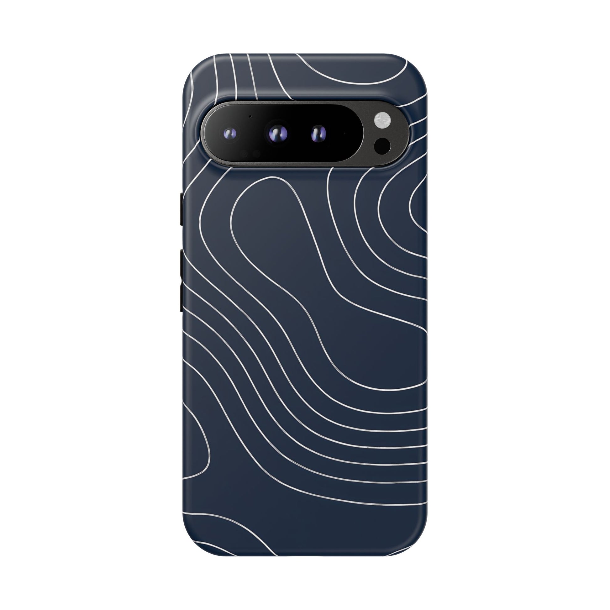 A clean, modern map-inspired pattern featuring seamless white elevation lines over a dark navy canvas, defined by high contrast and precise linework