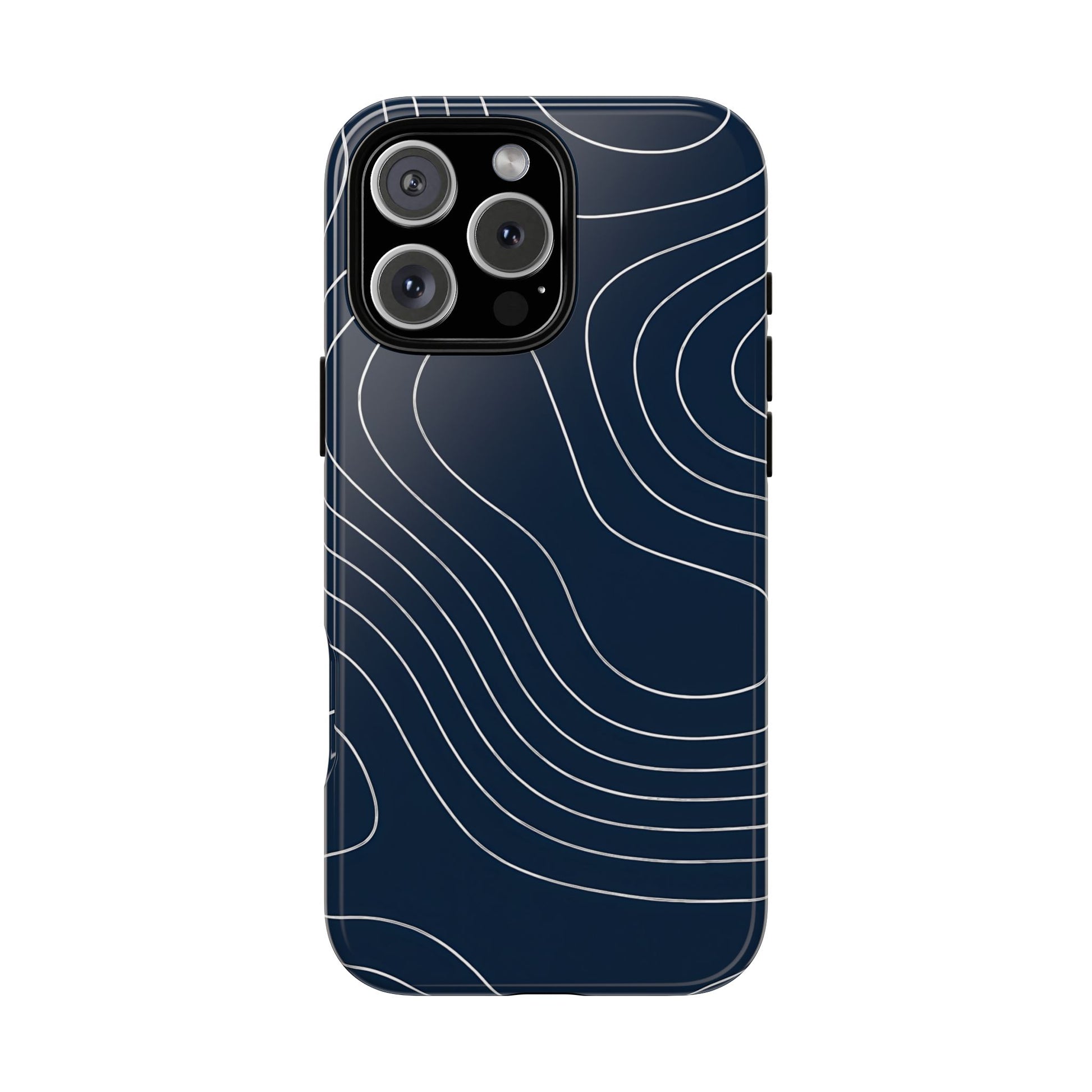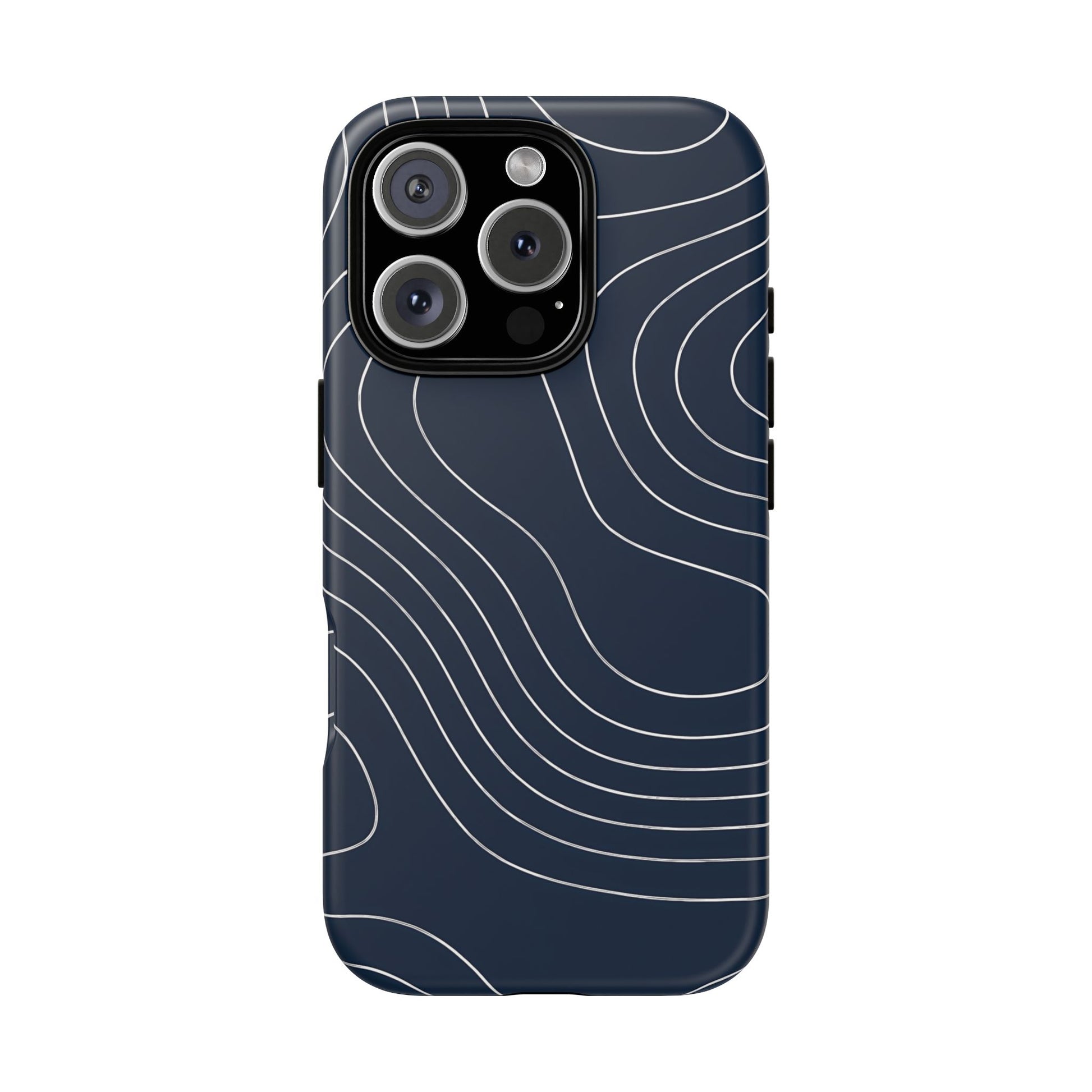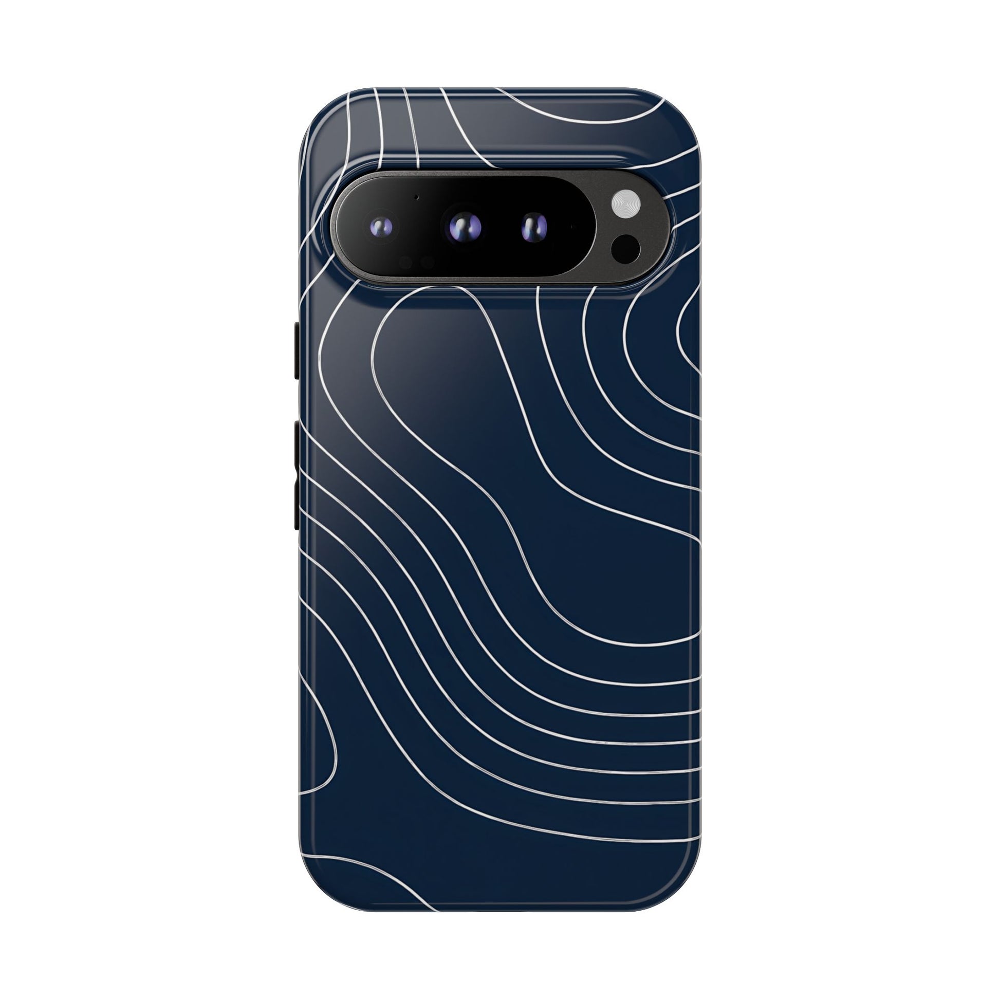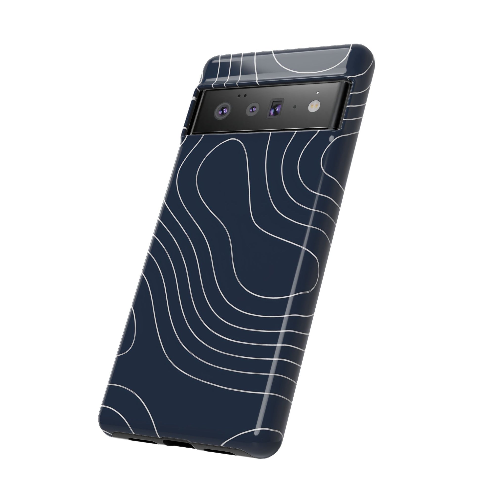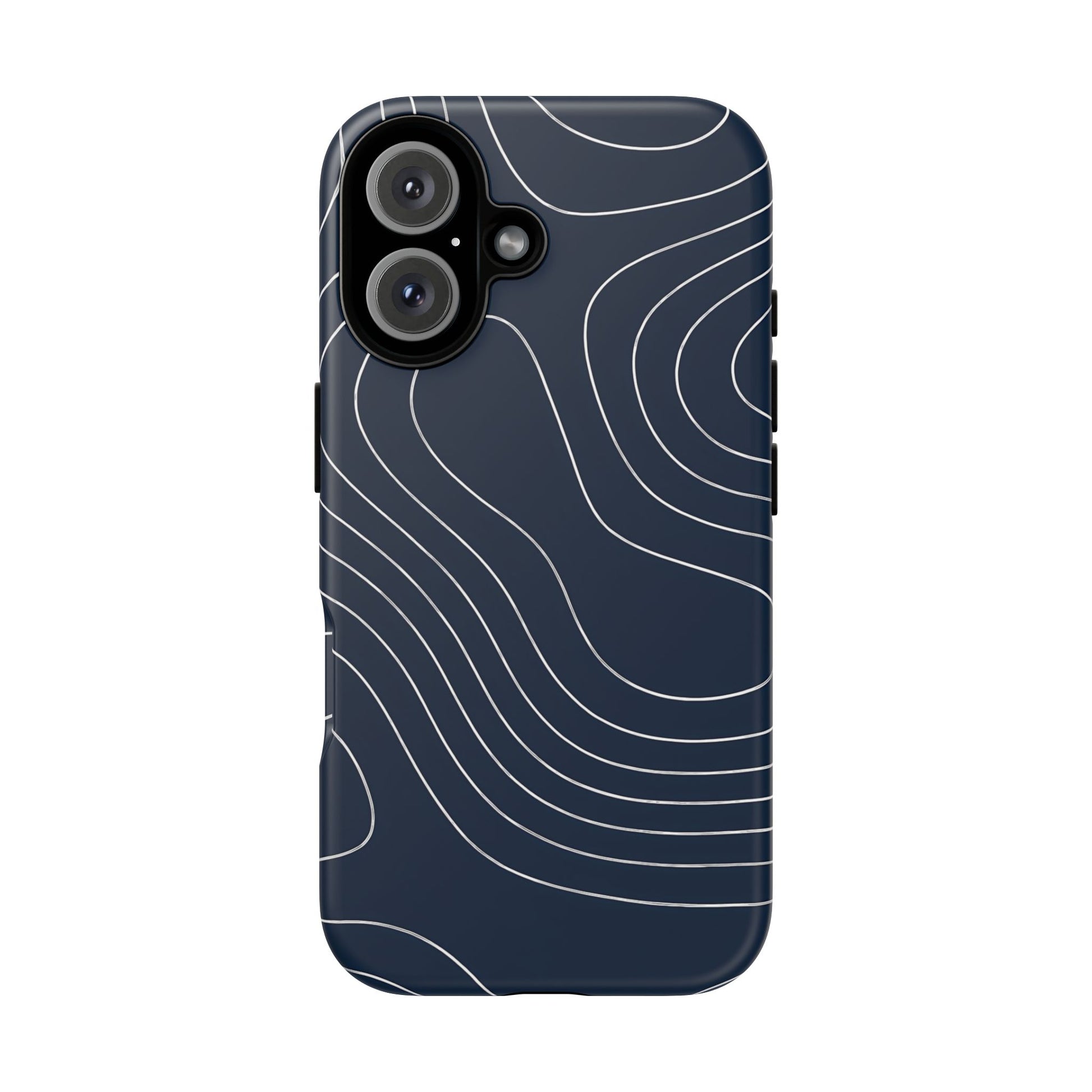 A clean, modern map-inspired pattern featuring seamless white elevation lines over a dark navy canvas, defined by high contrast and precise linework