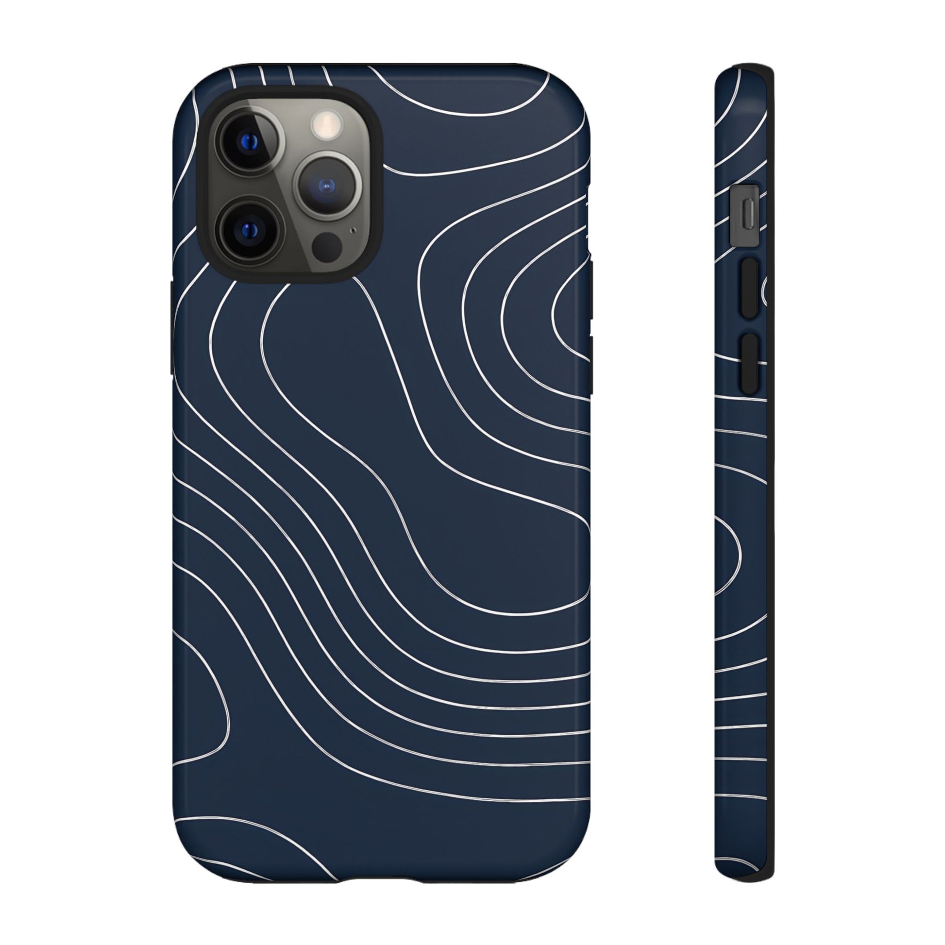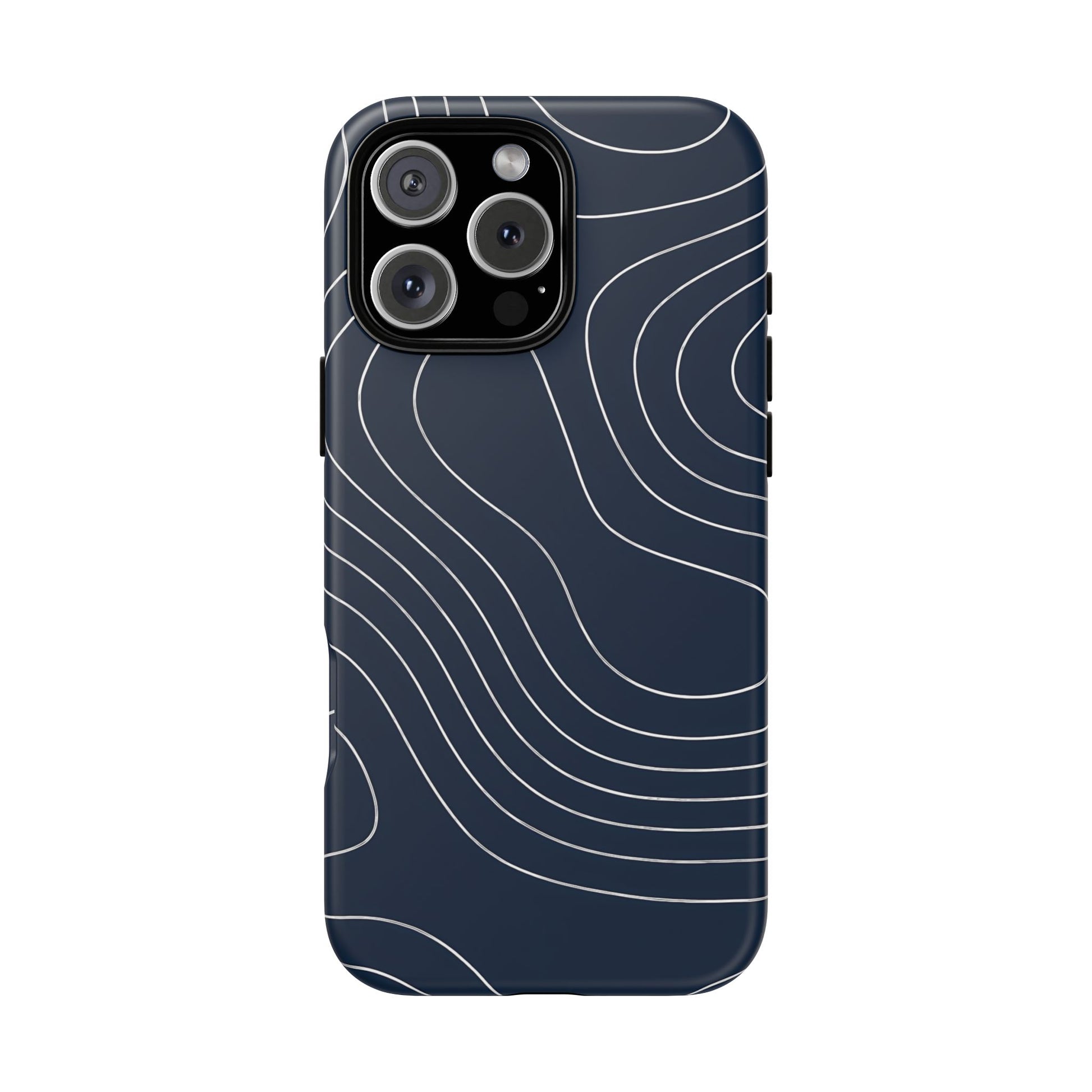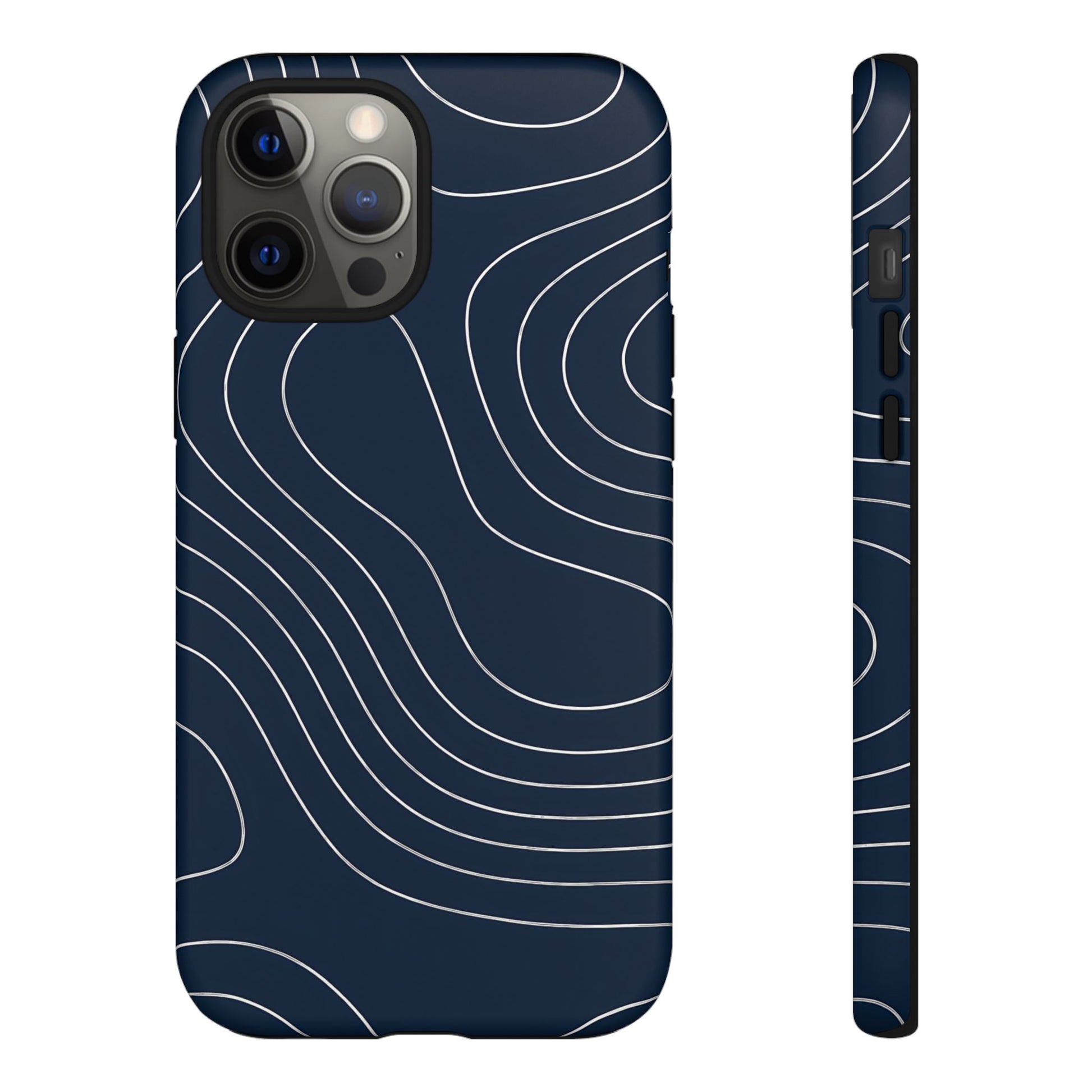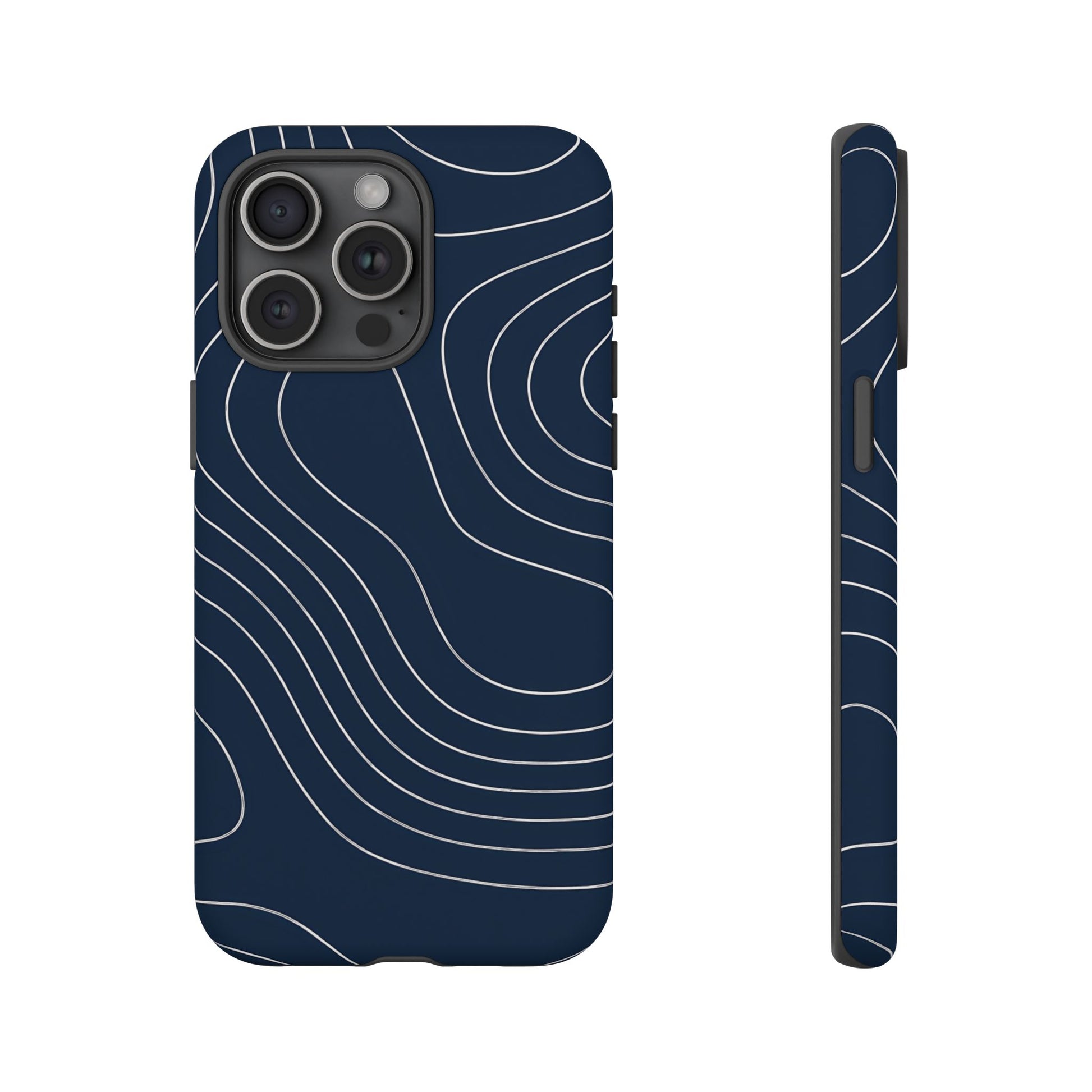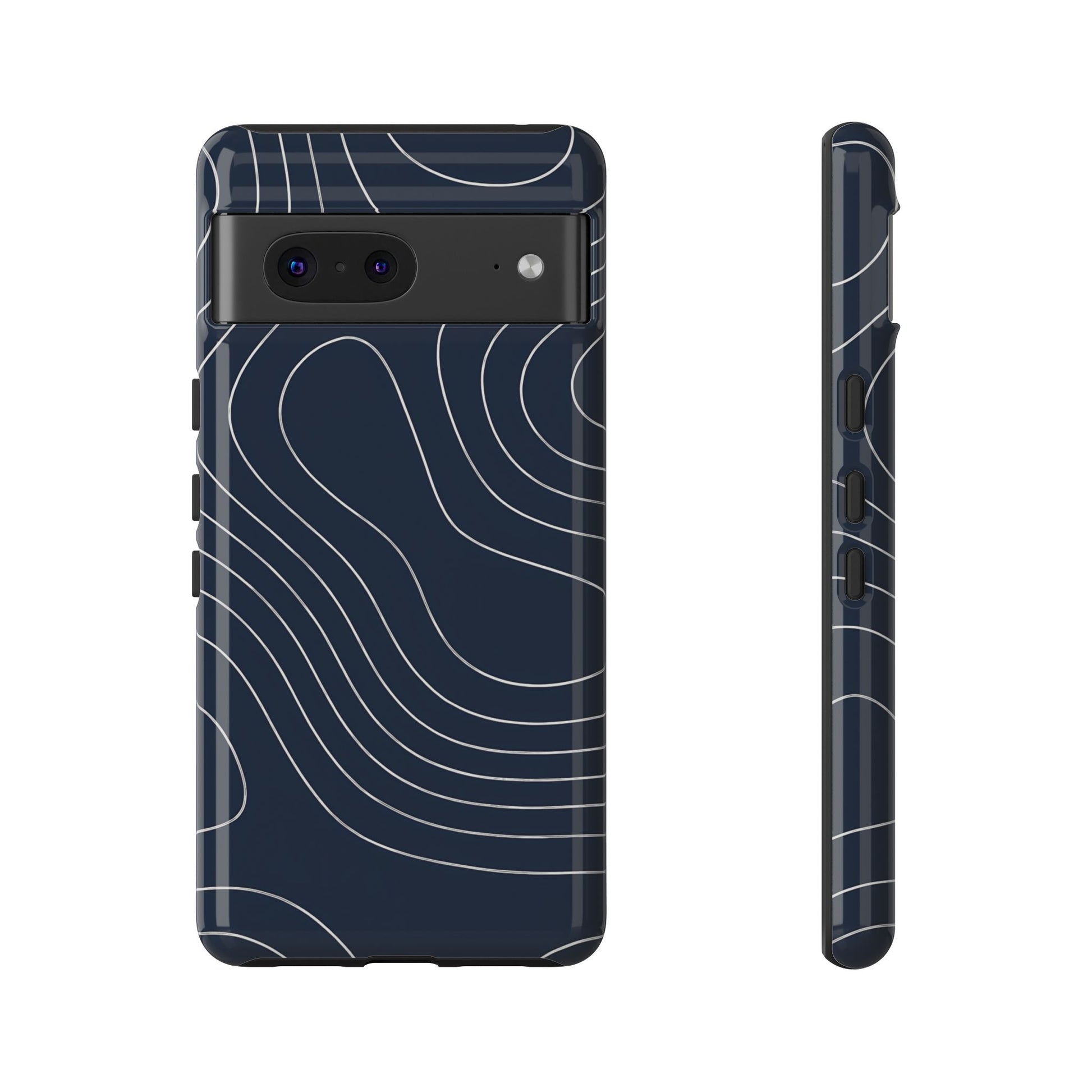 A clean, modern map-inspired pattern featuring seamless white elevation lines over a dark navy canvas, defined by high contrast and precise linework