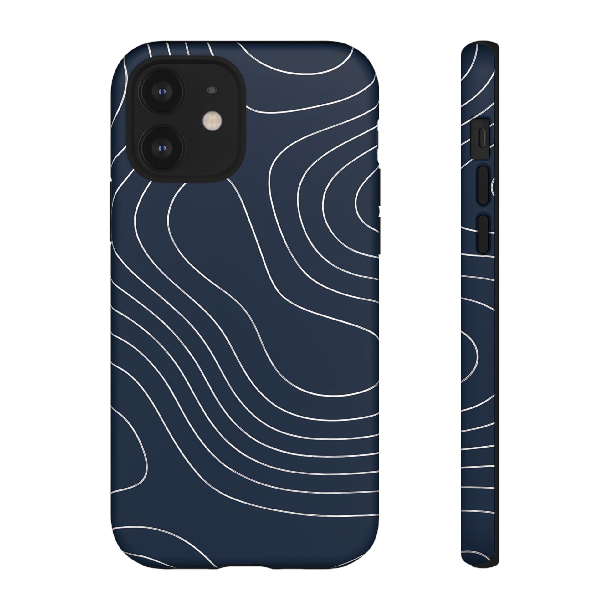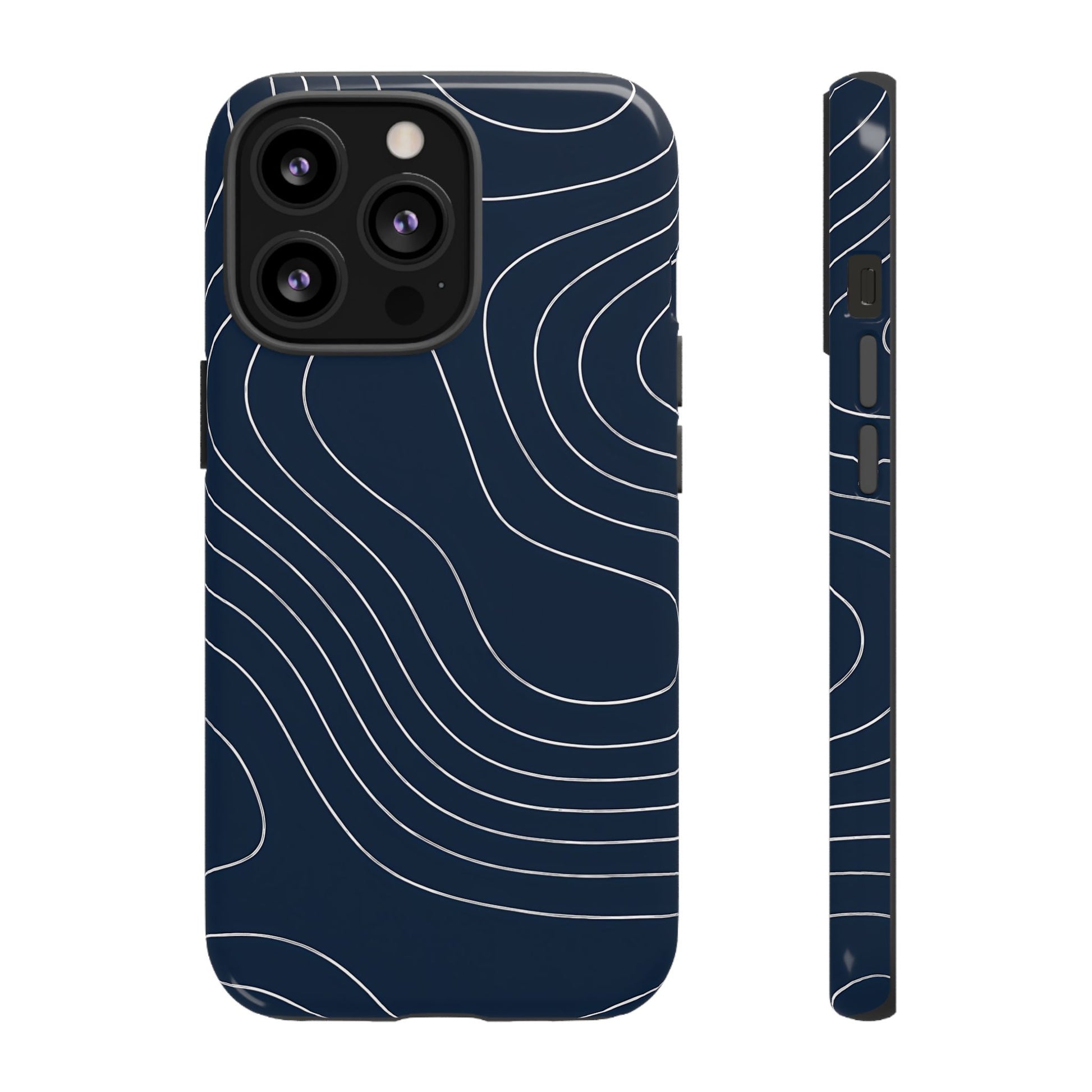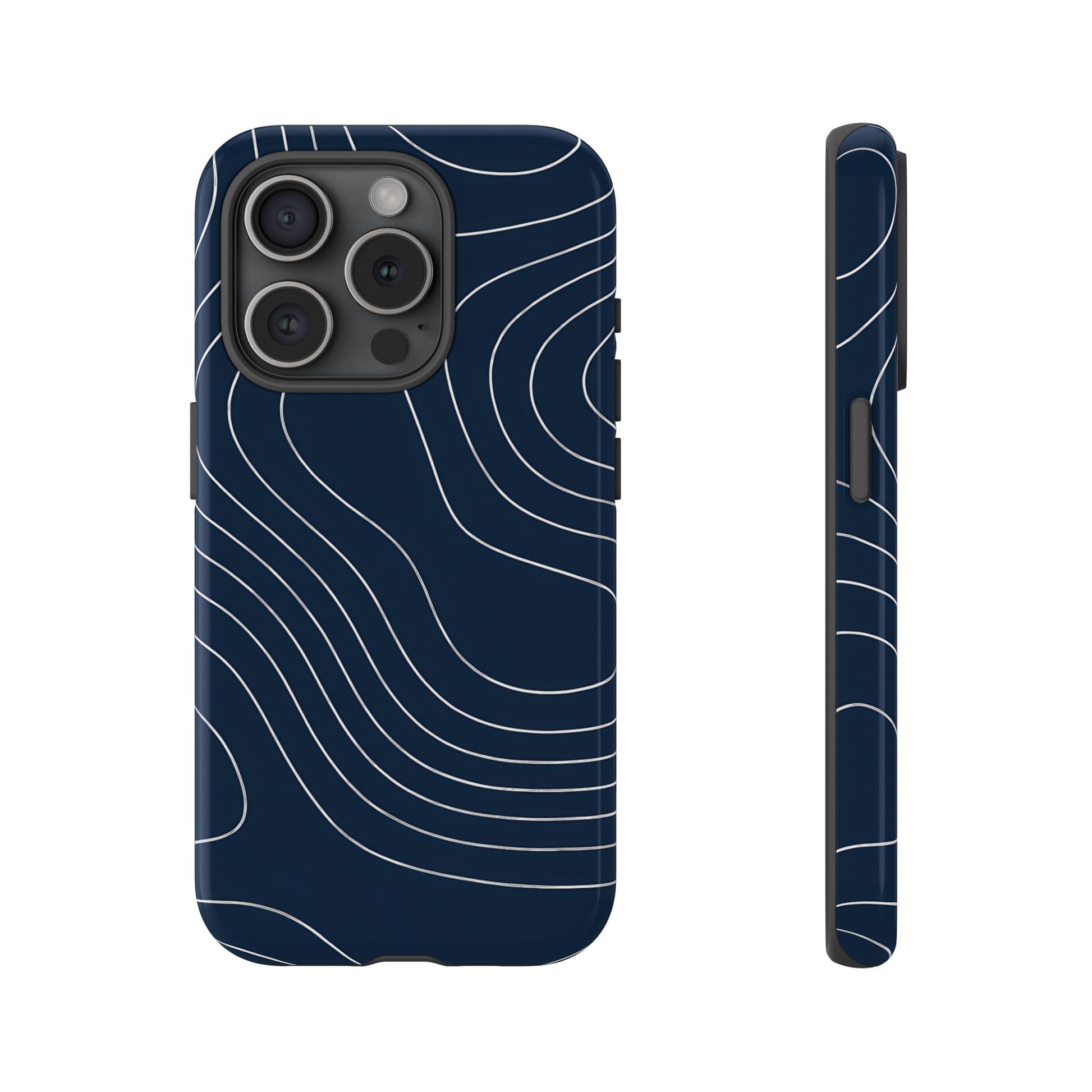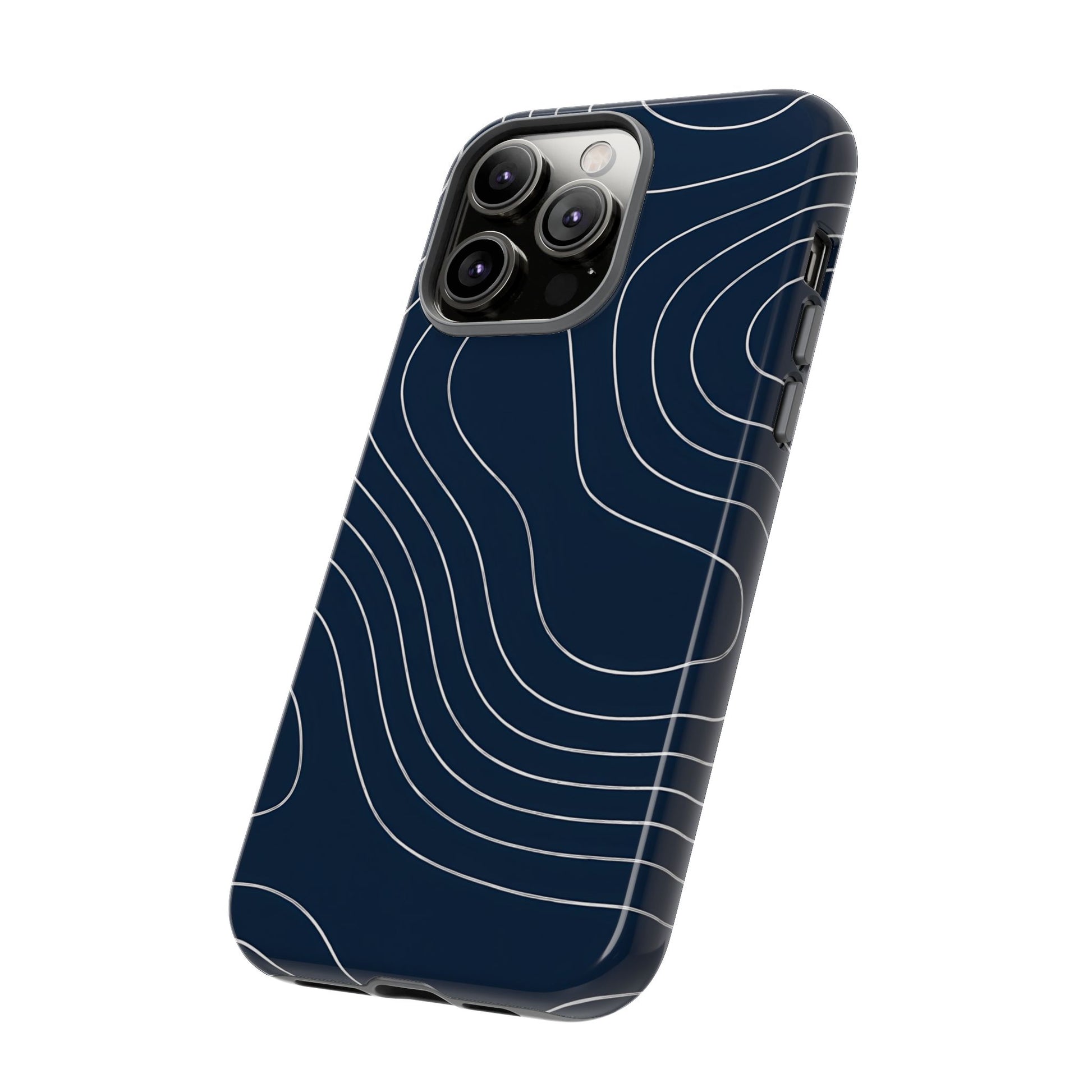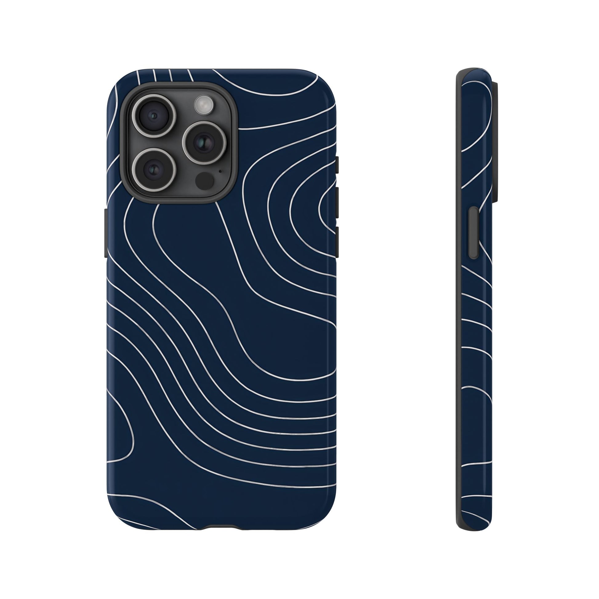 A clean, modern map-inspired pattern featuring seamless white elevation lines over a dark navy canvas, defined by high contrast and precise linework