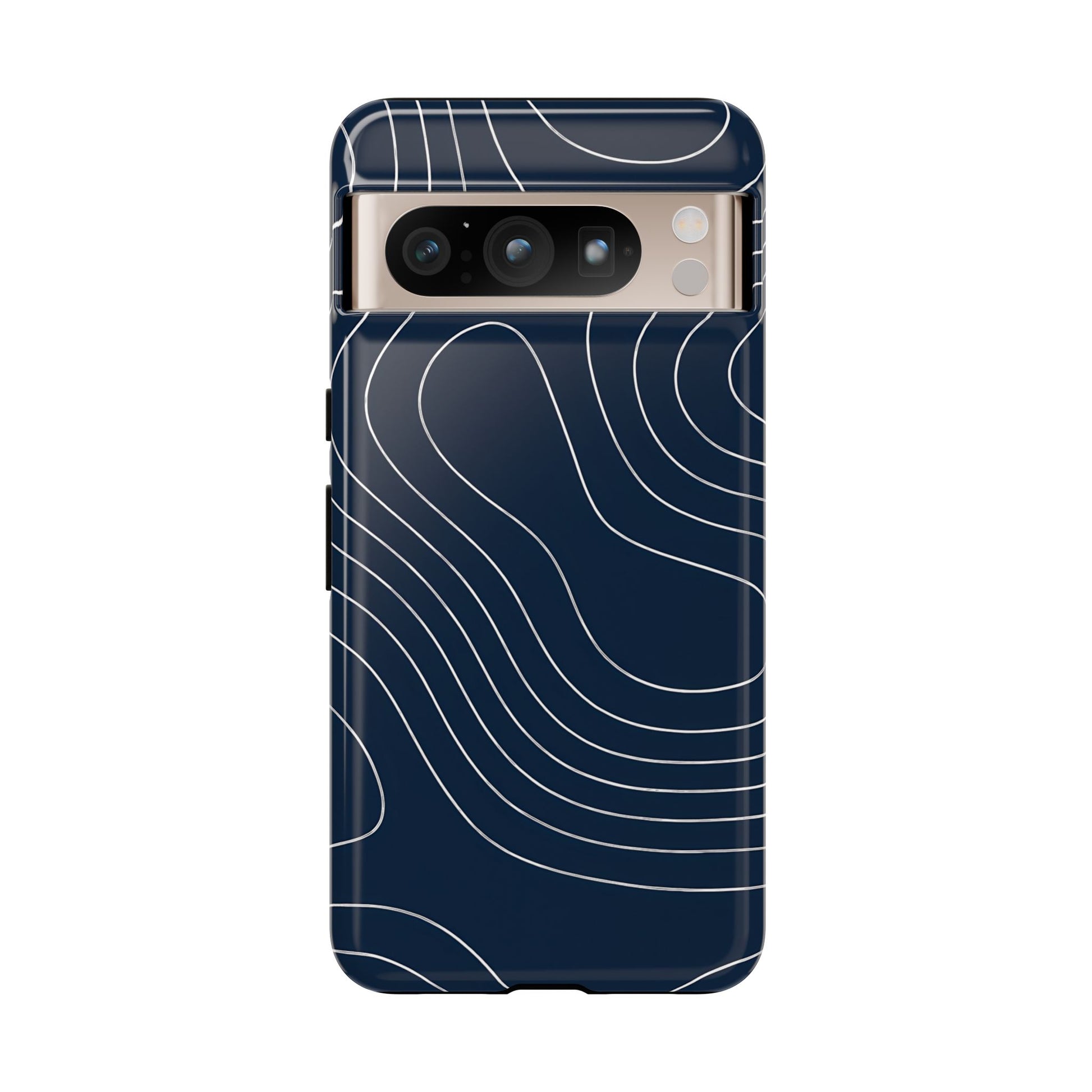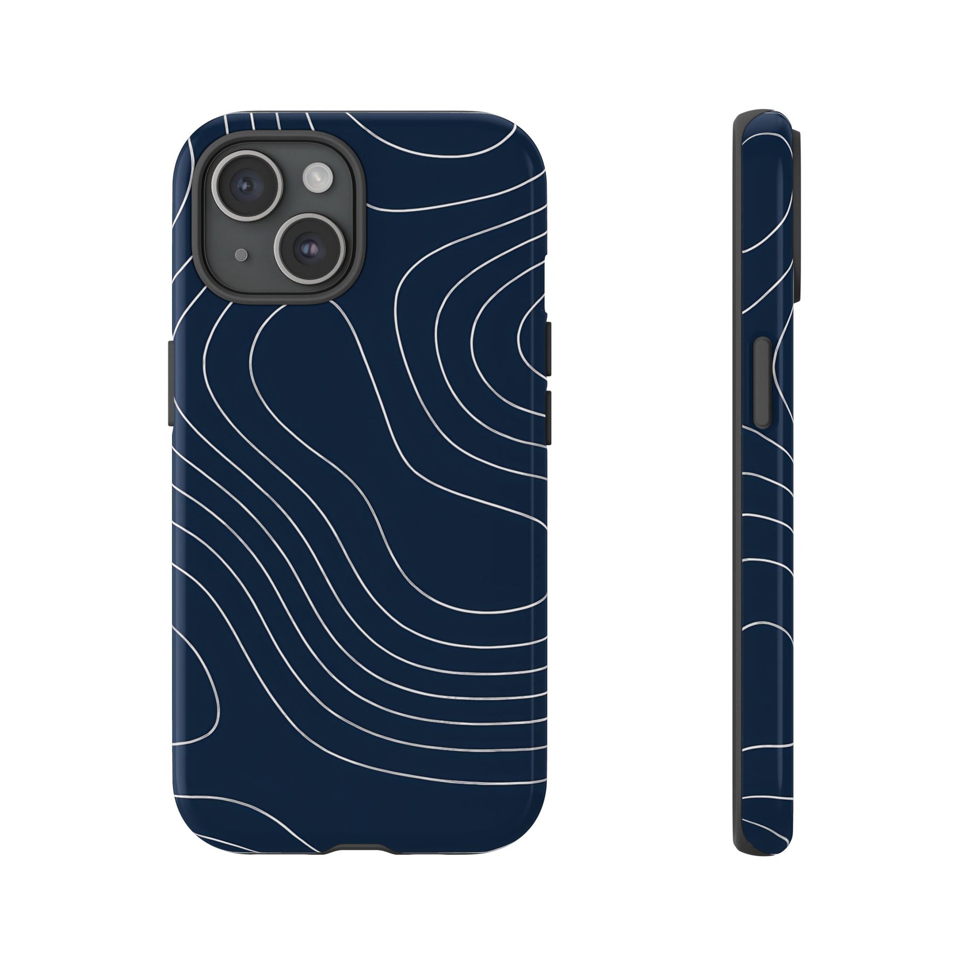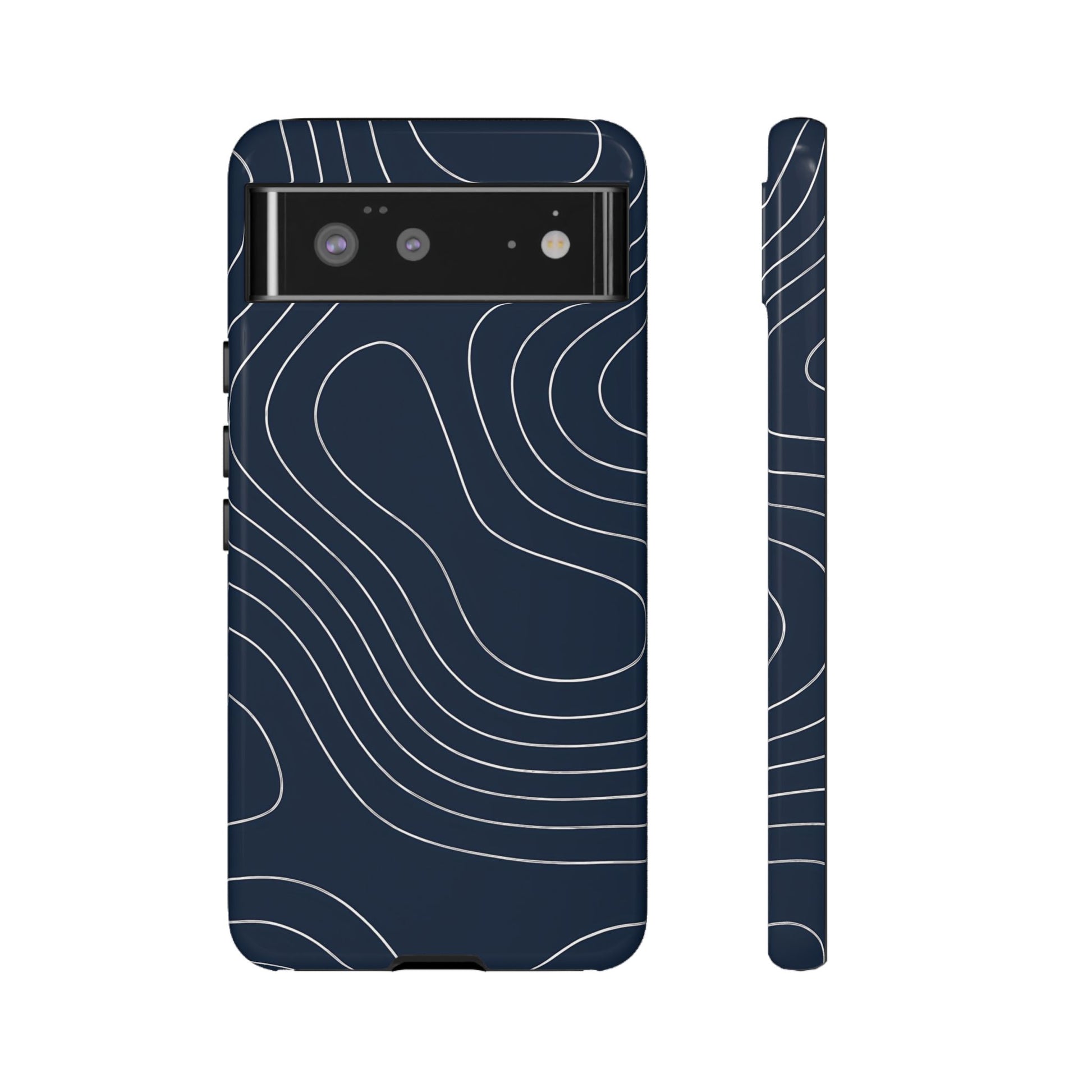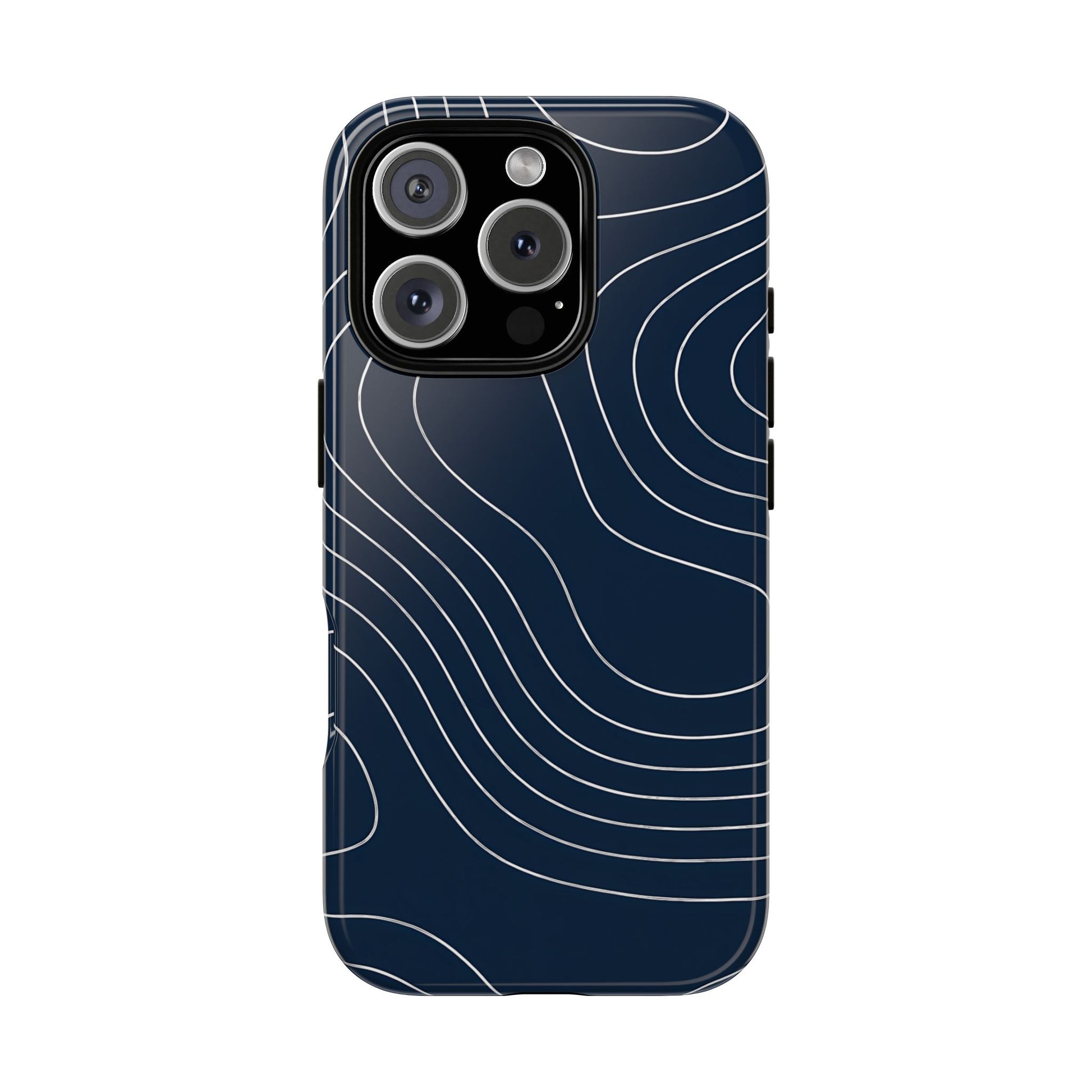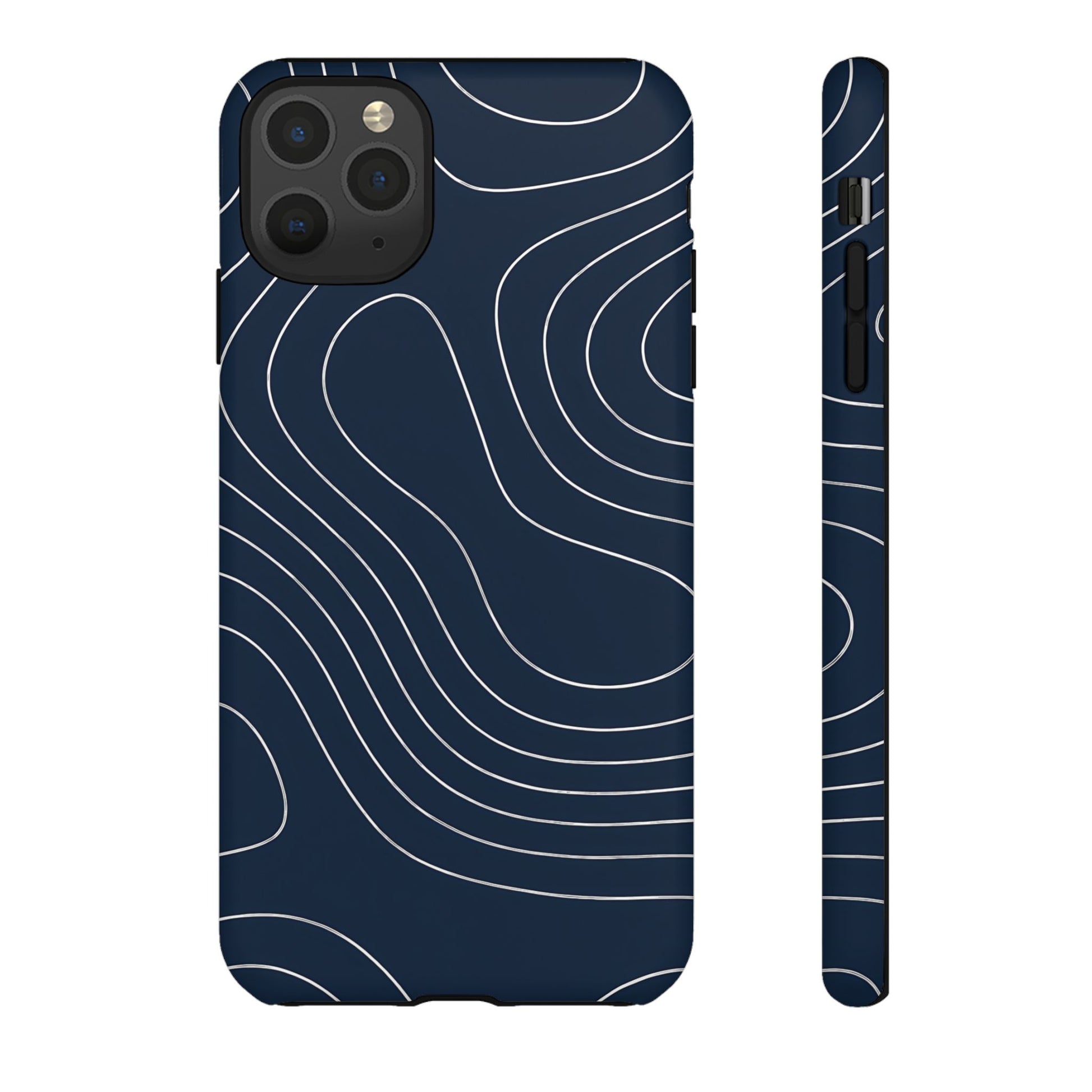 A clean, modern map-inspired pattern featuring seamless white elevation lines over a dark navy canvas, defined by high contrast and precise linework