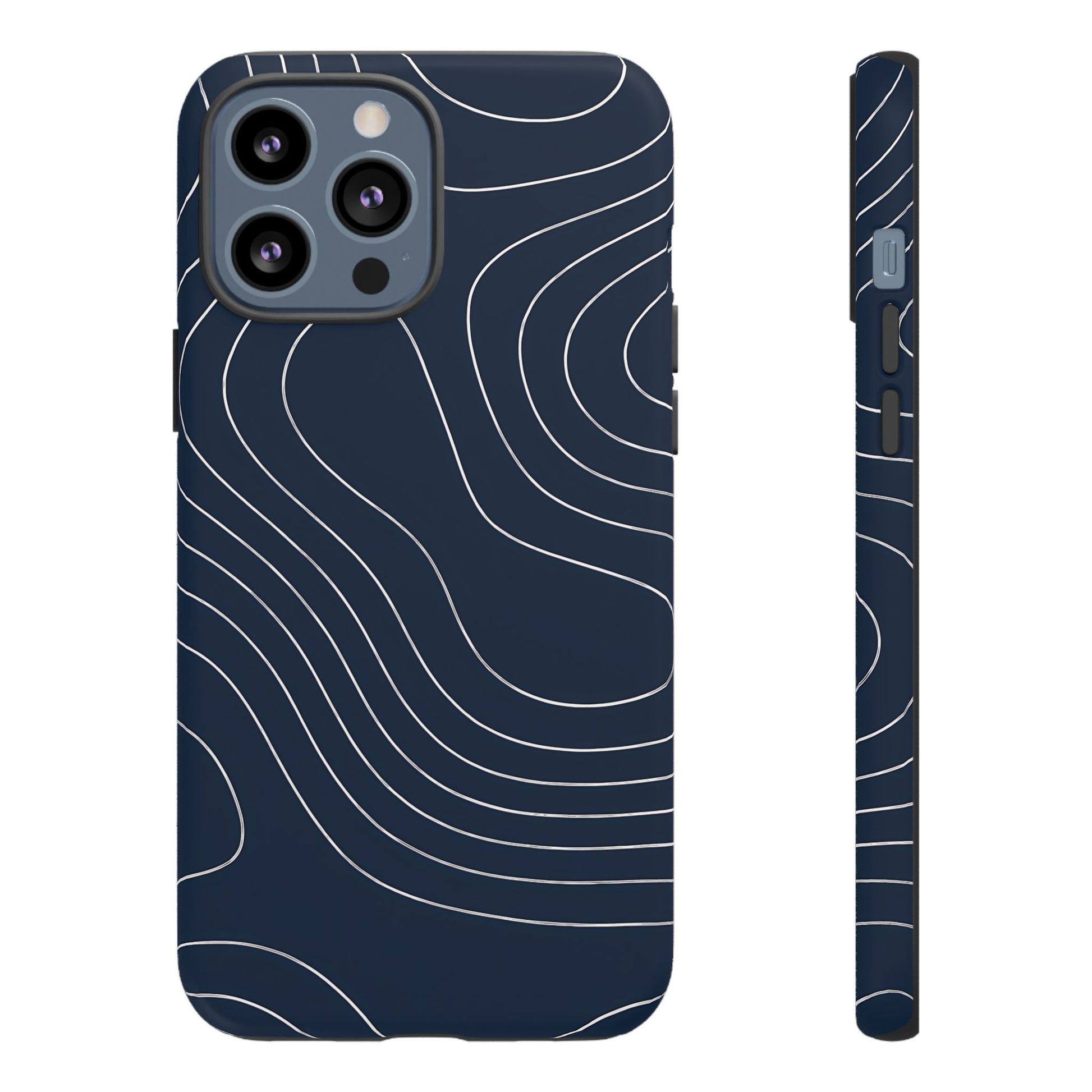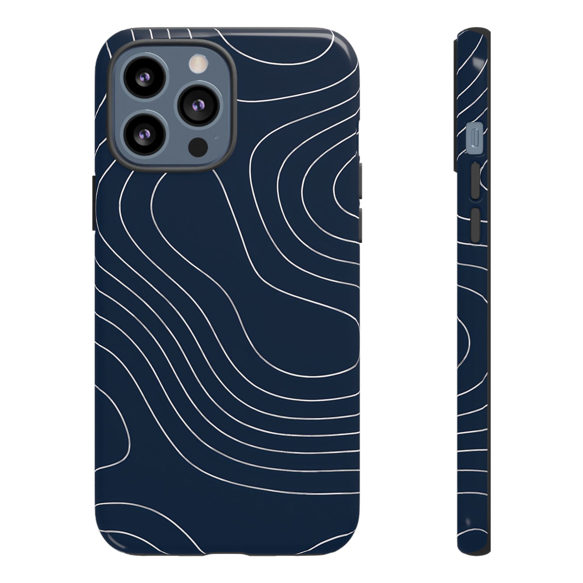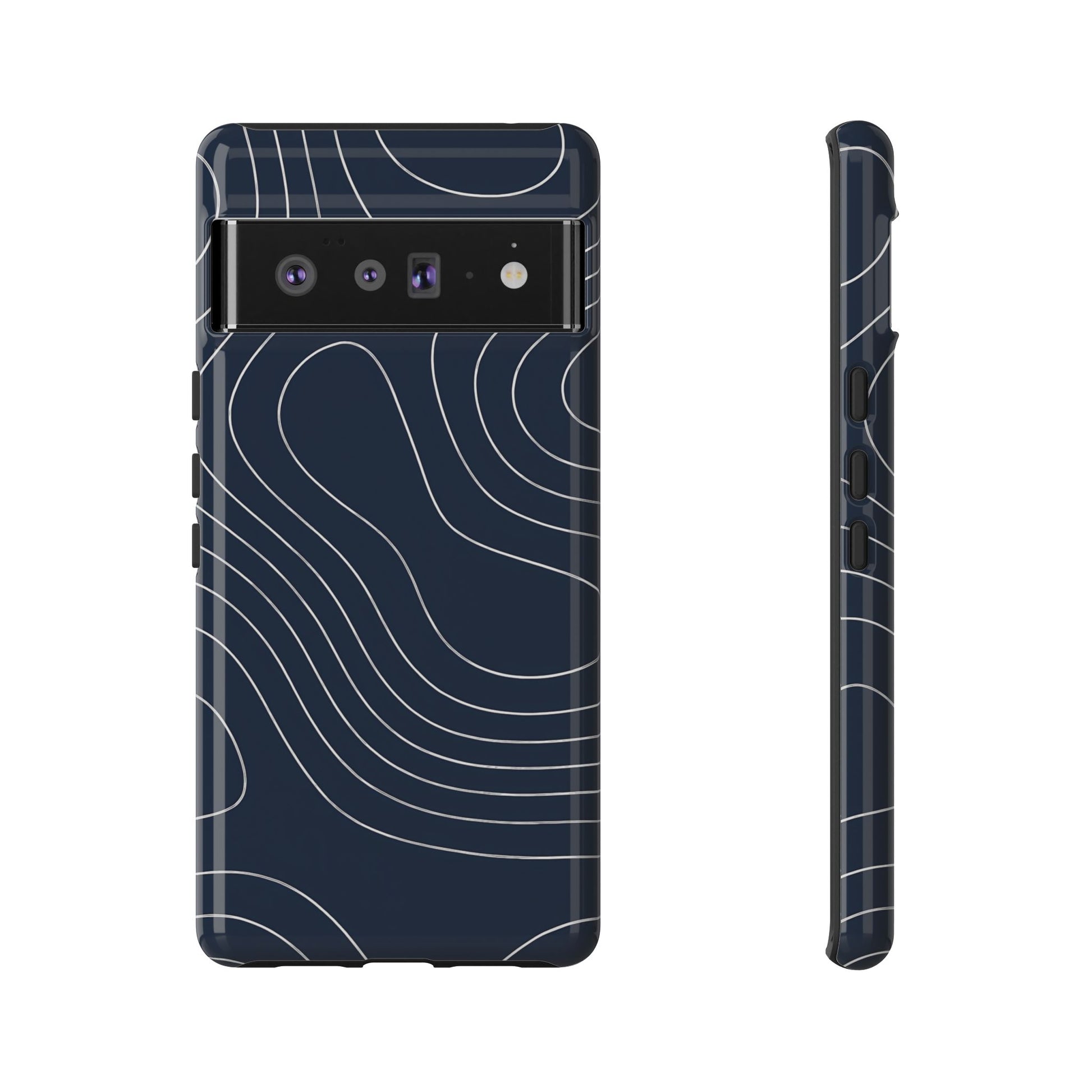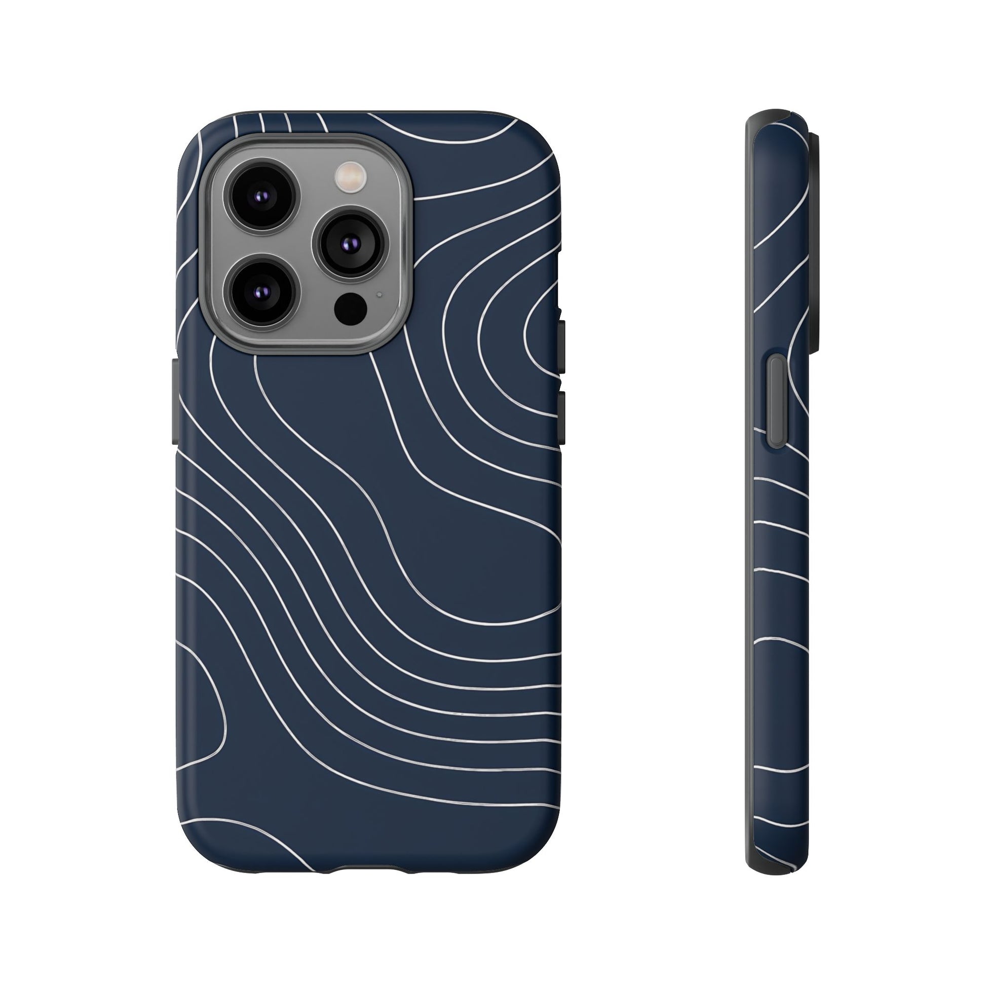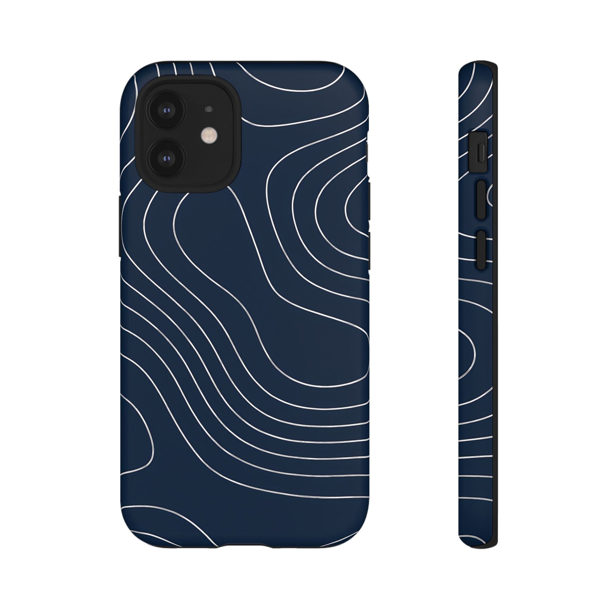 A clean, modern map-inspired pattern featuring seamless white elevation lines over a dark navy canvas, defined by high contrast and precise linework