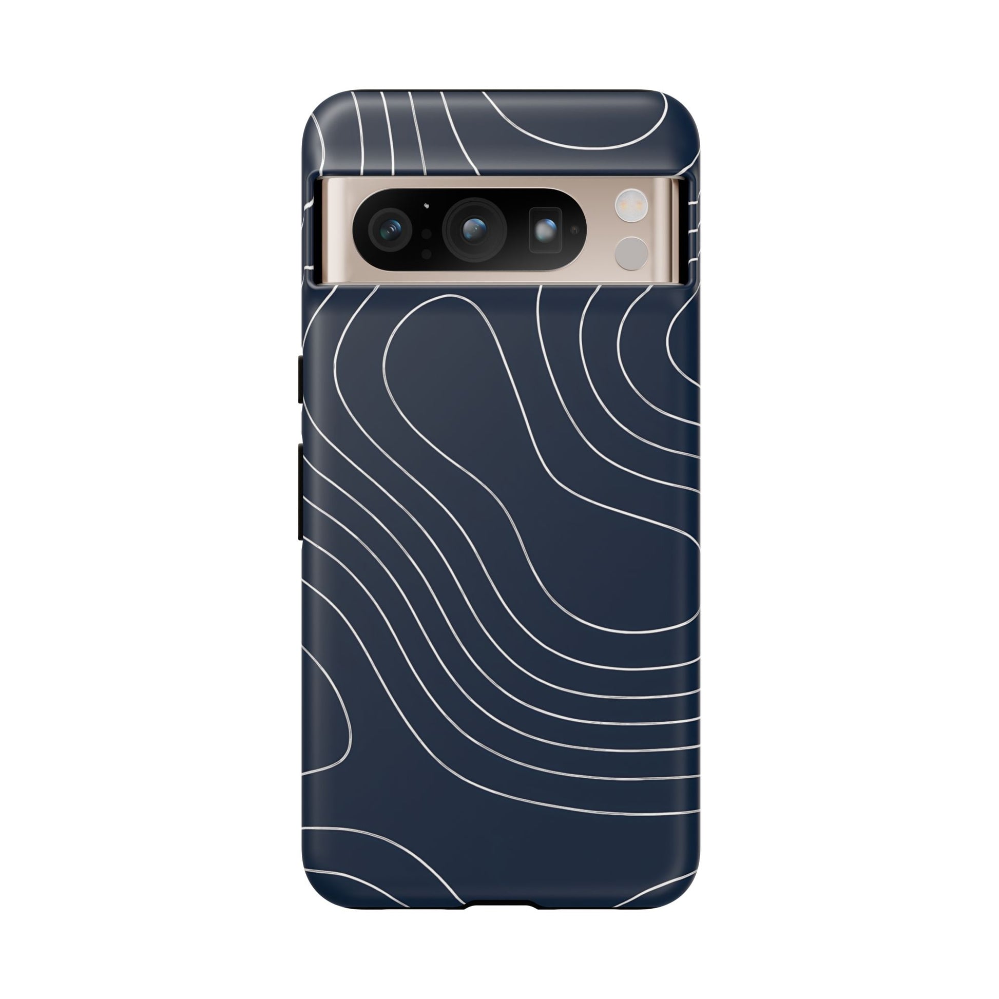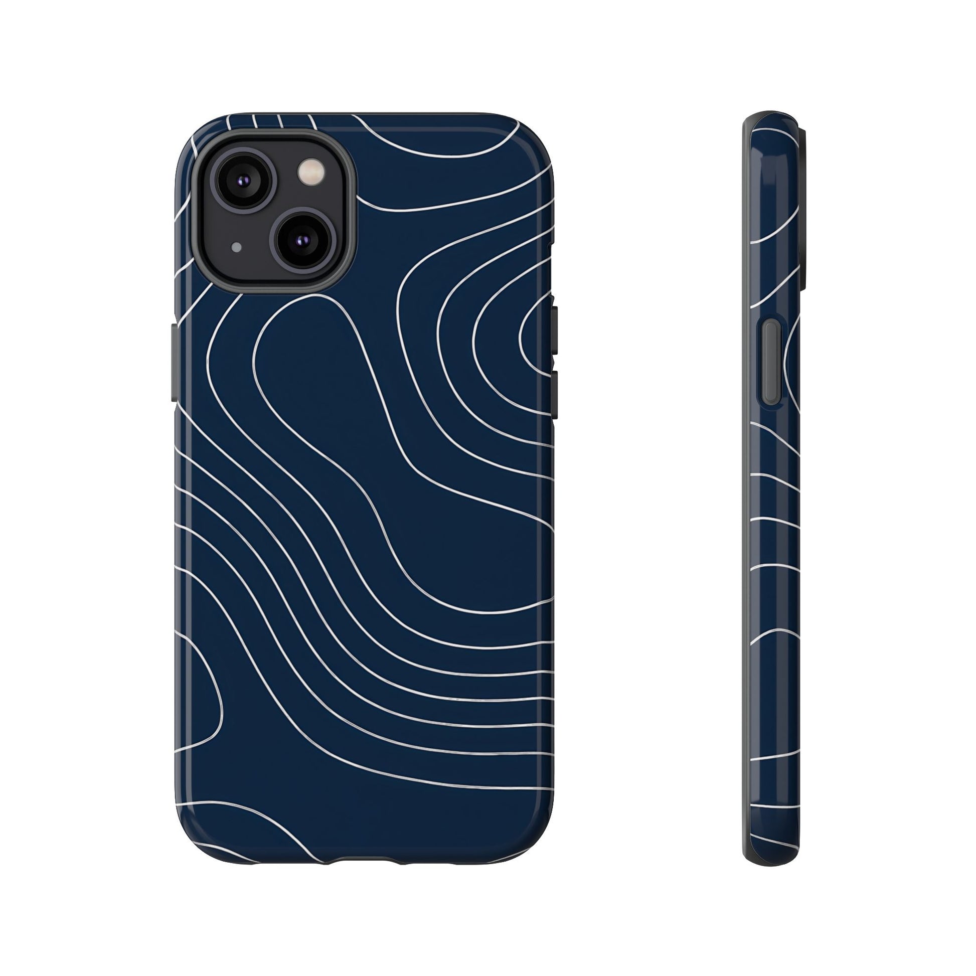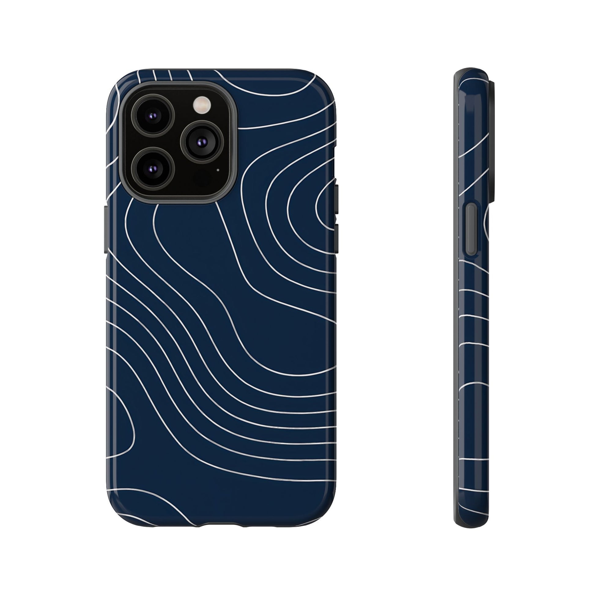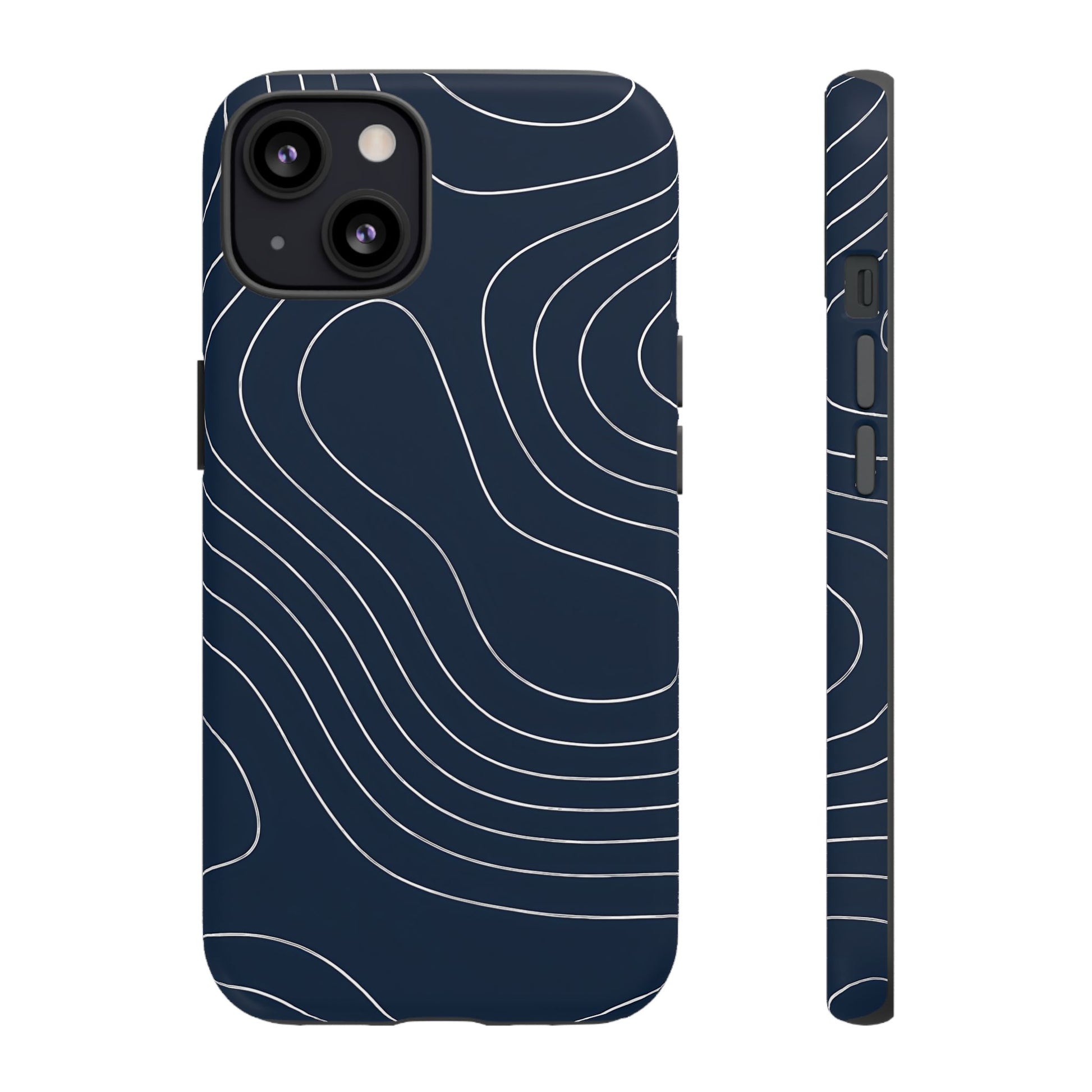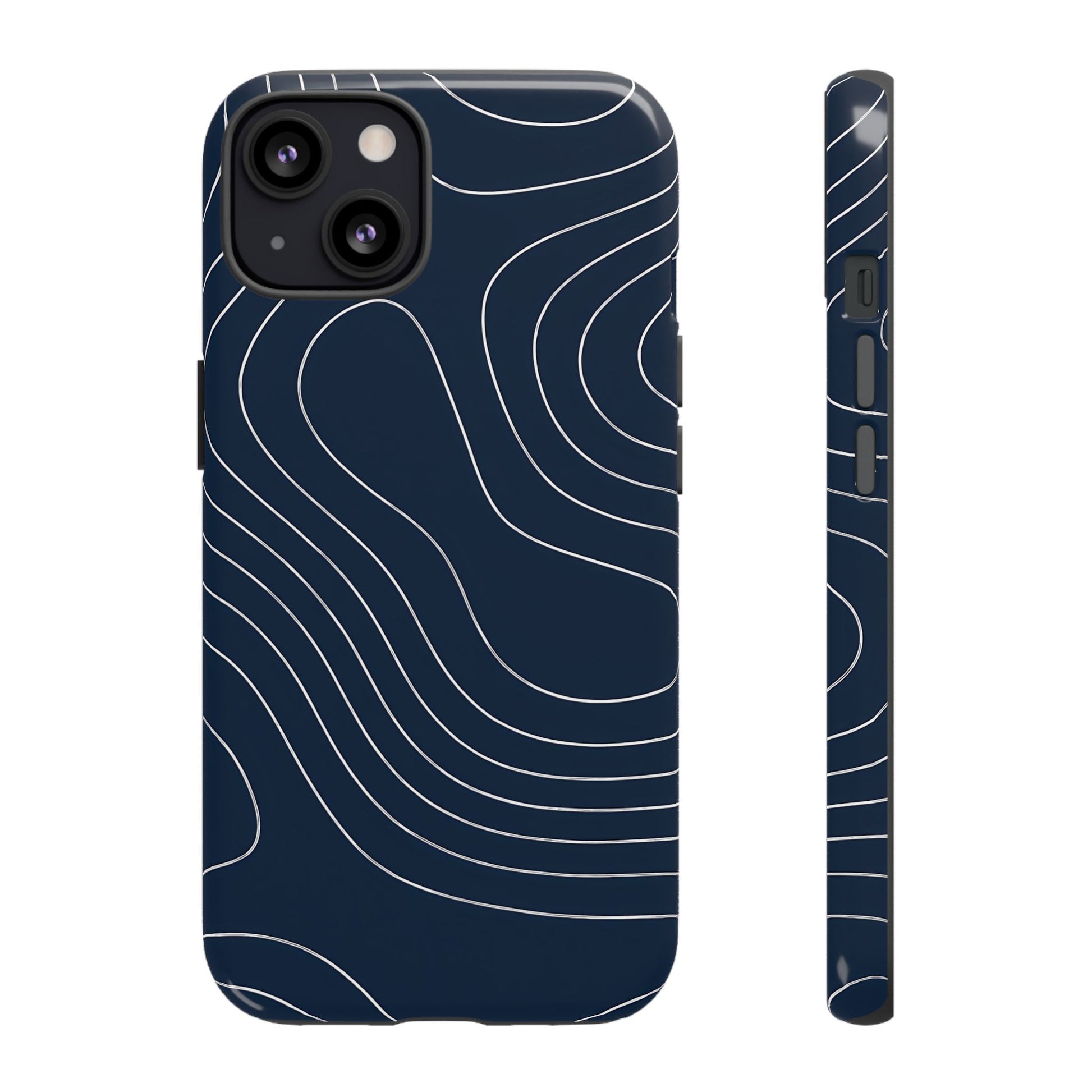 A clean, modern map-inspired pattern featuring seamless white elevation lines over a dark navy canvas, defined by high contrast and precise linework