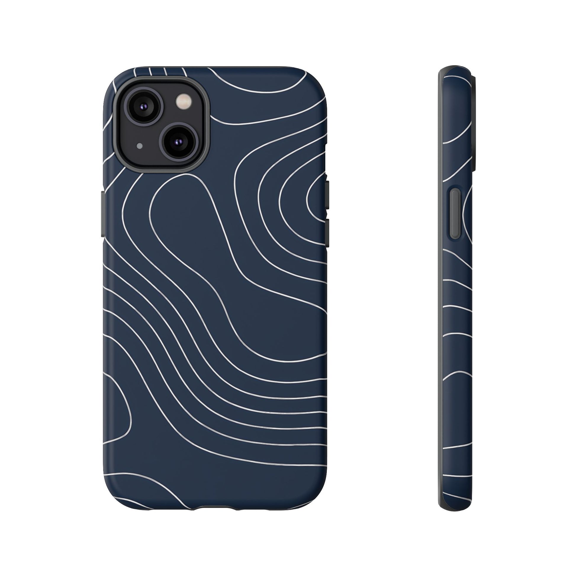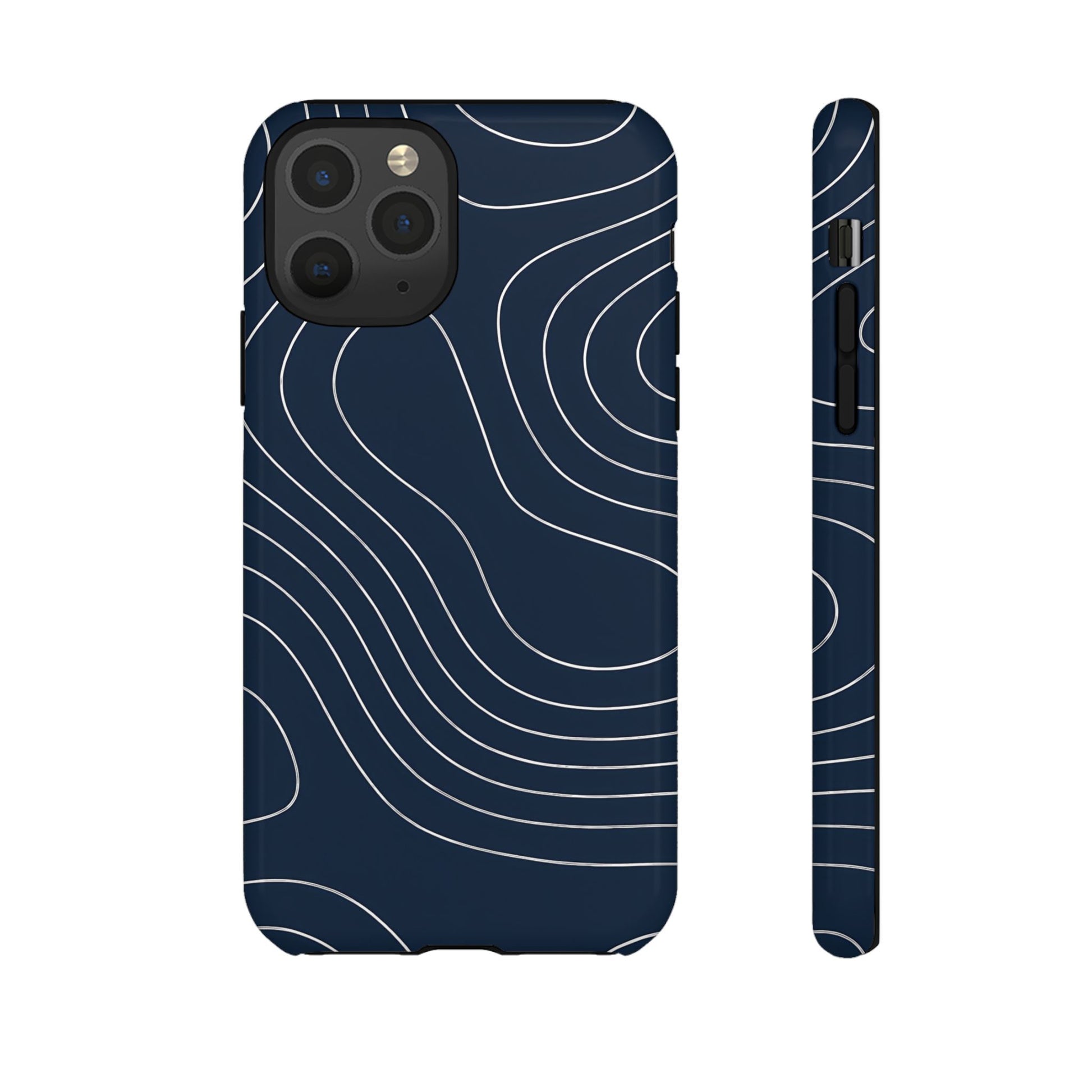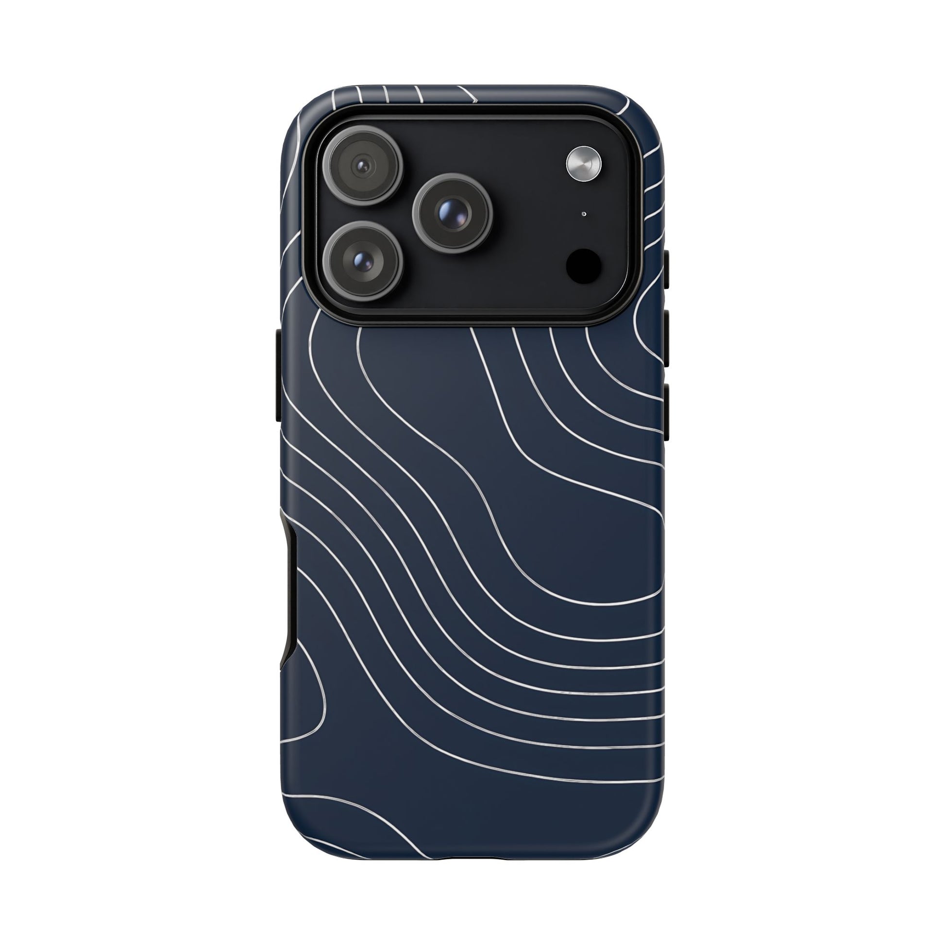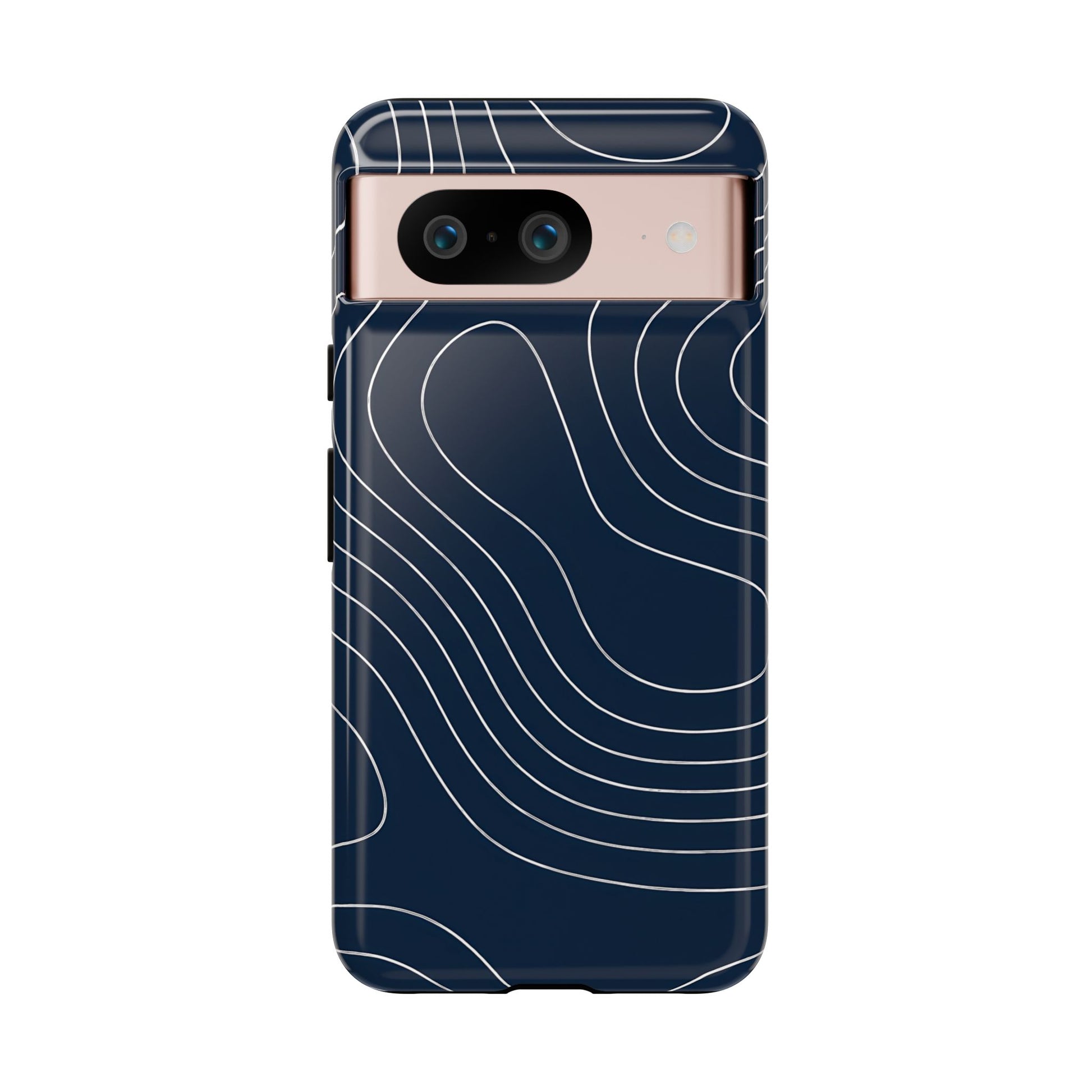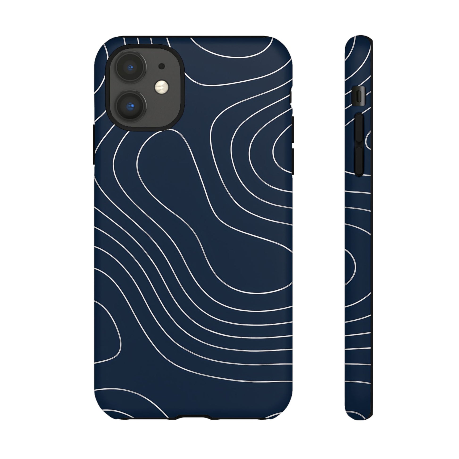 A clean, modern map-inspired pattern featuring seamless white elevation lines over a dark navy canvas, defined by high contrast and precise linework