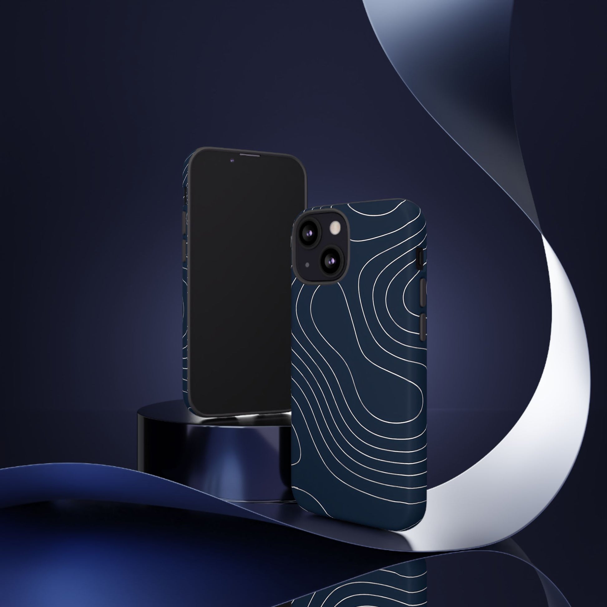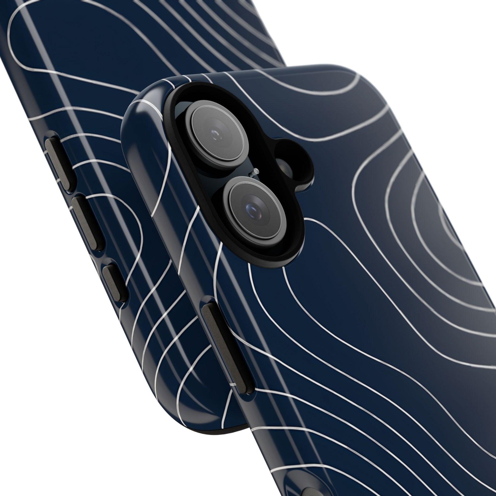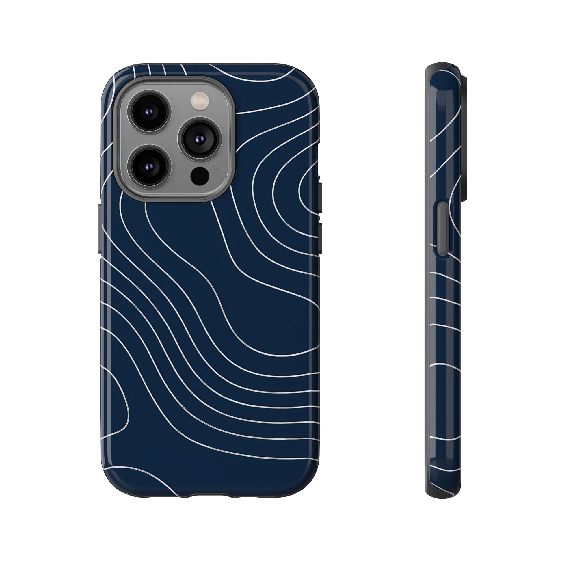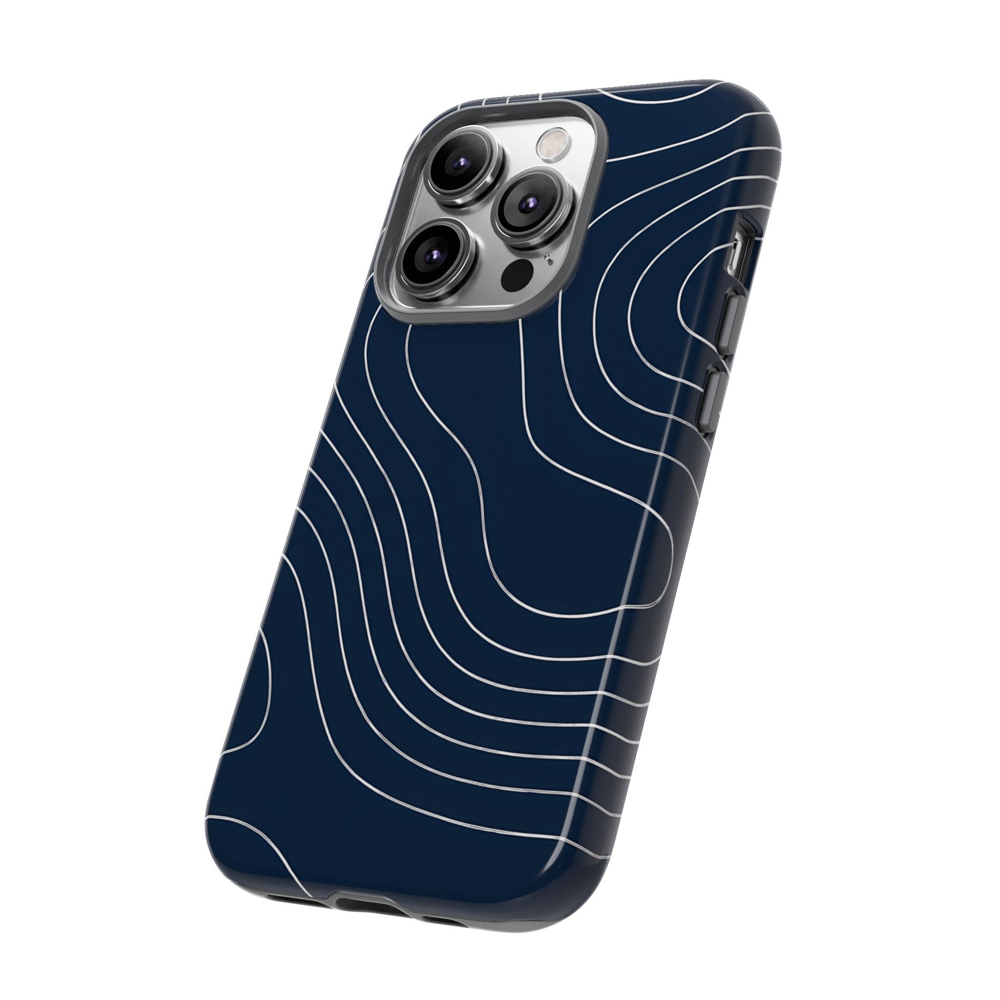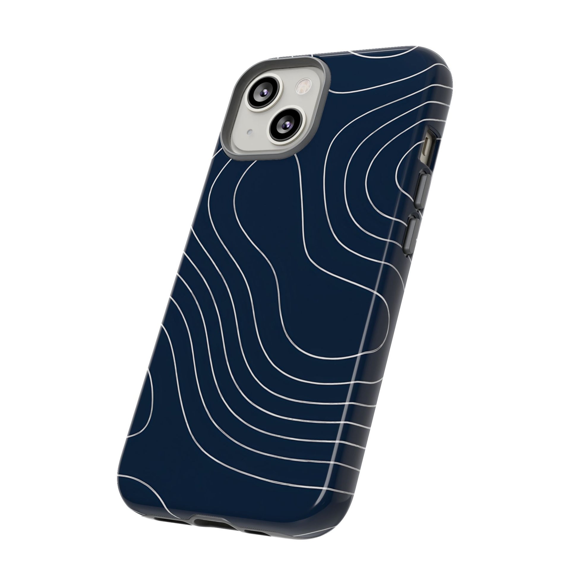A clean, modern map-inspired pattern featuring seamless white elevation lines over a dark navy canvas, defined by high contrast and precise linework