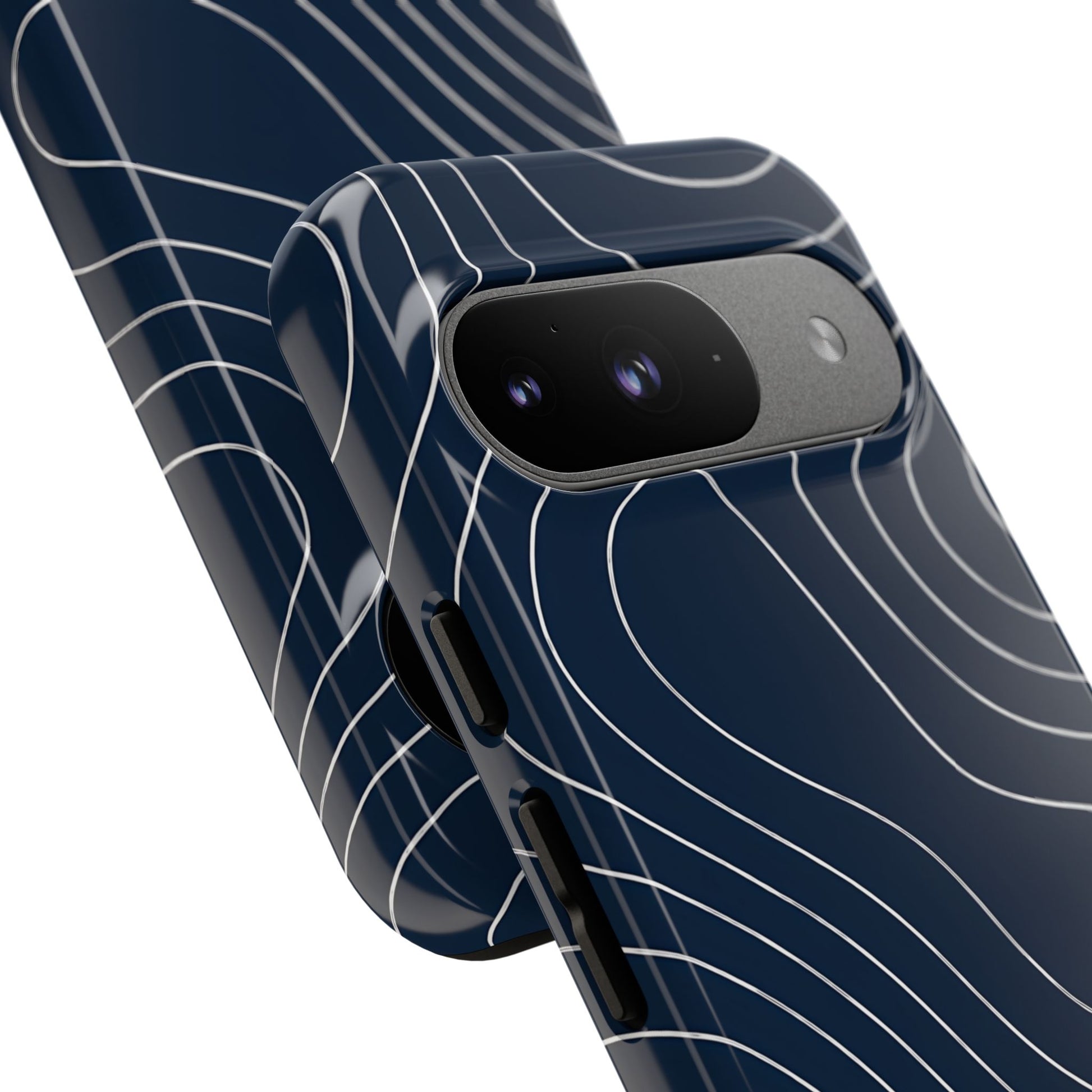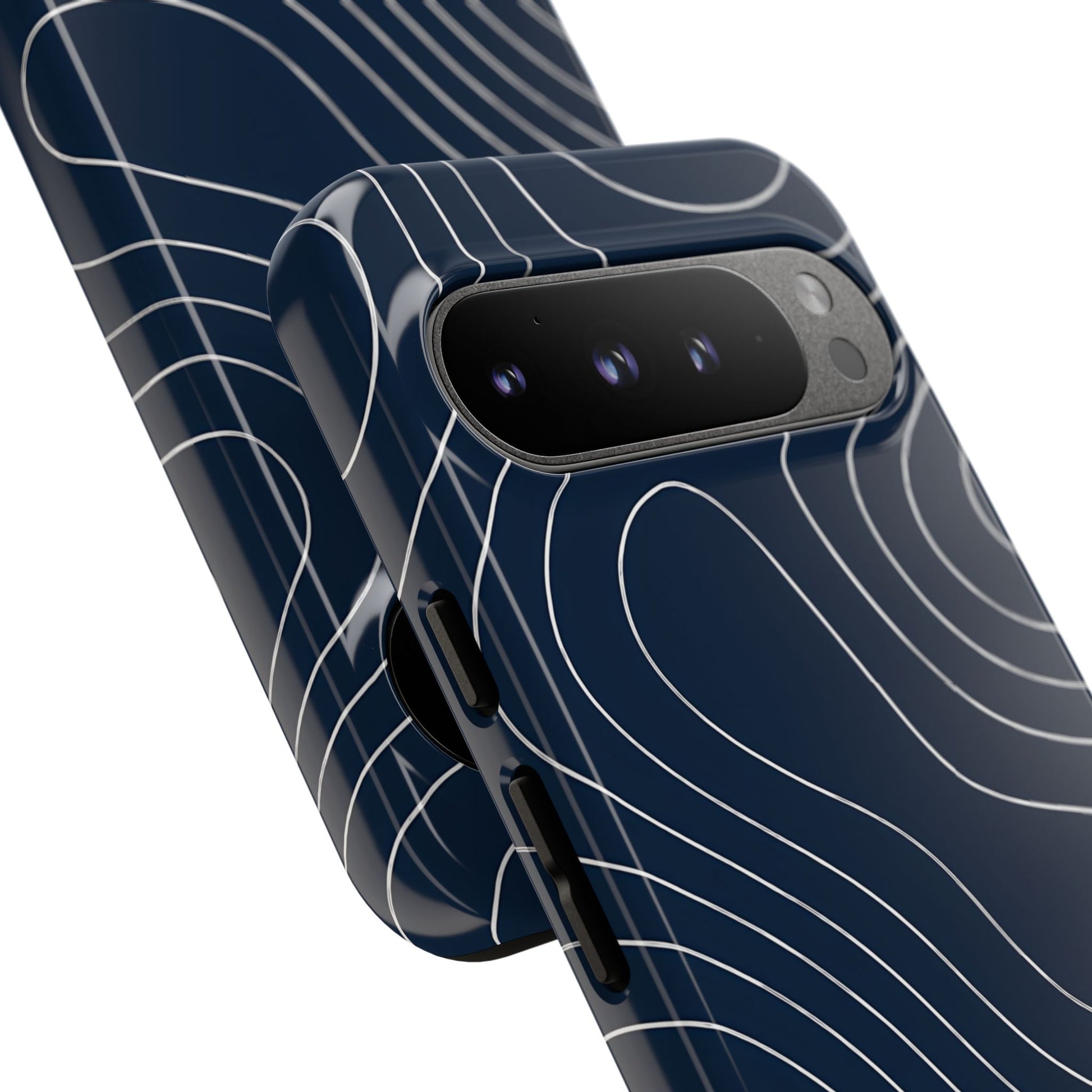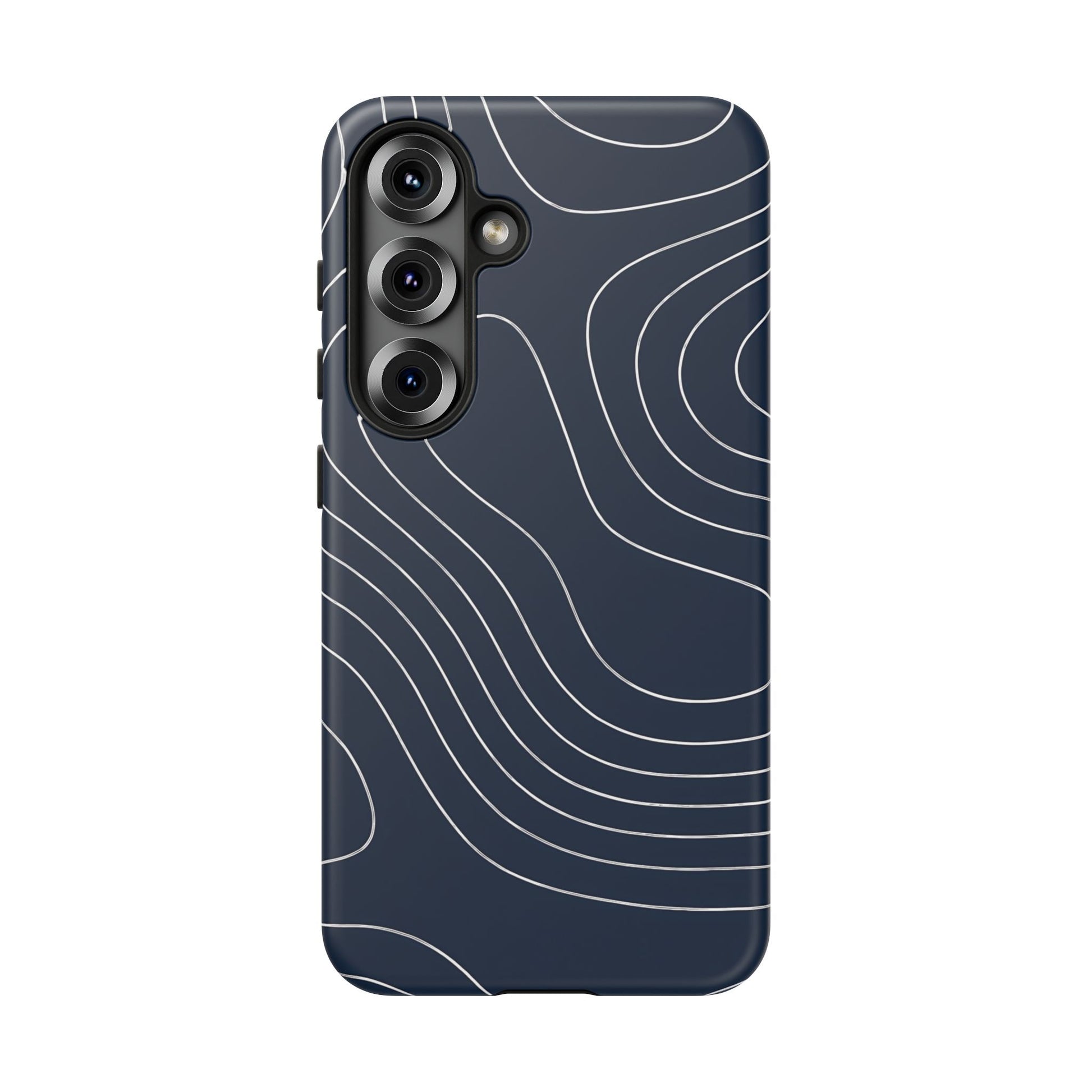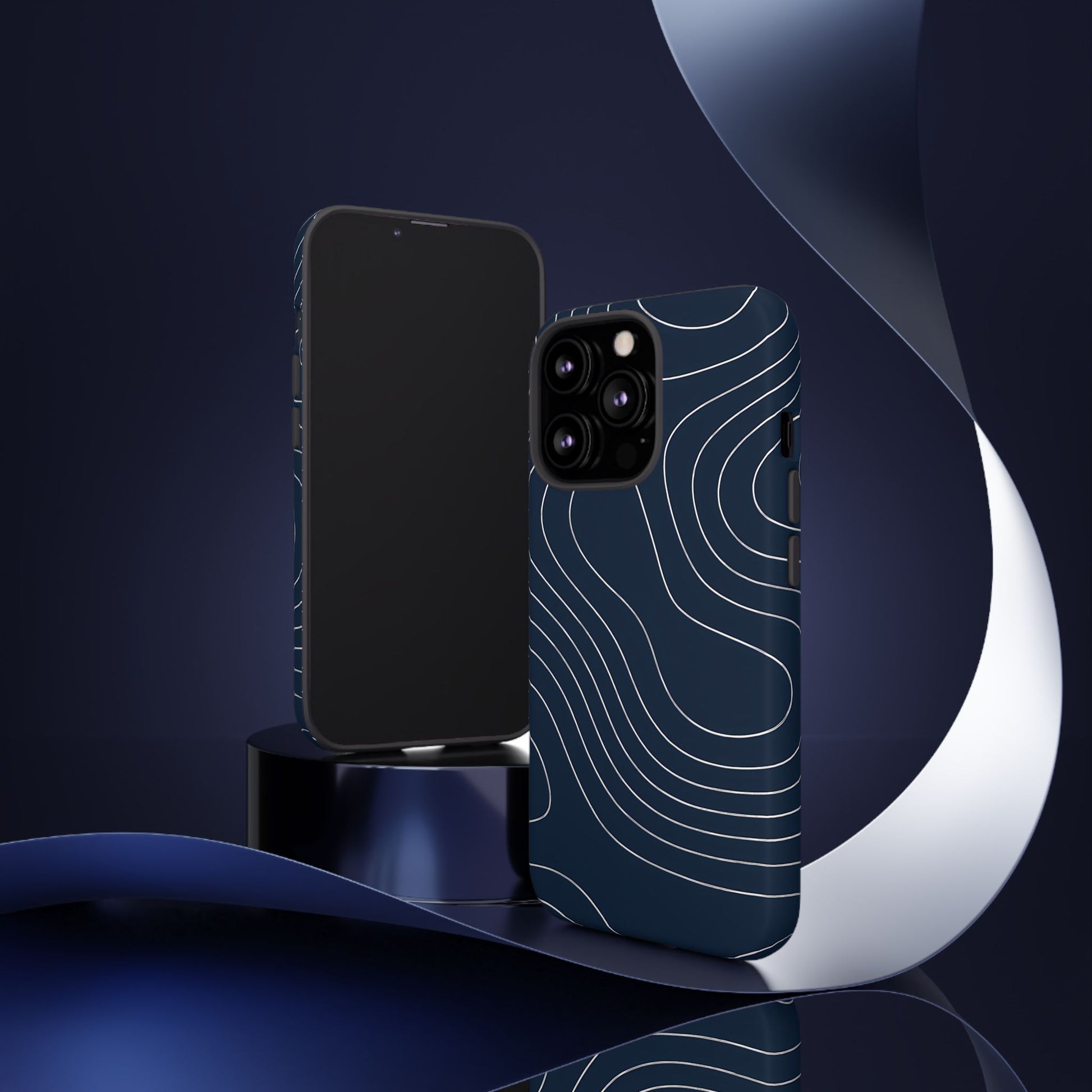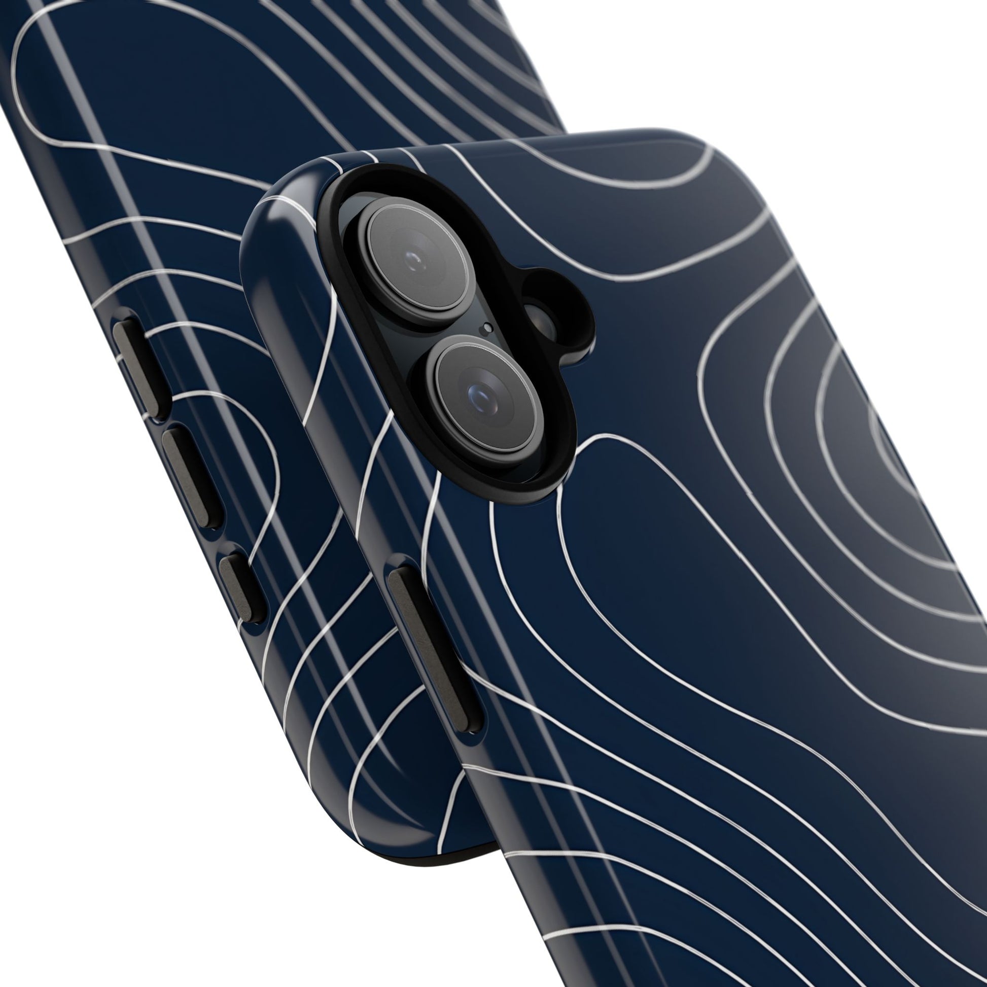 A clean, modern map-inspired pattern featuring seamless white elevation lines over a dark navy canvas, defined by high contrast and precise linework
