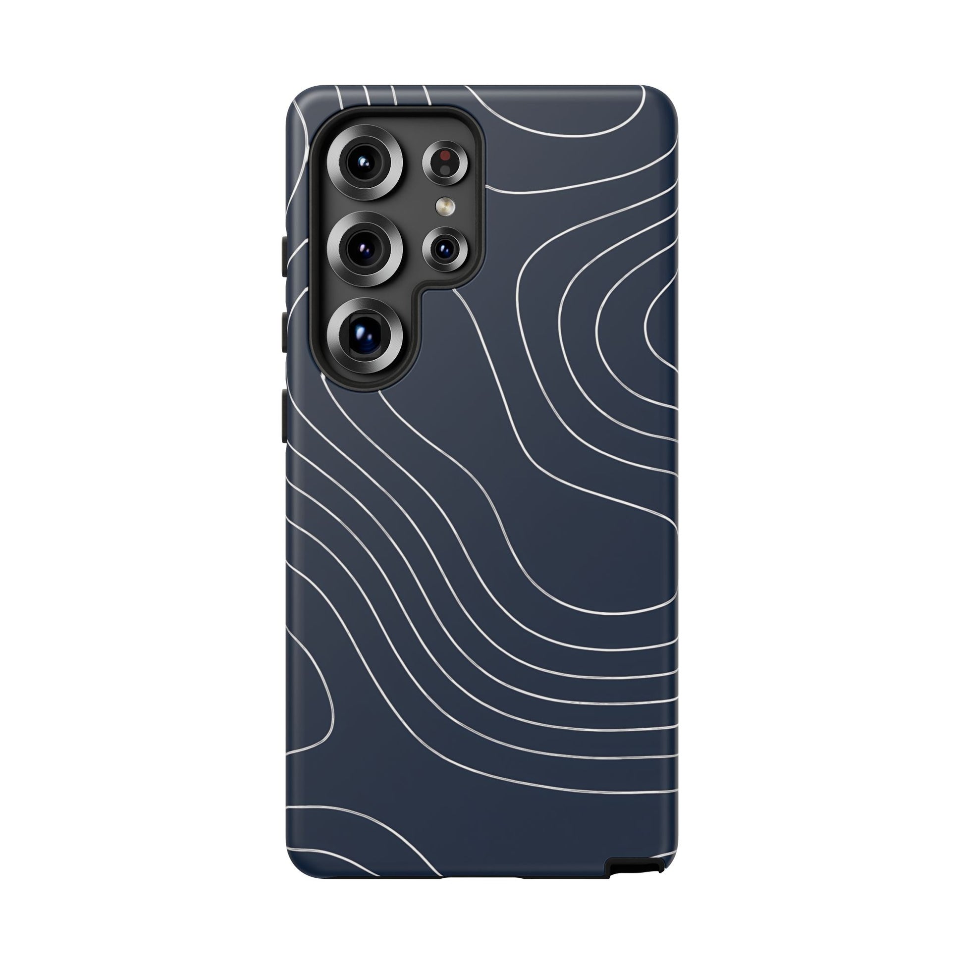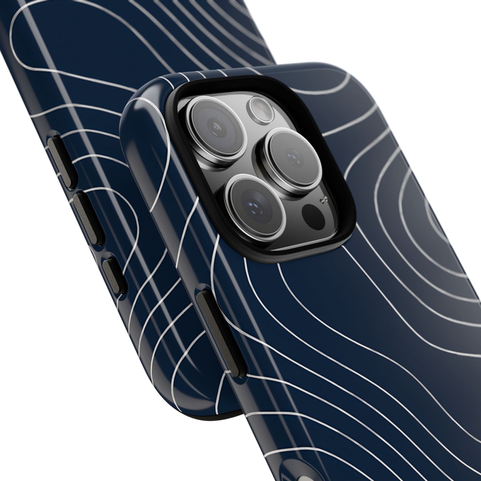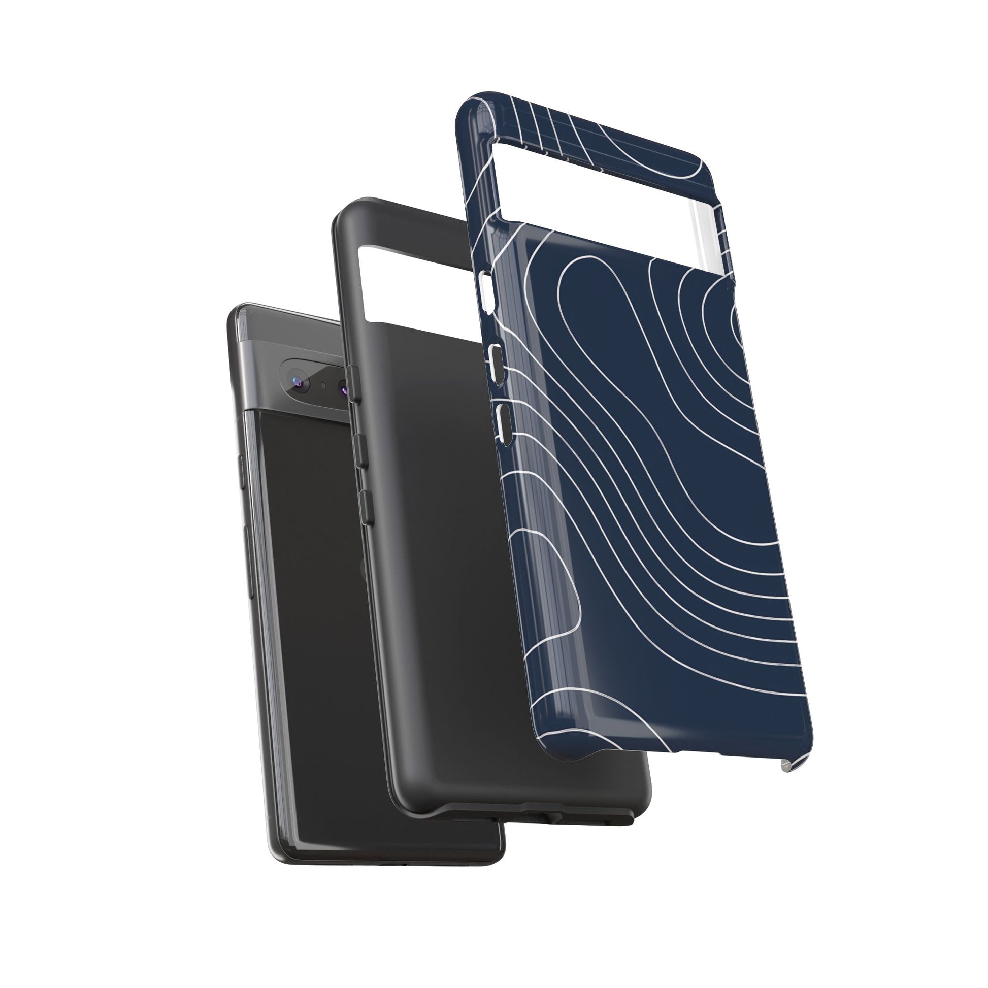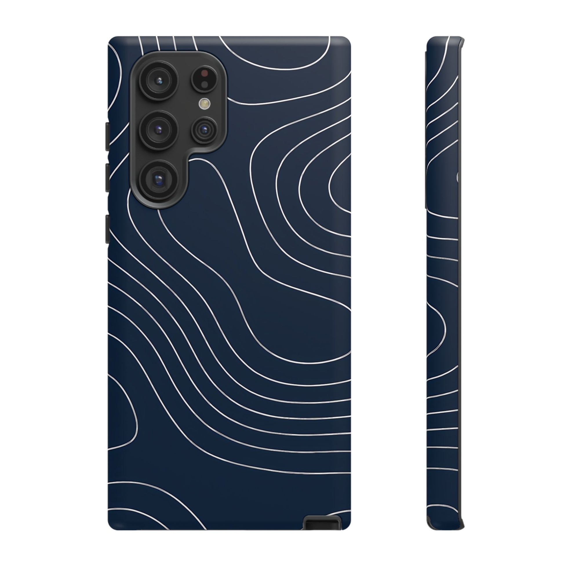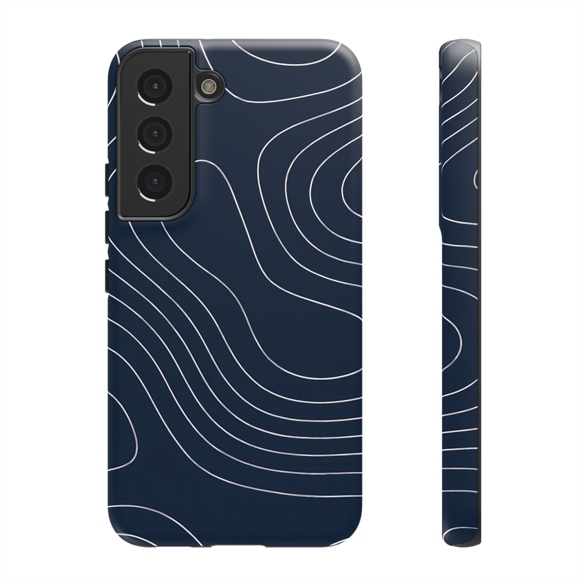 A clean, modern map-inspired pattern featuring seamless white elevation lines over a dark navy canvas, defined by high contrast and precise linework