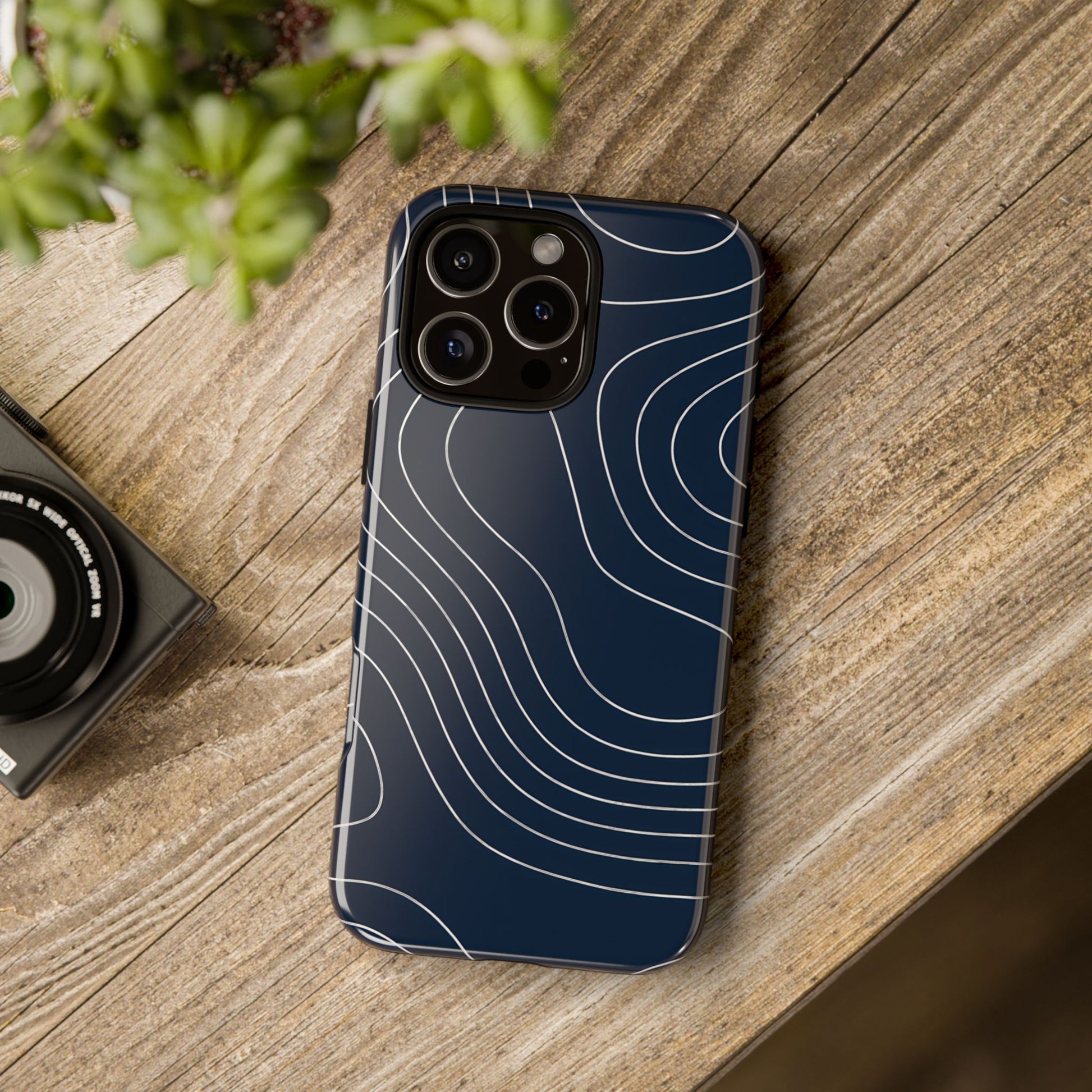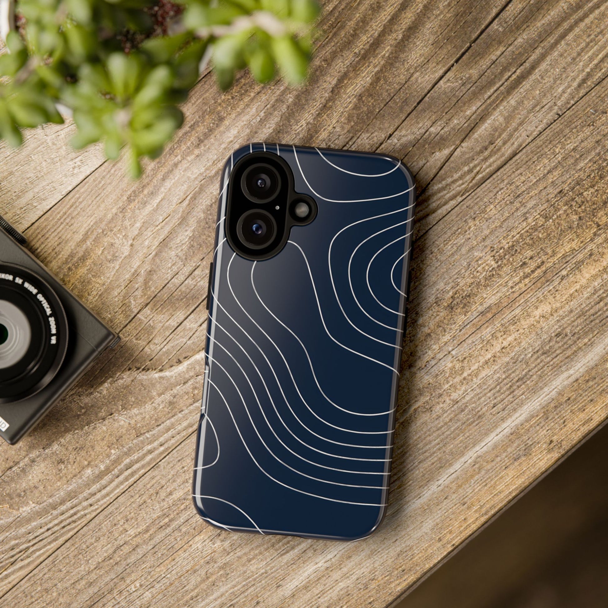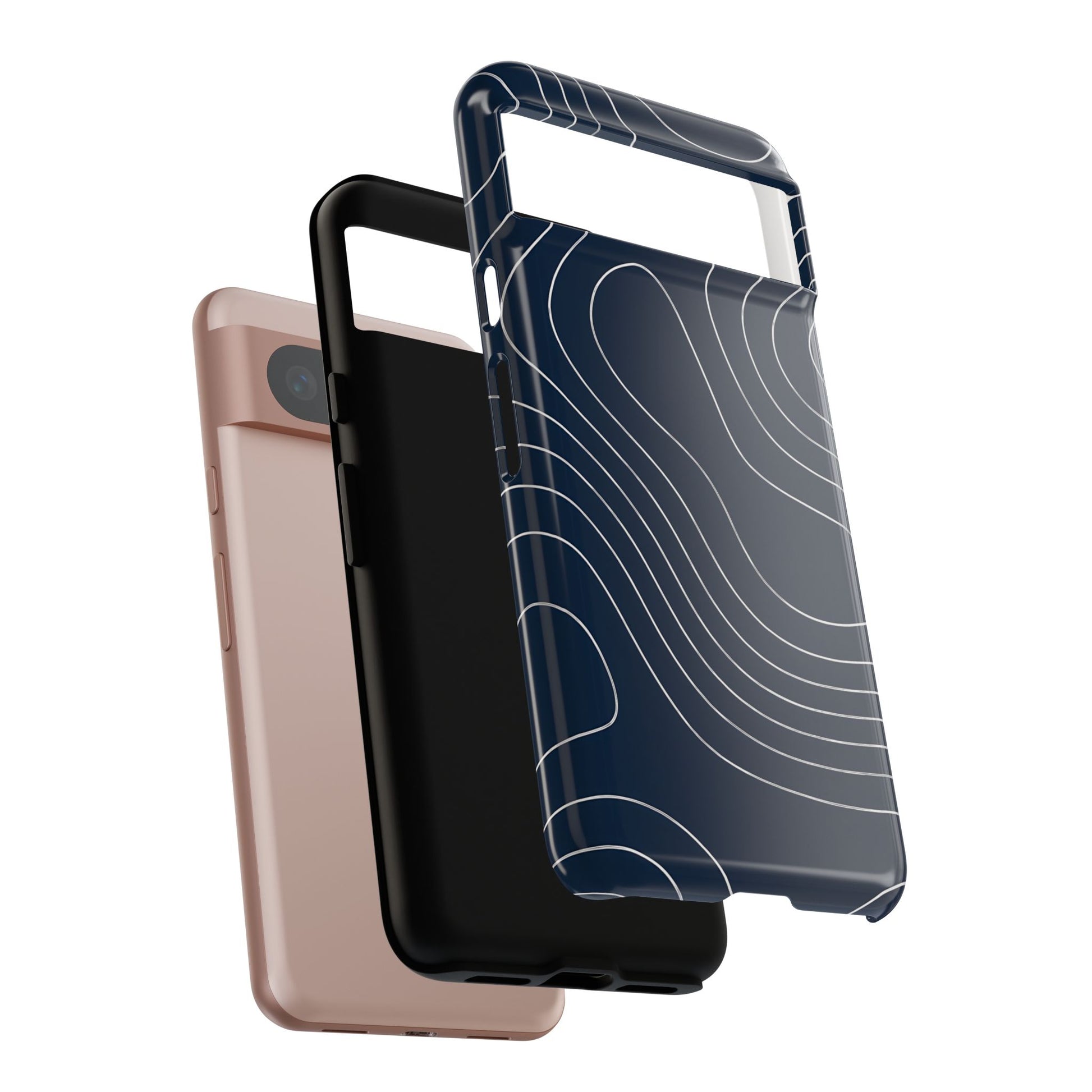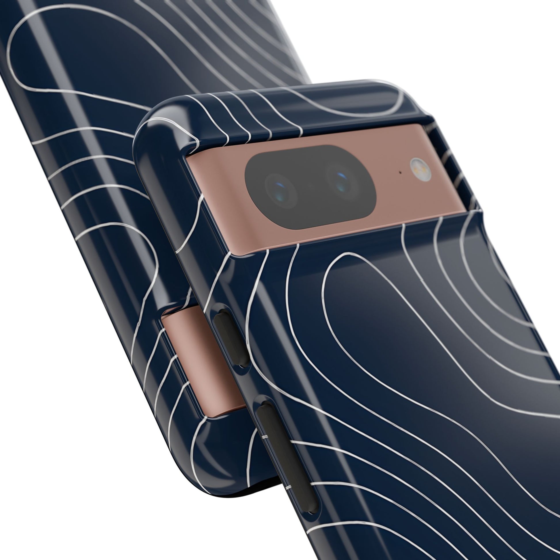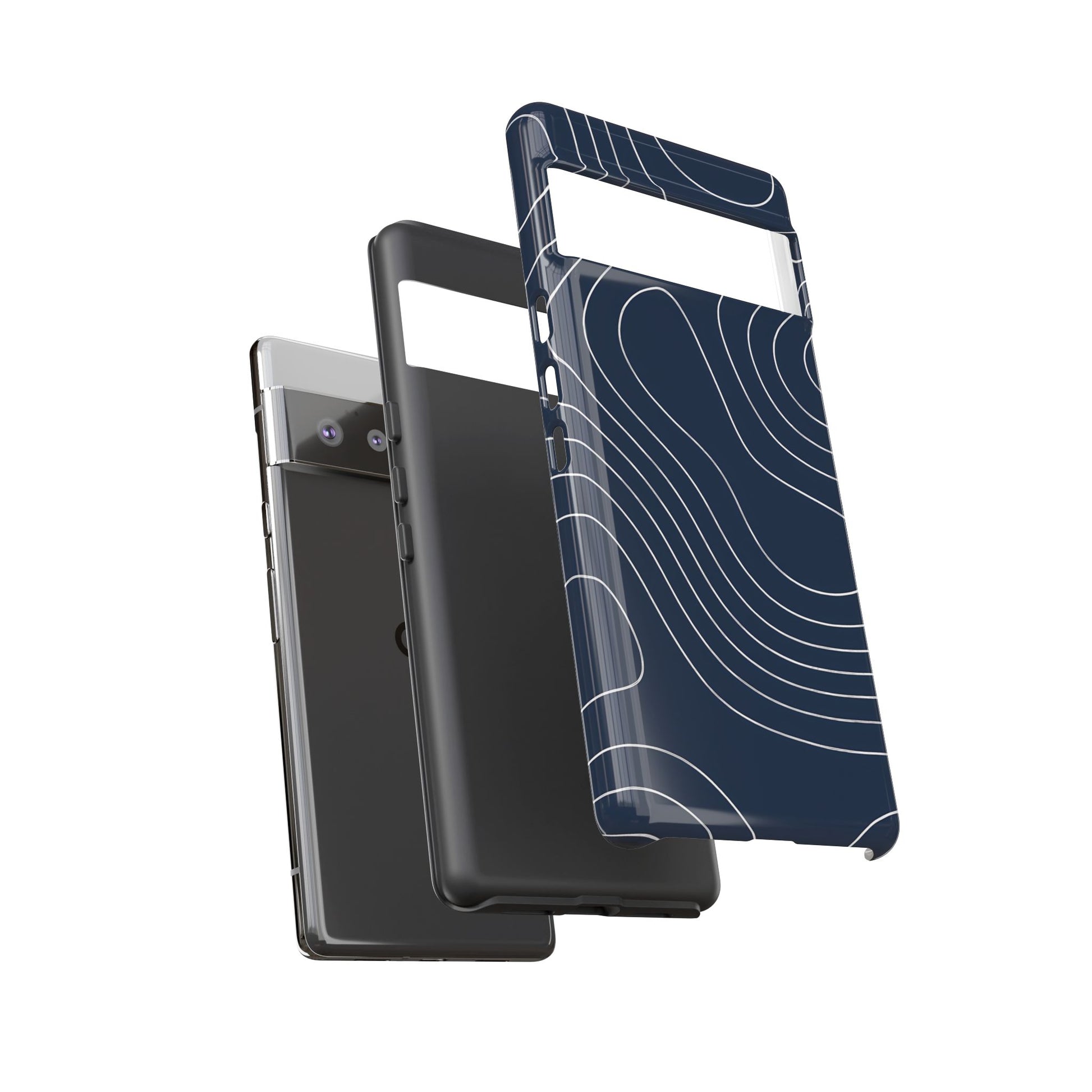 A clean, modern map-inspired pattern featuring seamless white elevation lines over a dark navy canvas, defined by high contrast and precise linework