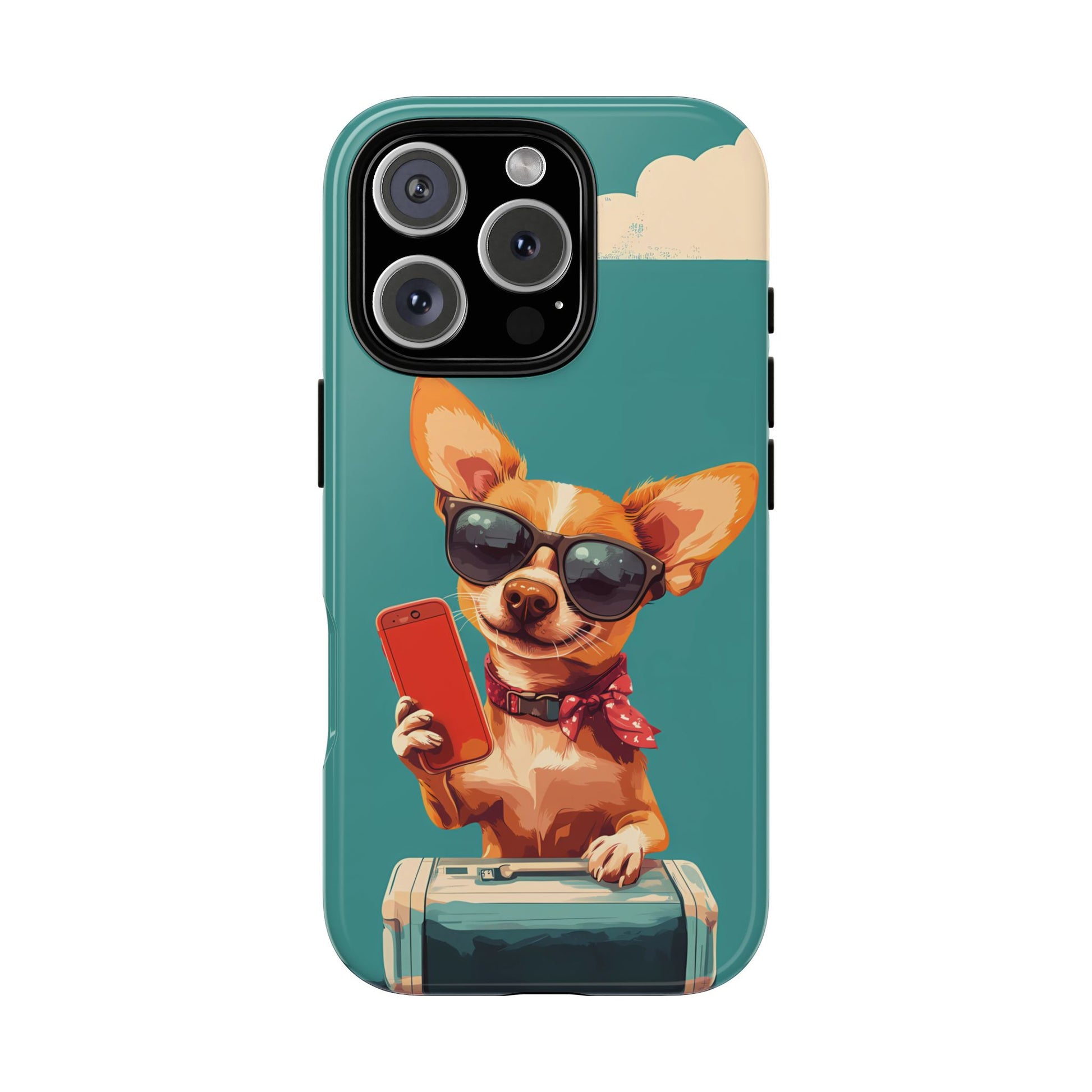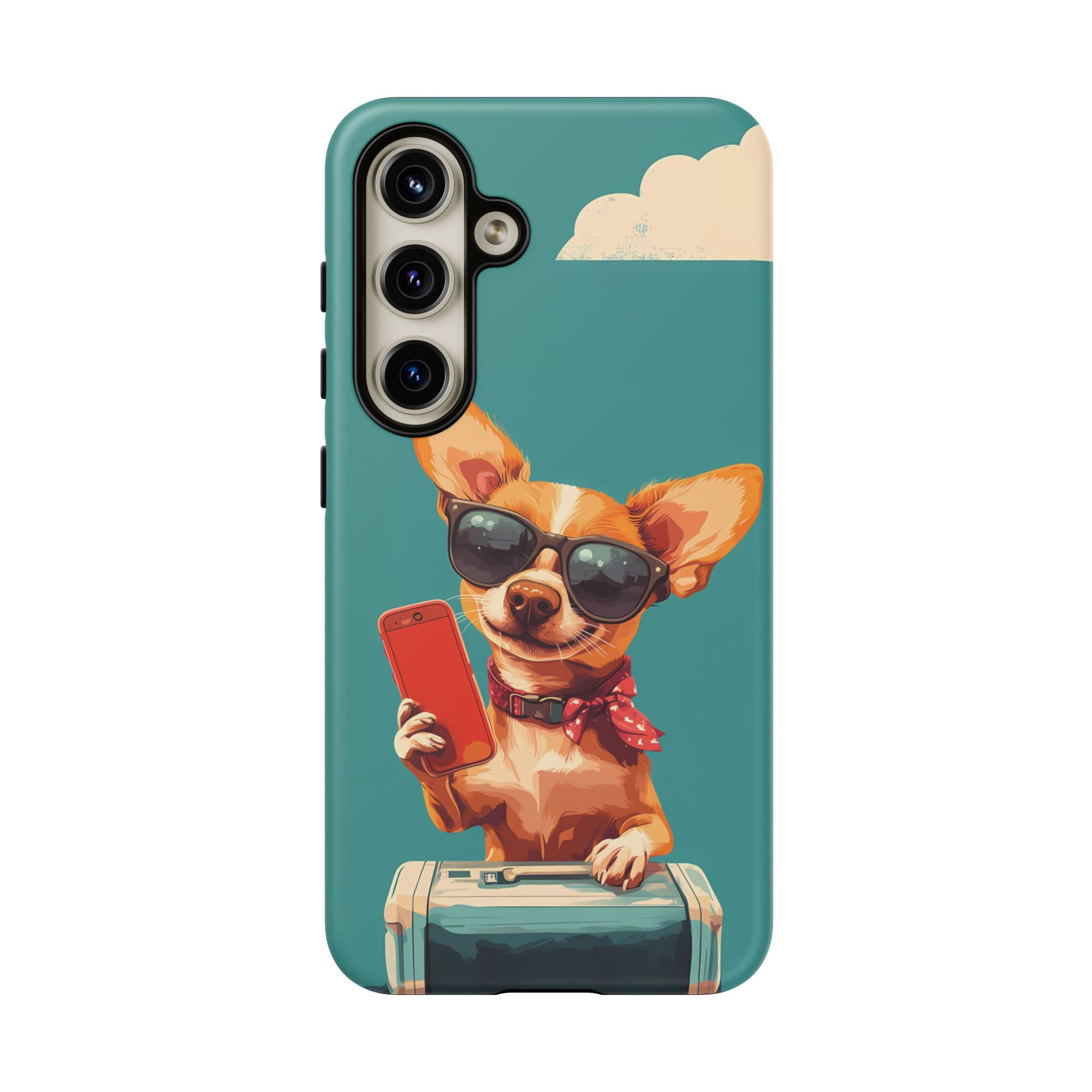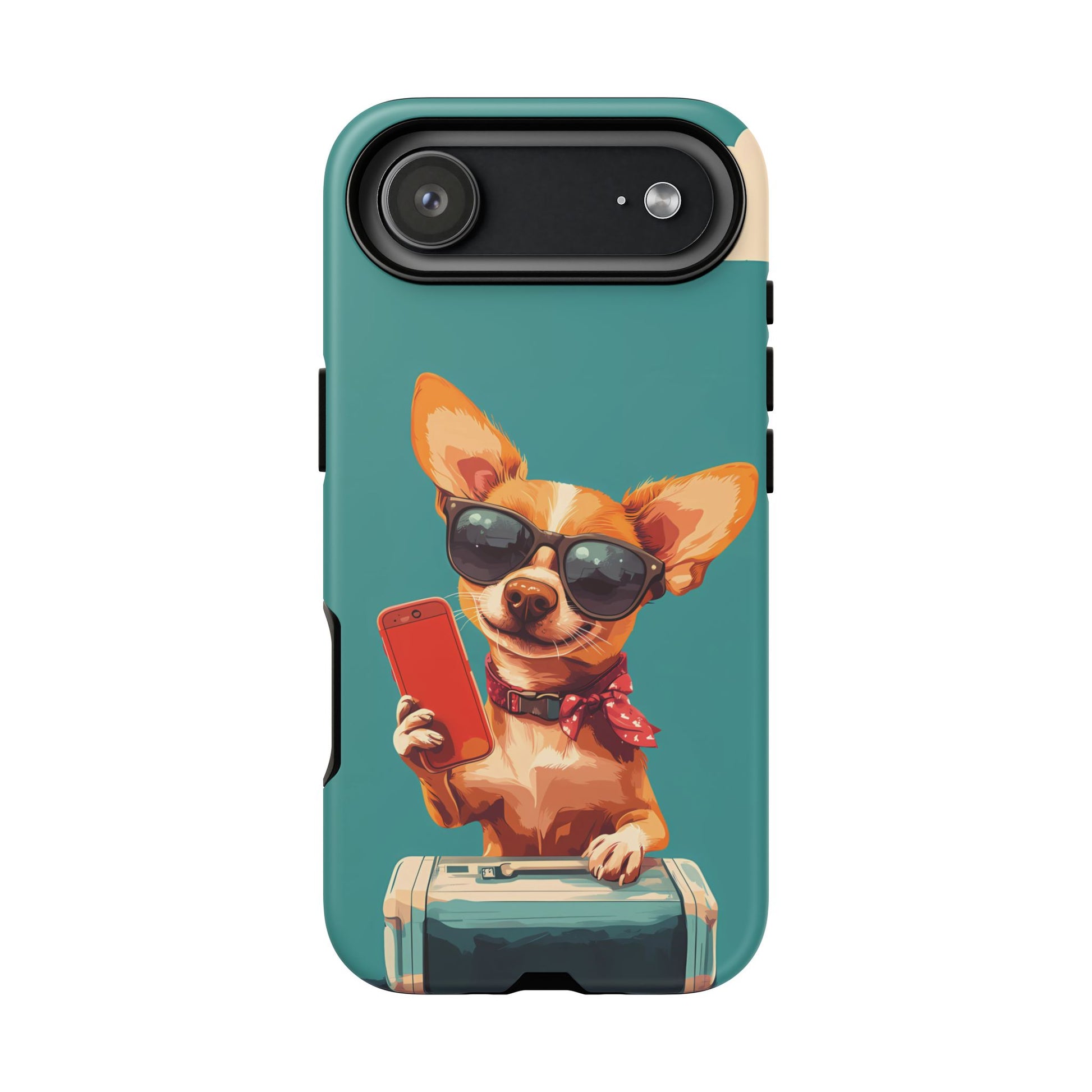 Get ready to travel in style with this cartoonish, retro-inspired dog design! Sporting sunglasses, a scarf, and a suitcase, this fun and quirky phone case is perfect for those who love adventure, dogs, and a touch of playful personality.