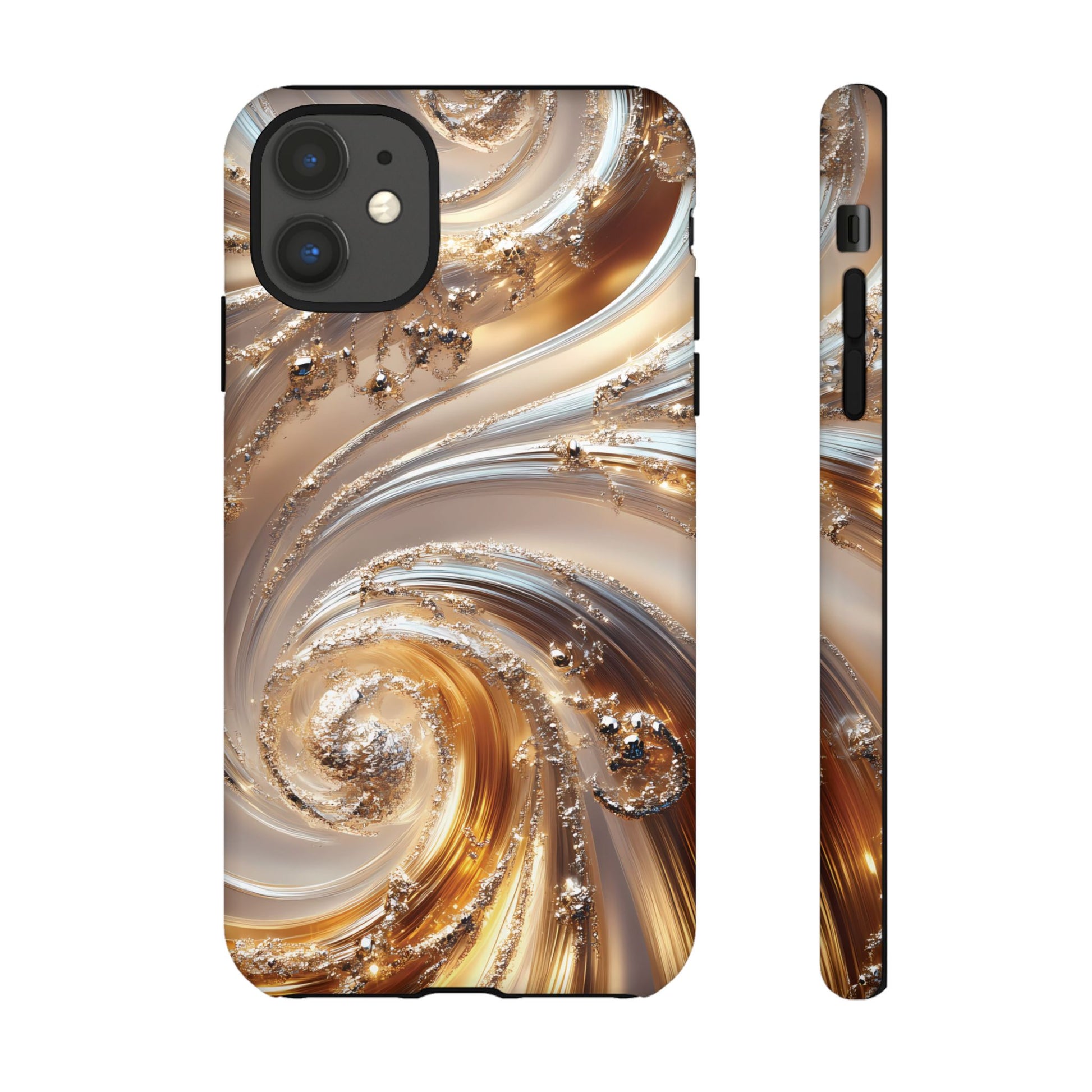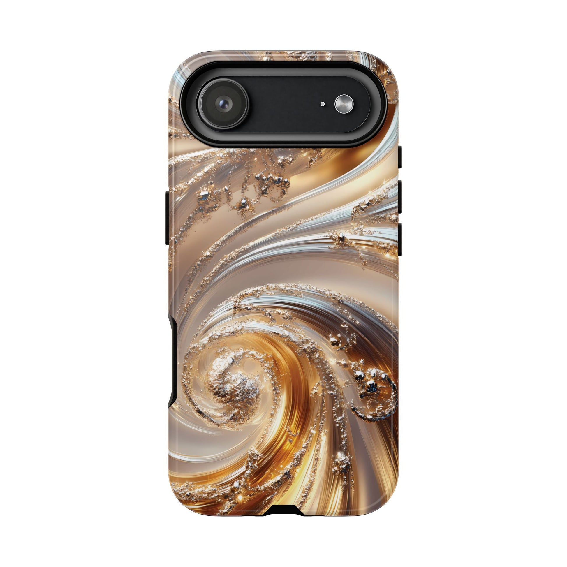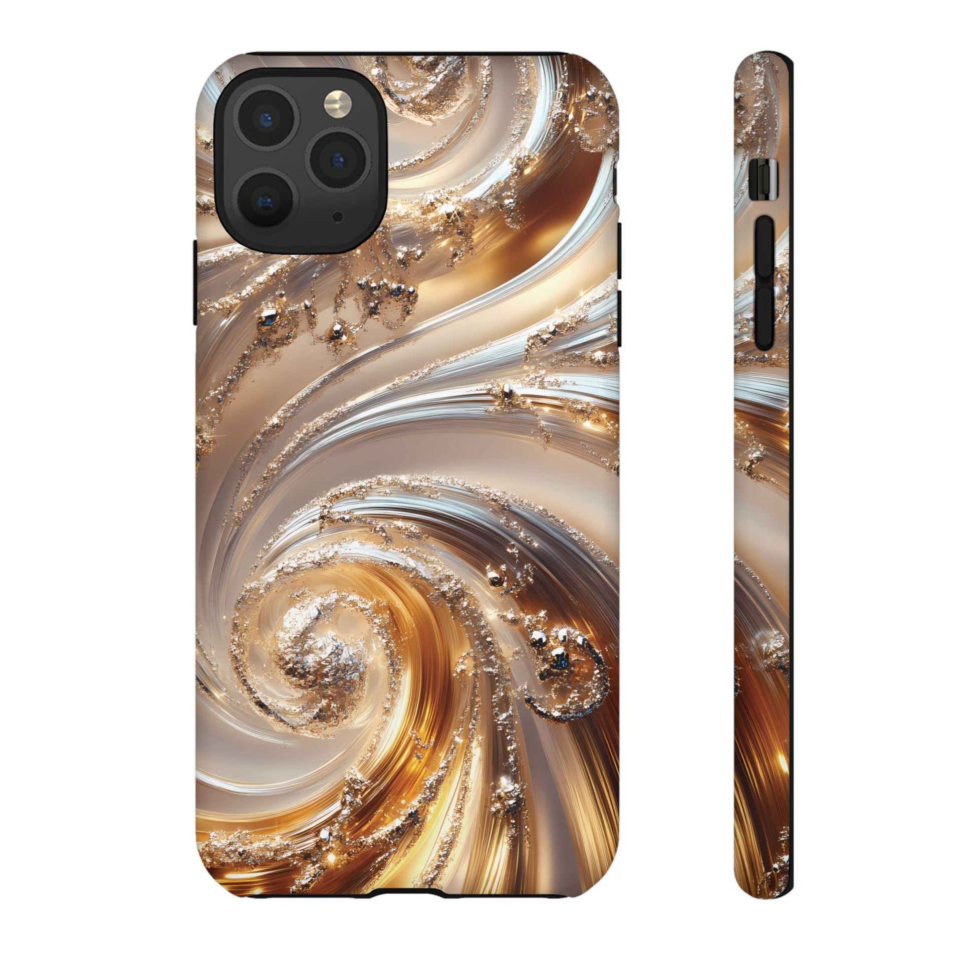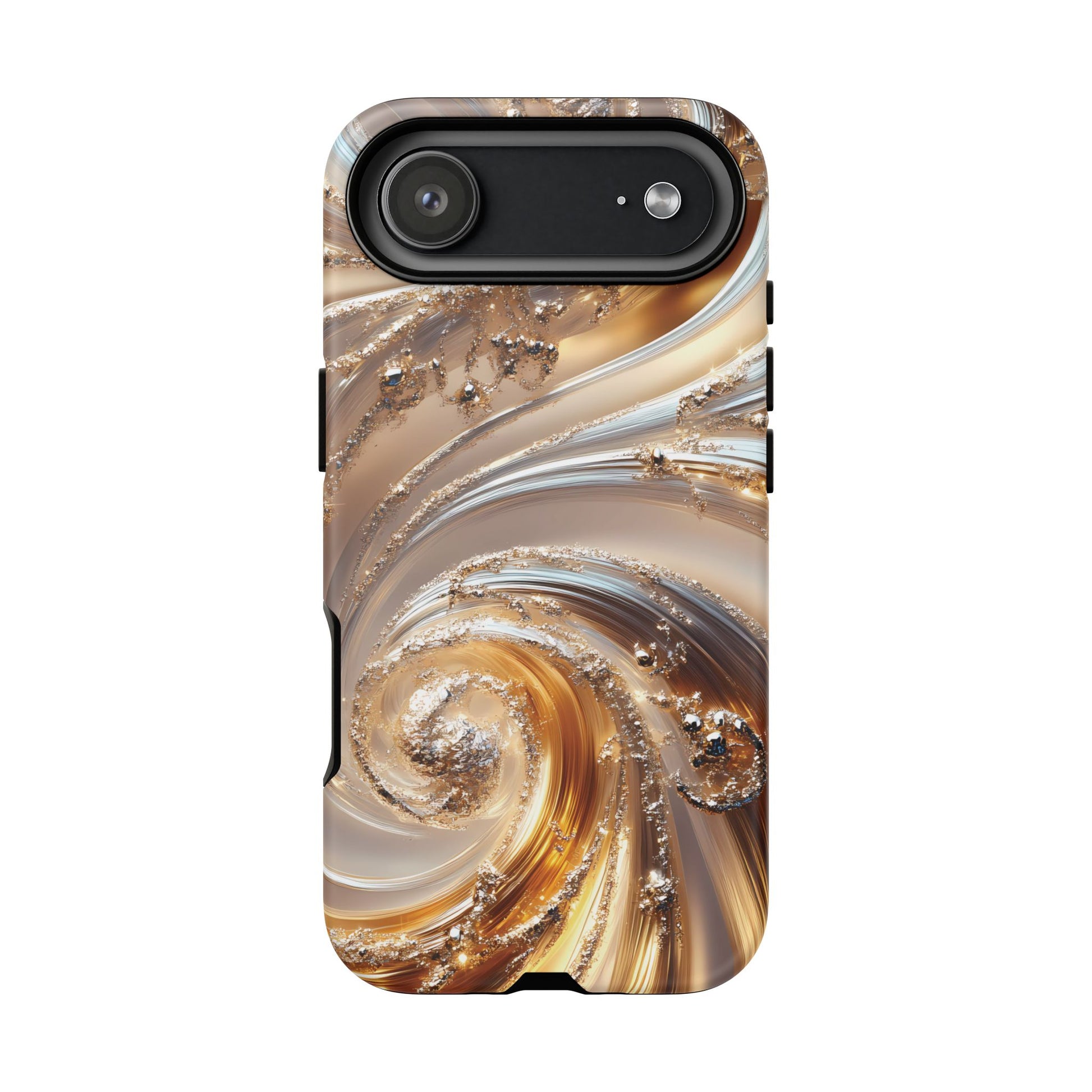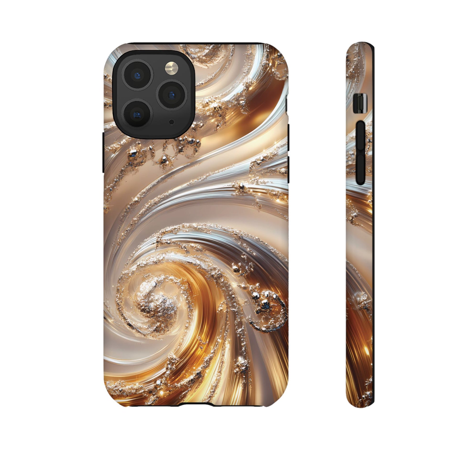 Inspired by modern luxury and high-end aesthetics, this phone case features photorealistic swirls of gold and platinum, set against a softly illuminated backdrop. A must-have for lovers of elegant, refined style.
