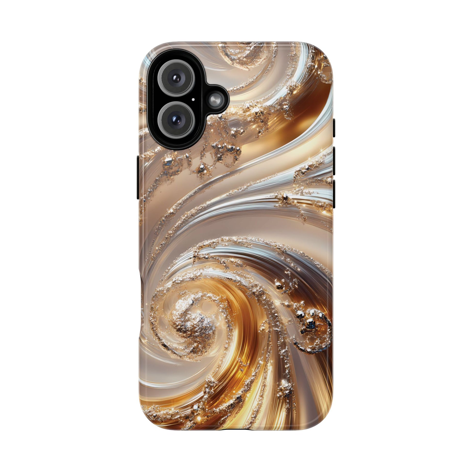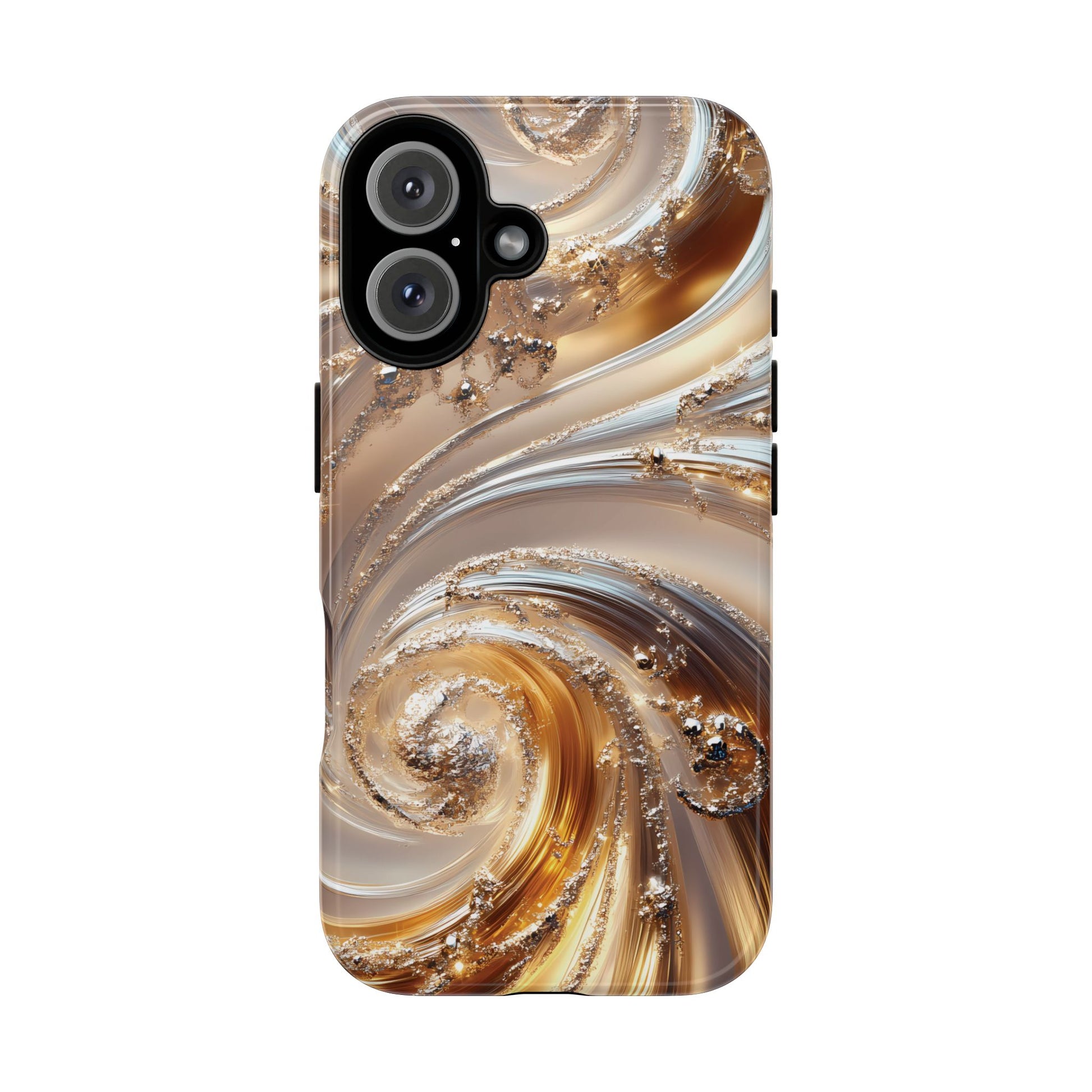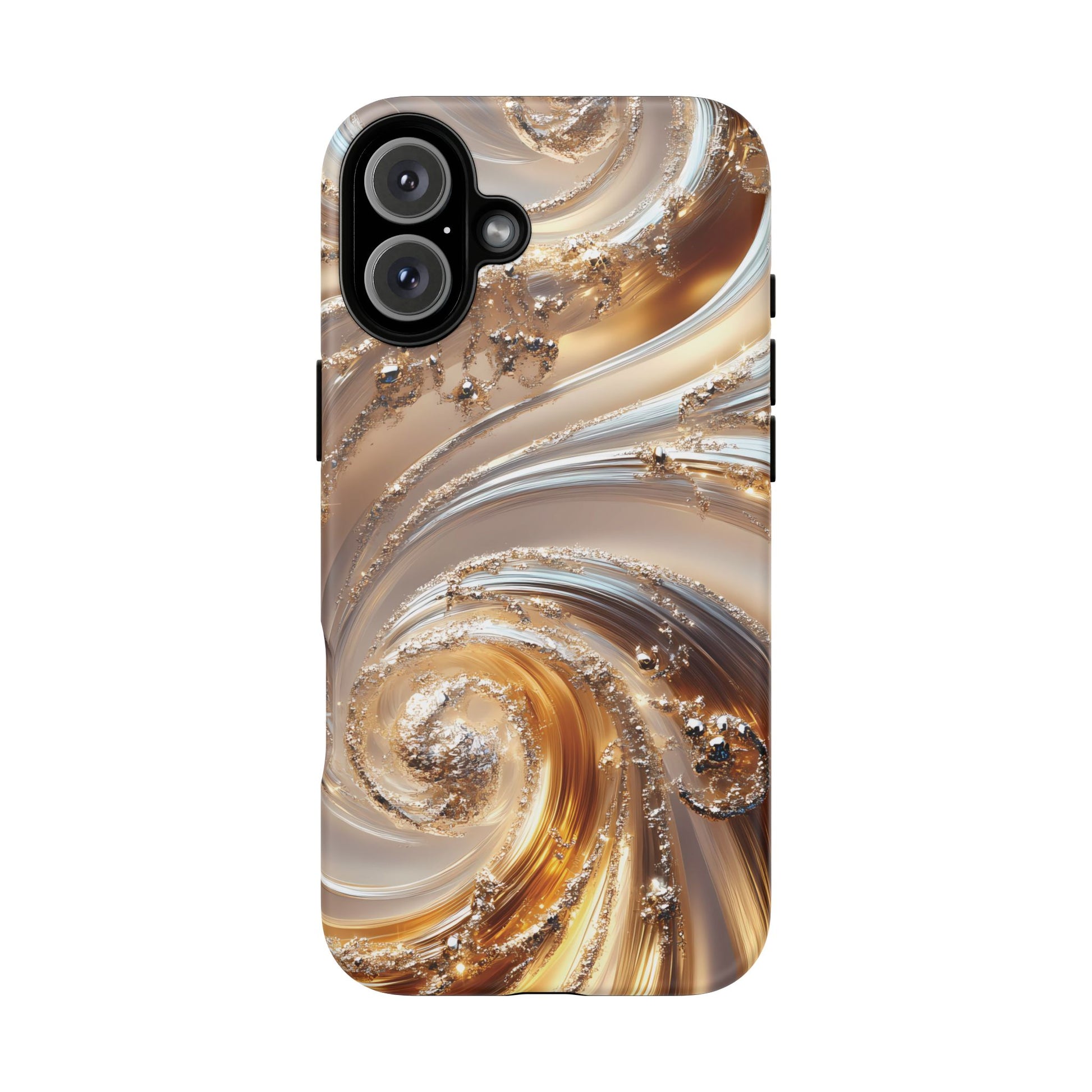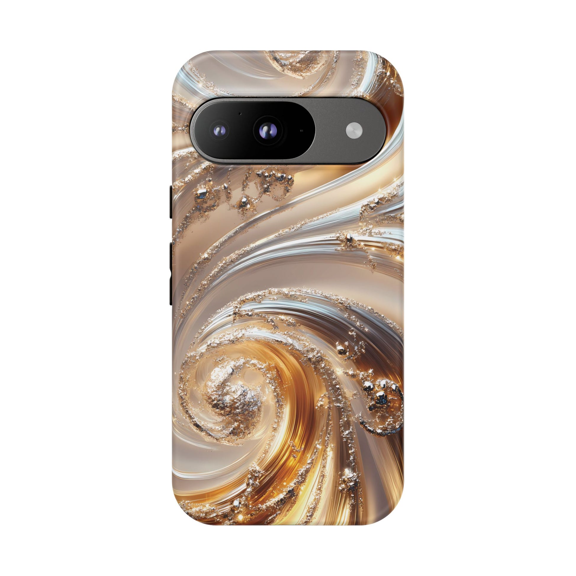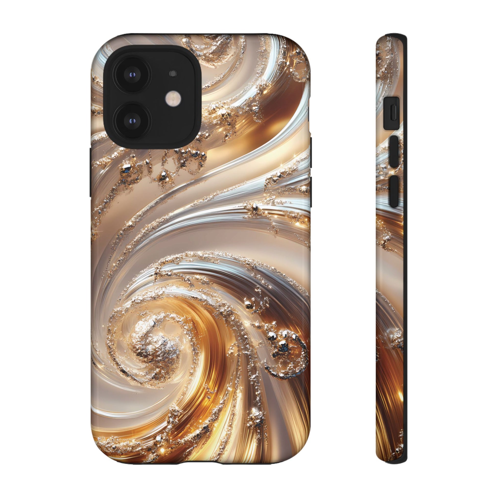 Inspired by modern luxury and high-end aesthetics, this phone case features photorealistic swirls of gold and platinum, set against a softly illuminated backdrop. A must-have for lovers of elegant, refined style.