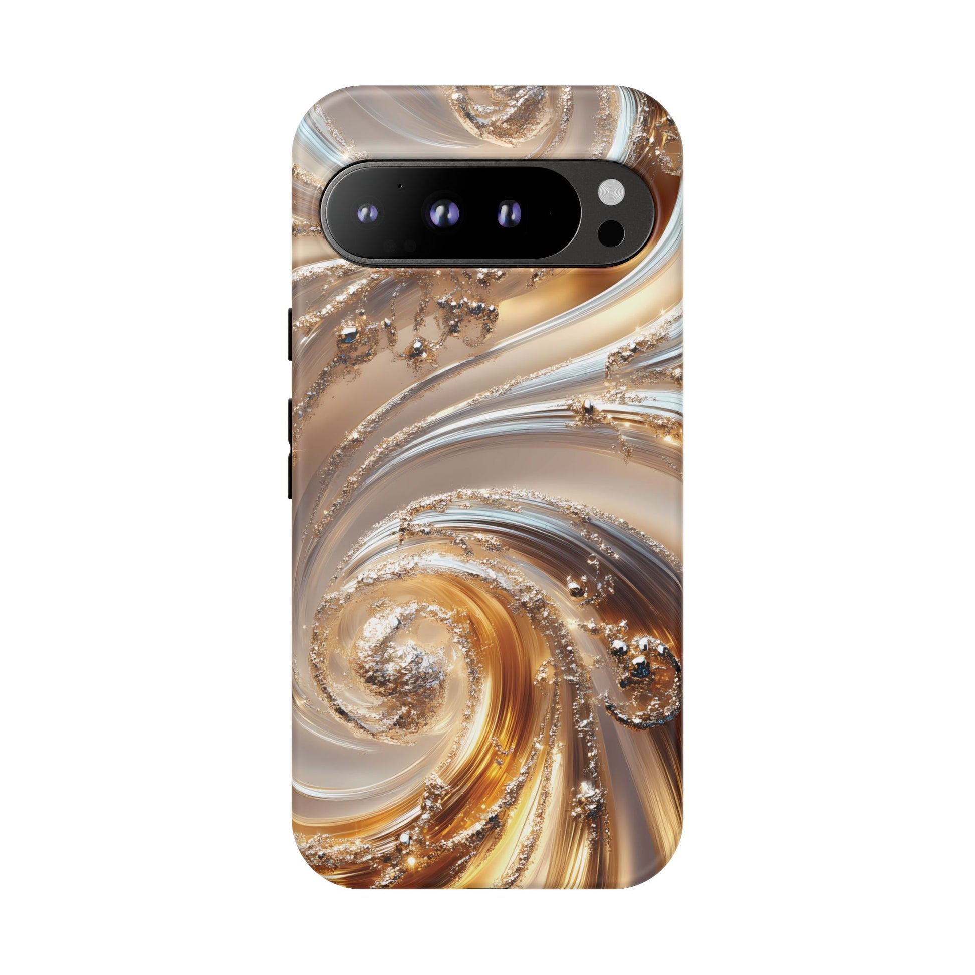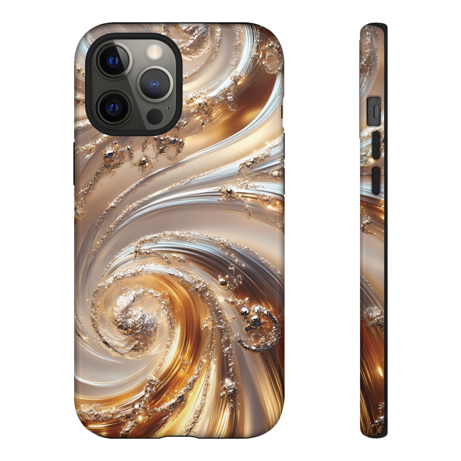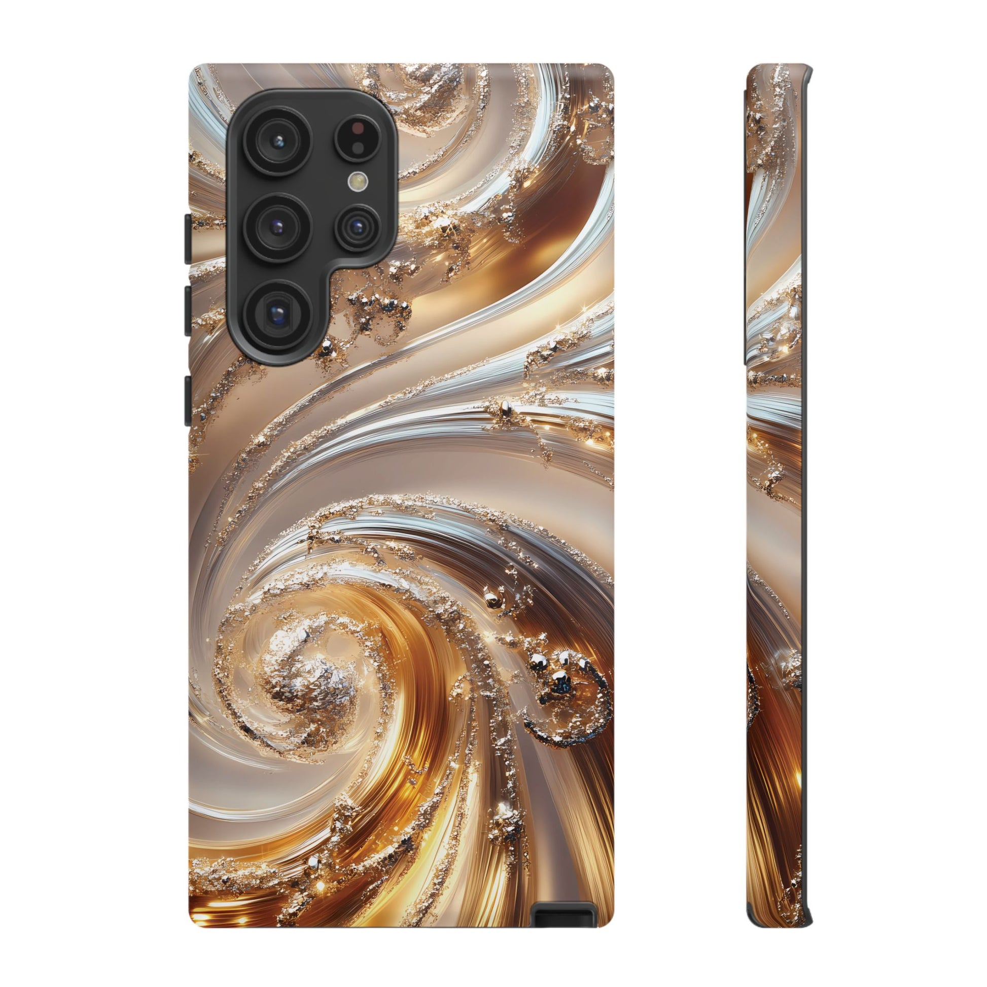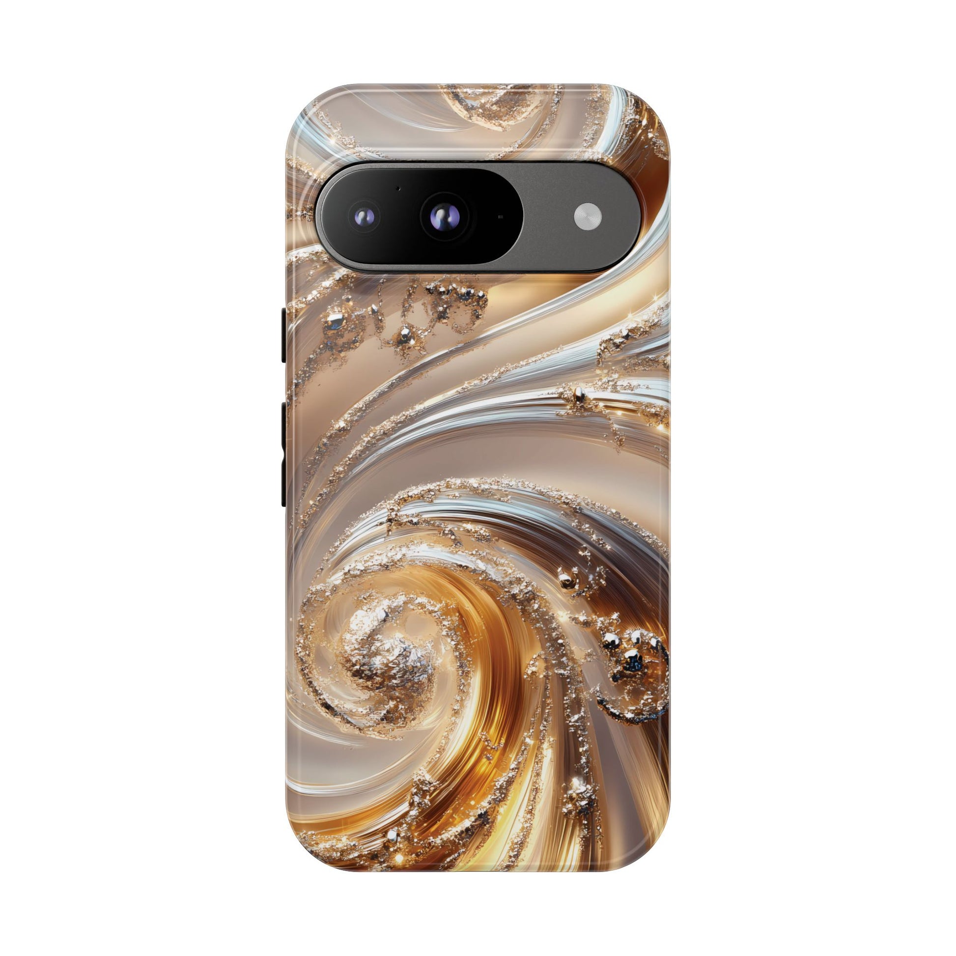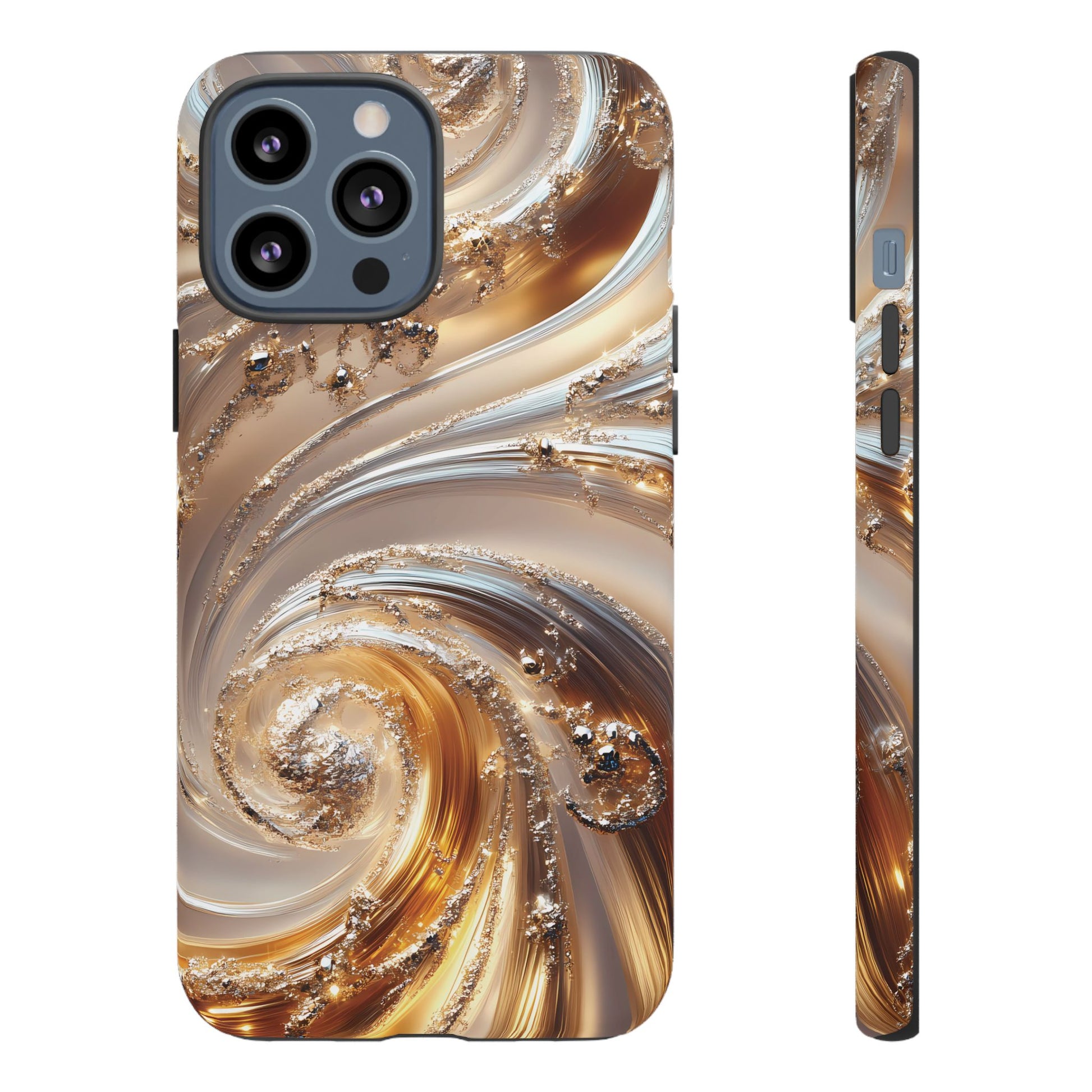 Inspired by modern luxury and high-end aesthetics, this phone case features photorealistic swirls of gold and platinum, set against a softly illuminated backdrop. A must-have for lovers of elegant, refined style.